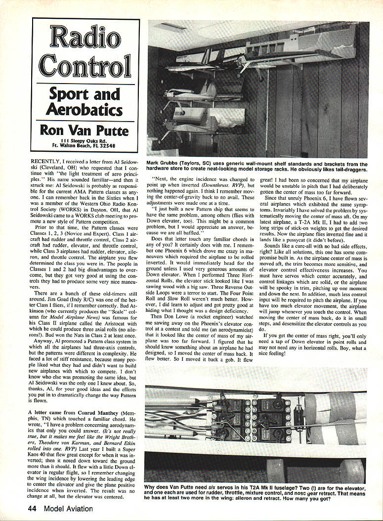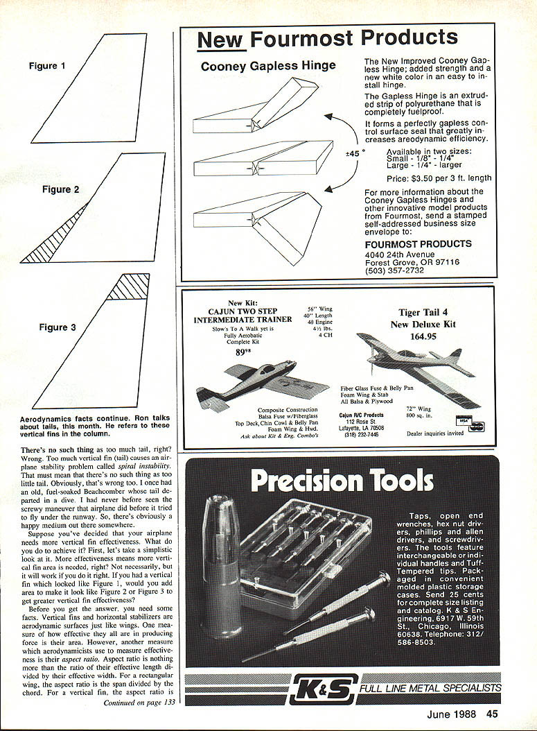 RECENTLY received letter Al Seidow ski Cleveland OH requested con tinue light treatment aero princi pies name sounded familiarand struck Al Seidowski probably responsi ble current AMA Pattern classes can remember back Sixties member Western Ohio Radio Kon trol Society WORKS Dayton OH Al Seidowski came WORKS club meeting pro mote new style Pattern competition Prior time Pattern classes Classes 1 2 3 Novice Expert Class 1 air craft rudder throttle control Class 2 air craft rudder elevator throttle control Class 3 airplanes rudder elevator aile ron throttle control airplane flew determined class people Classes 1 2 big disadvantages over come got very good using con trols produce some very nice maneu vers bunch old-timers still around Jim Goad Indy R/C bet ter Class fliers remember correctly Bud kinson currently produces Scale col umn Model Airplane News famous Class II airplane called Aristocat could produce three axial rolls no aile rons Bud won Nats Class 2 least once Anyway Al promoted Pattern class system airplanes three-axis controls patterns different complexity faced lot stiff resistance because peo ple liked what didnt want build new airplanes compete dont know else promoting same idea Al Seidowski knew about So thanks Al good ideas efforts put dramatically change way Pattern flown letter came Conrad Manthey Mem phis TN touched familiar chord wrote have problem concerning aerodynam ics could answer Its really true makes feel like Wright Broth ers Theodore von Karman Bernard Etkin rolled RVP Last year built Super Kaos 40 flew great except verted nosed down toward ground should flew little Down el evator regular flight remember changing wing incidence lowering leading edge center elevator give plane positive incidence inverted result no change elevator centered Next engine incidence changed point up inverted Downthrusr RVP nothing happened again think remember mov ing center-of-gravity back no avail adjustments made time just built new Pattern ship seems have same problem among others flies Down elevator too might common problem would appreciate answer cause baffled Does letter touch familiar chords certainly does remem ber Phoenix 6 drove crazy ma neuvers required airplane rolled inverted would immediately head ground unless used very generous amounts Down elevator performed Three Hori zontal Rolls elevator stick looked like sawing wood big saw Three Reverse Out side Loops terror start Four Point Roll Slow Roll werent much better ever did learn adjust got pretty good hiding what thought design deficiency Don Lowe rocket engineer watched sawing away Phoenixs elevator con trol contest told aerodynamicist looked like center mass air plane too far forward figured should know something about airplane designed moved center mass back flew better So moved back gob flew great concerned airplane would unstable pitch deliberately gotten center mass too far forward Since unruly Phoenix 6 have flown sev eral airplanes exhibited same symp toms Invariably have solved problem sys tematically moving center mass aft latest airplane T-2A Mk II add two long strips stick-on weights get desired results Now airplane flies inverted fine lands like pussycat didnt before Sounds like cure-all no bad side effects right Like solutions has some com promise built As airplane center mass moved aft trim becomes sensitive elevator control effectiveness increases must have servos center accurately control linkages solid airplane will spooky trim pitching up moment down next addition much less control input will required pitch airplane have too much elevator movement airplane will jump whenever touch control moving center mass back small steps desensitize elevator controls you get center mass right youll need tap Down elevator point rolls may need horizontal rolls Boy what nice feeling 44 Model Aviation Rado Confrol Sport Aerobatics Ron Van Putte ill Sleepy Oaks Rd Ft Walton Beach FL 32548 Mark Grubbs Taylors SC uses generic wall-mount shelf standards brackets hardware store create neat-looking model storage racks obviously likes tall-draggers does Van Putte need six servos TR MK ii TuseIage Iwo tor elevator used rudder throttle mixture control nosc sear retract means has least two wing aileron retract got Figure 1 Figure 2 Figure 3 Aerodynamics facts continue Ron talks about tails month refers vertical fins column Theres no such thing too much tail right Wrong Too much vertical fin tail causes air plane stability problem called spiral instability must mean theres no such thing too little tail Obviously thats wrong too once old fuel-soaked Beachcomber tail de parted dive never before seen screwy maneuver airplane did before tried fly under runway So theres obviously happy medium out somewhere Suppose youve decided airplane needs vertical fin effectiveness What achieve First lets sake simplistic look effectiveness means verti cal fin area needed right necessarily hut will work right vertical fin looked like Figure 1 would add area make look like Figure 2 Figure 3 get greater vertical fin effectiveness Before get answer need some facts Vertical fins horizontal stabilizers aerodynamic surfaces just like wings mea sure effective producing force area However another measure aerodynamicists use measure effective ness aspect ratio Aspect ratio nothing ratio effective length di vided effective width rectangular wing aspect ratio span divided chord vertical fin aspect ratio Continued page 133 New Fourmost Products Cooney Gapless Hinge 45 0 New Kit CAJUN TWO STEP INTERMEDIATE TRAINER Slows Walk yet Fully Aerobatic Complete Kit 8998 56 Wing 40 Length 40 Engine 4 lbs 4 CH New Improved Cooney Gapless Hinge added strength new white color easy stall hinge Gapless Hinge extrud ed strip polyurethane completely fuelproof forms perfectly gapless con trol surface seal greatly creases areodynamic efficiency Available two sizes Small 1/8 1/4 Large 1/4 larger Price $350 per 3 ft length information about Cooney Gapless Hinges other innovative