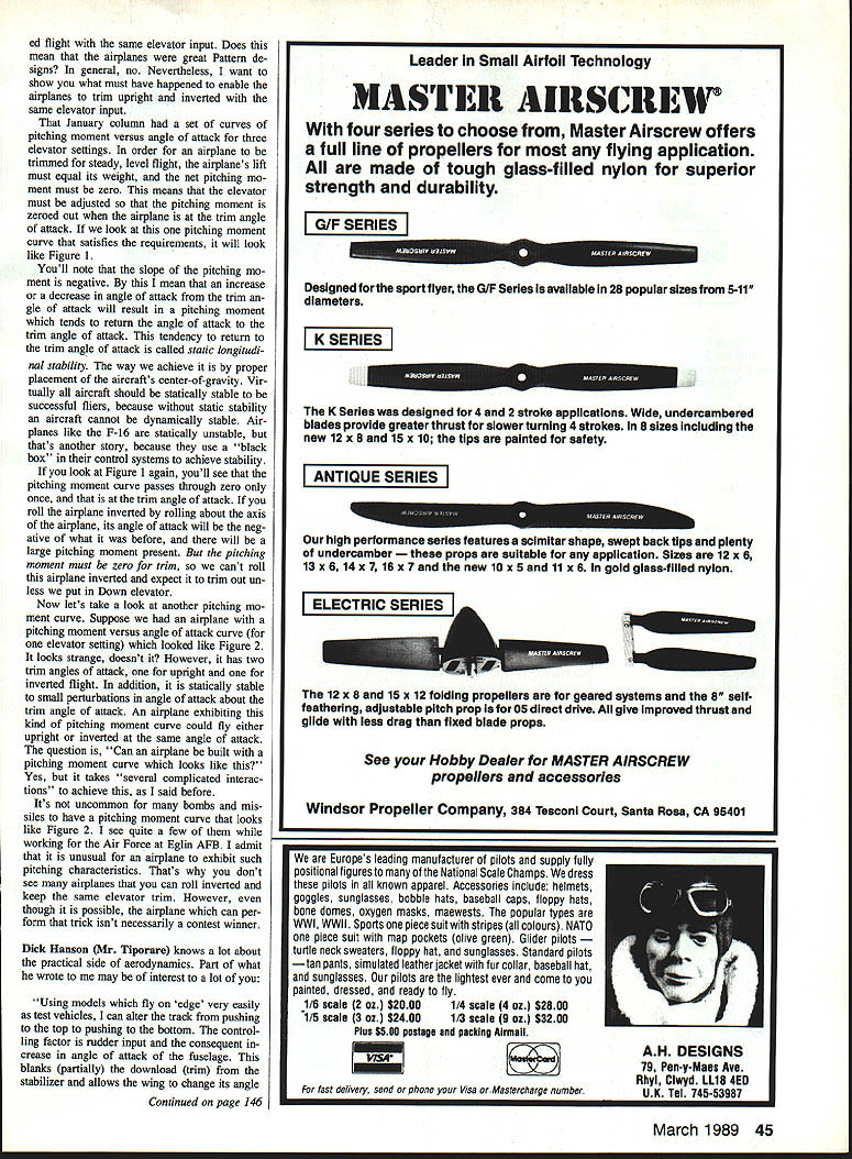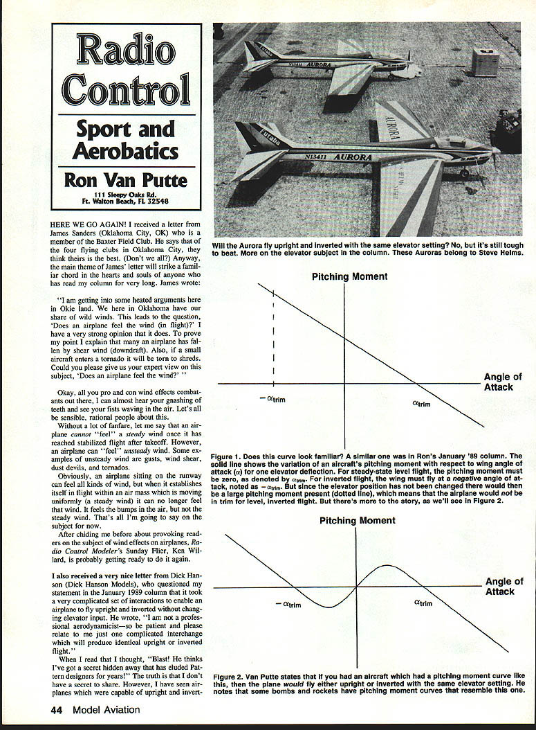 HERE WE GO AGAIN received letter James Sanders Oklahoma City OK member Baxter Field Club says four flying clubs Oklahoma City think best Dont Anyway main theme James letter will strike famil iar chord hearts souls anyone has read column very long James wrote am getting some heated arguments Okle land Oklahoma have share wild winds leads question Does airplane feel wind flight have very strong opinion does prove point explain airplane has fal len shear wind downdraft Also small aircraft enters tornado will torn shreds Could please give us expert view subject Does airplane feel wind Okay pro con wind effects combat ants out can almost hear gnashing teeth see fists waving air Lets sensible rational people about Without lot fanfare let say air plane cannot feel steady wind once has reached stabilized flight after takeoff However airplane can feel unsteady wind Some ex amples unsteady wind gusts wind shear dust devils tornados Obviously airplane sitting runway can feel klnds wind establishes itself flight within air mass moving uniformly steady wind can no longer feel wind feels bumps air steady wind Thats Im going say subject now After chiding before about provoklng read ers subject wind effects airplanes Ra dio Control Modelers Sunday Flier Ken Wil lard probably getting ready again also received very nice letter Dick Han son Dick Hanson Models questioned statement January 1989 column took very complicated set interactions enable alrplane fly upright inverted chang ing elevator input wrote am profes sional aerodynamicistso patient please relate just complicated interchange will produce identical upright inverted flight read thought Blast thinks Ive got secret hidden away has eluded Pat tern designers years truth dont have secret share However have seen air planes capable upright invertatrim Angle Attack atrim Figure 1 Does curve look familiar similar Rons January 89 column solid line shows variation aircrafts pitching moment respect wing angle attack elevator deflection steady-state level flight pitching moment must zero denoted atim inverted flight wing must fly negative angle tack noted m since elevator position has changed would large pitching moment present dotted line means airplane would trim level inverted flight theres story well see Figure 2 Pitching Moment atrlm atrim Angle Attack Figure 2 Van Putte states aircraft pitching moment curve like plane would fly either upright inverted same elevator setting notes some bombs rockets have pitching moment curves resemble 44 Model Aviation Radio Control Sport Aerobatics Ron Van Putte Ill SleepyOaks Rd Ft Walton Dead, FL 32548 Will Aurora fly upright inverted same elevator setting No its still tough beat elevator subject column Auroras belong Steve Helms Pitching Moment ed flight same elevator input Does mean airplanes great Pattern de signs general no Nevertheless want show what must have happened enable airplanes trim upright inverted same elevator input January column set curves pitching moment versus angle attack three elevator settings order airplane trimmed steady level flight airplanes lift must equai its weight net pitching mo ment must zero means elevator must adjusted pitching moment zeroed out airplane trim angle attack look pitching moment curve satisfies requirements will look like Figure 1 Youll note slope pitching mo ment negative mean increase decrease angle attack trim gle attack will result pitching moment tends return angle attack trim angle attack tendency return trim angle attack called static longitudi nal stability way achieve proper placement aircrafts center-of-gravity Vir tually aircraft should statically stable successful fliers because static stability aircraft cannot dynamically stable Air planes like F-16 statically unstable thats another story because use black box control systems achieve stability look Figure 1 again youll see pitching moment curve passes through zero once trim angle attack roll airplane inverted rolling about axis airplane its angle attack will neg ative what before will large pitching moment present pitching moment must zero trim cant roll airplane inverted expect trim out un less put Down elevator Now lets take look another pitching mo ment curve Suppose airplane pitching moment versus angle attack curve elevator setting looked like Figure 2 looks strange doesnt However has two trim angles attack upright inverted flight addition statically stable small perturbations angle attack about trim angle attack An airplane exhibiting kind pitching moment curve could fly either upright inverted same angle attack question Can airplane built pitching moment curve looks like Yes takes several complicated interac tions achieve said before Its uncommon bombs mis siles have pitching moment curve looks like Figure 2 see quite few working Air Force Eglin AFB admit unusual airplane exhibit such pitching characteristics Thats dont see airplanes can roll inverted keep same elevator trim However though possible airplane can per form trick isnt necessarily contest winner Dick Hanson Mr Tiporare knows lot about practical side aerodynamics Part what wrote may interest lot Using models fly edge very easily test vehicles can alter track pushing top pushing bottom control ling factor rudder input consequent crease angle attack fuselage blanks partially download trim stabilizer allows wing change its angle Continued page 146 Leader Small Airfoil Technology MASIE1I AIRSCRL1 four series choose Master Airscrew offers full line propellers flying application made tough glass-filled nylon superior strength durability GIF SERIES Designed sport flyer GJP Series available 28 popular sizes 5-11 diameters K SERIES K Series designed 4 2 stroke applications Wide undercambered blades provide greater thrust slower turning 4 strokes 8 sizes including new 12 x 8 15 x 10 tips painted safety ANTIQUE SERIES performance series features scimitar shape swept back tips plenty undercamber s suitable application Sizes 12 x 6 13 x 614 x 716 x 7 