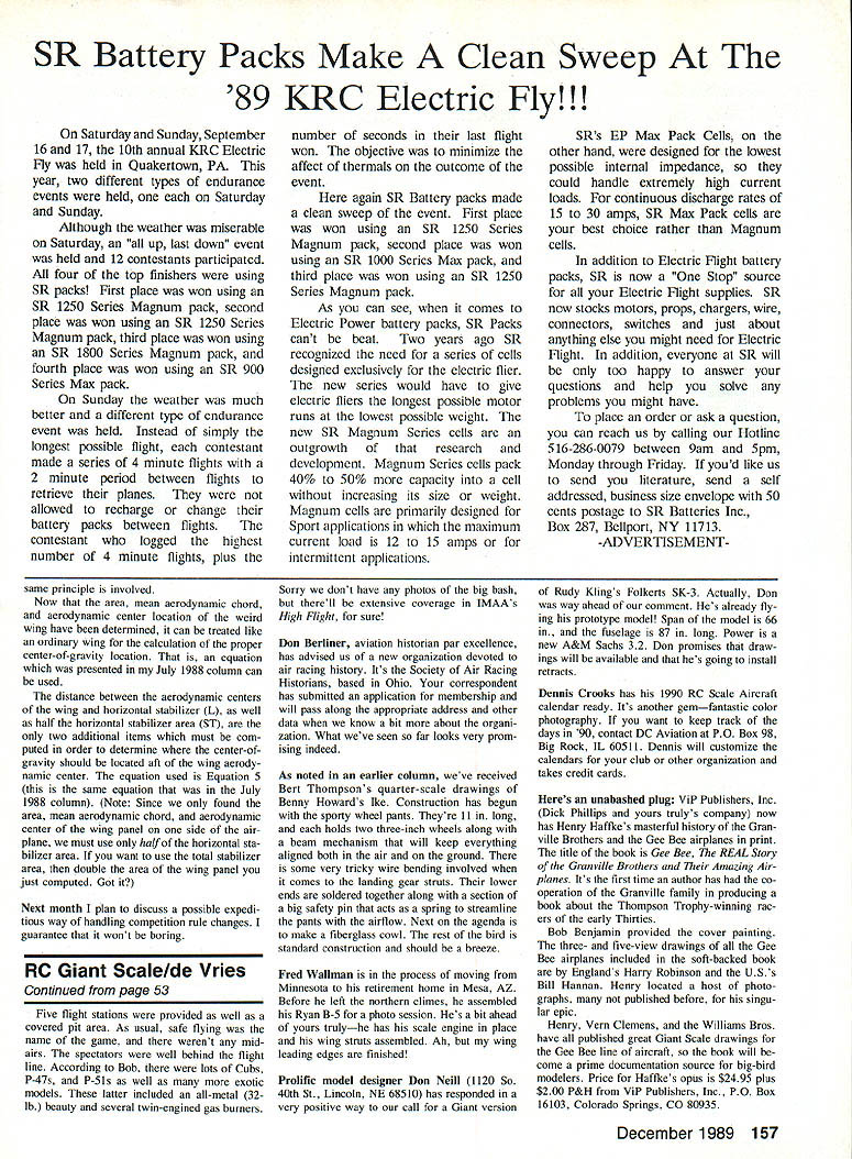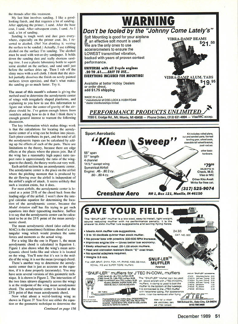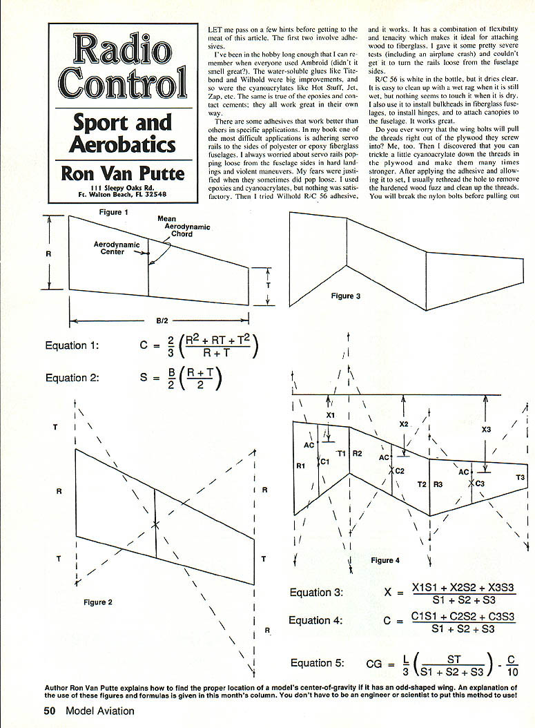 LET pass few hints before getting meat article first two involve adhe sives Ive hobby long enough can re member everyone used Ambroid didnt smell great water-soluble glues like Tite bond Wilhold big improvements cyanoacrylates like Hot Stuff Jet Zap etc same true epoxies con tact cements work great own way some adhesives work better others specific applications book difficult applications adhering servo rails sides polyester epoxy fiberglass fuselages always worried about servo rails pop ping loose fuselage sides hard land ings violent maneuvers fears justi fied sometimes did pop loose used epoxies cyanoacrylates nothing satis factory tried Wilhold R/C 56 adhesive works has combination ot flexibility tenacity makes ideal attaching wood fiberglass gave some pretty severe tests including airplane crash couldnt get turn rails loose fuselage sides R/C 56 white bottle dries clear easy clean up wet rag still wet nothing seems touch dry also use install bulkheads fiberglass fuse lages install hinges attach canopies fuselage works great ever worry wing bolts will pull threads right Out plywood screw too discovered can trickle little cyanoacrylate down threads plywood make times stronger After applying adhesive allow ing set usually rethread hole remove hardened wood fuzz clean up threads will break nylon bolts before pulling out Figure 3 5/2 Equation 1 Equation 2 03 R2RTT2 _ B R-i-T\ 2 77 7 7 7 7 7 7 -4 R R AC Ri T Equation 3 Figure 2 IEquation 4 Equation 5 lvA xl IX21I/1 / X3 / T1 R2 AC C2AC I/ \T2R3 3 T3 I/ / I/ Figure 4 c C1S1C2S2-i-C3S3 Si 53 CG S1S3 C X1S1X2S2X3S3 Si S3 Author Ron Van Putte explains find proper location models center-of-gravity has odd-shaped wing An explanation use figures formulas given months column dont have engineer scientist put method use 50 Model Aviation Radio Control Sport Aerobatics Ron Van Putte I Sleepy Oaks Rd Ft Walton Beach FL 32548 R Figure 1 N T t t / T R 4 threads after treatment last hint involves sanding like goodlooking finish requires lot sanding After applying primer sand After base coat sand Afier subsequent coats sand As said lot sanding Sanding tough work dust goes especially primer coat So re sorted alcohol No drinking welling surface sanded Actually use rubbing alcohol surface Im sanding alcohol must used wet-or-dry sandpaper holds down sanding dust really shortens sand ing time use plastic laboratory bottle squirt some alcohol surface sand until just before surface dries up rub off slimy mess soft cloth think alco hol partially dissolves finish newly painted surfaces epoxies thats what makes sanding go much faster Try meat months column giving method used determine aerodynamic center wings irregularly shaped planforms explaining use information figure out center-of-gravity air plane should Ive gotten enough letters modelers asking think theres enough general interest warrant following discussion key information makes things work calculations locating aerody namic center wing can broken pieces piece contributes its part total aerodynamic inputs can calculated add ing up effects of parts limitations theory because edge effects places pieces join wing has reasonably high aspect ratio pect ratio approximately ratio wing span chord theory works out very well airfoil section has aerodynamic center aerodynamic center place airfoil pitching moment produced air flowing over airfoil independent airfoils angle attack seems unlikely such location exists does airfoils aerodynamic center lo cated point 25% chord back leading edge airfoil wont show inte gral calculus equation determining loca tion aerodynamic center because Model Aviation staff has fits trying get such equations typesetting machine Suffice say aerodynamic center can calcu lated 25% point mean aerody namic chord mean aerodynamic chord also called MAC Sometimes fictitious chord rec tangular wing would produce same forces moments actual wing wing like Figure 1 mean aerodynamic chord calculated Equation 1 Figure 1 also shows what wings mean aero dynamic chord looks like located wing Youll note its mid dle wing mean average chord Theres another way determine aerody namic center just accurate equa tion done properly accurately may have seen several versions geometric tech nique shown Figure 2 intersection two lines drawn diagonally across wing midpoint wing mean aerodynamic chord aerodynamic center located 25% point mean aerodynamic chord Now what about weird-looking wing shown Figure 3 first use either equa tion geometric technique determine Continued page 156 Sport Aerobatic 55 span 51 length 4 channel 14Y2 t wing Symetrical Airfoil Engine 45- 602cy 60- 804 SAVE YOUR FIELD P L2 mutt s ow coet easy nets ghr gI sournct ectuc og mutt e w U no p 0COCC perle ty t s anawe oAMArTtu Se uesuggeetoneandsavngfyng ede Meets AMA muffler rule suggestions 3 10 decIbels quIeter stock muffler No power loss poesible 300-500 RPM Improves engtne Idle s better fuel evunuany Cestly ettached moat 25-108 stoolt mufflers Heat arid Corrosion resistant BlaCk E coat finIsh No speotat adapters requIred WeIghs 35 ozs SN UF-LERTM pso ASP aPsr SNvA Pex P vlNE KAB OS MAX MUFFLER POYAL YS SUP5 FlOPS mutters Patented Kit includes rolled plans cut sanded pans formed landing gear wheel axels steerable tail wheel bracket push rod set other basic hardware 1 SNUF-LER mufflers JTEC IN-COWL mufflers anavaaanrn item F, 29 65 JTEc nvat5es 2496JThcwvvevu cat,, us JT 652 Fe elI 75 nfl jrtc nudfles 2495Thu SNUP-lSP Mutnier cats u5Cd220 rato mwsso JT653 FoeIlOIANTaiaeJTFCnxSSIee 2495 scale ar rattwd JTSC N-COWLrusor5vomanu200 ' lduede ZENOASI supte TIdeS OPS -nutflers elm eta b tu025 St 00 Tow 020 MAXI 30 sULLY SACHS DOLMASSI oTuct ye so,, 05 muffler canom tte tuSSIag84Tn020 N cwo2 N Ft canneeterl ta JTSC muffler59555 euwSan na 20th neearerw tubing Par socearanes teas remaved 50cr Syind -at-- a-- IS net available atysar SaSSy shw asoce oleserte wreediate eSipereet eseek MO Va MC ecoo 5Tuitt accented Add *25090 ups saw So COO 6%Fee ossemonue Sc