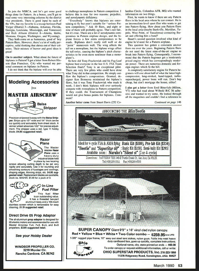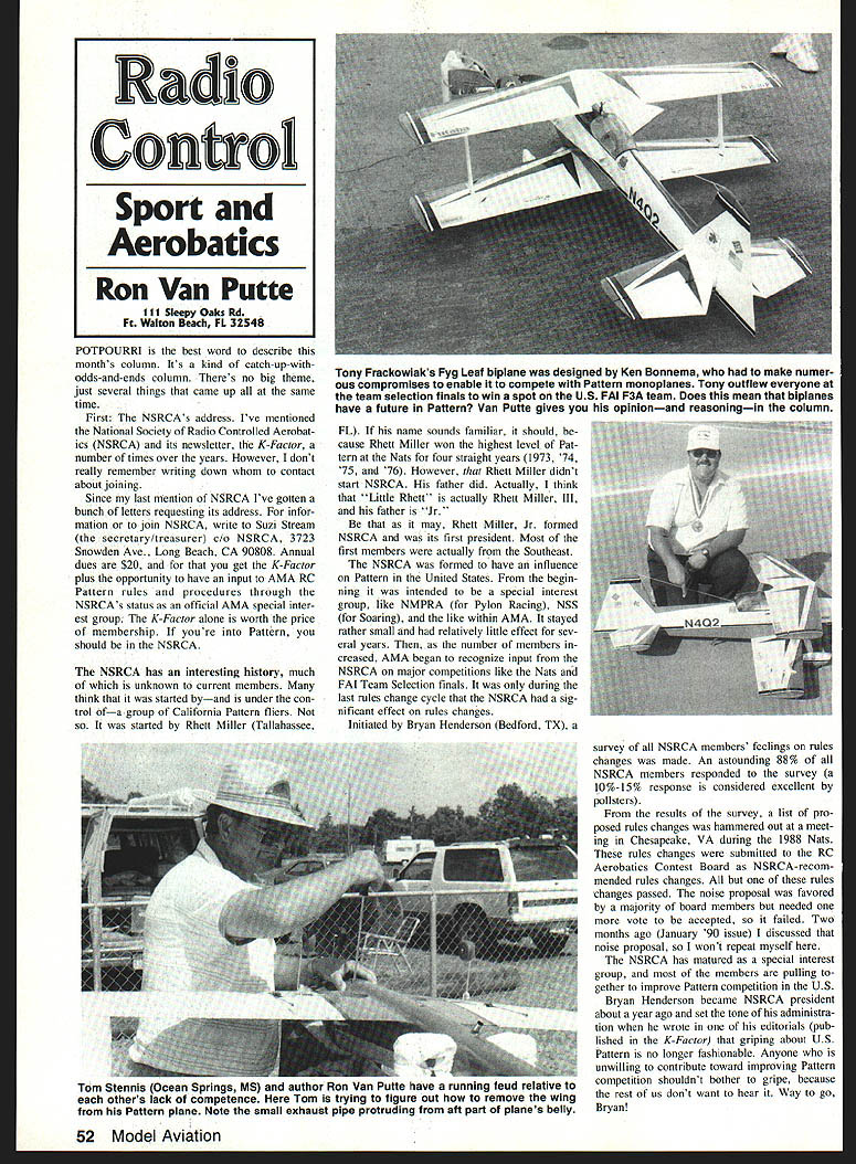 POTPOURRI best word describe months column Its kind catch-up-withodds-and-ends column Theres no big theme just several things came up same time First The NSRCAs address Ive mentioned National Society Radio Controlled Aerobat ics NSRCA its newsletter K-Factor number times over years However dont really remember writing down contact about joining Since last mention NSRCA Ive gotten bunch letters requesting its address infor mation join NSRCA write Suzi Stream secretary/treasurer c/u NSRCA 3723 Snowden Ave Long Beach CA 90808 Annual dues $20 get K-Factor plus opportunity have input AMA RC Pattern rules procedures through NSRCAs status official AMA special inter est group K-Factor alone worth price membership youre Pattern should NSRCA NSRCA has interesting history much unknown current members think started byand under con trol ofa group California Pattern fliers started Rhett Miller Tallahassee FL name sounds familiar should cause Rhett Miller won highest level Pat tern Nats four straight years 1973 74 75 76 However Rhett Miller didnt start NSRCA father did Actually think Little Rhett actually Rhett Miller III father Jr may Rhett Miller Jr formed NSRCA its first president Most first members actually Southeast NSRCA formed have influence Pattern United States begin ning intended special interest group like NMPRA Pylon Racing NSS Soaring like within AMA stayed rather small relatively little effect sev eral years number members creased AMA began recognize input NSRCA major competitions like Nats FAI Team Selection finals during last rules change cycle NSRCA sig nificant effect rules changes Initiated Bryan Henderson Bedford TX survey NSRCA members feelings rules changes made An astounding 88% NSRCA members responded survey lO%-15% response considered excellent pollsters results survey list pro posed rules changes hammered Out meet ing Chesapeake VA during 1988 Nats rules changes submitted RC Aerobatics Contest Board NSRCA-recom mended rules changes rules changes passed noise proposal favored majority board members needed vote accepted failed Two months ago January 90 issue discussed noise proposal wont repeat myself NSRCA has matured special interest group members pulling gether improve Pattern competition US Bryan Henderson became NSRCA president about year ago set tone administra tion wrote editorials pub lished K-Factor griping about US Pattern no longer fashionable Anyone unwilling contribute toward improving Pattern competition shouldnt bothet gripe because rest us dont want hear Way go Bryan 52 Model Aviation Rado Control Sport Aerobatics Ron Van Putte III Sleepy Oaks Rd F Wakon Beach FL 32548 Tony Frackowiaks Fyg Leaf biplane designed Ken Bonnema make numer ous compromises enable compete Pattern monoplanes Tony outfiew everyone team selection finals win spot US FAI F3A team Does mean biplanes have future Pattern Van Putte gives opinionand reasoningin column Tom Stennis Ocean Springs M ano ausnor non van russe have running seua reiasive others lack competence Tom trying figure out remove wing Pattern plane Note small exhaust pipe protruding aft part planes belly So join NSRCA lets get some good things done Pattern As bonus youll get read some very interesting columns district vice presidents good input VPs favorite tossup between Paul Verger District 3Alabama Arkansas Florida Georgia Louisiana Mississippi Tennessee Rick Allison District 8Alaska Idaho Montana Oregon Washington Wyoming both come humorous good ol boy Pattern fliers However theres lot really per ceptive solid thinking shines out col umns mixture humor good ideas great another subject What about future biplanes Pattern got letter Robert Hix son San Francisco CA wanted per sonal comment biplanes Pattern think biplane will ever able Modeling Accessories 5Onr MAStER AI1tSCRE1 Balsa Stripper Precision stripwood easy Balsa Strip per Strips up 1/2 wide 114 thick can cut quickly accurately sheet stock vernier wheel advances 1/32 precise adjust ment stripper uses std type 11 hobby blade $495 suggested retail Razor Master Mscww r 14lane Plane uses heavy-duty industrial blade held place two locating screws allowing cutting depth set very rigidly accurately Use rounding smoothing contours fuselages cowlings shaping edges thinning strips etc $495 sug gested retail Replacement blades available stock no MA21O1 $149 pack 3 c3c In-Line FuelFilter fuel filter outstanding value has threaded two-part sum num body 100-mesh stainless screen removeable easy cleaning $119 suggested retail Direct Drive 05 Prop Adaptor all-aluminum prop adaptor designed 05 electric motors recommended use Master Airacrew 7x4 7x6 8x4 8x6 propellers $95 suggested retail See Hobby Dealer WINDSOR PROPELLER Co 3219 Monier Cir Rancho Cordova CA 95742 challenge monoplanes Pattern competition believe true two reasons prejudice aerodynamic deficiency Everybody knows biplanes enter taining fly arent suitable serious Pat tern competitors Ask 10 fliers eight nine will probably agree Thats fair its true lot aerodynamic com promises Pattern airplane design bi plane forces few extra compromises made Biplanes dont really roll well point maneuvers well wing affects tail monoplane biplane wings affect tail twice causing biplanes pitch charac teristics nonlinear mono planes So did Tony Frackowiak Fyg Leaf biplane beat everyone last US F3A Team Selection finals Tony exceptional pilot very few pilots could have done what Tony did competition simply outflew biplanes compromises Granted de signer Ken Bonnema minimized biplanes flaws Tony Frackowiak made work dont think biplanes will ever seriously compete monoplanes Pattern competition could Tournament Champions would give bonus points biplanes Com ment Another letter came Stuart Davis 252 Co lumbus Circle Columbus AFB MS wanted information two things First wants know Pattern fliers local area can contact intermediate-level sport flier wants get Pattern flying about Pattern fliers local area maybe Starkville Meridian Tu pelo West Point Tusc
