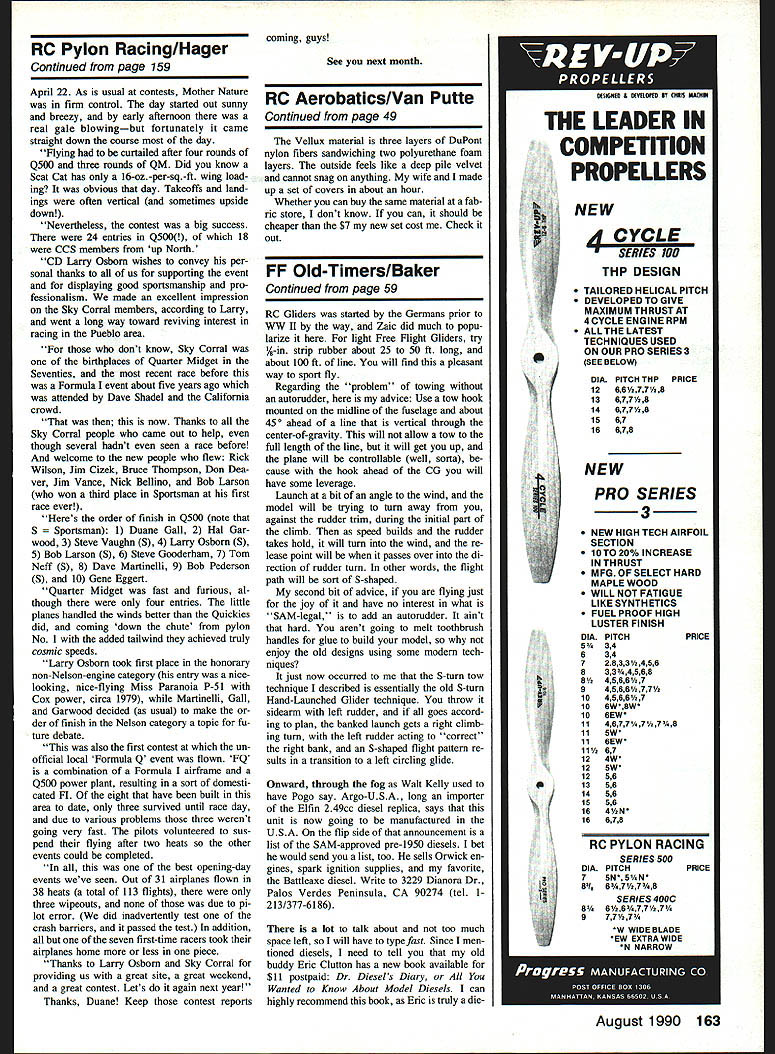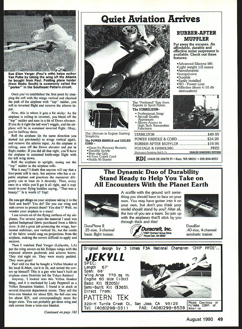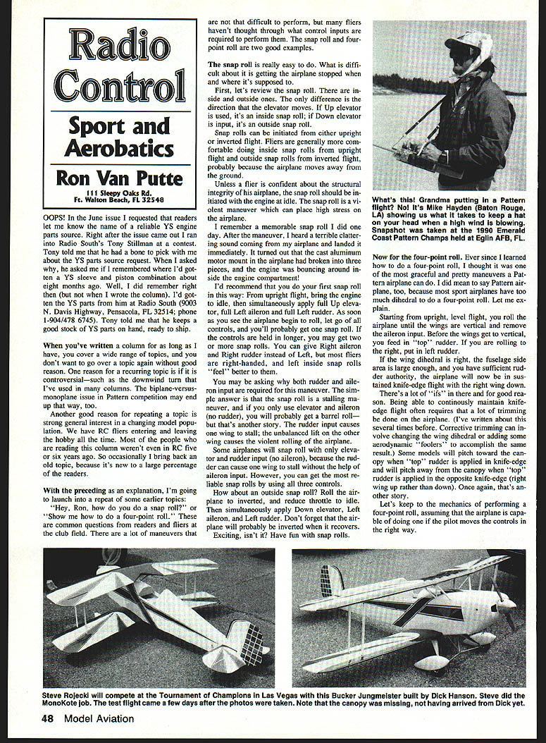 QOPS June issue requested readers let know name reliable YS engine parts source Right after issue came out ran Radio Souths Tony Stiliman contest Tony told bone pick about YS parts source request asked asked remembered Id got ten YS sleeve piston combination about eight months ago Well did remember right wrote column Id got ten YS parts him Radio South 9003 N Davis Highway Pensacola FL 32514 phone 1-904/478 6745 Tony told keeps good stock YS parts hand ready ship youve written column long have cover wide range topics dont want go over topic again good reason reason recurring topic controversialsuch downwind turn Ive used columns biplane-versusmonoplane issue Pattern competition may end up way too Another good reason repeating topic strong general interest changing model popu lation have RC fliers entering leaving hobby time Most people reading column werent RC five six years ago So occasionally bring back old topic because its new large percentage readers preceding explanation Im going launch repeat some earlier topics Hey Ron snap roll Show four-point roll common questions readers fliers club field lot maneuvers that difficult perform fliers havent thought through what control inputs required perform snap roll fourpoint roll two good examples snap roll really easy What diffi cult about getting airplane stopped its supposed First lets review snap roll side outside ones difference direction elevator moves Up elevator used its inside snap roll Down elevator input its outside snap roll Snap rolls can initiated either upright inverted flight Fliers generally com fortable doing inside snap rolls upright flight outside snap rolls inverted flight probably because airplane moves away ground Unless flier confident about structural integrity airplane snap roll should itiated engine idle snap roll vi olent maneuver can place high stress airplane remember memorable snap roll did day After maneuver heard terrible clatter ing sound coming airplane landed immediately turned out cast aluminum motor mount airplane broken three pieces engine bouncing around side engine compartment Id recommend first snap roll way upright flight bring engine idle simultaneously apply full Up eleva tor full Left aileron full Left rudder As soon see airplane begin roll let go controls youll probably get snap roll controls held longer may get two snap rolls can give Right aileron Right rudder instead Left fliers right-handed left inside snap rolls feel better may asking both rudder aile ron input required maneuver sim ple answer snap roll stalling ma neuver use elevator aileron no rudder will probably get barrel roll thats another story rudder input causes wing stall unbalanced lift other wing causes violent rolling airplane Some airplanes will snap roll eleva tor rudder input no aileron because rud der can cause wing stall help aileron input However can get re liable snap rolls using three controls about outside snap roll Roll air plane inverted reduce throttle idle simultaneously apply Down elevator Left aileron Left rudder Dont forget air plane will probably inverted recovers Exciting isnt Have fun snap rolls Now four-point roll Ever since learned four-point roll thought graceful pretty maneuvers Pat tern airplane can did mean say Pattern air plane too because sport airplanes have too much dihedral four-point roll Let ex plain Starting upright level flight roll airplane until wings vertical remove aileron input Before wings get vertical feed top rudder rolling right put left rudder wing dihedral right fuselage side area large enough have sufficient rud der authority airplane will now sus tained knife-edge flight right wing down Theres lot ifs good rea son Being able continously maintain knifeedge flight often requires lot trimming done airplane Ive written about several times before Corrective trimming can volve changing wing dihedral adding some aerodynamic foolers accomplish same result Some models will pitch toward can opy top rudder applied knife-edge will pitch away canopy top rudder applied opposite knife-edge right wing up rather down Once again thats other story Lets keep mechanics performing four-point roll assuming airplane capa ble doing pilot moves controls right way 48 Model Aviation Rado Confrol Sport Aerobatics Ron Van Putte III Sleepy Oaks Rd Ft Walton Beach FL 32548 Whats Grandma putting Pattern flight No Its Mike Hayden Baton Rouge LA showing us what takes keep hat head high wind blowing Snapshot taken 1990 Emerald Coast Pattern Champs held EglIn AFB FL Steve Rojecki will compete Tournament Champions Las Vegas Bucker Jungmelster built Dick Hanson Steve did MonoKote job test flight came few days after photos taken Note canopy missing having arrived Dick yet Once youve established first point stop ping roll wings vertical checked path airplane top rudder roll inverted flight remove aileron put Now gets bit sticky As airplane rolling inverted bleed off top rudder ease bit Down elevator right tail wont wiggle air plane will sustained inverted flight Okay youre halfway Roll airplane same direction started out previously wings vertical again remove aileron input As airplane rolling ease off Down elevator put Right rudder did right youll have airplane sustained knife-edge flight left wing down Roll airplane upright easing out top rudder airplane rolls easy doubt anyone will say four-point roll easy anyone has ca pable airplane practices maneuver dili gently can least decently once youll get right may result flying buddies saying beauty worth Yep get dings airplane taking field back use wing stab covers protect dont Well no wonder airplane mess use covers flying surfaces air planes several years material used quilted bedspread fabric purchased fabric store did great job protecting wings hor izontal stabilizer vertical fin inside fabric would snag projections airplane mairing covers difficult apply remove watched Paul Verger Lafayette LA put wing covers Eclipse wings exposed aileron pushrods aileron horns slid rig
