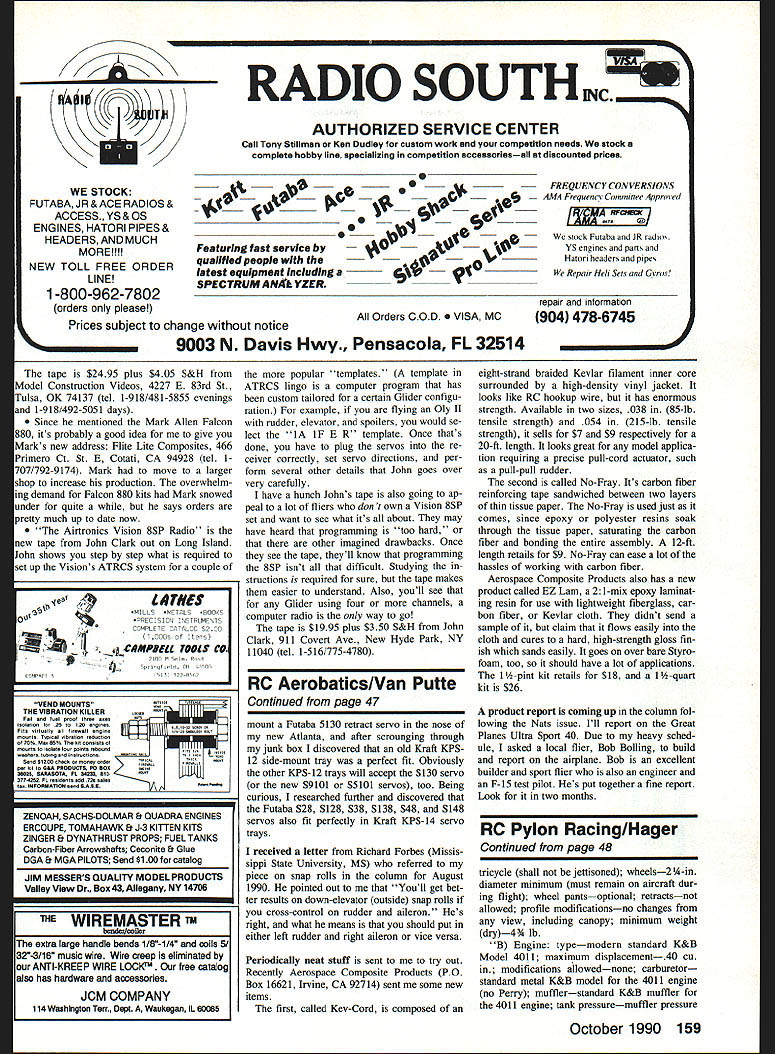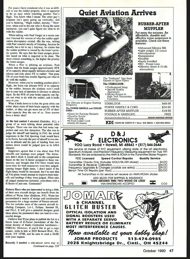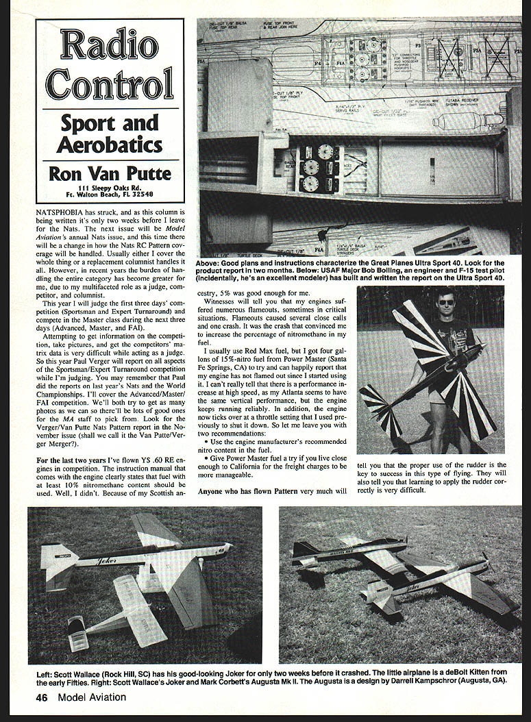 NATSPHOBIA has struck column being written its two weeks before leave Nats next issue will Model Aviation s annual Nats issue time will change Nats RC Pattern cov erage will handled Usually either cover whole thing replacement columnist handles However recent years burden han dling entire category has become greater due multifaceted role judge com petitor columnist year will judge first three days com petition Sportsman Expert Turnaround compete Master class during next three days Advanced Master FAI Attempting get information competi tion take pictures get competitors ma trix data very difficult acting judge So year Paul Verger will report aspects Sportsman/Expert Turnaround competition Im judging may remember Paul did reports last years Nats World Championships Ill cover Advanced/Master/ FAI competition Well both try get photos can therell lots good ones MA staff pick Look Verger/Van Putte Nats Pattern report No vember issue shall call Van Putte/Ver ger Merger last two years Ive flown YS 60 RE en gines competition instruction manual comes engine clearly states fuel least 10% nitromethane content should used Well didnt Because Scottish ancestry 5% good enough Witnesses will tell engines suf fered numerous flameouts sometimes critical situations Flameouts caused several close calls crash crash convinced increase percentage nitromethane fuel usually use Red Max fuel got four gal lons 15% -nitro fuel Power Master Santa Fe Springs CA try can happily report engine has flamed out since started using cant really tell performance crease high speed Atlanta seems have same vertical performance engine keeps running reliably addition engine now ticks over throttle setting used pre viously shut down So let leave two recommendations Use engine manufacturers recommended nitro content fuel Give Power Master fuel try live close enough California freight charges manageable Anyone has flown Pattern very much will tell proper use rudder key success type flying will also tell learning apply rudder cor rectly very difficult Left Scott Wallace Rock Hill SC has good-looking Joker two weeks before crashed little airplane deBolt Kitten early Fifties Right Scott Wallaces Joker Mark Corbetts Augusta Mk II Augusta design Darrell Kampschror Augusta GA 46 Model Aviation Radio Cono Sport Aerobatics Ron Van Putte III Sleepy Oaks Rd Ft Walton Beach FL 32548 Above Good plans instructions characterize Great Planes Ultra Sport 40 Look product report two months Below USAF Major Bob Boiling engineer F-15 test pilot incidentally hes excellent modeler has built written report Ultra Sport 40 years have wondered diffi cult use rudder properly appeared easy watching another fliers flight know what mean other guys airplane isnt quite going up vertically youre thinking Right rudder dummy ever youre flying same maneuver cant quite figure Out what rudder talking Paul Verger recent con test learned version rudder appli cation discrepancy existed way talking Paul consists mostly listening because usually has lot say Anyway claims rudder problem caused brains prior ity system says brain assigns priori ties based what required done critical something higher priority brain assigns flier piloting airplane Paul claims brain assigns approximately 95% its capacity about equally between elevator aileron about 5% rudder puny 5% brain has trouble figuring out what rudder However youre watching another pilots flight brain can allocate 95% its capacity rudder because airplane wont crash due lack attention elevator aileron input So 95% brain capacity can fig ure out what rudder looks easy What boils down great pilots can either share brain capacity rudder can get out 5% brain capacity rest us Does anyone have better idea last contest attended Gadsden AL group us talking about potential rules changes idea sup porters very few detractors idea judge takeoff landing FAI actual sequences FAI Sporting Code would have flown part takeoff two ters altitude part landing two meters down would judged just AMA classes Supporters agreed about time FAI takeoffs landings judged detrac tors didnt think would add competition based low K-factor assigned ma neuvers thought FAI fliers would take time both maneuvers judged causing longer flight times dont know flight times would increased Im sure FAI pilots would attempt improve take offs landings judged Pilots take judged maneuvers seriously K-factor just Comments Pattern fliers interested doing little own aircraft design can benefit efforts Wynn Aker Endicott NY Wynn has accumulated matrix design construction parameters large number Pattern aircraft list includes current aircraft cluding Conquest LA-i Eclipse Summit III PA-2 will give potential designer good ideas about parameters can lead suc cessful design believe Wynn plans publish list future issue K-Factor newsletter Na tional Society Radio Controlled Aerobatics NSRCA However youd like get copy sooner write him 2022 Bernard Blvd En dicott NY 13760 sure send SASE request Recently needed side-mount servo tray Continued page 159 Ultimate Engine Starting Simplicity POWER HANDLE COILED CORD Great Runway Restarts Durable Acrylic Non-slip Grip 6 Foot Coiled Cord Holds Ni-Starter Preferred Tray ftom Experts Sport Flyers STAEILIZOR Professional Strap Aircraft Quality Aluminum Allows Access High Tech Transmitter Functions RUBBER-AFTER MUFFLER Put away excuses An affordable durable effective noise surpressor available Check out features Advanced Silicone Mtl Light weight 1/2 ounce Aerodynamic elnexpensive eDurable 0 Easily Installed eNO Power Loss Effective 4-10 db attenuation STABILIZOR$4995 POWER HANDLE & CORD$2495 RUBBER-AFTER MUFFLER$1995 POSTAGE & HANDLINGFREE Washrgton Resderns Add 5 1%DEALU INQUIRIES INVITED KDI 10426 SE 206TH P1 WA 98031 854-8053 October 1990 47 Quiet Aviation Arrives F D&J ELECTRONICS 900 Lucy Road ll MI 48843 54626 service makes RIO equipment utilizing state art electronics Spectrum Analyzer Precision Frequency Measuring equipment True 1991 Standa