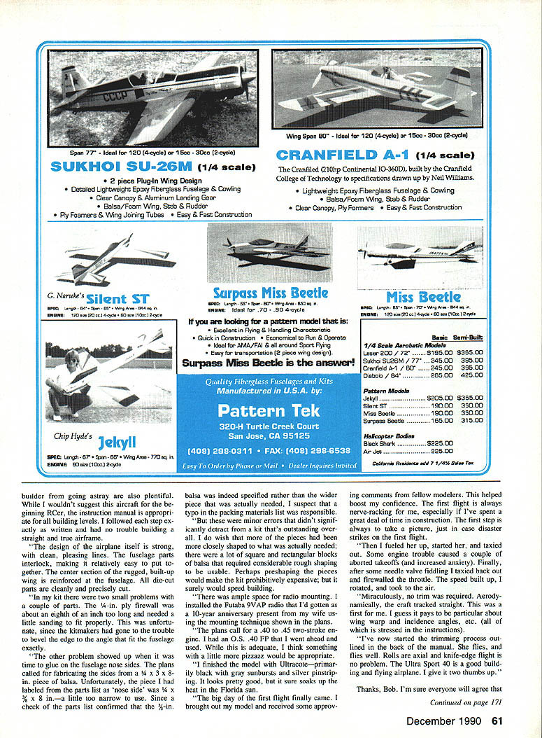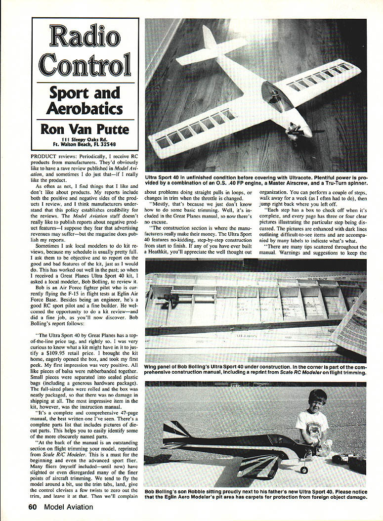 PRODUCT reviews Periodically receive RC products manufacturers Theyd obviously like have rave review published Model Avi ation sometimes just thatif really like product As often find things like dont like about products reports include both positive negative sides prod ucts review think manufacturers under stand policy establishes credibility reviews Model Aviation staff doesnt really like publish reports about negative prod uct featuresI suppose fear advertising revenues may sufferbut magazine does pub lish reports Sometimes ask local modelers kit re views because schedule usually pretty full ask objective report good bad features kit just would has worked out well past received Great Planes Ultra Sport 40 kit asked local modeler Bob Boiling review Bob Air Force fighter pilot cur rently flying F-iS flight tests Eglin Air Force Base Besides being engineer hes good RC sport pilot fine builder wel comed opportunity kit reviewand did fine job youll now discover Bob Boilings report follows Ultra Sport 40 Great Planes has topof-the-line price tag rightly very curious know what kit might have jus tify $10995 retail price brought kit home eagerly opened box took first peek first impression very positive like pieces balsa rubberbanded together Small pieces separated sealed plastic bags including generous hardware package full-sized plans rolled box neatly packaged no damage shipping impressive item kit however instruction manual Its complete comprehensive 47-page manual best written Ive seen Theres complete parts list includes pictures diecut parts helps easily identify some obscurely named parts back manual outstanding section flight trimming model reprinted Scale RIC Modeler must beginning advanced sport flier fliers myself includeduntil now have slighted disregarded finer points aircraft trimming tend fly model around bit use trim tabs land give control devises few twists zero out trim leave well complain about problems doing straight pulls loops changes trim throttle changed Mostly thats because just dont know some basic trimming Well its cluded Great Planes manual now theres no excuse construction section manu facturers really make money Ultra Sport 40 features no-kidding step-by-step construction start finish have ever built Heathkit youll appreciate well thought out organization can perform couple steps walk away week often jump right back left off step has box check off its complete page has three four clear pictures illustrating particular step being dis cussed pictures enhanced dark lines outlining difficult-to-see items accompa nied labels indicate whats what tips scattered throughout manual Warnings suggestions keep 60 Model Aviation Rado Conoi Sport Aerobatics Ron Van Putte Ill Sleepy Oaks Rd Ft Walton leach FL 32548 Ultra Sport 40 unfinished condition before covering Ultracote Plentiful power pro vided combination 05 40 FP engine Master Airscrew Tru-Turn spinner Wing panel Bob Boilings Ultra Sport 40 under construction corner part com prehensIve construction manual including reprint Scale RC Modeler flight trimming Bob Boilings son Robbie sitting proudly next fathers new Ultra Sport 40 Please notice Eglin Aero Modelers pit area has carpets protection foreign object damage 2 piece Plug-In Wing Design Detailed Lightweight Epoxy Fiberglass Fuselage & Cowing Clear Canopy & Aluminum Landing Gear Balsa/Foam Wng Stab & Rudder Ply Foamss & Wng Joining Tubes y & Fast Consuobon GNarukesSjlqflt ST IPIC Lange 54 g 4. 644 eq ENUNE 920 20 oi 4-o4a . 9 2 ognI Cranfiled l0hp Conilnental 10-3601) built Cranfield College Technology spedfications drawn up Neil Williams Lightweight Epoxy Fiberglass Fuselage & Cowling Balsa/Foam Wng Stab & Rudder Clear Canopy P Formers & Fast Conuobon yau Ioaldng fo pni model Exoallant Flying & Handling Qia-soteriado Quick Corwmuction mal & Operate Ideal AMA/FAi & around Sport Flying Easy uansportauon 2 peca wing design] Surpass Miss Beetle answei jy~ Miss Beetle IPEC LagS 25 Wng k- BAA eq ENUNI 920a 20 60. Cl ai 2-gai Bauc Semi-Built 1/4 Seals ArobaclcModels Laear200/72$19500$35500 Sukhoi SU26M / 77. 2450039500 Cranfield A-I / 602450039500 isbolo / 842650042500 Pattern Models Jekyll$20500 Slant ST19000 lisa Beetle19000 ,rpaes Beetle16500 $36500 35000 35000 31500 HEcopter Bade Black Shark$22500 ir Jet22500 Calif ares Resident add 71/4% Sale Tax builder going astray also plentiful wouldnt suggest aircraft ginning RCer instruction manual appropri ate building levels followed step ex acfly written no trouble building straight true airframe design airplane itself strong clean pleasing lines fuselage parts interlock making relatively easy put gether center section rugged built-up wing reinforced fuselage die-cut parts cleanly precisely cut kit two small problems couple parts h-in ply firewall about eighth inch too long needed little sanding fit properly unfortu nate since kitmakers gone trouble bevel edge angle fit fuselage exactly other problem showed up time glue fuselage nose sides plans called fabricating sides x 3 x 8in piece balsa Unfortunately piece labeled parts list nose side x x 8 ina little too narrow use Since check parts list confirmed %-in balsa indeed specified rather wider piece actually needed suspect typo packing materials list responsible minor errors didnt signif icantly detract kit thats outstanding over wish pieces closely shaped what actually needed lot square rectangular blocks balsa required considerable rough shaping usable Perhaps preshaping pieces would make kit prohibitively expensive surely would speed building ample space radio mounting installed Futaba 9VAP radio Id gotten 10-year anniversary present wife us ing mounting technique shown plans plans call 40 45 two-stroke en gine 05 40 FP went ahead used adequate think something little pizzazz would appropriate finished model Ultracoteprimar ily black gray sunbursts silver pinstrip ing looks pretty good sure soaks up heat Florida sun big day first flight finally came brought out model received 