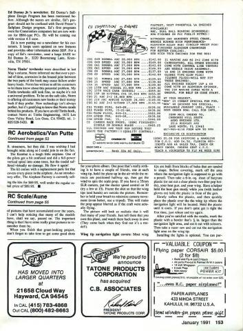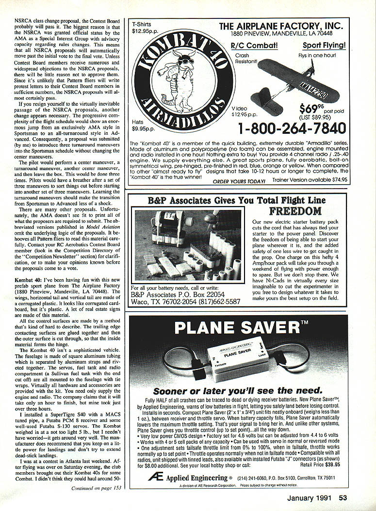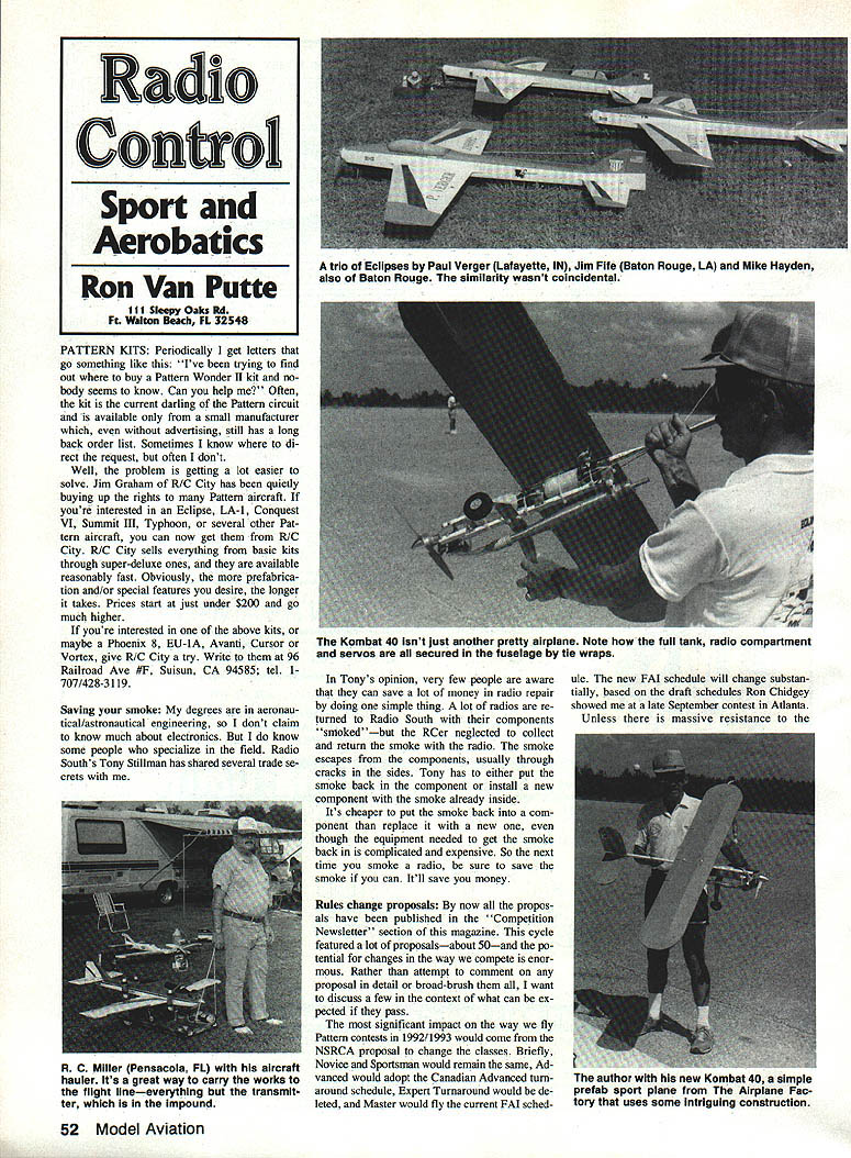 PATrERN KITS Periodically get letters go something like ive trying find out buy Pattern Wonder II kit no body seems know Can help Often kit current darling Pattern circuit available small manufacturer advertising still has long back order list Sometimes know di rect request often dont Well problem getting lot easier solve Jim Graham R/C City has quietly buying up rights Pattern aircraft youre interested Eclipse LA-i Conquest VI Sunimit III Typhoon several other Pat tern aircraft can now get R/C City R/C City sells everything basic kits through super-deluxe ones available reasonably fast Obviously prefabrica tion and/or special features desire loiiger takes Prices start just under $200 go much higher youre interested above kits maybe Phoenix 8 EU-lA Avanti Cursor Vortex give R/C City try Write 96 Railroad Ave #F Suisun CA 94585 tel 1707/428-3119 Saving smoke degrees aeronau tical/astronautical engineering dont clalm know much about electronics know some people specialize field Radio Souths Tony Stillman has shared several trade se crets Tonys opinion very few people aware can save lot money radio repair doing simple thing lot radios re turned Radio South components smoked RCer neglected collect return smoke radio smoke escapes components usually through cracks sides Tony has either put smoke back component install new component smoke already inside Its cheaper put smoke back com ponent replace new though equipment needed get smoke back complicated expensive So next time smoke radio sure save smoke can Itll save money Rules change proposals now propos als have published Competition Newsletter section magazine cycle featured lot proposalsabout 50and po tential changes way compete enor mous Rather attempt comment proposal detail broad-brush want discuss few context what can ex pected pass significant impact way fly Pattern contests 1992/1993 would come NSRCA proposal change classes Briefly Novice Sportsman would remaln same Ad vanced would adopt Canadian Advanced turn around schedule Expert Turnaround would de leted Master would fly current FAI sched ule new FAI schedule will change substan tially based draft schedules Ron Chidgey showed late September contest Atlanta Unless massive resistance 52 Model Aviation Radio Confrol Sport Aembatics Ron Van Putte lii Sleepy Oaks Ed Ft Waitos leach FL 32548 trio Eclipses Paul Verger Lafayette IN Jim Fife Baton Rouge LA Mike Hayden also Baton Rouge similarity wasnt coincidental Kombat 40 isnt Just another pretty airplane Note full tank radio compartment servos secured fuselage tie wraps R C Miller Pensacola FL aircraft hauler Its great way carry works flight lineeverythIng transmit ter impound ne author new iornbat 40 simple prefab sport plane Airplane Fac tory uses some intriguing construction NSRCA class change proposal Contest Board probably will pass biggest reason NSRCA granted official status AMA Special Interest Group advisory capacity regarding rules changes means NSRCA proposals will automatically move past initial vote final vote Unless Contest Board members receive numerous widespread objections NSRCA proposals will little reason approve Since its unlikely Pattern fliers will write protest letters Contest Board members sufficient numbers NSRCA proposals will al certainly pass resign yourself virtually inevitable passage NSRCA proposals another change appears necessary progressive com plexity flight schedule would show enor mous jump exclusively AMA style Sportsman all-turnaround style Ad vanced Consequently proposal submitted introduce three turnaround maneuvers Sportsman schedule changing center maneuvers pilot would perform center maneuver turnaround maneuver another center maneuver leave box would done three times Pilots would have breather after set three maneuvers sort things out before starting another set three maneuvers Learning turnaround maneuvers should make transition Sportsman Advanced less shock other proposals Unfortu nately AMA doesnt sec fit print what proposers required submit ab breviated versions published Model Aviation omit underlying logic proposals hooves Pattern fliers read material care fully Contact RC Aerobatics Contest Board member look Competition Directory Competition Newsletter section clarifi cation make opinions known before proposals come vote Kombat 40 Ive having fun new prefab sport plane Airplane Factory 1880 Pineview Mandeville LA 70448 wings horizontal tail vertical tail made corrugated plastic looks like corrugated card board its plastic lot real estate signs made material control surfaces made method thats kind hard describe tralhing edge contacting surfaces glued together outer surface cut through inside material forms hinge Kombat 40 isnt sophisticated vehicle fuselage made square aluminum tubing separated aluminum straps riv eted together servos fuel tank radio compartment Sullivan fuel tank end cut off mounted fuselage tie wraps Virtually hardware accessories provided kit need supply engine radio company claims will take hour finish took just over three hours installed SuperTigre S40 MACS tuned pipe Futaba PCM 8 receiver some well-used Futaba S-130 servos Kombat weighed too light 5 lb neednt have worriedit gets around very well man ufacturer does recommend keep littie power landings dont try extend dead-stick landings contest Atlanta last weekend Af ter flying over Saturday evening club members brought Out Kombat 40s some Combat didnt think could haul around 50Continued page 153 T-Shirts $l295pp THE AIRPLANE FACTORY INC 1880 PINEVIEW MANDEVILLE LA 70448 R/C Combat \ ~ant V ideo $1295 pp Sport Flying Flys hourl post paid LIST $89 95 1-800-264-7840 Kombat 40 member quick building extremely durable Armadillo series Made aluminum polypropelyne no foam can assembled engine mounted radio installed hourl NoThing extra buyl provide 4 channel radio / 25-40 engine supply everything else great spots plane fully aerobatic bolt-on symmetrical wing pre-hinged pre-finished red blue orange yellow compared other 