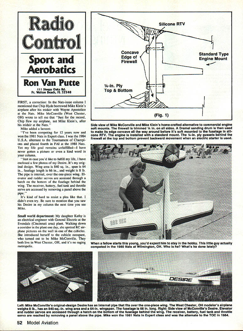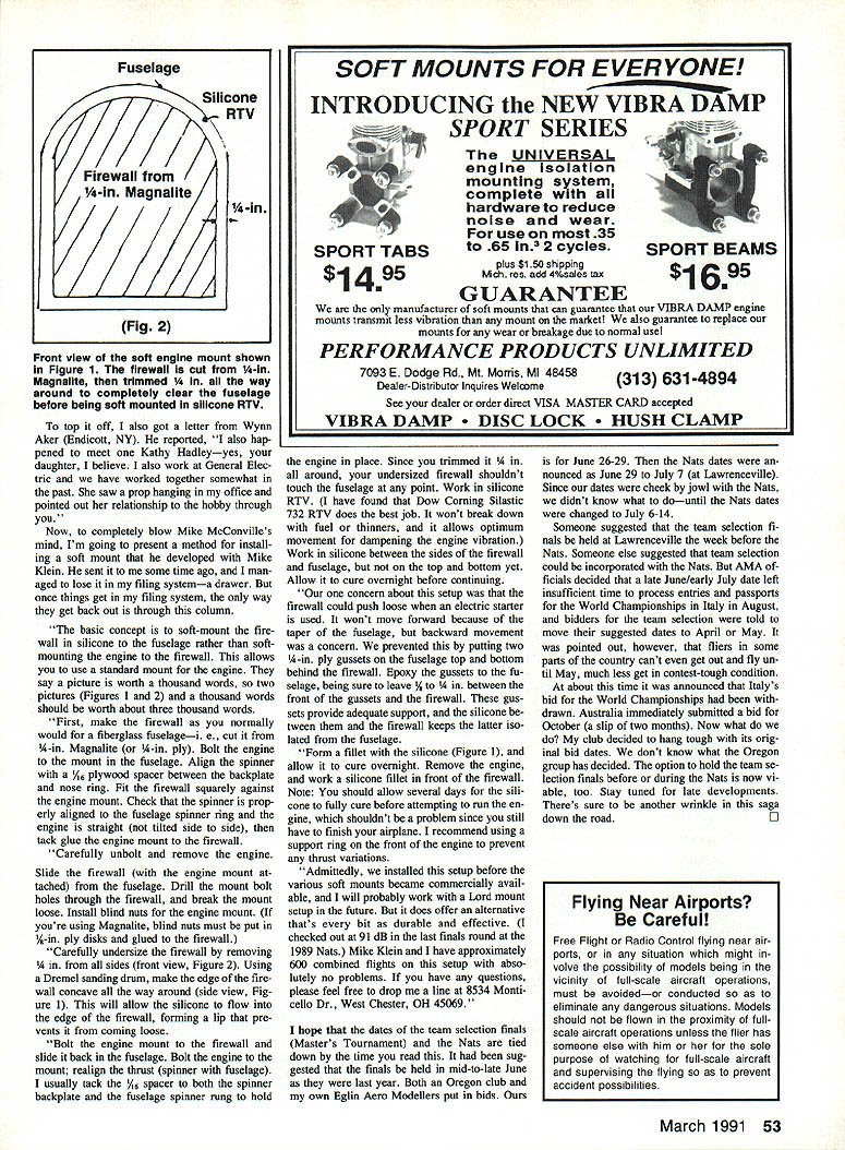 FIRST correction Nats-issue column mentioned Chip Hyde borrowed Mike Kleins airplane after midair Wayne Apostolico Nats Mike McConville West Chester OH wrote tell Just record Chip flew airplane Mike Kleins after midair Nats Mike added lament Ive competing 12 years now won 1981 Nats Expert class 1984 USA alternate Tournament Champi ons placed fourth FAI 1988 Nats Yet life goal remains unfulfilledI have never gotten picture kind word column Just case youd like fulfill life have enclosed few photos Desire Its orig inal design Wing area 840 sq span 64 fuselage length 66 weight 8 lb pipe internal over one-piece wing El evator rudder servos accessed through hatch bottom fuselage behind wing receiver battery fuel tank throttle servo accessed removing panel above pipe Its kind hard resist plea like didnt try sure mention saw Desire column next time see Mike Small world department daughter Kathy electrical engineer General Electric Evendale Cincinnati area plant Walking down corridor plant day spotted RC air plane pictures wall cubicles introduced herself cubicle occupant turned out Mike McConville both live West Chester OH its no raging metropolis Side view Mike McConville Mike Kleins home-crafted alternative commercial engine soft mounts firewall trimmed 14 sides Dremel sanding drum used make its edge concave way around before its soft mounted fuselage sili cone RTV engine installed standard mount -In ply gussets behind firewall top bottom prevent backward movement electric starter used Left Mike McConvilles original-design Desire has Internal pipe fits over one-pIece wing West Chester OH modelers airplane weighs 8 lb has 840-sq-in wing area 64-in wingspan fuselage 1s66 long RIght Side view McConvllles Desire Elevator rudder servos accessed through hatch bottom fuselage behind wing receiver battery fuel tank throttle servo reached removing panel above pipe MIke won 1981 Nats Expert class alternate TOC 1984 52 Model Aviation RadEo Control Sport Aembatics Ron Van Putte III Sleepy Oaks Rd Fa Waltoii Beach FL 32548 Standard Type Engine Mount -in Ply Top & Bottom Fig 1 fellow starts young youd expect him stay hobby little guy actually competed 1980 Nate Wilmington OH Whats done lately Front view soft engine mount shown Figure 1 firewaii cut -in Magnalite trimmed way around completeiy ciear fussiage before being soft mounted siiicone RTV top off also got letter Wynn Aker Endicott NY reported also hap pened meet Kathy Hadleyyes daughter believe also work General Elec tric have worked together somewhat past saw prop hanging office pointed out relationship hobby through Now completely blow Mike McConvilles mind Im going present method install ing soft mount developed Mike Klein sent some time ago man aged lose filing systema drawer once things get filing system way get back out through column basic concept soft-mount fire wall silicone fuselage rather softmounting engine firewall allows use standard mount engine say picture worth thousand words two pictures Figures 1 2 thousand words should worth about three thousand words First make firewall normally would fiberglass fuselagei e cut A-in Magnalite A-in ply Bolt engine mount fuselage Align spinner /, plywood spacer between backplate nose ring Fit firewall squarely against engine mount Check spinner prop erly aligned fuselage spinner ring engine straight tilted side side tack glue engine mount firewall Carefully unbolt remove engine Slide firewall engine mount tached fuselage Drill mount bolt holes through firewall break mount loose Install blind nuts engine mount youre using Magnalite blind nuts must put A-in ply disks glued firewall Carefully undersize firewall removing sides front view Figure 2 Using Dremel sanding drum make edge fire wall concave way around side view Fig ure 1 will allow silicone flow edge firewall forming lip pre vents coming loose Bolt engine mount firewall slide back fuselage Bolt engine mount realign thrust spinner fuselage usually tack /i6 spacer both spinner backplate fuselage spinner rung hold SOFT MOUNTS FOR EVERYONE INTRODUCING NEW VIBRA DAMP SPORT TABS SPORT SERIES UNIVERSAL engine Isolation mounting system complete hardware reduce noise wear use 35 65 In3 2 cycles plus $1 50 shipping Mich res add 4%saleS talc GUARANTEE manufacturer soft mounts can guarantee VIBRA DAMP engine mounts transmit less vibration mount maiket also guarantee replace mounts wear breakage due normal use PERFORMANCE PRODUCTS UNLIMITED 7093 E Dodge Rd Mt Morris MI 48458 Dealer-Distributor inquires Welcome See dealer order direct VISA MASTER CARD accepted VIBRA DAMP LOCK CLAMP engine place Since trimmed 1A around undersized firewall shouldnt touch fuselage point Work silicone RTV have found Dow Coming Silastic 732 RTV does best job wont break down fuel thinners allows optimum movement dampening engine vibration Work silicone between sides firewall fuselage top bottom yet Allow cure overnight before continuing concern about setup firewall could push loose electric starter used wont move forward because taper fuselage backward movement concern prevented putting two A-in ply gussets fuselage top bottom behind firewall Epoxy gussets fu selage being sure leave een front gussets firewall gus sets provide adequate support silicone tween firewall keeps latter iso lated fuselage Form fillet silicone Figure 1 allow cure overnight Remove engine work silicone fillet front firewall Note should allow several days sili cone fully cure before attempting run en gine shouldnt problem since still have finish airplane recommend using support ring front engine prevent thrust variations Admittedly installed setup before various soft mounts became commercially avail able will probably work Lord mount setup future does offer alternative thats bit durable effective checked out 91 dB last finals round 1989 Nats Mike Klein have approximately 600 combined flights setup abso lutely no problems have questions please feel free drop line 8534 Monti cello Dr West Chester OH 45069 hope 