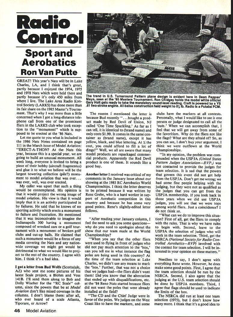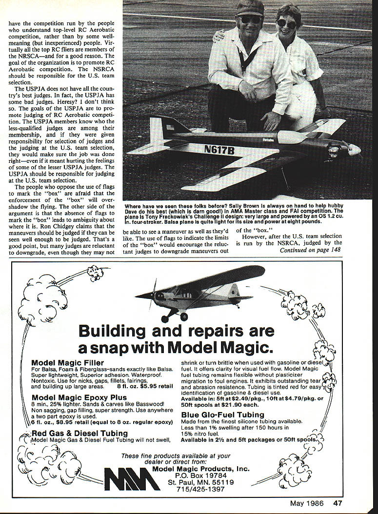 Radio Control Sport Aerobatics Ron Van Putte GREAT years Nats will Lake Charles LA think thats great partly because enjoyed 1974 1975 1978 Nats held partly because its 450 miles live Lake Area Radio Kon trol Society LARKS has done its fair share 1985 Masters Tourna ment Thats little concerned got long-distance tele phone call prominent fliers LARKS club took excep tion monument sup posed erected 86 Nats Let quote what included 1986 Nats Notes contained page 111 March issue Model Aviation ERECT-A-THON Nats year because special year going build unusual monument week long everyone invited bring piece hobby aircraft fragmentus glue what believe will largest towering collection pile monu ment model aviation ever. ever well ever erected caller upset such thing would contemplated opinion would project wrong image model aviation view would imply activity participated failures said knows no sporting activity erects monument failure frustration mentioned inconceivable imagine Indianapolis 500 having monument composed wrecked cars golf tour nament monument broken golf clubs cut-up balls claimed such monument would focus media covering Nats nation wide coverage might get would detrimental what would like proj ect rest country agree him think its bad idea got letter Bud Wolfe Scottsdale AZ sent some pictures latest Scale project Rlohm Voss 141B Ill send along Bob Dolly Wischer RC Scale col umn since powers Model Aviation dont like mixed coverage columns dont blame after ever heard scale Atlanta Tiporare Arrow reason mentioned letter because Bud recently ught prod uct made Red Devil Union NJ called Time Spackling As far can tell identical brand name costs $199 comes same con tainer brand name except has yellow black blue lettering Y cost could afford fill lot dings Well aware model products repackaged commer cial products Apparently Red Devil product sounds like good buy Another letter received critical comments January issue about showing 1985 RC Aerobatics World Championships think letter deserves printed because written Rene Grebe hard worker sup port Aerobatic competition country because has some very good points Renes slightly-edited letter follows After reading January column feel need ask some questions need apologize about show team made World Championships say other fliers used flying front judges did pay much attention box can tell what instance flag poles being used country time team selection Lake Charles didnt use means mark box Further choice judges hadthe fliers didnt want Did know altercation ended up disqualifications etc 84 Reno Nats started because fliers did want poles already installed field CD Chief Judge favor poles judges West Coast like have markers some clubs have markers contests Personally what would like see person judge designated call outs can accomplish feel will get away some favoritism fliers like flags What afraid So can see dont buy argument think outfiown World Championships opinion problem com pounded USPJA United States Pattern Judges AssociationR VP contacted provide judges team selection sad powers govern event did get help USPJA Dont get wrong some fine people helping judging qualified judges can get USPJA membership look back years did use USPJA judges will see tops among world fliers Just coincidence think What can improve situa tion First get fliers comply rules have rules begin Second leave USPJA selection judges will work team selection Third get NSRCA National Society Radio Con trolled AerobaticsR VP involved contest team selection will terested opinion matters Needless say dont agree everything Rene wrote However does make some good points First agree team selection should run NSRCA Second also agree judging US team selection should done USPJA members Third agree flags should used indicate limits box NSRCA did run least team selection 1975 dont know think its good idea ins trend US Turnaround Pattern plane design evident Dean Pap r ae Maya seen 85 Masters Tournament Ron ChldgBy holds model off cial Gary Holt gets ready take mandatory sound-level reading Craft powered VS 61 two-stroke engine All-balsa construction held weight 8A lb Radio Futaba PCM have competition run people understand top-level RC Acrobatic competition rather some wellmeaning inexperienced people Vir tually top RC fliers members NRSCAand good reason goal organization promote RC Aerobatic competition NSRCA should responsible US team selection USPJA does have coun trys best judges fact USPJA has some bad judges Heresy dont think goals USPIA pro mote judging RC Acrobatic competi tion USPJA members know less-qualified judges among membership given responsibility selection judges judging US team selection would make sure job done righteven meant hurting feelings some lesser USPJA judges USPJA should responsible judging US team selection people oppose use flags mark box afraid enforcement box will over shadow flying other side argument absence flags mark box leads ambiguity about Ron Chidgey claims maneuvers should judged can seen well enough judged Thats good point judges reluctant downgrade though may C 7 able see maneuver well theyd box like use flags indicate limits However after US team selection box would encourage reluc- run NSRCA judged tant judges downgrade maneuvers out Continued page 148 Model Magic Filler Balsa Foam & Fiberglasssands exactly like Balsa Super lightweight Superior adhesion Waterproof Nontoxic Use nicks gaps fillets fairings building up large areas8 fI oz $595 retail Model Magic Epoxy Plus 8 mm 25% lighter Sands & carves like Basswood \ Non sagging gap filling super strength Use anywhere two part epoxy used 8 fI oz $895 retail equal 8 oz regular epoxy shrink turn brittle used gasoline offers clarity visual fuel flow Model Magic - fuel tubing remains flexible plasticizer migration foul engines exhibits outstanding tear sion resistence Tubing tinted red easy identification gasoline & diesel use Available 5ff $249/pkg lOft $479/pkg SOft spools $2190 Blue Gb-Fuel Tubing
