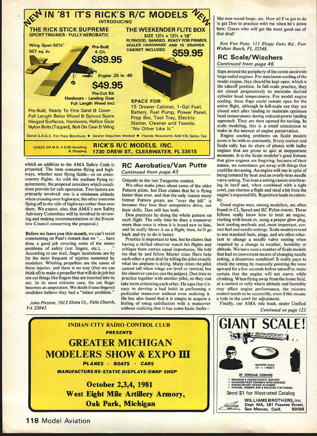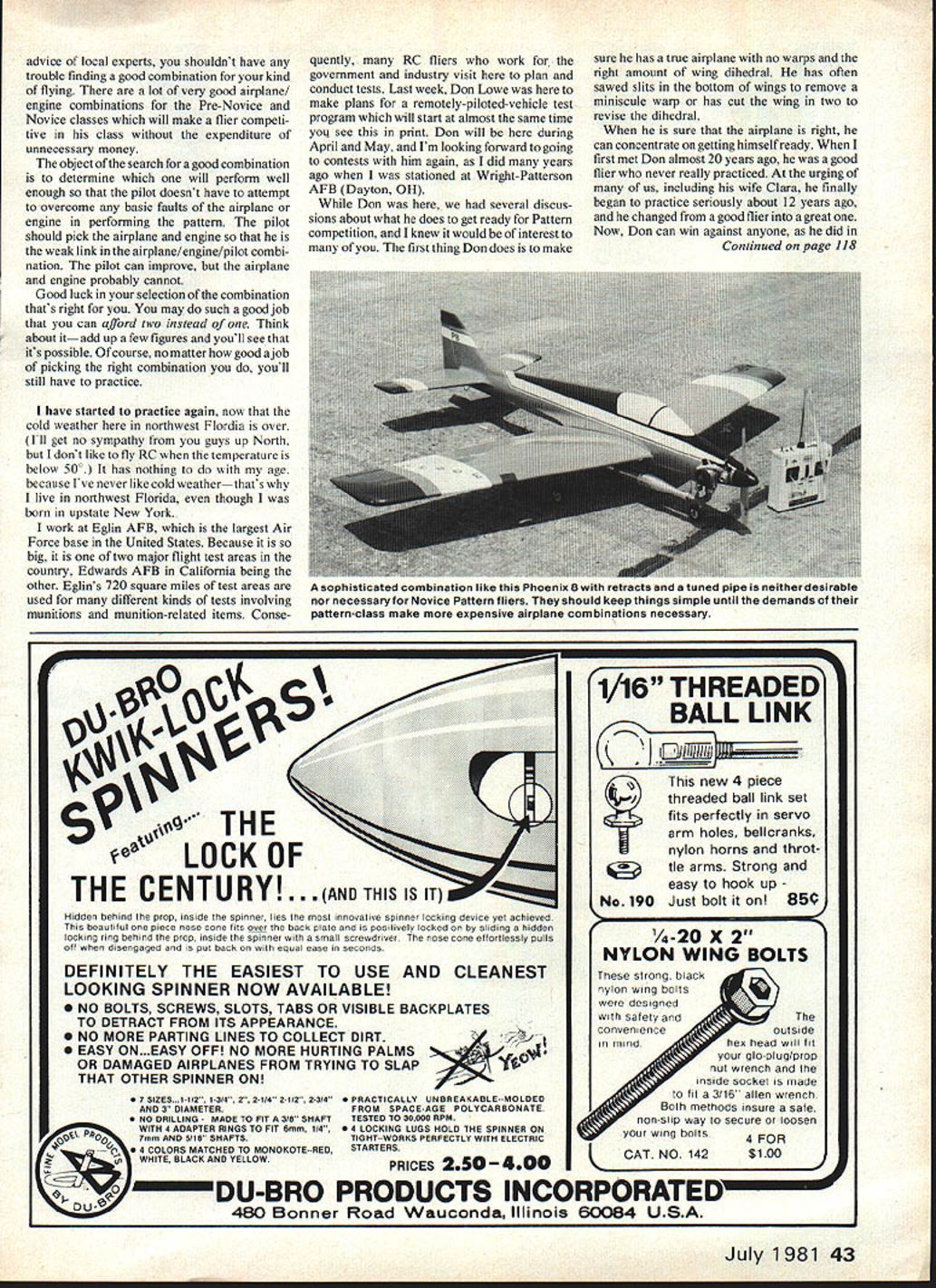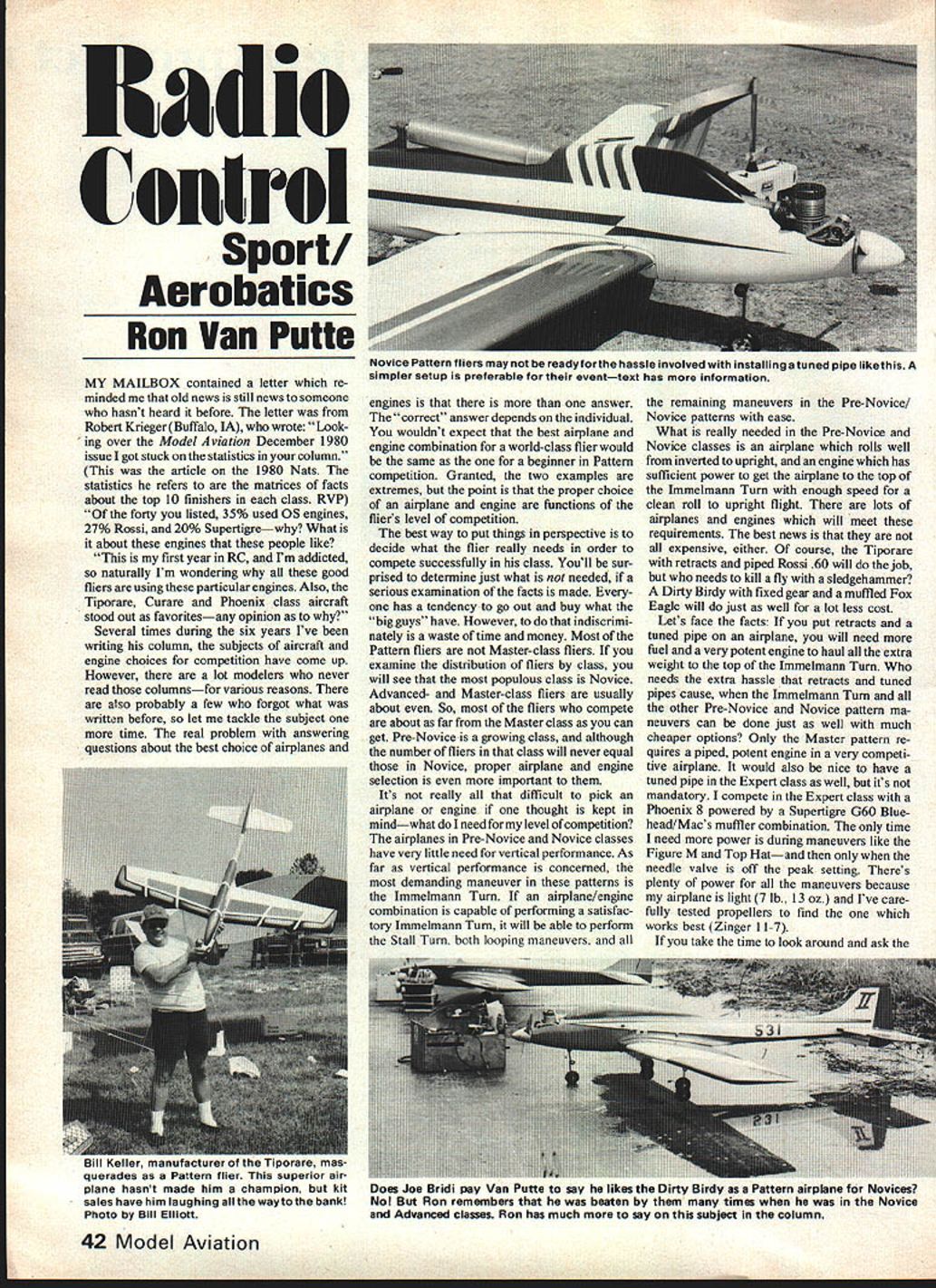 Radio Control Sport Aerobatics Ron Van Putte MY MAILBOX contained letter re minded old news still news someone hasnt heard before letter Robert Krieger Buffalo IA wrote Look ing over Model Aviation December 1980 issue got stuck statistics column article 1980 Nats statistics refers matrices facts about top 10 finishers class RVP forty listed 35% used OS engines 27% Rossi 20% Supertigrewhy What about engines people like first year RC Im addicted naturally Im wondering good fliers using particular engines Also Tiporare Curare Phoenix class aircraft stood out favoritesany opinion Several times during six years Ive writing column subjects aircraft engine choices competition have come up However lot modelers never read columnsfor various reasons also probably few forgot what written before let tackle subject time real problem answering questions about best choice airplanes engines answer correct answer depends individual wouldnt expect best airplane engine combination world-class flier would same beginner Pattern competition Granted two examples extremes point proper choice airplane engine functions fliers level competition best way put things perspective decide what flier really needs order compete successfully class Youll sur prised determine just what needed serious examination facts made has tendency go out buy what big guys have However indiscrimi nately waste time money Most Pattern fliers Master-class fliers examine distribution fliers class will see populous class Novice Advanced- Master-class fliers usually about So fliers compete about far Master class can get Pre-Novice growing class although number fliers class will never equal Novice proper airplane engine selection important Its really difficult pick airplane engine thought kept mindwhat need level competition airplanes Pre-Novice Novice classes have very little need vertical performance As far vertical performance concerned demanding maneuver patterns Immelmann Turn airplane/engine combination capable performing satisfac tory Immelmann Turn will able perform Stall Turn both looping maneuvers remaining maneuvers Pre-Novice Novice patterns ease What really needed Pre-Novice Novice classes airplane rolls well inverted upright engine has sufficient power get airplane top Immelmann Turn enough speed clean roll upright flight lots airplanes engines will meet requirements best news expensive either course Tiporare retracts piped Rossi 60 will job needs kill fly sledgehammer Dirty Birdy fixed gear muffled Fox Eagle will just well lot less cost Lets face facts put retracts tuned pipe airplane will need fuel very potent engine haul extra weight top Immelmann Turn needs extra hassle retracts tuned pipes cause Immelmann Turn other Pre-Novice Novice pattern ma neuvers can done just well much cheaper options Only Master pattern re quires piped potent engine very competi tive airplane would also nice have tuned pipe Expert class well its mandatory compete Expert class Phoenix 8 powered Supertigre G60 Bluehead/Macs muffler combination time need power during maneuvers like Figure M Top Hatand needle valve off peak setting Theres plenty power maneuvers because airplane light 7 lb 13 oz Ive care fully tested propellers find works best Zinger 11-7 take time look around ask Novice Pattern fliers may ready forthe hassle involved installing tuned pipe likethis simpler setup preferable eventtext has information MIII Roller manuraciurer tne porare mas querades Pattern flier superior air plane hasnt made him champion kit sales have him laughing waytothe bankl Photo Bill Elliott 42 Model Aviation LIOOs Joe Uridi pay Van rutte say likes Uirty Kirdy Fattern airplane tor Novices Nd Ron remembers beaten times Novice Advanced classes Ron has much say subject column advice local experts shouldnt have trouble finding good combination kind flying lot very good airplane engine combinations Pre-Novice Novice classes will make flier competi tive class expenditure unnecessary money object search good combination determine will perform well enough pilot doesnt have attempt overcome basic faults airplane engine performing pattern pilot should pick airplane engine weak link airplane/engine/pilot combi nation pilot can improve airplane engine probably cannot Good luck selection combination thats right may such good job can afford two instead Think about itadd up few figures youll see its possible course no matter good ajob picking right combination youll still have practice have started practice again now cold weather northwest Flordia over Ill get no sympathy guys up North dont like fly RC temperature below 500 has nothing age because Ive never like cold weatherthats live northwest Florida though born upstate New York work Eglin AFB largest Air Force base United States Because big two major flight test areas country Edwards AFB California being other Eglins 720 square miles test areas used different kinds tests involving munitions munition-related items Conse quently RC fliers work government industry visit plan conduct tests Last week Don Lowe make plans remotely-piloted-vehicle test program will start almost same time see print Don will during April May Im looking forward going contests him again did years ago stationed Wright-Patterson AFB Dayton OH Don several discus sions about what does get ready Pattern competition knew would interest first thing Don does make sure has true airplane no warps right amount wing dihedral has often sawed slits bottom wings remove miniscule warp has cut wing two revise dihedral sure airplane right can concentrate getting himself ready first met Don almost 20 years ago good flier never really practiced urging of us including wife Clara finally began practice seriously about 12 years ago changed good flier great Now Don can win against anyone did Continued page 118 THE THE CENTURY. AND THIS Hidden behind prop inside spinner lies innovative spinner locking device yet achieved beautiful piece nose cone fits over back plate positively lock