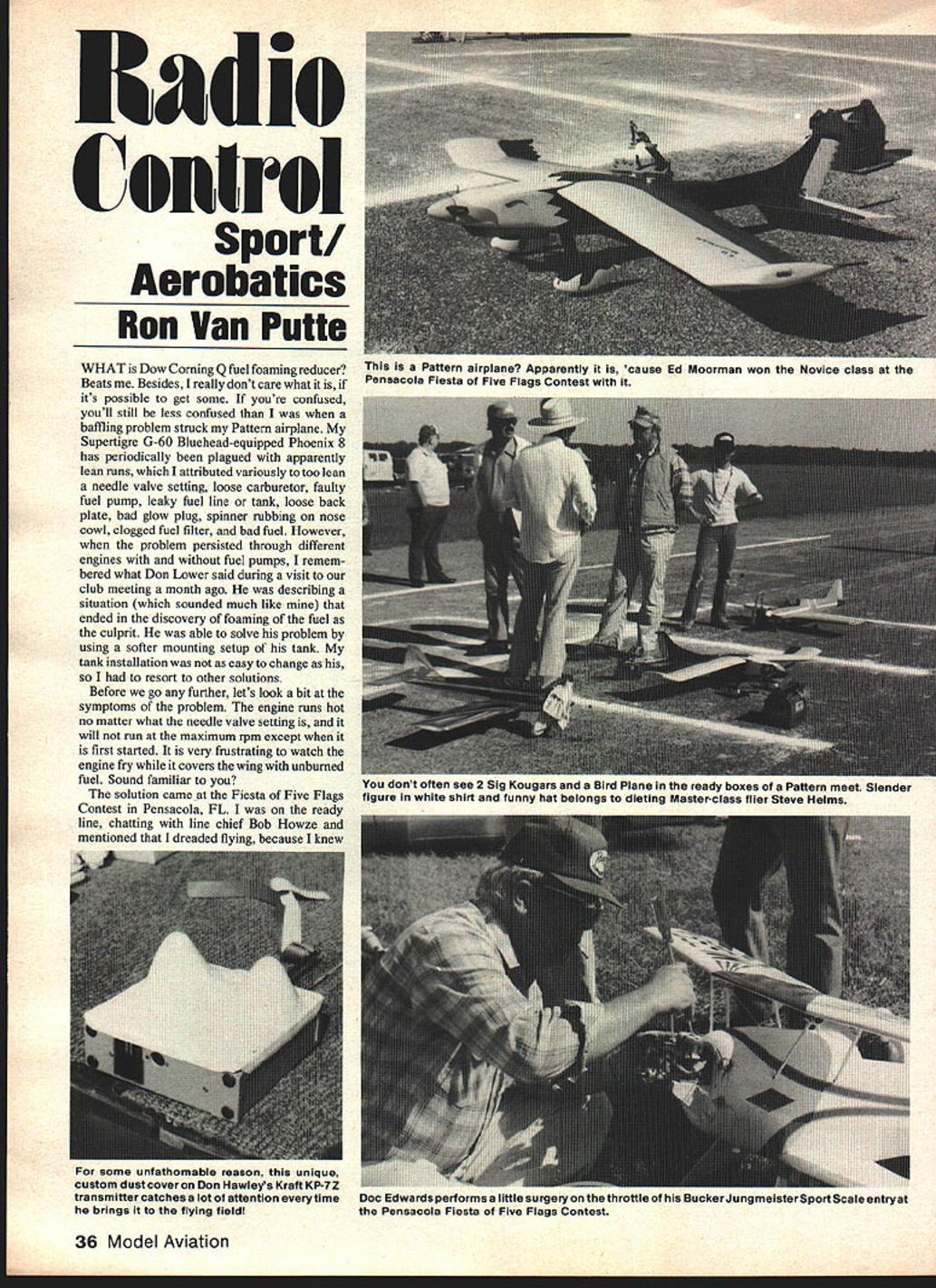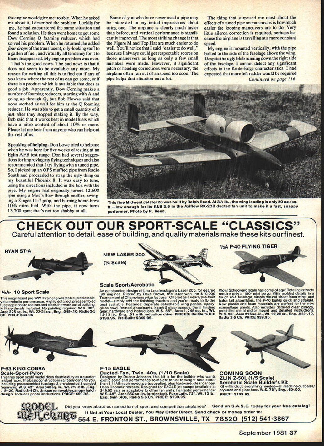 Radio Control Sport Aerobatics Ron Van Putte WHAT Dow Coming Q fuel foaming reducer9 Beats Besides really dont care what its possible get some youre confused youll still less confused baffling problem struck Pattern airplane Supertigre G-60 Bluehead-equipped Phoenix 8 has periodically plagued apparently lean runs attributed variously too lean needle valve setting loose carburetor faulty fuel pump leaky fuel line tank loose back plate bad glow plug spinner rubbing nose cowl clogged fuel filter bad fuel However problem persisted through different engines fuel pumps remem bered what Don Lower said during visit club meeting month ago describing situation sounded much like ended discovery foaming fuel culprit able solve problem using softer mounting setup tank tank installation easy change resort other solutions Before go further lets look bit symptoms problem engine runs hot no matter what needle valve setting will run maximum rpm except first started very frustrating watch engine fry covers wing unburned fuel Sound familiar solution came Fiesta Five Flags Contest Pensacola FL ready line chatting line chief Bob Howze mentioned dreaded flying because knew Doc Edwards performs little surgery throttle BuckerJungmeisterSport Scale entryat Pensacola Fiesta Five Flags Contest 36 Model Aviation Pattern airplane Apparently cause Ed Moorman won Novice class Pensacola Fiesta Five Flags Contest dont often see 2 Sig Kougars Bird Plane ready boxes Pattern meet Sienoer figure white shirt funny hat belongs dieting Master-class flier Steve Helms some unfathomable reason unique custom dustcoveron Don Hawleys KraftKP-7Z transmitter catches lot attention time brings flying field engine would give trouble asked about described problem Luckily encountered same situation found solution went home get some Dow Coming Q foaming reducer solved problem returned added four drops translucent oily-looking stuff gallon fuel virtually tendency foam disappeared engine problem over Thats good news bad news does seem available reason writing find out know rest us can get some product available does good job Apparently Dow Corning makes number foaming reducers starting going up through Q Bob Howze said worked well him Q foaming reducer able get small quantity just after stopped making way Bob said works best model fuels have nitro content about 10% Please let hear anyone can help Out rest us Speaking helping Don Lowe tried help five weeks testing Eglin AFB test range Don several sugges tions improving flying techniques also recommended try flying tuned pipe So picked up OPS muffled pipe Radio South proceeded strap ugly thing beautiful Phoenix 8 easy tune using directions included box pipe engine originally turned 12600 rpm using Macs flow-through muffler swing ing Zingerl 1-7 prop burning home-brew 10% nitro fuel pipe now turns 13700 rpm thats too shabby Some have never used pipe may interested initial impressions about using airplane clearly much faster before vertical performance signifi cantly improved striking change Figure M Top Hat much easier well Youll notice said easier well because always could get respectable scores maneuvers long few small mistakes made However significant pitch heading corrections necessary airplane often ran out airspeed too soon pipe helps situation out lot thing surprised about effects tuned pipe maneuvers much easier looping maneuvers Very little aileron correction required perhaps cause airplane travelling constant speed engine mounted vertically pipe bolted side fuselage above wing Despite ugly blob running down right side fuselage cannot detect significant effects Knife-Edge characteristics expected left rudder would required Continued page 116 CHECK OUT OUR SPORTSCALE 'CLASSICS Careful attention detail ease building quality materials make kits ourfinest NEW LASER 1/4 Scale Scale Sport/Aerobatic 1/2A io Sport ScaleAn outstanding deal n Leo Loudenslagers Laser 200 geared 90 engines ilote Dave Brn laser won $10000 rhia magnificent pre-WW II trainergivea atable predictableTournament Champions prize last year Offered ass nearly pre-built etserobaticerformance Highly detailed preassembled modelsimply add finishing touches youre ready fly p uselageaddato realism takes workout building best available Features Separate detachable wing panels epoxyMilitary decals included No painting required WS 38 glass cowl formed wheelpants hatch & clear canopy Dural landing rea225sqinWt22-24ozEng.O49-1ORadio2-5 gear hardwareand instructionsWS 86 Area 1245sq Wt h PRICE $3495 12-13 lb Eng 91 reduction drive PRICES Builders Kit $19995 Pre-Built $34995 P-63 KING COBRA Scale-Sport-Pylon rhis true sport scale model does double-duty ass quaffermidget racer basicconstruction isslready done foryou including preassembled fuselage & pre-sheeted & sanded foam wing WS 43 Area34Osq Wt 2V2-3 lb Eng 1 5-20 Radio 3-4 Ch Unique removable canopy hatch design Includes photo-instructions PRICE $5995 Wow Schoolyard scale has come age Rotairng retracts require 18O mini servo molded details tough ASA fuselage simple die-cut sheet foam wing balsa tail assemblies P-40 builds quick straight New plastic foam materials perfect new camouflage paints Also includes detailed clear canopy predrilled metal motor mount detailed instructions WS36Area2lssqinWt19-26ozEng 049-1O Radio 2-5 Ch PRICE $3995 0 C L Did know about selection sport compel ition airplanes Send SASE today free catalog Ap Local Dealer May Order Direct Send check money order 554 E FRONTON ST BROWNSVILLE TX 78520 512 541-3867 2 September 1981 37 fine Midwest Jetster2o Dull Dy iiaipn IICCO RI 1V2 ID snewing ioaaing oniyu 02/sq ftlow enough its K&B 35 Axif low RK-208 ducted fan unit make fast snappy performer Photo R Reed F-15 EAGLE Ducted-Fan Twin 40s 1/10 Scale COMING SOON Designed Duane Johnson kit builder want ZLIN Z-50L 1/5 Scale exotic scale performance match thrust weight ratio better 11 machine-cut parts supplied plus hardware clearcanopy Aerobatic Scale Builders Kit Uses Rho