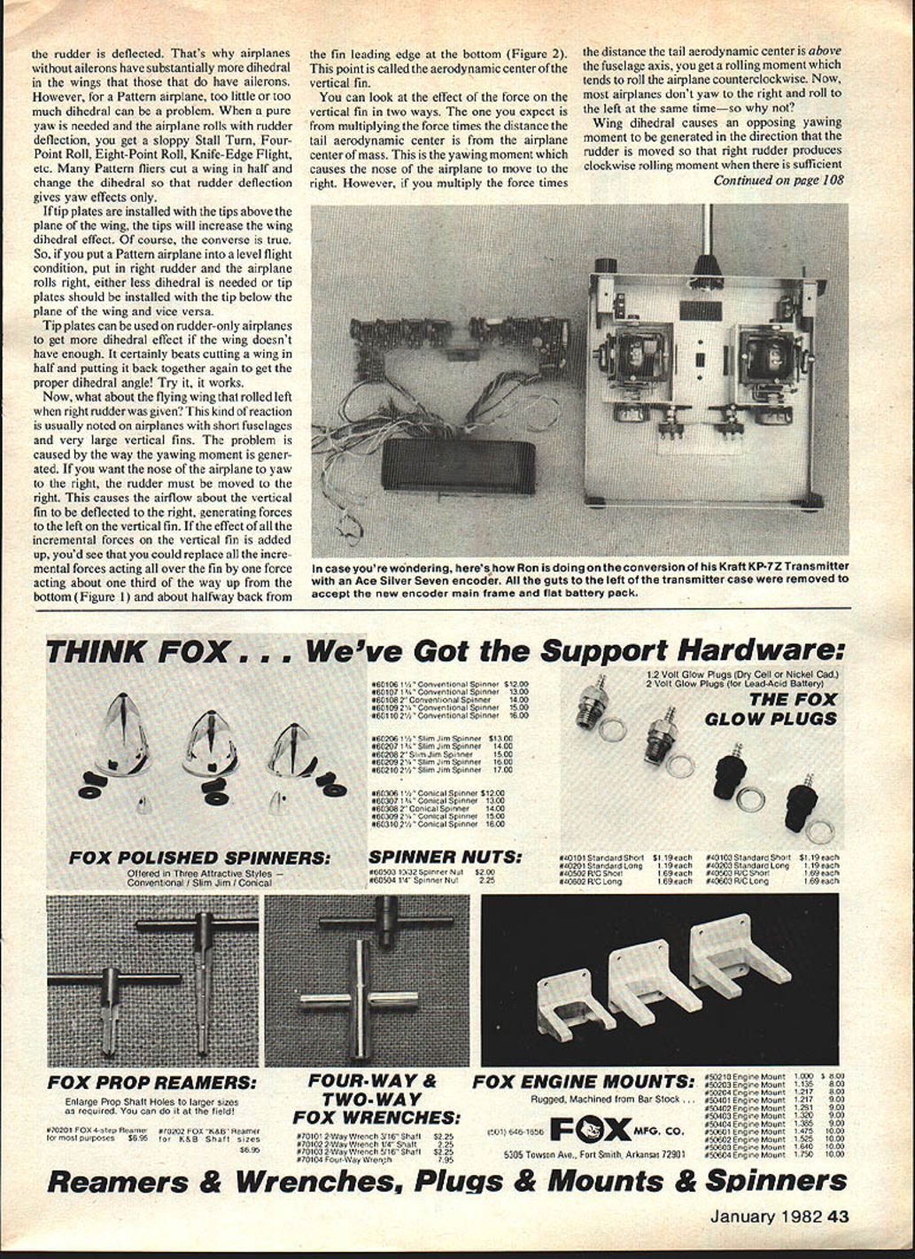 Radio Control Sport/ Aerobatics Ron Van Putte RECENTLY received copy new book about radio control Kaimbach Publish ing Company Its called Getting Most Radio Control Systems author Fred Marks Does Fred Marks name ring bell about Ace Silver Seven Fred guiding force behind Silver Seven electronic products Ace sells Freds book quite different books RC treat transmitter receiver servos black boxes make things work mysterious wonderful ways Fred explains basic system components work manner people can understand approach same electronics engin eer would use simply because Fred aero nautical engineer trade developed expertise RC because interest hobby hes very succesful chapters Marks book read like wish list RC-oriented items us would benefit knowing about Besides de scribing basic system components work chapters discuss building RC components kits system maintenance component trouble-shooting repair installa don equipment RC accessories like chargers expanded scale voltmeters chapter super systems work Since costs $895 lot RCers will get back times over performing simple component troubleshooting repair Its probably available local bookstore hobby shop received interesting letter Chuck Nourcier Lake Charles LA such general interest excerpt follows have discovered something interesting yaw problems 40-sized Pattern airplane friend Nat Penten suggested putting tips wing after some experimenting found Out correct rolling rudder piece 1/32 1/16 plywood glued angle between 3Q0 400 measued plane wing 00 would parallel wing 900 would perpendicular wing Angling tips up caused rolling effect same direction yaw give right rudder plane would roll right angling tips down get opposite effect tips very big about 3 4 wide length chord trimmed get desired effect Now something else think about same guy designed built flying wing Probably same picture Nats coverage R VP mounted dorsal fin above canopy caused airplane roll Both effects can explained fairly opposite direction yaw Right rudder easily First tips modify dihedral effect caused airplane roll left Explain wing Most people realize usually onewing dihedral makes airplane roll P\VF LyJ FIGURE 1 F FIGURE2 some models bank left give right rudder Ron talks about month 42 Model Aviation Heres Rons completed Ace Silver Seven encoder mainframe trim adjust board upper left mixer board upper right mixer board plugs transmitter trim adjust board would normally go Theres lot wiring yet project rudder deflected Thats airplanes ailerons have substantially dihedral wings have ailerons However Pattern airplane too little too much dihedral can problem pure yaw needed airplane rolls rudder deflection get sloppy Stall Turn FourPoint Roll Eight-Point Roll Knife-Edge Flight etc Pattern fliers cut wing half change dihedral rudder deflection gives yaw effects tip plates installed tips above plane wing tips will increase wing dihedral effect course converse true So put Pattern airplane level flight condition put right rudder airplane rolls right either less dihedral needed tip plates should installed tip below plane wing vice versa Tip plates can used rudder-only airplanes get dihedral effect wing doesnt have enough certainly beats cutting wing half putting back together again get proper dihedral angle Try it works Now what about flying wing rolled left right rudder given kind reaction usually noted airplanes short fuselages very large vertical fins problem caused way yawing moment gener ated want nose airplane yaw right rudder must moved right causes airflow about vertical fin deflected right generating forces left vertical fin effect incremental forces vertical fin added up d see could replace incre mental forces acting over fin force acting about third way up bottom Figure 1 about halfway back fin leading edge bottom Figure 2 point called aerodynamic center vertical fin can look effect force vertical fin two ways expect multiplying force times distance tail aerodynamic center airplane center mass yawing moment causes nose airplane move right However multiply force times distance tail aerodynamic center above fuselage axis get rolling moment tends roll airplane counterclockwise Now airplanes dont yaw right roll left same timeso Wing dihedral causes opposing yawing moment generated direction rudder moved right rudder produces clockwise rolling moment sufficient Continued page 108 THINK FOX N N Weve Got #6006Cone oaSpne 0200 6601071 Conventional Spinner 1300 660108 2 Conoentional Spinner1400 86010927 Conoenlional Spinner1500 #601 tO 24 Conventional Spinner 1600 #602061 Jon Spinne$1300 #602071 4 Olin Jin Spinner1400 A#60208 2 Siin 1mm Spinner1000 #60209 24 Olin Jin Spinner1600 #60210 2 Olin Jin Spinne1700 6603061 cal Spinner $1200 {#603071 4 Conical Spinne1300 #60300 2 Conical Spinnet1400 #603092/ Conical Spinner 1004 #603102/ Conical Spinne 1600 FOX POLISHED SPINNERS SPINNER NUTS Offered nt Three Altreclt e Styles #60503 1032 Sp nne Net$200 Conventtonal Slim Jim / Conical#60004 1 4 Sp nne Not220 Support Hardware 12 Volt Glow Plugs Dry cell Nickel Cad 2 Volt Glow Plugs Lead-Acid Battery THE FOX GLOW PLUGS #40101 Standard Short0119 each#40103 Standard Short0119 #40201 Standard Longll9each#dS2O3Standard Long119 nach #40502 SIC Short 169 each#40503 RIC Short 1O9each #40002 SIC Long 109each#40603 SIC Long169 #70201 FOX 4vtvp Reamer 670202 FOX KOB Roamer formostoorpoves0600 KOB Shalt vices $695 FOX PROP REA MERSFOUR-WAY & FOX ENGINE MOUNTS-#OO2lOEngineMount10000800 #50203 Engine Mount 1135 000 #50204 Engine MOunt 1217800 Enlarge Prop Shaft Holes larger sizesTWOWAYRugged Machived trom Bar Stock#50401 Engine Mount 1217900 #00402 Engine Mount1201900 #00403 Engine Mount1320900 required can fieldFOX WRENCHES9~W#50404 Engine Mount1365900 Co #7OlOl2WayW#nc0316 Shaft$22550 6 0 656 650601 EvgineMouvt14751000 #701022 Way Wrench lid Shalt225#50602 Engine MOunt 15201000 #70103 2Way Wrevch 0116 Shalt$225#50803 Evgine Mount 16401000 #70104 FourWay Wrench79553115 Tow ee n Fe Sm h Arkansas 72901#50