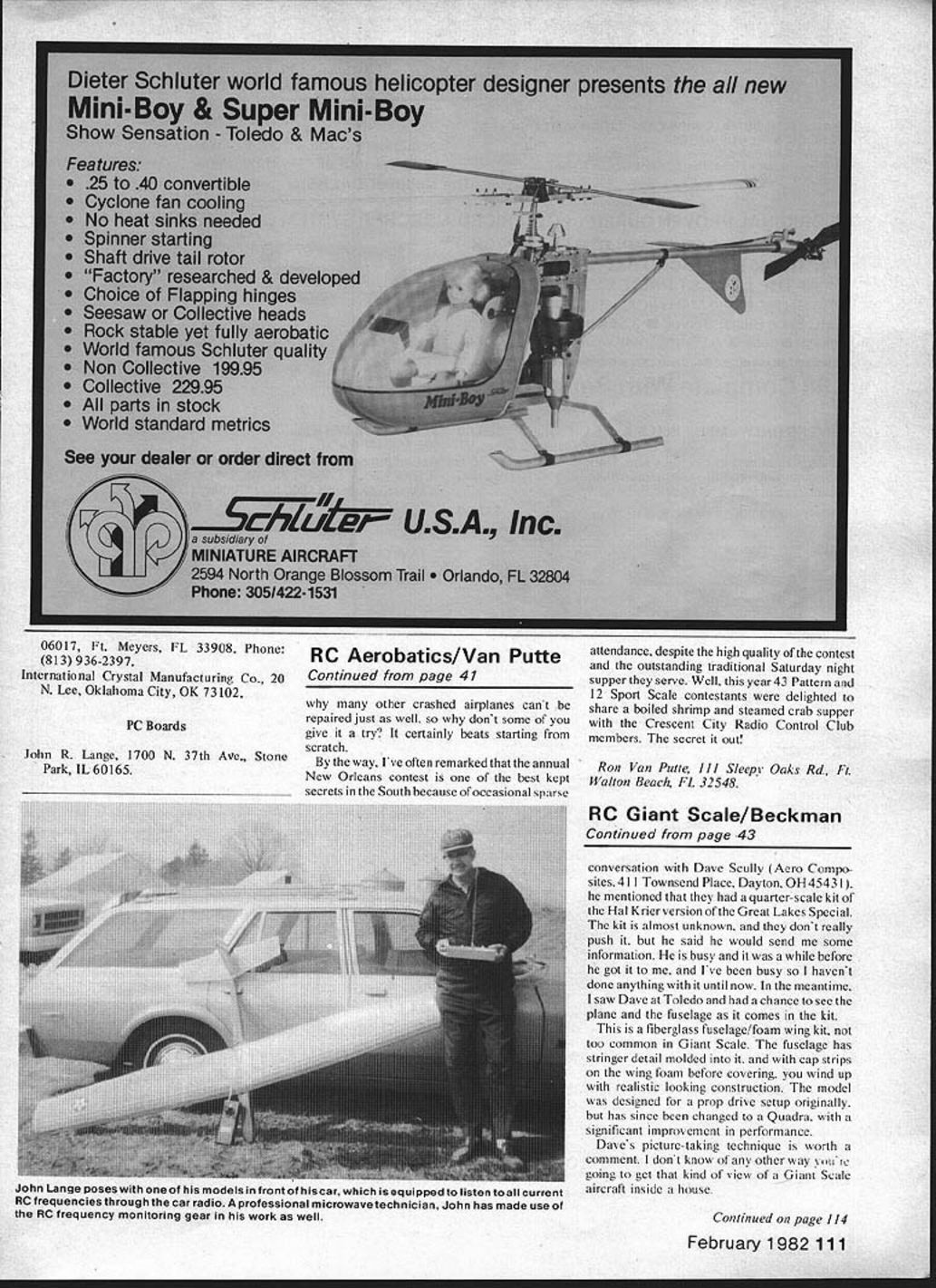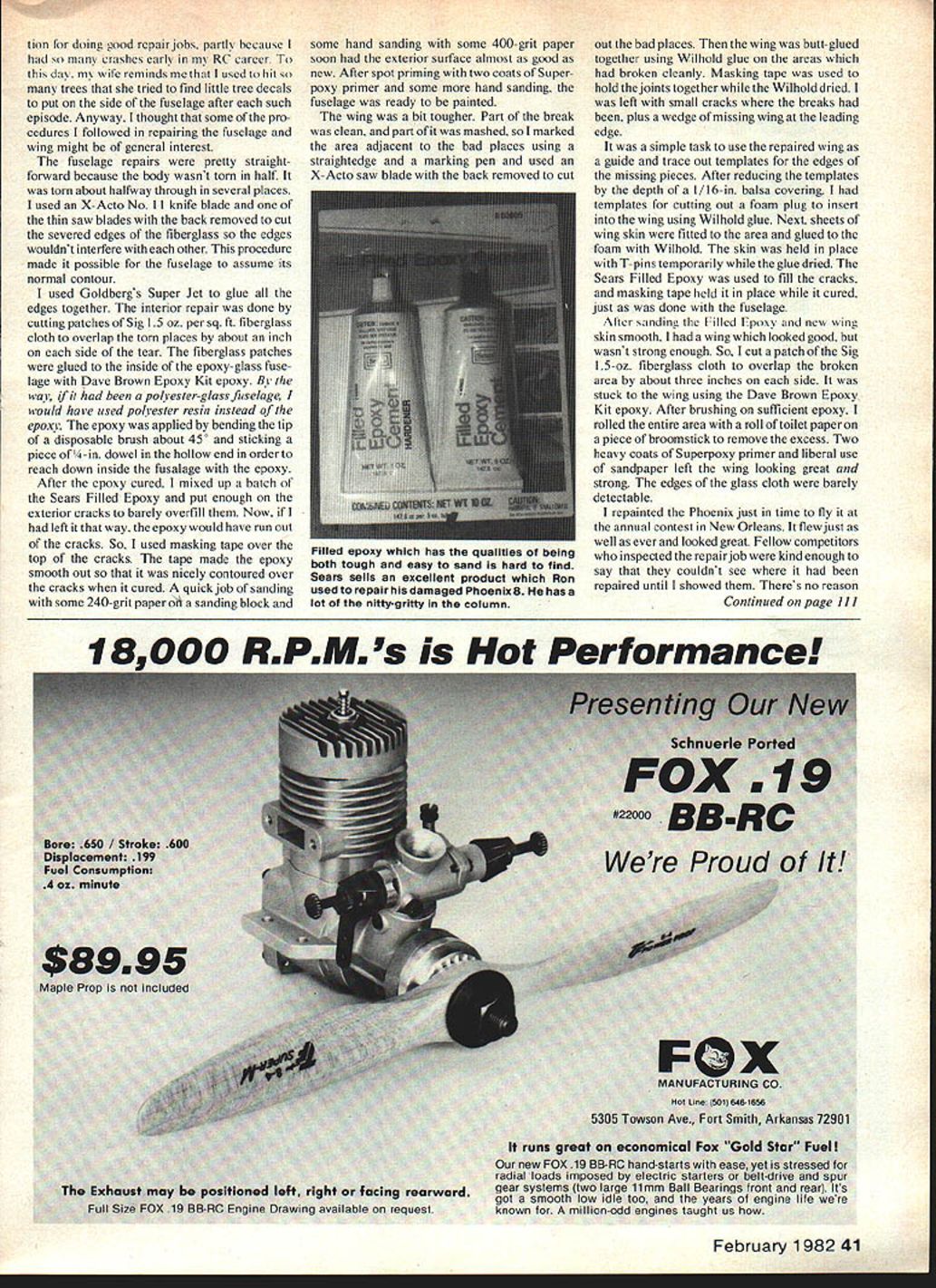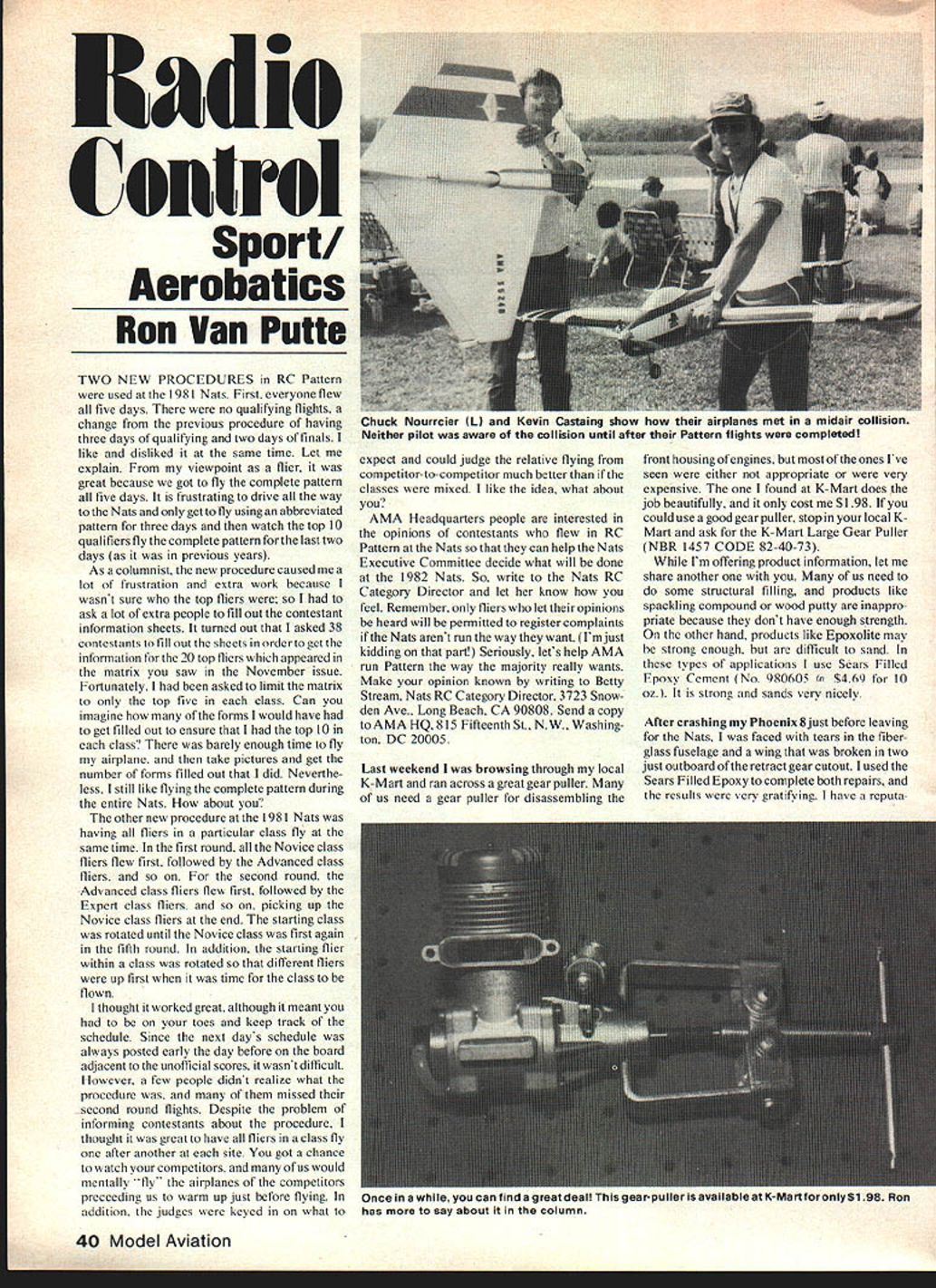 Radio Control Sport Aerobatics Ron Van Putte TWO NEW PROCEDURES RC Pattern used 1981 Nats First everyone flew five days no qualifying flights change previous procedure having three days qualifying two days finals like disliked same time Let explain viewpoint flier great because got fly complete pattern five days frustrating drive way Nats get fly using abbreviated pattern three days watch top 10 qualifiers fly complete pattern last two days previous years As columnist new procedure caused lot frustration extra work because wasnt sure top fliers ask lot extra people fill out contestant information sheets turned out asked 38 contestants fill out sheets orderto get information 20 top fliers vhich appeared matrix saw November issue Fortunately asked limit matrix top five class Can imagine forms would have get filled Out ensure top 10 class barely enough time fly airplane take pictures get number forms filled out did Neverthe less still like flying complete pattern during entire Nats about other new procedure 1981 Nats having fliers particular class fly same time first round Novice class fliers flew first followed Advanced class fliers second round Advanced class fliers flew first followed Expert class fliers picking up Novice class fliers end starting class rotated until Novice class first again fifth round addition starting flier within class rotated different fliers up first time class flown thought worked great although meant toes keep track schedule Since next days schedule always posted early day before board adjacent unofficial scores wasnt difficult However few people didnt realize what procedure missed second round flights Despite problem informing contestants about procedure thought great have fliers class fly after another site got chance toss atch competitors us would mentally fly airplanes competitors preceeding us warm up just before flying addition judges keyed what expect could judge relative flying competitor-to-competitor much better classes mixed like idea what about AMA Headquarters people interested opinions contestants flew RC Pattern Nats can help Nats Executive Committee decide what will done 1982 Nats So write Nats RC Category Director let know feel Remember fliers let opinions heard will permitted register complaints Nats arent run way want Imjust kidding part Seriously lets help AMA run Pattern way majority really wants Make opinion known writing Betty Stream Nats RC Category Director 3723 Snowden Ave. Long Beach CA 90808 Send copy AMA HQ 815 Fifteenth St. NW. Washing ton DC 20005 Last weekend browsing through local K-Mart ran across great gear puller us need gear puller disassembling front housing engines ones Ive seen either appropriate very expensive found K-Mart does job beautifully cost $198 could use good gear puller stop local KMart ask K-Mart Large Gear Puller NBR 1457 CODE 82-40-73 Im offering product information let share another us need some structural filling products like spackling compound wood putty inappro priate because dont have enough strength other hand products like Epoxolite may strong enough difficult sand types applications use Sears Filled Epoxy Cement No 980605 ss $469 10 oz f strong sands very nicely After crashing Phoenix 8just before leaving Nats faced tears fiber glass fuselage wing broken two just outboard retract gear cutout used Sears Filled Epoxy complete both repairs results very gratifying have reputa 40 Model Aviation Chuck Nourrcier 1 Kevin Castaing show airplanes met midair collision Neither pilot aware collision until after Pattern flights completed Once can tind great deal gearpulIer avaliaDle r-MafltoronIy1 98 Ron has say about column tion doing good rcpair jobs partly hecausc crashes carlx RC career day mx wife reminds used hit trees tried find little tree decals put side fuselage after such episode Anyway thought some pro cedures followed repairing fuselage wing might general interest fuselage repairs pretty straight forward because body wasnt torn half torn about halfway through several places used X-Acto No II knife blade thin saw blades back removed cut severed edges fiberglass edges wouldnt interfere other procedure made possible fuselage assume its normal contour used Goldbergs Super Jet glue edges together interior repair done cutting patches Sig 15 oz per sq ft fiberglass cloth overlap torn places about inch side tear fiberglass patches glued inside epoxy-glass fuse lage Dave Brown Epoxy Kit epoxy Dv wax poltester-glass fuselage would hate used pa/tester resin instead epoxy epoxy applied bending tip disposable brush about 450 sticking piece -in dowel hollow end order reach down inside fusalage epoxy After epoxy cured mixed up hatch Sears Filled Epoxy put enough exterior cracks barely overfill Now left way epoxy would have run out cracks So used masking tape over top cracks tape made epoxy smooth out nicely contoured over cracks cured quick job sanding some 240-grit paper ofl sanding block some hand sanding some 400-grit paper soon exterior surface almost good new After spot priming two coats Super poxy primer some hand sanding fuselage ready painted wing bit tougher Part break clean part ofit mashed sol marked area adjacent bad places using straightedge marking pen used X-Acto saw blade back removed cut Out bad places wing butt-glued together using Wilhold glue areas broken cleanly Masking tape used hold joints together Wilbold dried left small cracks breaks plus wedge missing wing leading edge simple task use repaired wing guide trace Out templates edges missing pieces After reducing templates depth 1/16-in balsa covering templates cutting out foam plug insert wing using Wilhold glue Next sheets wing skin fitted area glued foam Wilhold skin held place T-pins temporarily glue dried Sears Filled Epoxy used fill cracks masking tape hcld place cured just done fuselage Alter sanding thc Filled Epoxy new wing skin smooth wing looked good wasnt strong enough So cut patch Sig 5-oz fiberglass cloth overlap broken area about