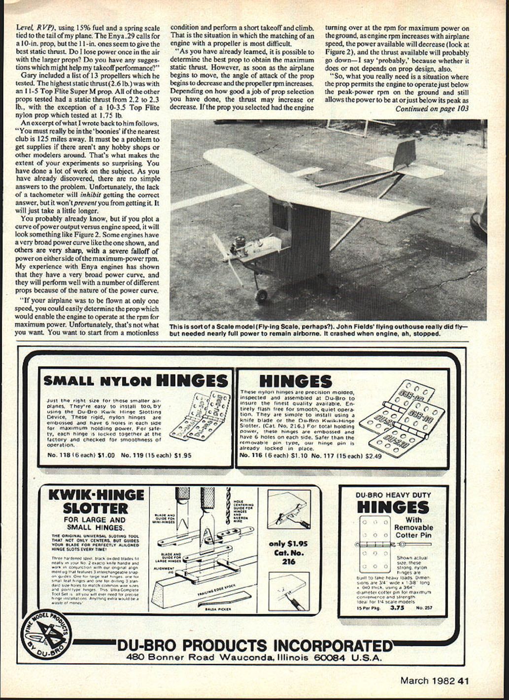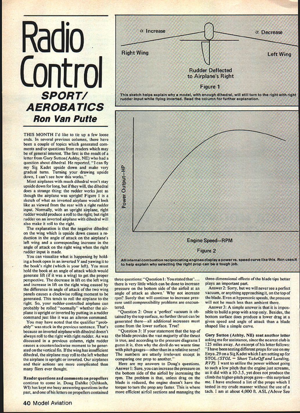 Radio Control SPORT AEROBA TICS Ron Van Putte THIS MONTH Id like tie up few loose ends several previous columns have couple topics generated com ments and/or questions readers may general interest first result letter Gary Sutton Ashby NE question about dihedraL reported can fly Sig Kadet upside down make very gradual turns Turning drawing upside down cant see works Most airplanes much dihedral wont stay upside down long will dihedral does strange thing rudder works just though airplane upright Figure 1 sketch what inverted airplane would look like viewed rear right rudder input Normally upright airplane right rudder would produce roll right right rudder inverted airplane dihedral will also make roll right explanation negative dihedral wing upside down causes re duction angle attack airplanes left wing corresponding increase angle attack right wing right rudder input made can visualize what happening hold ing book open inverted V yawing books right left must hold book angle attack would generate lift wing get proper perspective decrease lift left wing increase lift right wing caused difference angle attack two wing panels causes clockwise rolling moment generated tends roll airplane right So rudder-controlled airplane can probably rolled normally whether air plane upright inverted putting rudder command just like alleron command may have noted qualifier prob ably stuck previous sentence Thats because inverted airplane dihedral doesnt always roll right right rudder As discussed previous column right rudder causes counterclockwise moment gener ated vertical fin wing has insufficient dihedral airplane may roll left whether airplane upright inverted airplanes actions complicated fliers ever thought Reader questions comments propellers continue come Doug Dahlke Oshkosh WI has kept busy answering questions past letters propellers contained imalcombsi oxnw three questions Question 1 stated that. very little can done increase pressure bottom side airfoil angle attack shown increase rpm Surely will continue increase pres sure until compressibility problems encoun tered Question 2 Once perfect vacuum ob tained top surface no further thrust can generated thereall additional increases must come lower surface True Question 3 statement top blade provides vast majority thrust true according pressure diagrams guess- devil waste time pitchgaugesother relative sense numbers utterly irrelevant except comparing prop another answers Dougs questions Answer 1 Sure can increase pressure bottom side airfoil increasing rpm problem unless drag blade reduced engine doesnt have torque turn prop faster efficient airfoil sections managing three-dimensional effects blade tips better plays important part Answer 2 Sorry will never see perfect vacuum anything approaching top blade hypersonic speeds pressure will much less ambient Answer 3 simple answer impos sible build prop top Besides bottom surface does produce lower drag glven speed angle attack blade shaped like simple curve Gary Sutton Ashby NE sent another letter asking assistance since nearest club 125 miles away An excerpt letter follows have testing different props use Enya29 ona SigKadetwhichl am settingup STOL STOL t TakeOff Landing R VP want utilize power going such low pitch engine just screams did 10-35 yet does produce climb higher-pitch props gavethis surprised have enclosed list props tested crude manner use tach am about 4000 ft ASL Above Sea 40 Model Aviation Increa g heI%M e jat whiW fI Levet R VP using 15% fuel spring scale tied tail plane Enya 29 calls 10-in prop 11-in ones seem give best static thrust lose power once air larger props have sugges tions might help takeoff performance Gary included list 13 propellers tested highest static thrust 26 lb 11-5 Top Flite Super M prop other props tested static thrust 22 23 lb exception 10-35 Top Flite nylon prop tested 175 lb An excerpt what wrote back him follows must really boonies nearest club 125 miles away must problem get supplies arent hobby shops other modelers around Thats what makes extent experiments surprising have done lot work subject As have already discovered no simple answers problem Unfortunately lack tachometer will inhibit getting correct answer wont prevent getting will just take little longer probably already know plot curve power output versus engine speed will look something like Figure 2 Some engines have very broad power curve like shown others very sharp severe falloff power either side maximum-power rpm experience Enya engines has shown have very broad power curve will perform well number different props because nature power curve airplane flown speed could easily determine prop would enable engine operate rpm maximum power Unfortunately thats what want want start motionless condition perform short takeoff climb situation matching engine propeller difficult As have already learned possible determine best prop obtain maximum static thrust However soon airplane begins move angle attack prop begins decrease propeller rpm increases Depending good job prop selection have done thrust may increase decrease prop selected engine turning over rpm maximum power ground engine rpm increases airplane speed power available will decrease look Figure 2 thrust available will probably go downI say probably because whether does depends prop design also So what really need situation prop permits engine operate just below peak-power rpm ground still allows power orjust below its peak Continued page 103 p. SMALL NYLON HINGES HINGES nylon hinges e p ec son mo ded0 Just right size smaller air- nspected assembled Du-Bro 3 C planes Theyre easy install too byC kD C f50Insure finest Quality available En-0 tirely flash free tor smooth quiet Opera- using Du-Aro Kwik Hinge SlottingC ion simple install using a0 Device rigid nylon hinges embossed have 6 holes side6 e blade Du-Bro Kwik-Hinge mum holding power sate-6 6Slotter cat No 216 total holding0 power hinges embossed and0 ty hinge locked together thehave 6 hol