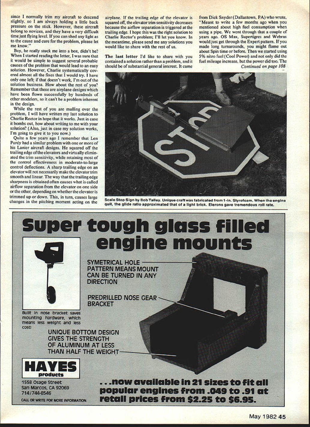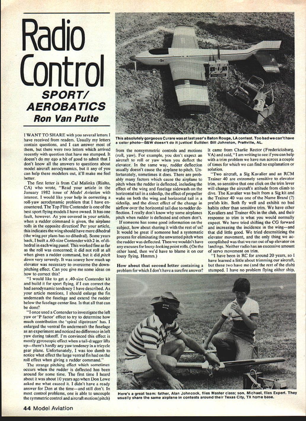 Radio Control SPORT AEROBA TICS Ron Van Putte WANT TO SHARE several letters have received readers Usually letters contain questions can answer two letters arrived recently question have stumped doesnt ego bit good admit dont know answers questions about model aircraft aerodynamics can help modelers out itll make feel better first letter Cal Malinka Rialto CA wrote Read article January 1982 issue Model Aviation interest would like help correcting roll-yaw aerodynamic problem have en countered Top Flite Contender best sport flying models have owned has fault however As covered article rudder command given airplane rolls opposite direction Per article indicates wing should have dihedral wing per plans has no dihedral Some years back built 60-size Contender 2 di hedral wing panel worked fine far roll concerned did roll given rudder command did pitch down very severely scarey much up elevator necessary overcome downpitching effect Can give some ideas correct would like get 40-size Contender kit build sport flying can correct bad aerodynamic tendency have described As article mentions should enlarge fin underneath fuselage extend rudder below fuselage centerline that can done once used Contender investigate left yaw P factor effect try determine much contribution spiral slipstream has enlarged ventral fin underneath fuselage experiment noticed no difference left yaw during takeoff Im convinced effect mostly gyroscopic effect tail-dragger lifts uptheres hardly yaw tendency tricycle gear plane Unfortunately too dumb notice what effect large ventral fin roll effect giving rudder command strange pitching effect sometimes occurs rudder deflected has around some time first time heard about about 10 years ago Don Lowe asked what caused didnt have ready answer Don timeand still dont control problems able uncouple symmetric control aircraft motion pitch nonsymmetric controls motions roll yaw example dont expect aircraft roll yaw deflect elevator same way rudder deflection usually doesnt cause airplane pitch Un fortunately sometimes does prob ably factors cause airplane pitch rudder deflected including effect wing fuselage sidewash horizontal tail sideslip effect propeller wake both wing horizontal tail sideslip direct effect change airflow over horizontal tail due rudder de flection really dont know some airplanes pitch rudder deflected others dont someone has some good information subject about sharing rest us would great someone systematic process eliminating unwanted pitch rudder deflected wouldnt have excuses lousy-looking point rolls other hand wed have blame lousy flying Hmmm about second letter containing oroblem dont have surefire answer came Charlie Rector Fredericksburg VA said am writing see can help trim problem have run across couple times can find no explanation solution Two aircraft Sig Kavalier RCM Trainer 40 extremely sensitive elevator trim sensitive click trim lever will change aircrafts attitude climb dive Kavalier built Sig kit Trainer 40 Name Brand ab kits Both fly well exhibit no bad habits other sensitive trim have other Kavaliers Trainer 40s club response trim what would normally expect have tried shifting CG forward increasing incidence wingand did little good tried desensitizing elevator movement thing ac complished ran out up elevator landings Neither radio has excessive amount servo movement trim have RC around 20 years have learned little about trimming aircraft two have rest club stumped have no problem flying either ship 44 Model Aviation absolutely gorgeous Curare lastyears Baton Rouge LA contest Too bad cant have color photoB&W doesnt justice Builder Bill Johnston Prattyille AL Heres great team father Alan Joflncock tiles master class son Mlcnael rues xperr usually share same airplane contests around Texas City TX home base since normally trim aircraft descend slightly am always holding little back pressure stick However aircraft belong novices have very difficult time just flying level can shed light cause cure problem please let know Boy really stuck box didnt started reading letter sure would simple suggest several probable causes problem would lead easy solution However Charlie systematically cov ered almost fixes would try have left doesnt work Im out solution business about rest Remember airplane designs have flown successfully hundreds other modelers cant problem inherent design rest mulling over problem will have written last solution Charlie Rector hope works Just case bombs out about writing solution Also just case solution works Im going give now Quite few years ago remember Len Purdy similar problem Lanier aircraft designs squared off trailing edge elevators virtually elimin ated trim sensitivity retaining control effectiveness moderate-to-large control deflections sharp trailing edge elevator will necessarily make elevator trim smooth linear way trailing edge sharpness obtained often causes what called airflow separation elevator side other depending whether elevator trimmed up down turn causes large changes pitching moment acting airplane trailing edge elevator squared off elevator trim sensitivity decreases because airflow separation triggered trailing edge hope right solution Charlie Rectors problem Ill let know meantime please send solutions would like share rest us last letter Id like share contained solution rather problem should substantial general interest came Dick SnyderDallastown PA wrote Meant write few months ago mentioned about high fuel consumption using pipe went through couple years ago OS Max Supertigres Webras would just get through Expert pattern made long turnarounds might flame out about Spin time before started using 5% nitro fuel Cool Power did fuel mileage increase power did too Continued page 108 May 198245 Scale Stop Sign Bob Talley Unique craft fabricated 1-in Styrofoam engine quit glide ratio approximated light brick Elerons gave tremendous roll rate BUY DIRECT SAVE OVER 50% COMPLETE MODELERS ASSORTMENT OF FASTENERS MAY1981 NEW