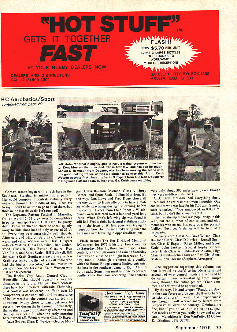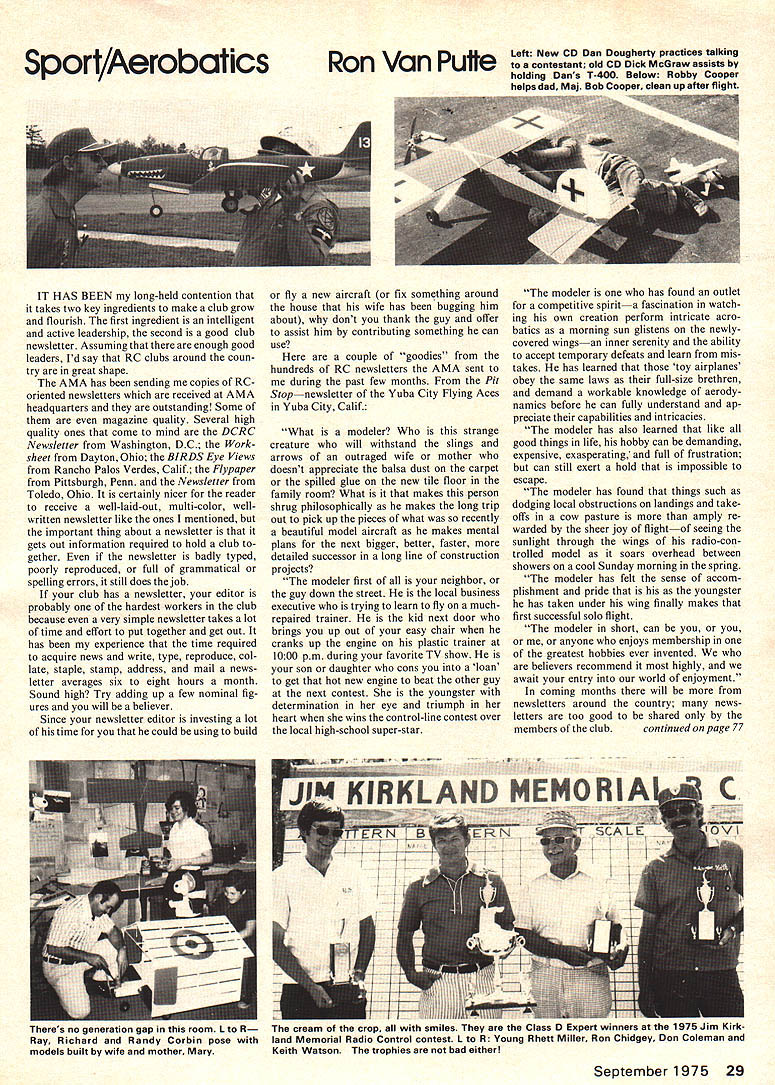Sport/Aerobatics ufte Left New CD Dan Dougherty practices talking contestant old CD Dick McGraw assists Ron Van holding Dans T-400 Below Robby Cooper Bob Cooper clean up after flight IT HAS BEEN long-held contention takes two key ingredients make club grow flourish first ingredient intelligent active leadership second good club newsletter Assuming enough good leaders Id say RC clubs around coun try great shape AMA has sending copies RC oriented newsletters received AMA headquarters outstanding Some magazine quality Several high quality ones come mind DCRC Newsletter Washington DC Work sheet Dayton Ohio BIRDS Eye Views Rancho Palos Verdes Calif Flypaper Pittsburgh Penn Newsletter Toledo Ohio certainly nicer reader receive well-laid-out multi-color wellwritten newsletter like ones mentioned important thing about newsletter gets out information required hold club gether newsletter badly typed poorly reproduced full grammatical spelling errors still does job club has newsletter editor probably hardest workers club because very simple newsletter takes lot time effort put together get out has experience time required acquire news write type reproduce col late staple stamp address mail news letter averages six eight hours month Sound high Try adding up few nominal fig ures will believer Since newsletter editor investing lot time could using build fly new aircraft fix something around house wife has bugging him about dont thank guy offer assist him contributing something can use couple goodies hundreds RC newsletters AMA sent during past few months Pit Stop newsletter Yuba City Flying Aces Yuba City Calif What modeler strange creature will withstand slings arrows outraged wife mother doesnt appreciate balsa dust carpet spilled glue new tile floor family room What makes person shrug philosophically makes long trip out pick up pieces what recently beautiful model aircraft makes mental plans next bigger better faster detailed successor long line construction projects modeler first neighbor guy down street local business executive trying learn fly muchrepaired trainer kid next door brings up out easy chair cranks up engine plastic trainer 1000 pm during favorite TV show son daughter cons loan get hot new engine beat other guy next contest youngster determination eye triumph heart wins control-line contest over local high-school super-star modeler has found outlet competitive spirit fascination watch ing own creation perform intricate acro batics morning sun glistens newlycovered wingsan inner serenity ability accept temporary defeats learn mis takes has learned toy airplanes obey same laws full-size brethren demand workable knowledge aerody namics before can fully understand ap preciate capabilities intricacies modeler has also learned like good things life hobby can demanding expensive exasperating full frustration can still exert hold impossible escape modeler has found things such dodging local obstructions landings take offs cow pasture amply re warded sheer joy flightof seeing sunlight through wings radio-con trolled model soars overhead between showers cool Sunday morning spring modeler has felt sense accom plishment pride youngster has taken under wing finally makes first successful solo flight modeler short can you or anyone enjoys membership greatest hobbies ever invented believers recommend highly await entry world enjoyment coming months will newsletters around country news letters too good shared members club continued page 77 September1975 29 4 e ANDMEMORIAC Theres no generation gap room Ito H cream os crop witn smiles ihey Class D Expert winners 1975 Jim KirkRay Richard Randy Corbin pose land Memorial Radio Control contest Ito R Young Rhett Miller Ron Chidgey Don Coleman models built wife mother Mary Keith Watson trophies bad either Contest season began rush Southeast Starting mid-April pattern flier could compete contests virtually weekend through middle July Needless say dont have time go three last six weeks isnt too bad Dogwood Pattern Festival Marietta Ga April 12 13 drew over 50 competitors pattern sport scale CD Dan Dougherty didnt know whether cheer sneak quietly away hide since expected 25 Everything went surprisingly well though After cold wind Saturday Sunday warm calm Winners Class D Expert Keith Watson Class D NoviceBob Under wood Class BDick Burton Class ARon Van Putte Sport ScaleBillBothwell Bill Johnston Kraft Southeast gave away new Kraft receiver flier Kraft radio highest percentage maximum possible score class Keith Watson won 83 percent Rocket City Radio Control Club Huntsville Ala should consult weather almanac future past three contests have blessed rain May 3 4 contest no exception over 80 competitors constant rain no assurance better weather contest started downpour chose pass over 60 percent flew during first round Fortunately weather cleared up Saturday afternoon Sunday beautiful after early morning haze burned off Winners Class D Expert Dave Brown Class D NoviceGeorge Mor gan Class BDon Bowman Class AJerry Barber Sport ScaleJulian Morrison way Don Lowe Fred Kugel drove way down Huntsville have mid air practicing during evening before contest Pieces Phoenix VI air planes scattered over hundred-yard-long track Dons left wing tip found still Freds right horizontal stabilizer stick ing front Everyone trying figure out Don missed Freds wing since airplanes traveling opposite directions Flash Report Jim Kirkland Memorial RC contest 1975 history Freak weather Saturday May 31 threatened spoil fine contest high winds rain Saturday gave way sunshine light breezes Sun day June 1 Although contest date conflict Baton Rouge contest limited entrants best southeast came Eglin AFB butt heads Something must done prevent conflicts like occurring contests about 300 miles apart though different districts CD Dick McGraw everything finely tuned entire contest went smoothly contestant late 800 am Sunday start remarked announced 800 am start didnt think meant free shrimp dinner popul