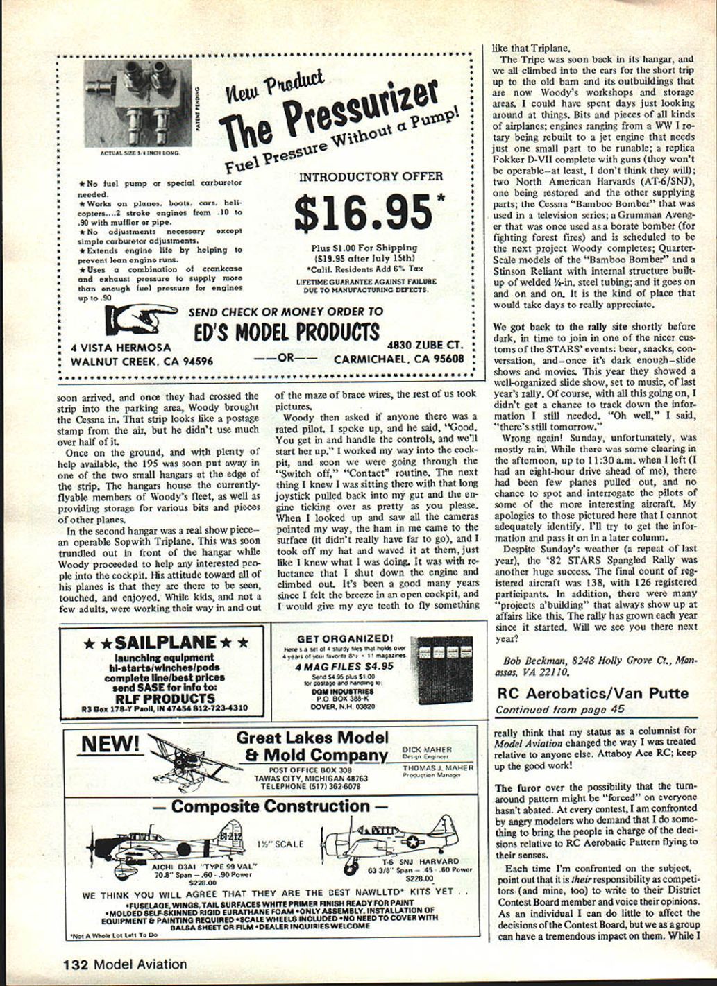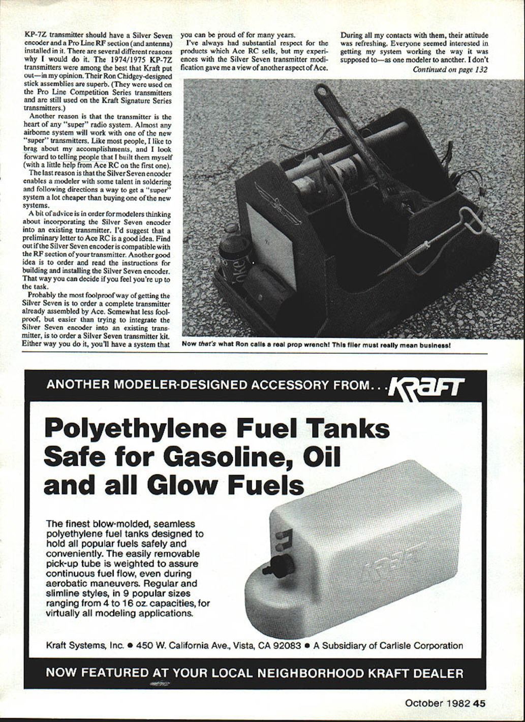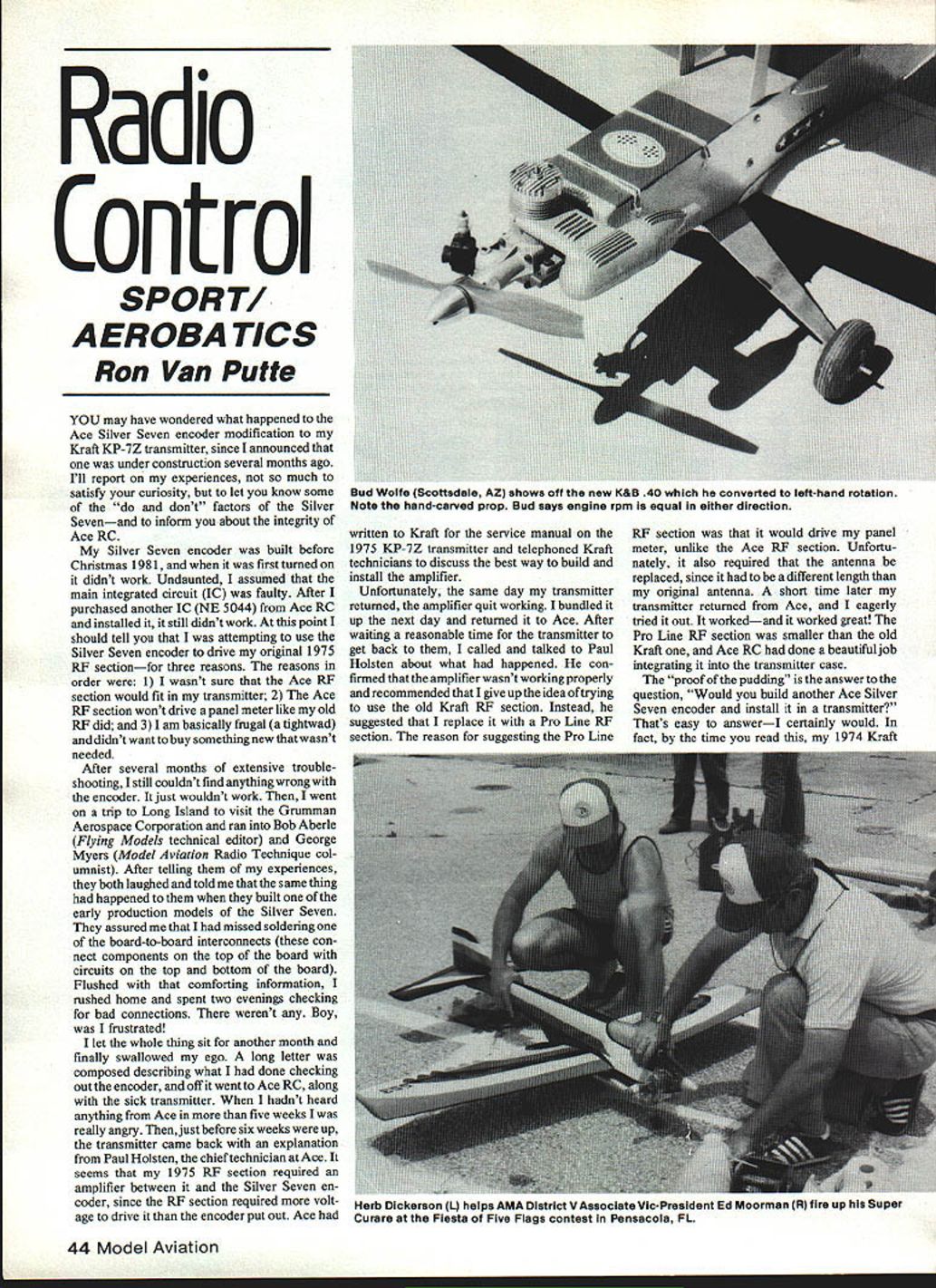 Radio Control SPORT AEROBA TICS Ron Van Putte YOU may have wondered what happened Ace Silver Seven encoder modification Kraft KP-7Z transmitter since announced under construction several months ago Ill report experiences much satisfy curiosity let know some dont factors Silver Sevenand inform about integrity Ace RC Silver Seven encoder built before Christmas 1981 first turned didnt work Undaunted assumed main integrated circuit IC faulty After purchased another IC NE 5044 Ace RC installed it still didnt work point should tell attempting use Silver Seven encoder drive original 1975 RE sectionfor three reasons reasons order 1 wasnt sure Ace RF section would fit transmitter 2 Ace RE section wont drive panel meter like old RE did 31 am basically frugal tiglnwad didnt want buy something new wasnt needed After several months extensive trouble shooting still couldnt find anything wrong encoder just wouldnt work went trip Long Island visit Grumman Aerospace Corporation ran Bob Aberle Flying Models technical editor George Myers Model Aviation Radio Technique col umnist After telling experiences both laughed told same thing happened built early production models Silver Seven assured missed soldering board-to-board interconnects con nect components top board circuits top bottom board Flushed comforting information rushed home spent two evenings checking bad connections werent Boy frustrated let whole thing sit another month finally swallowed ego long letter composed describing what done checking out encoder off went Ace RC along sick transmitter hadnt heard anything Ace five weeks really angry Thenjustbefore six weeks up transmitter came back explanation Paul Holsten chief technician atAce seems 1975 RE section required amplifier between Silver Seven en coder since RE section required volt age drive encoder put out Ace written Kraft service manual 1975 KP-7Z transmitter telephoned Kraft technicians discuss best way build install amplifier Unfortunately same day transmitter returned amplifier quit working bundled up next day returned Ace After waiting reasonable time transmitter get back called talked Paul Holsten about what happened con firmed amplifier wasnt working properly recommended give up idea trying use old Kraft RE section Instead suggested replace Pro Line RE section reason suggesting Pro Line RE section would drive panel meter unlike Ace RE section Unfortu nately also required antenna replaced since different length original antenna short time later transmitter returned Ace eagerly tried out workedand worked great Pro Line RE section smaller old Kraft Ace RC done beautiful job integrating transmitter case proof pudding answer question Would build another Ace Silver Seven encoder install transmitter Thats easy answerI certainly would fact time read 1974 Kraft 44 Model Aviation Bud Wolfe Scottsdale AZ shows off new K&B 40 converted left-hand rotation Note hand-carved prop Bud says engine rpm equal either direction Herb Dickerson CL helps AMA District V Associate Vic-President Ed Moorman R fire up Super Curare Fiesta Five Flags contest Pensacola FL KP-7Z transmitter should have Silver Seven encoder Pro Line RF section antenna installed several different reasons would 1974/1975 KP-7Z transmitters among best Kraft put outin opinion Ron Chidgey-designed stick assemblies superb used Pro Line Competition Series transmitters still used Kraft Signature Series transmitters Another reason transmitter heart super radio system Almost airborne system will work new super transmitters Like people like brag about accomplishments look forward telling people built myself little help Ace RC first last reason Silver Seven encoder enables modeler some talent soldering following directions way get super system lot cheaper buying new systems bit advice order modelers thinking about incorporating Silver Seven encoder existing transmitter Id suggest preliminary letter Ace RC good idea Find out Silver Seven encoder compatible RF section ofyourtransmitter Another good idea order read instructions building installing Silver Seven encoder way can decide feel youre up task Probably foolproof way getting Silver Seven order complete transmitter akeady assembled Ace Somewhat less fool proof easier trying integrate Silver Seven encoder existing trans mitter order Silver Seven transmitter kit Either way youll have system can Proud years Ive always substantial respect products Ace RC sells experi ences Silver Seven transmitter modi fication gave view another aspect Ace During contacts attitude refreshing Everyone seemed interested getting system working way supposed toas modeler another dont Continued page 132 finest blow-molded seamless polyethylene fuel tanks designed hold popular fuels safely conveniently easily removable pick-up tube weighted assure continuous fuel flow during aerobatic maneuvers Regular slimline styles 9 popular sizes ranging 4 16 oz capacities virtually modeling applications October 1982 45 Now thats what Ron calls real prop wrench flier must really mean business Polyethylene Fuel Tanks Safe Gasoline Oil Glow Fuels Kraft Systems Inc e 450 W California Ave Vista CA 92083 e Subsidiary Carlisle Corporation 44444444444444444444444444444444444444444444 C4 44.swlIItILI4 *4 IIIDuL- 1w~ 444 4 4iB 44 *sn4~4 4 No fuel pump special carburetorINTRODUCTORY OFFER 44 4needed * Works planes boats cars heli copters..2 stroke engines 10 90 muffler pipeLilt tI~ 4* Na adjustments necessary except simple carburetor adjustments4 4* Extends engine life helping $100 Shipping4 44 prevent lean engine runs 95 after July 15th * Uses combination crankcase if Residents Add 6% Tax4 exhaust pressure supply moreLIFETIME GUARANTEE AGAINST FAILURE4 4than enough fuel pressure engines DUE TO MANUFACTURING DEFECTS up 904 44 SEND CHECK OR MONEY ORDER ro AEDS MODEL PRODUCTS A 94596 OR CARMICHAEL ZUBE CT 95608 44444444444444444444444444444444444444444444444444444444444 soon arrived once crossed strip parking area Woody brought Cessna strip lo
