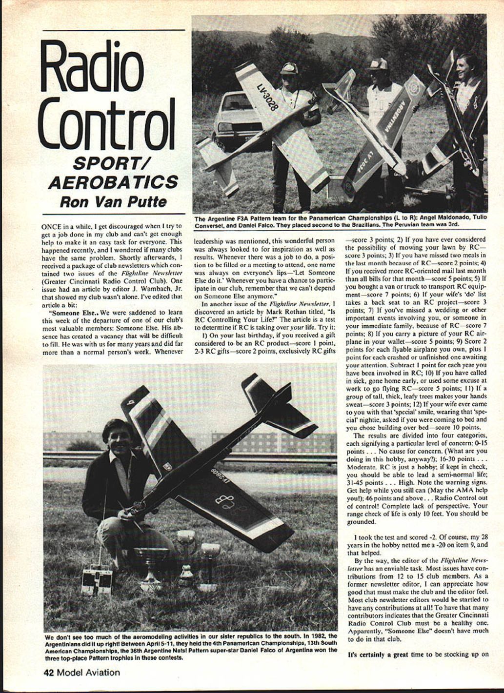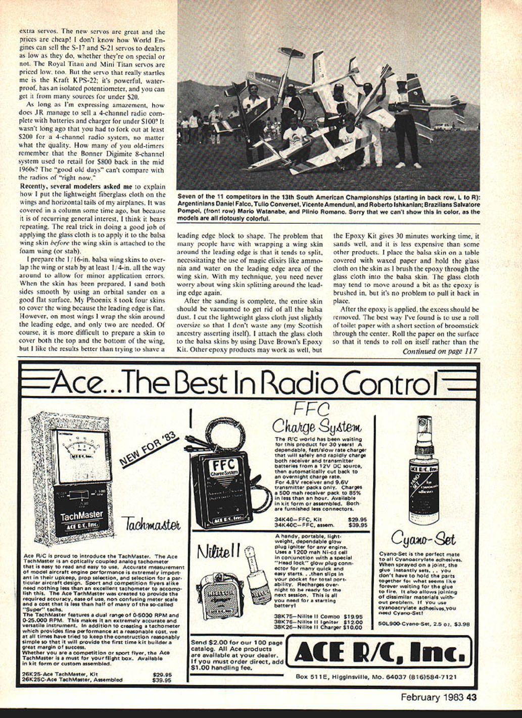 Radio Control SPORT AEROBA TICS Ron Van Putte ONCE get discouraged try get joh done club cant get enough help make easy task everyone happened recently wondered clubs have same problem Shortly afterwards received package club newsletters con tained two issues Flighiline Newsletter Greater Cincinnati Radio Control Club issue article editor Wambach Jr showed club wasnt alone Ive edited article bit Someone Else saddened learn week departure clubs valuable members Someone Else ab sence has created vacancy will difficult fill us years did far normal persons work Whenever leadership mentioned wonderful person always looked inspiration well results Whenever job posi tion filled meeting attend name always everyones lipsLet Someone Else Whenever have chance partic ipate club remember cant depend Someone Else anymore another issue Flightline Newsletter discovered article Mark Rothan titled RC Controlling Life article test determine RC taking over life Try I On last birthday received gift considered RC productscore point 2-3 RC giftsscore 2 points exclusively RC gifts score 3 points 2 have ever considered possibility mowing lawn RC score 3 points 3 have missed two meals last month because RCscore 2 points 4 received RC-oriented mail last month bills monthscore 5 points 5 bought van truck transport RC equip mentscore 7 points 6 wifes list takes back seat RC projectscore 3 points 7 youve missed wedding other important events involving someone immediate family because RCscore 7 points 8 carry picture RC air plane walletscore 5 points 9 Score 2 points flyable airplane own plus point crashed unfinished awaiting attention Subtract point year have involved RC 10 have called sick gone home early used some excuse work go flying RCscore 5 points II group tall thick leafy trees makes hands sweatscore 3 points 12 wife ever came special smile wearing spe cial nightie asked coming bed chose building over bedscore 10 points results divided four categories signifying particular level concern 0-15 points. No cause concern What doing hobby anyway 16-30 points Moderate RC just hobby kept check should able lead semi-normal life 31-45 points . High Note warning signs Get help still can May AMA help 46 points above. Radio Control out control Complete lack perspective range check life 10 feet should grounded took test scored -2 course 28 years hobby netted -20 item 9 helped way editor Flighiline News letter has enviable task Most issues have con tributions 12 IS club members As former newsletter editor can appreciate good must make club editor feel Most club newsletter editors would startled have contributions have contributors indicates Greater Cincinnati Radio Control Club must healthy Apparently Someone Else doesnt have much club Its certainly great time stocking up 42 Model Aviation con see iou mucn Ci Inc aerunivucitiug un uu ssnv n.nnc flu Argentinians did up rightl Between AprIl 5-11 irwy neid 4th Panamerlcan Chansp.sus AmerIcan ChampIonships 36th Argentine Natal Pattern super-Star Daniel Faico ArgentirHa win, three top-place Pattern trophies contests extra servos new servos great prices cheap dont know World En gines can sell S-I S-2l servos dealers low whether theyre special Royal Titan Mini Titan servos priced low too servo really startles Kraft KPS-22 its powerful water proof has isolated potentiometer can get sources under $20 As long Im expressing amazement does JR manage sell 4-channel radio com plete batteries charger under $100 wasnt long ago fork out least $200 4-channel radio system no matter what quality old-timers remember Bonner Digimite 8-channel system used retail $800 back mid 1960s good old days cant compare radios right now Recently several modelers asked explain put lightweight fiberglass cloth wings horizontal tails airplanes covered column some time ago because recurring general interest think bears repeating real trick doing good job applying glass cloth apply balsa wing skin before wing skin attached foam wing stab prepare 1/16-in balsa wing skins over lap wing stab least / 4-in way around allow minor application errors skin has prepared sand both sides smooth using orbital sander good flat surface Phoenix 8 took four skins cover wing because leading edge flat However wings wrap skin around leading edge two needed course difficult prepare skin cover both top bottom wing like results better trying shave leading edge block shape problem people have wrapping wing skin around leading edge tends split necessitating use magic elixirs like ammo nia water leading edge area wing skin technique need never worry about wing skin splitting around lead ing edge again After sanding complete entire skin should vacuumed get rid balsa dust cut lightweight glass cloth just slightly oversize dont waste Scottish ancestry asserting itself attach glass cloth balsa skins using Dave Browns Epoxy Kit Other epoxy products may work well Epoxy Kit gives 30 minutes working time sands well less expensive some other products place balsa skin table covered waxed paper hold glass cloth skin brush epoxy through glass cloth balsa skin glass cloth may tend move around bit epoxy brushed its no problem pull back place After epoxy applied excess should removed best way Ive found use roll toilet paper short section broomstick through center Roll paper surface tends roll itself rather Continued page 117 Ace.The Best Radio Control Ace R/C proud introduce TachMaster Ace TachMaster optically coupled analog tachometer easy read easy use Accurate measurement model aircraft engine performance extremely import ant upkeep prop selection selection par ticular aircraft design Sport competition flyers alike need nothing less excellent tachometer accomp lish Ace TechMaster created provide required accuracy ease use non confusing meter scala cost less half of so-called Super tache TachMaster features dual range 0-5000 RPM 0-25000 RPM makes extremely accurate versatile instrument addition creating tachometer providesfine performance reasonable c