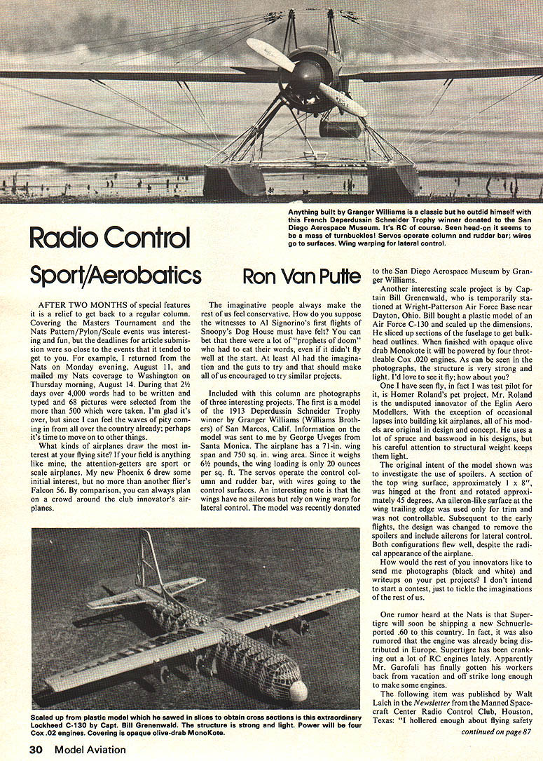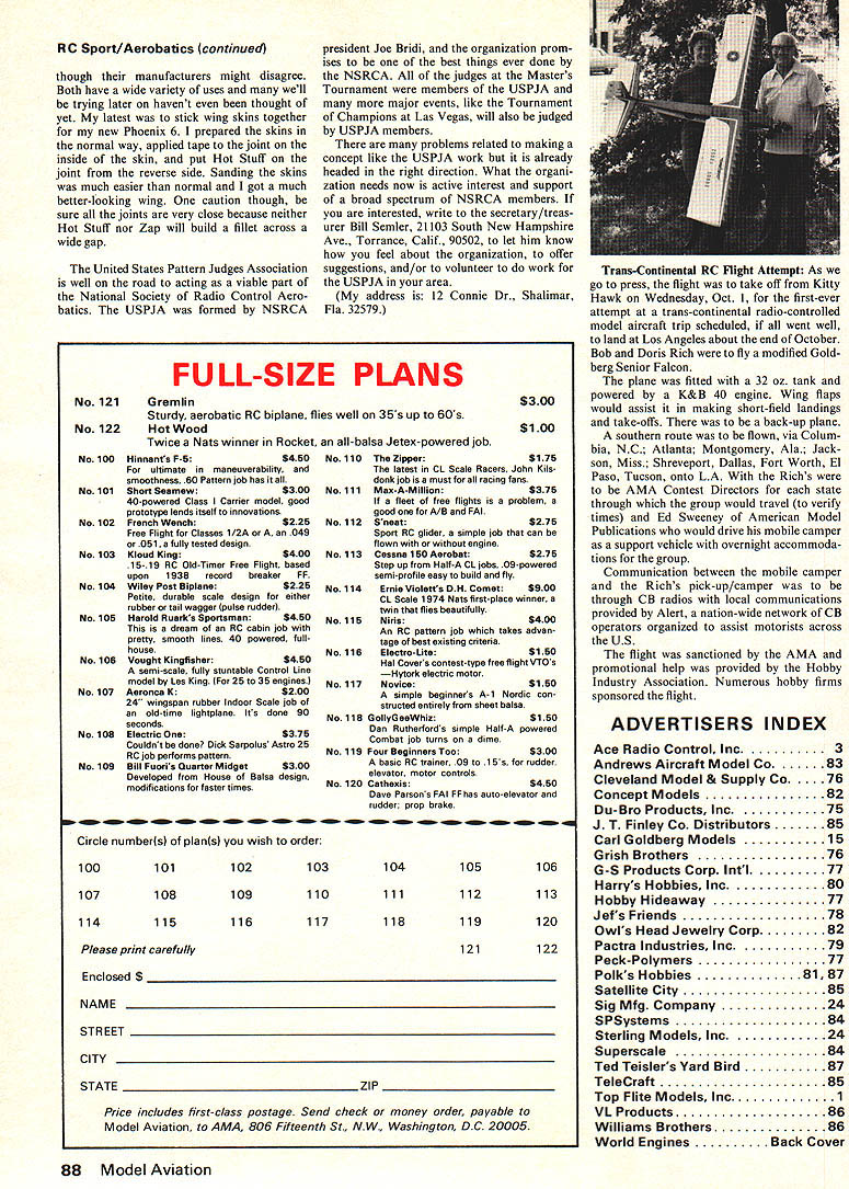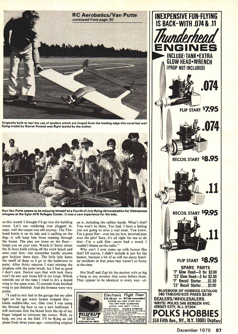 Radb Control Sport/Aerobatics AFTER TWO MONTHS special features relief get back regular column Covering Masters Tournament Nats Pattern/Pylon/Scale events interest ing fun deadlines article submis sion close events tended get example returned Nats Monday evening August 11 mailed Nats coverage Washington Thursday mowing August 14 During 2 days over 4000 words written typed 68 pictures selected 500 taken Im glad its over since can feel waves pity com ing over country already perhaps its time move other things What kinds airplanes draw terest flying site field anything like attention-getters sport scale airplanes new Phoenix 6 drew some initial interest no another fliers Falcon 56 comparison can always plan crowd around club innovators air planes Ron Von Putte imaginative people always make rest ofus feel conservative suppose witnesses Al Signorinos first flights Snoopys Dog House must have felt can bet lot prophets doom eat words didnt fly well start least Al imagina tion guts try should make us encouraged try similar projects Included column photographs three interesting projects first model 1913 Deperdussin Schneider Trophy winner Oranger Williams Williams Broth ers San Marcos Calif Information model sent George Uveges Santa Monica airplane has 71-in wing span 750 sq wing area Since weighs 6 pounds wing loading 20 ounces per sq ft servos operate control col umn rudder bar wires going control surfaces An interesting note wings have no ailerons rely wing warp lateral control model recently donated San Diego Aerospace Museum Gran ger Williams Another interesting scale project Cap tain Bill Grenenwald temporarily ste tioned Wright-Patterson Ar Fome Base near Dayton Ohio Bill bought plastic model Air Force C-130 sealed up dimensions sliced up sections fuselage get bulk head outlines finished opaque olive drab Monokote will powered four throt ticable Cox 020 engines As can seen photographs structure very strong light Id love see fly about have seen fly fact test pilot Homer Rolands pet project Mr Roland undisputed innovator Eglin Aero Modellers exception occasional lapses building kit airplanes mod els original design concept uses lot spruce basswood designs careful attention structural weight keeps light original intent model shown investigate use spoilers section top wing surface approximately 1 x 8 hinged front rotated approxi mately 45 degrees An aileron-like surface wing trailing edge used trim controllable Subsequent early flights design changed remove spoilers include ailerons lateral control Both configurations flew well despite radi cal appearance airplane would rest innovators like send photographs black white writeups pet projects dont intend start contest just tickle imaginations rest us rumor heard Nats Super tigre will soon shipping new Schnuerle ported 60 country fact also rumored engine already being dis tributed Europe Supertigre has crank ing out lot RC engines lately Apparently Mr Garofali has finally gotten workers hack vacation off strike long enough make some engines following item published Walt Laich Newsletter Manned Space craft Center Radio Control Club Houston Texas hollered enough about flying safety continued page 87 30 Model Aviation including rubber bands Whats wont Too bad have feeling going miss real treat know Im great flierever see low inverted pass over pits Sure its right Im safe fliernever wreck couldnt blame radio cant ever come up humor like course didnt include just humor because lot us will see famil iar incidents piece werent funny time Hot Stuff Zap hit market big bang product came before appear identical wayalso month thought Id go building room Lets seesoldering iron plugged oops well carpet old anyway Tite bond bottle its side spilling dogit will keep him running through house pins loose floor keeps toes Watch Sorry about X-Acto knife rolling off work bench onto footbut remember hardly anyone gets lockjaw days little lady hates smell dope go bathroom paint After thirty minutes start missing airplane paint brush feel good dont care Doctor says luck wont scar tissue left lungs Which reminds time tried dry doped wing open oven 32 seconds finished wing just finished firemen very __________________________________________ polite used mix fuel garage pilot Electronic Flight Timer light gas water heater stopped $1250-kit $1x50-essemhI SHIPPED VIA FIRST CLASS MAIL kinda sudden-like too time using FULL ONE TSAR GUARANTEE Dremel Jig Saw cut new bulkhead TUAL SIZE ONLY IIS6 rrrs TESTED APPEOVED still maintain blood tip RyOtfltO~&hghI 5 finger helped lubricate motor Well long see field Ill flying oldP0 ane three years agoeverything originalKIEKLANVWAdO33 , INEXPENSIVE FUN-FLYING IS BACK-WITH 014& 11 74aide4W ENGINES INCLUOETANKSEXTRA GLOW HEAOWRENCH PROP NOT INCLUDED 074 FLIP START $795 074 RECOIL START $895 Lull FLIP START 895 SPARE PARTS J 1 Glow Head3 for: 11R Glow Head3 $250 11 Recoil Starter $200 BLUEBOOK OF HOBBIES CATALOG 160 TABLOID-SIZE PAGES $395 DEALERS/WHOLESALERS WRITE POLKS 346 BERGEN AVE RSEY CITY NJ 07304 POLKS HOBBIES 314 Fifth Ave NY NY 10001 DeptMv December 1975 87 Originally built test use spoilers hinged leading edge novel well flying model Homer Roland flight tested author Ron Van Putte seems enjoying himself Fourth July flying demonstration Vietnamese refugees Eglin AFB Refugee Center new experience kids RC Sport/Aerobatics continued though manufacturers might disagree Both have wide variety uses well trying later havent thought yet latest stick wing skins together new Phoenix 6 prepared skins normal way applied tape joint inside skin put Hot Stuff joint reverse side Sanding skins much easier normal got much better-looking wing caution though sure joints very close because neither Hot Stuff nor Zap will build fillet across wide gap United States Pattern Judges Association well road acting viable part National Society Radio Control Aero batics USPJA formed NSRCA president Joe Bridi organization prom ises best things ever done NSRCA judge