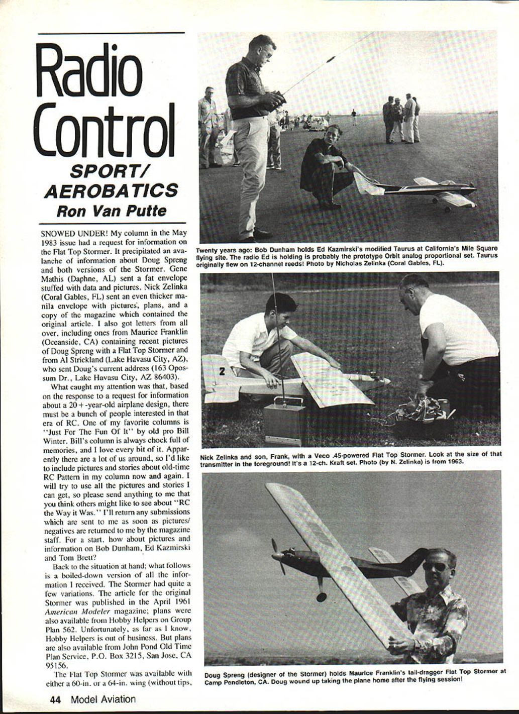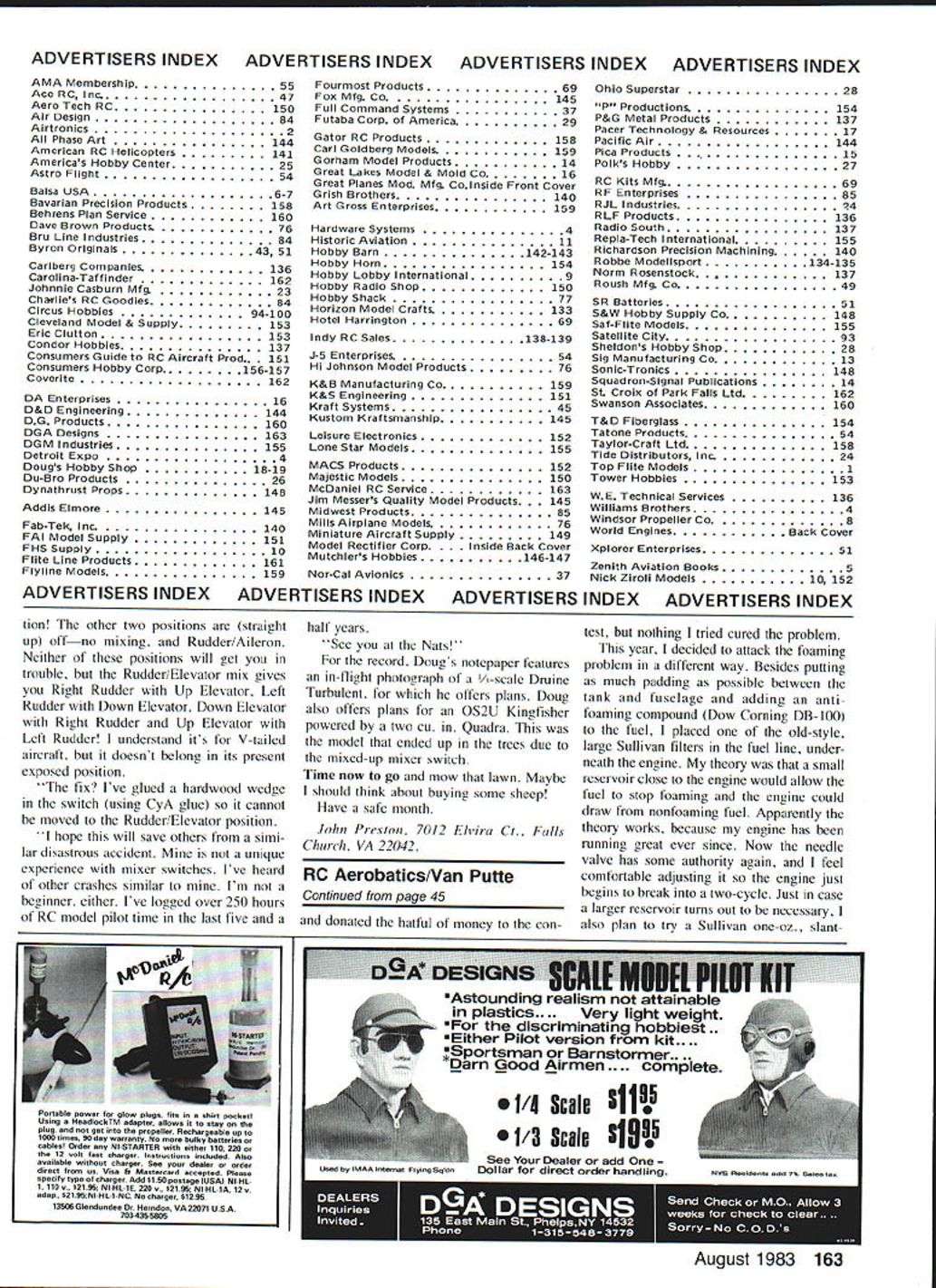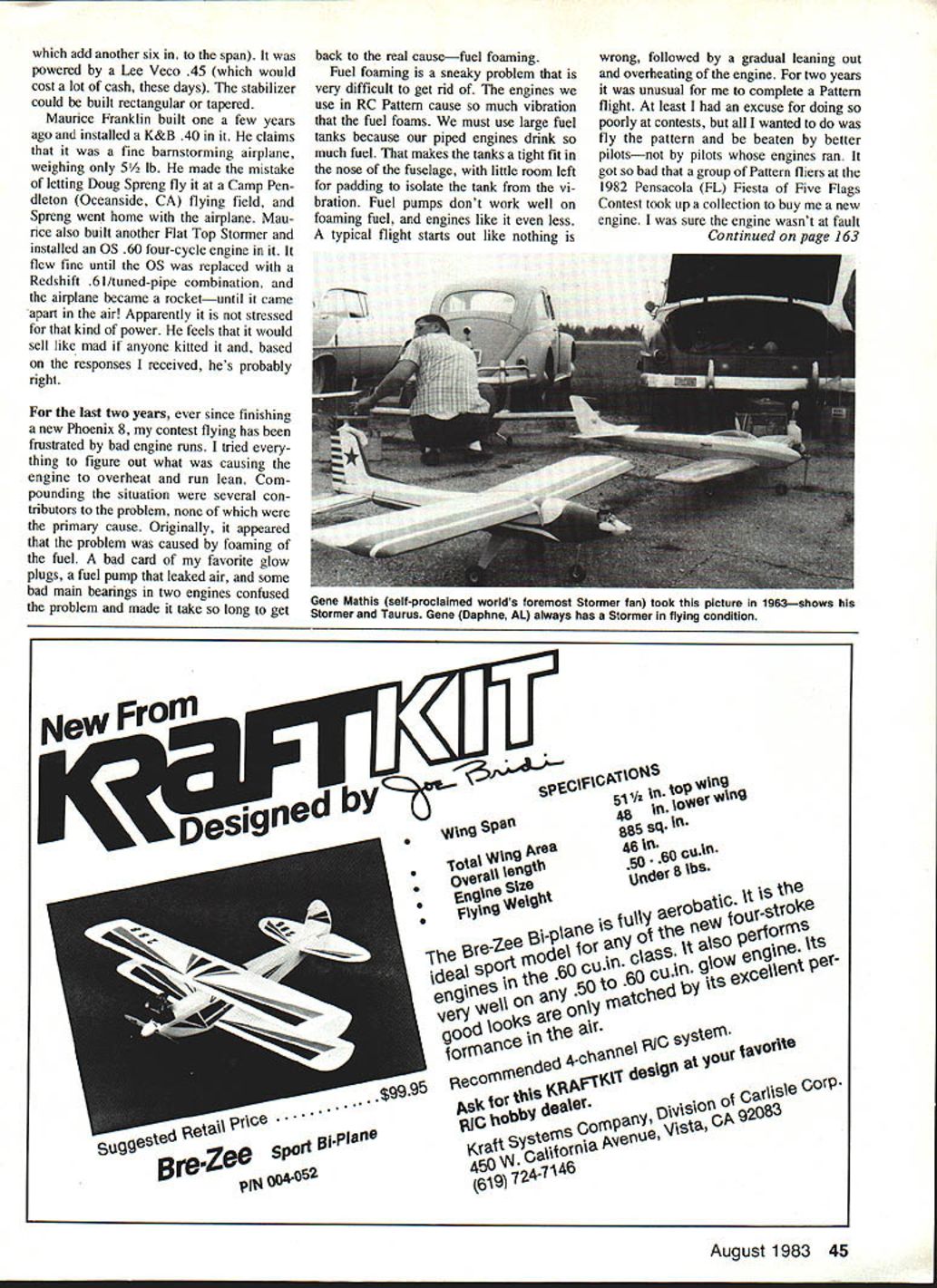 Radio Control SPORT AEROBA TICS Ron Van Putte SNOWED UNDER column May 1983 issue request information Flat Top Stormer precipitated ava lanche information about Doug Spreng both versions Stormer Gene Mathis Daphne AL sent fat envelope stuffed data pictures Nick Zelinka Coral Gables FL sent thicker ma nila envelope pictures plans copy magazine contained original article also got letters over including ones Maurice Franklin Oceanside CA containing recent pictures Doug Spreng Flat Top Stormer Al Strickland Lake Havasu City AZ sent Dougs current address 163 Opos sum Dr Lake Havasu City AZ 86403 What caught attention based response request information about 20 r-old airplane design must bunch people interested era RC favorite columns Just Fun old pro Bill Winter Bills column always chock full memories love bit Appar ently lot us around Id like include pictures stories about old-time RC Pattern column now again will try use pictures stories can get please send anything think others might like see about RC Way Ill return submissions sent soon pictures negatives returned magazine staff start about pictures information Bob Dunham Ed Kazmirski Tom Brett Back situation hand what follows boiled-down version infor mation received Stormer quite few variations article original Stormer published April 1961 American Modeler magazine plans also available Hobby Helpers Group Plan 562 Unfortunately far know Hobby Helpers out business plans also available John Pond Old Time Plan Service PO Box 3215 San Jose CA 95156 Flat Top Stormer available either 60-in 64-in wing tips 44 Model Aviation Twenty years ago Bob Dunnam flows Ed Kazmirskis modified Taurus Californias Mile Square flying site radio Ed holding probably prototype Orbit analog proportional set Taurus originally flew 12-channel reeds Photo Nicholas Zelinka Coral Gables FL Nick Zelinka son Frank Veco 45-powered Flat Top Stormer Look size transmitter foreground Its 12-ch Kraft set Photo N Zelinka 1g63 Doug Spreng designer Stormer holds Maurice Franklins tail-dragger Flat Top Stormer Camp Pendleton CA Doug wound up taking plane home after flying session add another six span powered Lee Veco 45 would cost lot cash days stabilizer could built rectangular tapered Maurice Franklin built few years ago installed K&B 40 claims fine barnstorming airplane weighing 5/2 lb made mistake letting Doug Spreng fly Camp Pen dleton Oceanside CA flying field Spreng went home airplane Mau rice also built another Flat Top Stormer installed OS 60 four-cycle engine flew fine until OS replaced Redshift 61/tuned-pipe combination airplane became rocketuntil came apart air Apparently stressed kind power feels would sell like mad anyone kitted based responses received hes probably right last two years ever since finishing new Phoenix 8 contest flying has frustrated bad engine runs tried thing figure out what causing engine overheat run lean Com pounding situation several con tributors problem primary cause Originally appeared problem caused foaming fuel bad card favorite glow plugs fuel pump leaked air some bad main bearings two engines confused problem made take long get back real causefuel foaming Fuel foaming sneaky problem very difficult get rid engines use RC Pattern cause much vibration fuel foams must use large fuel tanks because piped engines drink much fuel makes tanks tight fit nose fuselage little room left padding isolate tank vi bration Fuel pumps dont work well foaming fuel engines like less typical flight starts out like nothing wrong followed gradual leaning out overheating engine two years unusual complete Pattern flight least excuse doing poorly contests wanted fly pattern beaten better pilotsnot pilots engines ran got bad group Pattern fliers 1982 Pensacola FL Fiesta Five Flags Contest took up collection buy new engine sure engine wasnt fault Continued page 163 10181jJlng P~B ~ln9 i/ 10y4•f yjltlO 60 8 lbS i uW aeObat~ourstrOWe pare0j tve reW erioS idea got per 60 cU60 oU vte aIW 50 YJ jerV6 oO 8orW r aVCe TteIpvrl3i COSIgn 1ci DASOI CBse COrP SStj0ra 619 72A August 1983 45 Gene Mathis self-proclaimed worlds foremost Stormer fan took picture 1963shows Stormer Taurus Gene Daphne AL always has Stormer flying condition ~jln9 p0sjgneaTbYf 5port BIPI8fl 00A052 ADVERTISERS INDEX ADVERTISERS INDEX ADVERTISERS INDEX ADVERTISERS INDEX AMA Membership55 AceRClnc47 Aero Tech RC150 Air Design84 Airtronics2 Phase Art144 American RC Helicopters141 Americas Hobby Center25 Astro Flight54 Balsa USA6-7 Bavarian Precision Products158 Behrens Plan Service160 Dave Brown Products76 Bru Line Industries84 Byron Originals4351 Carlberg Companies136 Carolina-Taffinder162 Johnnie Casburn Mfg23 Chaiies RC Goodies84 Circus Hobbles94-100 Cleveland Model & Supply153 Eric Clutton153 Condor Hobbies137 Consumers Guide RC Aircraft Prod. Consumers Hobby Corp156-157 Coverite162 DA Enterprises D&D Engineering DG Products DGA Designs 0GM Industries Detroit Expo Dougs Hobby Shop ro Products Dynathrust Props Addis Elmore Fab-Tek Inc FAI Model Supply FHS Supply Flite Line Products Flyline Models 16 144 160 163 155 18-19 26 - 148 145 140 151 - 10 161 159 4 11 142-143 154 9 150 77 133 69 Fourmost Products69 Fox Mfg Co145 Full Command Systems37 Futaba Corp America29 Gator RC Products158 Carl Goldberg Models159 Gorham Model Products14 Great Lakes Model & Mold Co16 Great Planes Mod Mfg CoInside Front Cover Grish Brothers140 Art Gross Enterprises159 Hardware Systems Historic Aviation Hobby Barn Hobby Horn Hobby Lobby International Hobby Radio Shop Hobby Shack Horizon Model Crafts Hotel Harrington indy RC Sales J-5 Enterprises Hi Johnson Model Products K&B Manufacturing Co K&S Engineering Kraft Systems Kustom Kraftsmanship Leisure Electronics Lone Star Models MACS Products152 Majestic Models150 McDaniel RC Service163 Jim Messers Quality Model Products Midwest Products85 Mills Airplane Models76 Miniature Aircraft Supply149 Model Rectifier Corp side Back Cover Mutchiers Hobbies146-147 Nor-Cal Avionics37 159 151 45