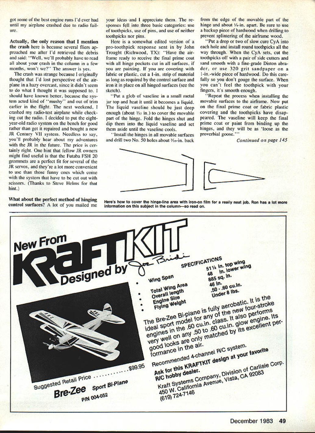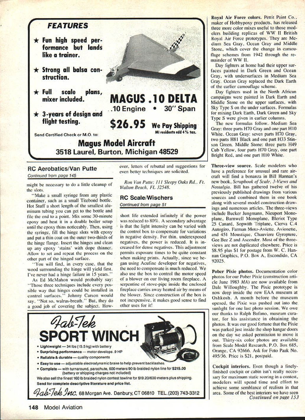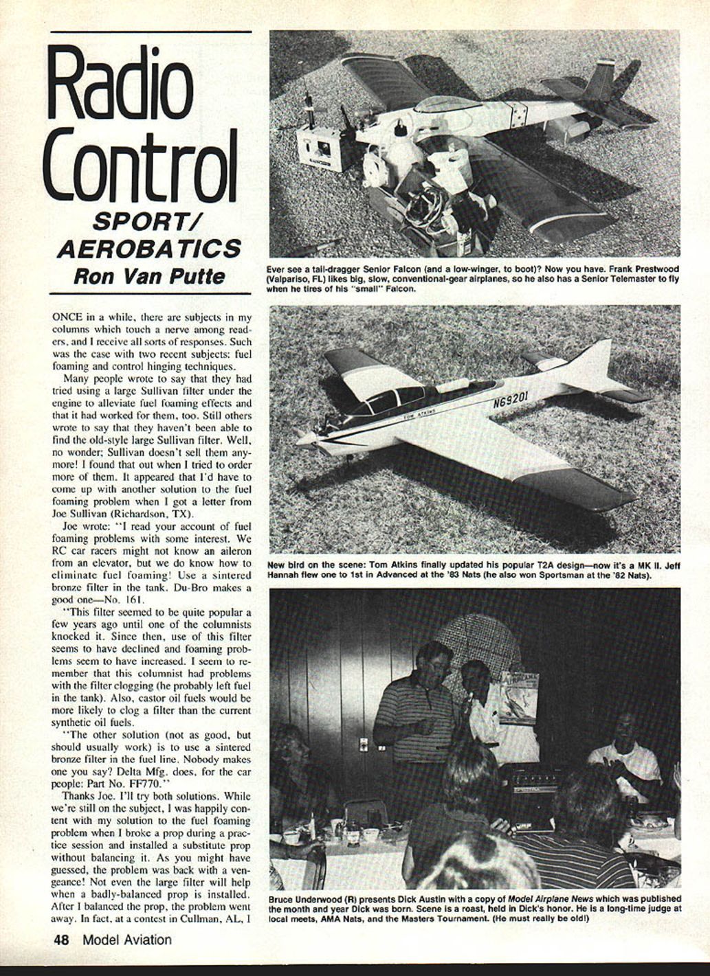 Radio Control SPORT AEROBA TICS Ron Van Putte ONCE subjects columns touch nerve among read ers receive sorts responses Such case two recent subjects fuel foaming control hinging techniques people wrote say tried using large Sullivan filter under engine alleviate fuel foaming effects worked too Still others wrote say havent able find old-style large Sullivan filter Well no wonder Sullivan doesnt sell found out tried order appeared Id have come up another solution fuel foaming problem got letter Joe Sullivan Richardson TX Joe wrote read account fuel foaming problems some interest RC car racers might know aileron elevator know eliminate fuel foaming Use sintered bronze filter tank Du-Bro makes good oneNo 161 filter seemed quite popular few years ago until columnists knocked Since use filter seems have declined foaming prob lems seem have increased seem re member columnist problems filter clogging probably left fuel tank Also castor oil fuels would likely clog filter current synthetic oil fuels other solution good should usually work use sintered bronze filter fuel line Nobody makes say Delta Mfg does car people Part No FF770 Thanks Joe Ill try both solutions still subject happily con tent solution fuel foaming problem broke prop during prac tice session installed substitute prop balancing As might have guessed problem back ven geance large filter will help badly-balanced prop installed After balanced prop problem went away fact contest Cullman AL 48 Model Aviation Ever see tail-dragger Senior Falcon low-winger boot Now have Frank Prestwood Valpariso FL likes big slow conventional-gear airplanes also has Senior Telemaster fly tires small Falcon New bird scene Tom Atkins finally updated popular T2A designnow ifs MK II Jeff Hannah flew 1st Advanced 83 Nats also won Sportsman 82 Nats Bruce Underwood R presents Dick Austin copy Model Airplane News published month year Dick born Scene roast held Dicks honor long-time judge local meets AMA Nats Masters Tournament must really old got some best engine runs Id ever until airplane crashed due radio fail ure Actually reason mention crash because several fliers ap proached after Id retrieved debris said Well well probably have read about crash column few months wont answer yes crash strange because originally thought Id lost perspective air plane hazy overcast since didnt seem what thought supposed should have known better because sys tem acted kind mushy out trim earlier flight next weekend crashed radio-test airplane check ing out radio decided put eightyear-old radio system bench good rather get repaired bought new JR Century VII system Needless say youll probably hear about adventures JR future price cer tainly right hint fellow JR owners might find useful Futaba FSH 20 grommets perfect fit several JR servos theyre lot convenient use funny ones come system have cut out scissors Thanks Steve Helms hint ideas appreciate re sponses fell three basic categories use toothpicks use pins use neither toothpicks nor pins somewhat edited version pro-toothpick response sent John Trought Richwood TX Have air frame ready receive final prime coat hinge pockets cut surfaces painting covering fabric plastic cut 1-in strip material long required control surface iron place hinged surfaces see sketch Put glob vaseline small metal jar top heat until becomes liquid liquid vaseline should just deep enough about 3A2 cover movable part hinge Fold hinges shut dip liquid vaseline set aside until vaseline cools Install hinges movable surfaces drill two No 50 holes about 3/6-in back edge movable part hinge about /4-in apart sure use backup piece hardwood drilling prevent splintering airframe wood Put drop two slow cure CyA hole install round toothpicks way through CyA sets cut toothpicks off pair side cutters sand smooth fine-grade Diston abra der use 320 grit sandpaper 1-in-wide piece hardwood care fully dont gouge surface cant feel toothpick fingers its smooth enough Repeat process installing movable surfaces airframe Now put final prime coat fabric plastic covering toothpicks have disap peared vaseline will keep final prime coat paint binding up hinges will loose proverbial goose Continued page 145 [ciuz What about perfect method hinging control surfaces lot mailed Heres cover hinge-line area iron-on film reaily neat lob Ron has lot information subject columnso read December 1983 49 New 61 /2 gfle dbY Zr AS 86 Sd AS60 CU1 lotS ~ ejg W ae0¶ourS~~W reZee B 0j te reV4 eriO~S t erQ~es r e claSS UM60 cu 50 iC xc~ed b pef air e JG 5se goO S11COrP 4~ca 19 996 eSe e8 ce sug reiZee 5port BiPISfl pit4 igines Engineered Meet uemanas OT tne Most Discriminating Modeler Backed Service Match Send $100 Catalog New Standard * g2223 Giant Models 8HP5%Lbs* 95 95 9 Direct Sales Only*179 Dealer Direct ALL ENGINES READY TO RUN INCLUDING 6 BOLT PROP HUB MOU NT MU FFLERS AVAILABLE AT EXTRA CHARGE * KIORITZ 24 Work Horse 32 HP bs Canton OH 44707 ROUSH MFG THEENGINEPEOPLE 5 Cleveland Ave SW U hone 216 484-6810 484-4374 responding results RF Interface wont read FM pulses right now Ace working George M Myers 70 Froehlich Farm Rd Hicksville NY 11801 Massey/Seaborg Continued oaoe 46 Bill also attributes Steves fast learning boys extensive reading about RC mod els before attempting first flight knew just what expect step Bill says Steves mother puts yet another way Theres no question Steve has terest determination mental ability coordinationbut Bill never would have happened Bill has great patience Theres wonderful chemistry tween working together Theres wonderful bond friendship Bill instructing Steve has one-way teaching experience As ex plains probably get out Steve does Bill program management consultant Wisconsin Bureau Alcohol Drug Abuse overcame serious problem own 16 years ago conquered alcoholism now works programs Wisconsin help other people overcome alcohol drug-related problems night first met Steve recalls just found out job going changed didnt know headed feeling very sorry myself way home 