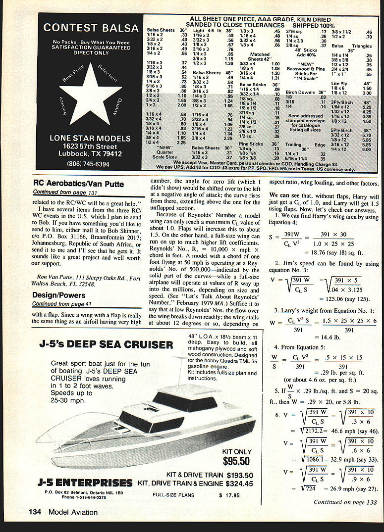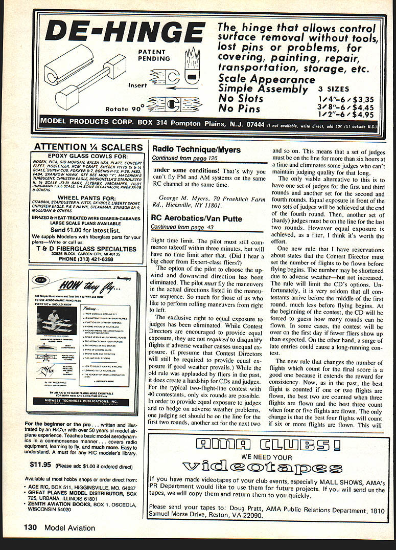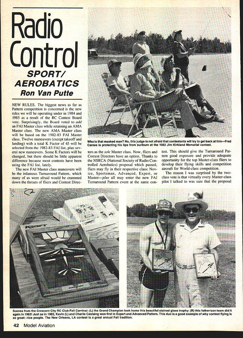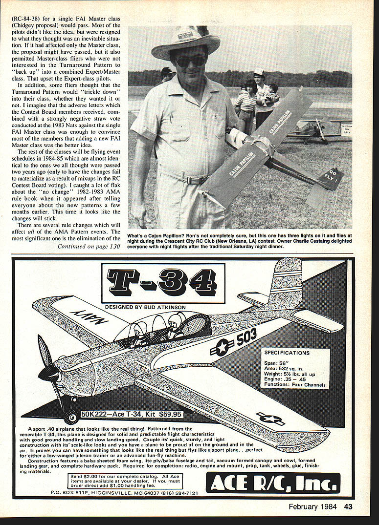 Radio Control SPORT AEROBA TICS Ron Van Putte NEW RULES biggest news far Pattern competition concerned new rules will operating under 1984 1985 result RC Contest Board vote Surprisingly Board voted add FAL Master class retaining AMA Master class new AMA Master class will based 1982-83 FAI Master class Twelve maneuvers except takeoff landing total K Factor 45 will selected 1982-83 FAI list plus sev eral new maneuvers Some K Factors will changed should little apparent difference because contests have using FAI list lately new FAI Master class maneuvers will infamous Turnaround Pattern us afraid would crammed down throats fliers Contest Direc tors sole Master class Now fliers Contest Directors have option Thanks NSRCA National Society Radio Con trolled Aerobatics proposal passed fliers may fly respective class Nov ice Sportsman Advanced Expert Masterplus may enter new FAI Turnaround Pattern event same contest should give Turnaround Pat tern good exposure provide adequate opportunity top Master-class fliers develop flying skills competition aircraft World-class competition reason surprised twoclass vote virtually Master-class pilot talked sure proposal Scenes Crescent City RC Club Fall Carnival L Grand Champion took home beautiful stained glass trophy R father/son team did again 1983 Just 1982 Kevin L Charlie Castaing won first Expert Advanced Pattern duo good example contest flying great nice people New Orleans LA contest great annual Fall tradition 42 Model Aviation masked man No judge afraid contestants will try get back himFred Carnes protecting ups sunburn 1983 Jim Kirkland Memorial contest RC-84-38 single FAI Master class Chidgey proposal would pass Most pilots didnt like idea resigned what thought inevitable situa tion affected Master class proposal might have passed also permitted Master-class fliers interested Turnaround Pattern back up combined ExpertlMaster class upset Expert-class pilots addition some fliers thought Turnaround Pattern would trickle down class whether wanted imagine adverse letters Contest Board members received com bined strongly negative straw vote conducted 1983 Nats against single FAI Master class enough convince members adding new FAT Master class better idea rest classes will flying event schedules 1984-85 almost iden tical ones thought passed two years ago have changes fail materialize result mixups RC Contest Board voting caught lot flak about no change 1982-1983 AMA rule book appeared after telling everyone about new patterns few months earlier time looks like changes will stick several rule changes will affect AMA Pattern events significant elimination Continued page 130 Send $200 complete catalog Ace items available dealer must Order direct add $100 handling fee PO BOX 511 C HIGGINSVILLE MO 64037 816 584-7121 February 1984 43 Whats Calun Papillon Rons completely sure has three lights files night during Crescent City RC Club New Orleans LA contest Owner Charlie Castaing delighted everyone night flights after traditional Saturday night dinner sport 40 airplane looks like real thing Patterned venerable T-34 plane designed solid predictable flight characteristics good ground handling slow landing speed Couple its quick sturdy light construction its scale-like looks have plane proud ground air proves can have something looks like real thing flys like sport plane. perfect either low-winged aileron trainer advanced fun-fly machine Construction features balsa sheeted foam wing lite ply/balsa fuselage tail vacuum formed canopy cowl formed landing gear complete hardware pack Required completion radio engine mount prop tank wheels glue finish ing materials ________________________________________________ D EHINGE hinge allows control surface removal tools transportation Storage etc PATENTcovei I7IW Scale Appearance InsertSimple Assembly 3 SIZES No Slots No Pins 14-6 $335 38-6 $445 ATTENTION ERS beginner p. written illus trated R/Cer over 50 years model air plane experience Teaches basic model aerodynam ics commonsense manner. covers radio equipment learning fly much Easy understand must R/C modelers library $1195 Please add $100 ordered direct Available hobby shops order direct ACE R/C BOX 5110 HIGGINSVILLE MO 64037 GREAT PLANES MODEL DISTRIBUTOR BOX 725 URBANA ILLINOIS 61801 ZENITH AVIATION BOOKS BOX 14 OSCEOLA WISCONSIN 54020 Radio Technique/Myers Continued fmm paqe 126 under some conditions Thats cant fly FM AM systems same RC channel same time George M Myers 70 Froehlich Farm Rd Hicksville NY 11801 RC Aerobatics/Van Putte Continued paqe 43 flight time limit pilot must still com mence takeoff within three minutes will have no time limit after Did hear big cheer Expert-class fliers option pilot choose up wind downwind direction has eliminated pilot must fly maneuvers actual directions listed maneu ver sequence So much us like perform rolling maneuvers right left exclusive right equal exposure judges has eliminated Contest Directors encouraged provide equal exposure required disqualify flights adverse weather causes unequal ex posure presume Contest Directors will still required provide equal ex posure good weather prevails old rule applauded fliers past does create hardship CDs judges typical two-flight-line contest 40 contestants six rounds possible order provide equal exposure judges hedge adverse weather problems judging set should line first two rounds another set next two means set judges must line six hours time eliminates some judges cant maintain judging quality long viable alternative to have set judges first third rounds another set second fourth rounds Equal exposure front two sets judges will achieved end fourth round another set hardy judges must line last two rounds However equal exposure achieved4 flier think its worth effort new rule have reservations about states Contest Director must set number flights flown before flying begins number may shortened due adverse weatherbut increased rule will limit CDs options Un fortunately very seldom con test