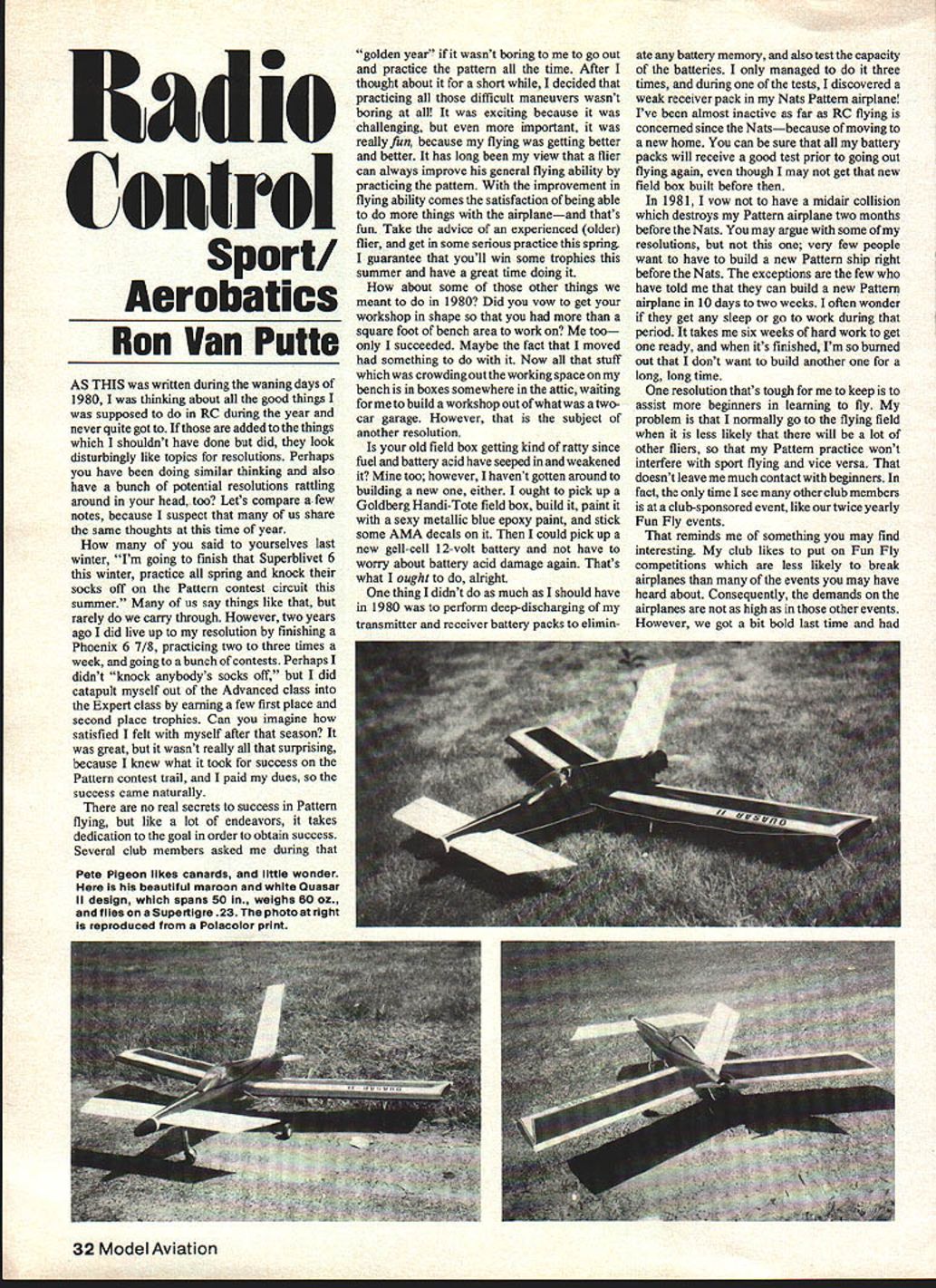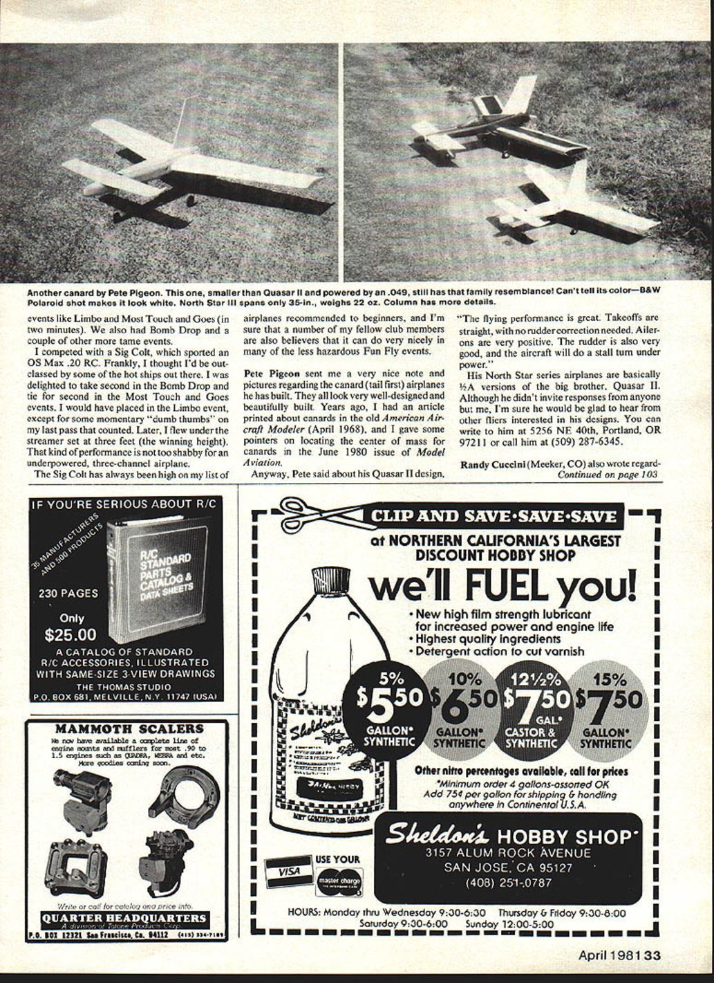 Sport Aerobatics Ron Van Putte AS THIS written during waning days 1980 thinking about good things supposed RC during year never quite got added things shouldnt have done did look disturbingly like topics resolutions Perhaps have doing similar thinking also have bunch potential resolutions rattling around head too Lets compare few notes because suspect us share same thoughts time year said yourselves last winter Im going finish Superblivet 6 winter practice spring knock socks off Pattern contest circuit summer us say things like rarely carry through However two years ago did live up resolution finishing Phoenix 6 7/8 practicing two three times week goingto bunch contests Perhaps didnt knock anybodys socks off did catapult myself out Advanced class Expert class earning few first place second place trophies Can imagine satisfied felt myself after season great wasnt really surprising because knew what took success Pattern contest trail paid dues success came naturally no real secrets success Pattern flying like lot endeavors takes dedication goal order obtain success Several club members asked during golden year wasnt boring to go out practice pattern time After thought about short decided practicing difficult maneuvers wasnt boring exciting because challenging important really fin because flying getting better better has long view flier can always improve general flying ability practicing pattern improvement flying ability comes satisfaction being able things airplaneand thats fun Take advice experienced older flier get some serious practice spring guarantee youll win some trophies summer have great time doing about some other things meant 1980 Did vow get workshop shape square foot bench area work too succeeded Maybe fact moved something Now stuff crowding out working space bench boxes somewhere attic waiting build workshop out what twocar garage However subject another resolution old field box getting kind ratty since fuel battery acid have seeped weakened Mine too however havent gotten around building new either ought pick up Goldberg Handi-Tote field box build paint sexy metallic blue epoxy paint stick some AMA decals could pick up new gell-cell 12-volt battery have worry about battery acid damage again Thats what ought alright thing didnt much should have 1980 perform deep-discharging transmitter receiver battery packs elimin ate battery memory also test capacity batteries managed three times during tests discovered weak receiver pack Nats Pattern airplane Ive almost inactive far RC flying concerned since Natsbecause moving new home can sure battery packs will receive good test prior going out flying again though may get new field box built before 1981 vow have midair collision destroys Pattern airplane two months before Nats may argue some resolutions very few people want have build new Pattern ship right before Nats exceptions few have told can build new Pattern airplane 10 days two weeks often wonder get sleep go work during period takes six weeks hard work get ready its finished Im burned out dont want build another long long time resolution thats tough keep assist beginners learning fly problem normally go flying field less likely will lot other fliers Pattern practice wont interfere sport flying vice versa doesnt leave much contact beginners fact time see other club members club-sponsored event like twice yearly Fun Fly events reminds something may find interesting club likes put Fun Fly competitions less likely break airplanes events may have heard about Consequently demands airplanes high other events However got bit bold last time 32 Model Aviation Control Pete Pigeon likes canards little wonder beautiful maroon white Quasar II design spans 50 weighs 80 oz flies Supertlgre 23 photo right reproduced Polacolor print events like Limbo Most Touch Goes two minutes also Bomb Drop couple other tame events competed Sig Colt sported OS Max 20 RC Frankly thought Id out classed some hot ships Out delighted take second Bomb Drop tie second Most Touch Goes events would have placed Limbo event except some momentary dumb thumbs last pass counted Later flew under streamer set three feet winning height kind performance too shabby underpowered three-channel airplane Sig Colt has always high list airplanes recommended beginners Im sure number fellow club members also believers can very nicely less hazardous Fun Fly events Pete Pigeon sent very nice note pictures regarding canard tail first airplanes has built look very well-designed beautifully built Years ago article printed about canards old American Air craft Modeler April 1968 gave some pointers locating center mass canards June 1980 issue Model Aviation Anyway Pete said about Quasar II design flying performance great Takeoffs straight no rudder correction needed Ailer ons very positive rudder also very good aircraft will stall turn under power North Star series airplanes basically versions big brother Quasar II Although didnt invite responses anyone Im sure would glad hear other fliers interested designs can write him 5256 NE 40th Portland OR 97211 call him 509 287-6345 Randy Cuccini Meeker CO also wrote regardContinued page 103 NORTHERN CALIFORNIAS LARGESTN DISCOUNT HOBBY SHOPI I New high film strength lubricantU increased power engine lifeI well FUEL Highest qualily ingredients Deteraent action cut varnish iiI II II II II II II II II II II II IHOURS Monday thru Wednesday 9 30-6 30 Thursday & Friday 9 30-800I Linm rday 930-6 00Sunday 12 00-5 00J ~ April 1981 33 Another canard Pete Pigeon smaller Quasar II powered 49 still has family resemblance Canttell its colorB&W Polaroid shot makes look white North Star Ill spans 35-in weighs 22 oz Column has details MAMMOTH SCALERS nq have available en1ete line engine ents ard eufflers eust 90 15 engines such DPA I4A azd etc 142re gordies ite call catalog price Jo ni lu C i i PS 501 12321 Sam Frasclsca Ca 14112 ssass ately Part II will appear next month December written tem perature outside just over 