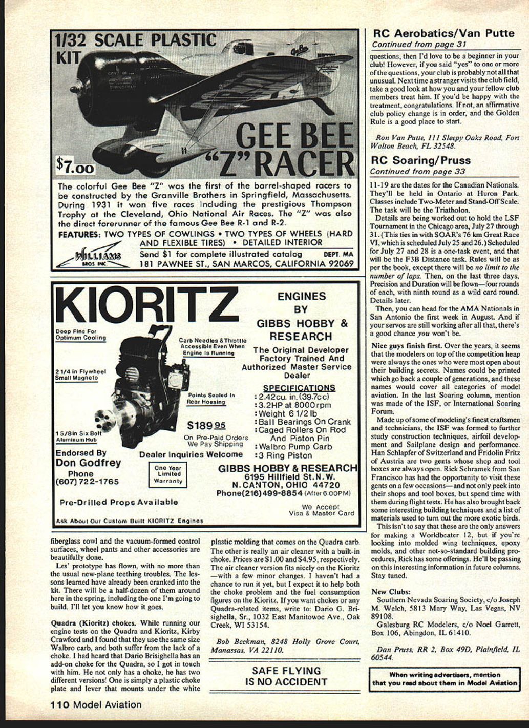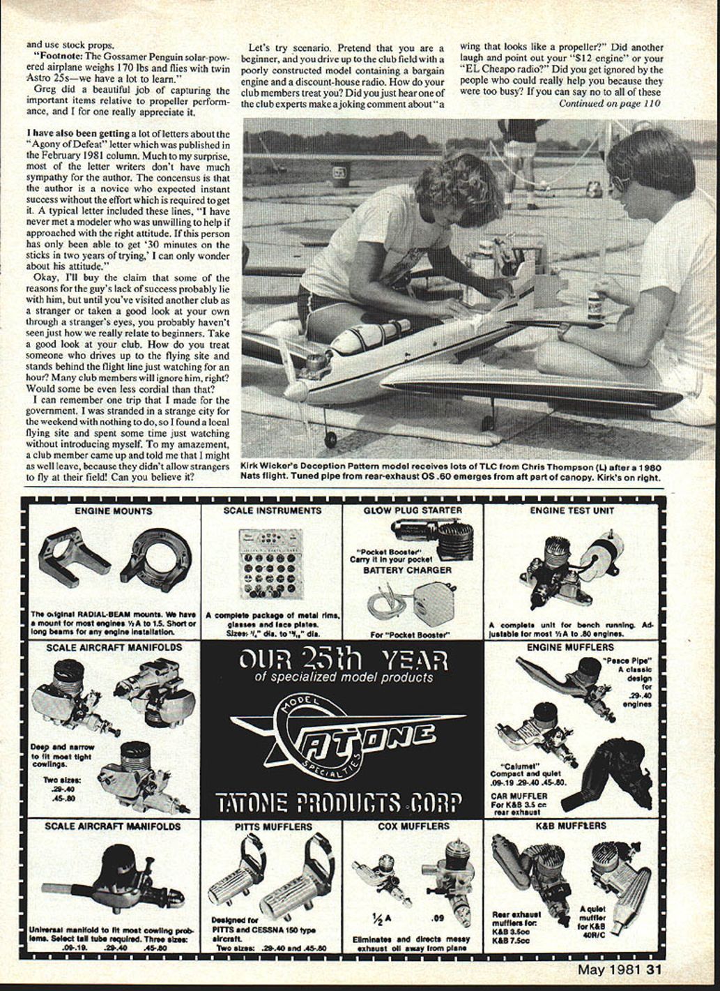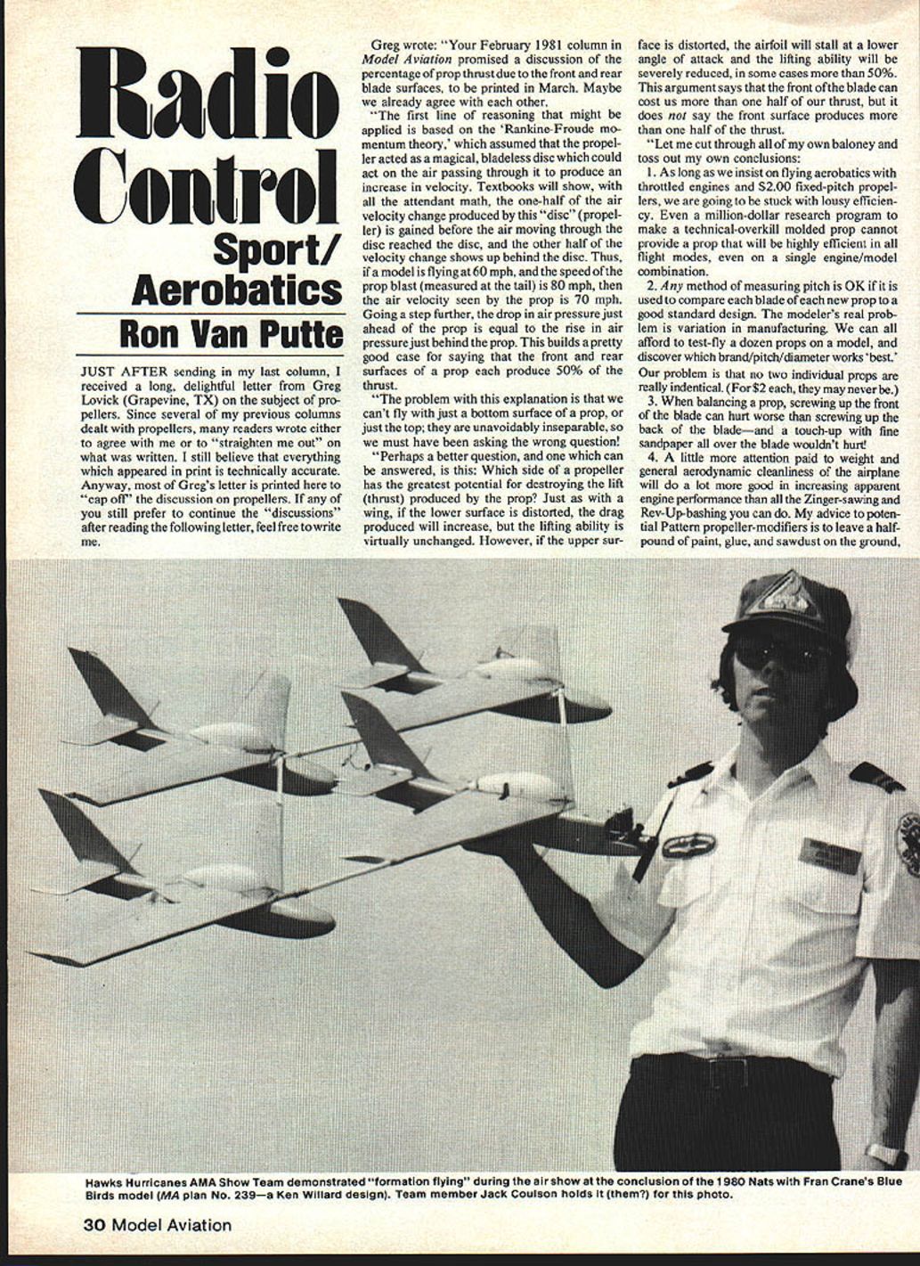 Radio C onE rot Sport Aerobatics Ron Van Putte JUST AFTER sending last column received long delightful letter Greg Lovick Grapevine TX subject pro pellers Since several previous columns dealt propellers readers wrote either agree straighten out what written still believe everything appeared print technically accurate Anyway Gregs letter printed cap off discussion propellers still prefer continue discussions after reading following letter feel free write Greg wrote February 1981 column Model Aviation promised discussion percentage prop thrust due front rear blade surfaces printed March Maybe already agree other first line reasoning might applied based Rankine-Froude mo mentum theory assumed propel ler acted magical bladeless disc could act air passing through produce increase velocity Textbooks will show attendant math one-half air velocity change produced disc propel ler gained before air moving through disc reached disc other half velocity change shows up behind disc Thus model flying 60mph speed prop blast measured tail 80 mph air velocity seen prop 70 mph Going step further drop air pressure just ahead prop equal rise air pressure just behind prop builds pretty good case saying front rear surfaces prop produce 50% thrust problem explanation cant fly just bottom surface prop just top unavoidably inseparable must have asking wrong question Perhaps better question can answered Which side propeller has greatest potential destroying lift thrust produced prop Just wing lower surface distorted drag produced will increase lifting ability virtually unchanged However upper sur face distorted airfoil will stall lower angle attack lifting ability will severely reduced some cases 50% argument says front ofthe blade can cost us half thrust does say front surface produces half thrust Let cut through own baloney toss out own conclusions 1 As long insist flying aerobatics throttled engines $200 fixed-pitch propel lers going stuck lousy efficien cy million-dollar research program make technical-overkill molded prop cannot provide prop will highly efficient flight modes single engine/model combination 2 Any method measuring pitch OK used compare blade new prop good standard design modelers real prob lem variation manufacturing can afford test-fly dozen props model discover brand/pitch/diameter works best problem no two individual props really indenticai $2 may never 3 balancing prop screwing up front blade can hurt worse screwing up back bladeand touch-up fine sandpaper over blade wouldnt hurt 4 little attention paid weight general aerodynamic cleanliness airplane will lot good increasing apparent englne performance Zinger-sawing Rev-Up-bashing can advice poten tial Pattern propeller-modifiers leave halfpound paint glue sawdust ground Hawks Birds muuu 30 Model Aviation Team demonstrated formation flying during air show conclusion 1980 Nats Fran Cranes Blue -a Ken Willard design Team member Jack Coulson holds photo have also getting lot letters about Agony Defeat letter published February 1981 column Much surprise letter writers dont have much sympathy author concensus author novice expected instant success effort required get typical letter included lines have never met modeler unwilling help approached right attitude person has able get 30 minutes sticks two years trying can wonder about attitude Okay Ill buy claim some reasons guys lack success probably lie him until youve visited another club stranger taken good look own through strangers eyes probably havent seen just really relate beginners Take good look club treat someone drives up flying site stands behind flight line just watching hour club members will ignore him right Would some less cordial can remember trip made govemment stranded strange city weekend nothing found local flying site spent some time just watching introducing myself amazement club member came up told might well leave because didnt allow strangers fly field Can believe — LOW PLUG TAOTA May1981 31 use stock props Lets try scenario Pretend wing looks like propeller Did another Footnote Gossamer Penguin solar-pow- beginner drive up club field laugh point out $12 engine ered airplane weighs 170 lbs flies twin poorly constructed model containing bargain EL Cheapo radio Did get ignored Astro 25 swe have lot learn engine discount-house radio people could really help because Greg did beautiful job capturing club members treat Did just hear too busy can say no important items relative propeller perform- club experts make ajoking comment about Continued page 110 ance really appreciate SCALE INSTRUMENTS ENGINE TEST UNIT Pocket Booster CarTy pocket BATTERY CHARGER complete package metal dma glasses taco platea SJzes L dia Kirk wickers Deception Pattern model receives lots ris Thompson L after 1980 Nats flight Tuned pipe rear-exhaust OS 60 emerges aft part canopy Kirks right Universal manifold fit cowling prob ieee Select tail tube required Three sizes OS.19.29-dll45.50 unit br bench running Ad br /A 80 gnomes ENGINE MUFFLERS Peace Pipe classic design 2840 engines PITTS Designed PITTS CESSNA 160 type alrcralt ua eI2ea 29-dll 45.60 l/2ASO Eliminates end directs messy exhaust oil awsy trom plane Rear exhaust muff lore fog K&B35cc KU 76cc KIORITZ Deep Fins Optimum Cooling 21/4 Flywheel Small Magneto 1 5/am Aluminum n Endorsed Don Godfrey Phone 607 722-1765 Pro-Drilled Props Available Ask About Custom Built KIORITZ Engines fiberglass cowl vacuum-formed control surfaces wheel pants other accessories beautifully done Les prototype has flown no usual new-plane teething troubles les sons learned have already cranked kit will half-dozen around spring including Im going build Ill let know goes Quadra Kioritz chokes running engine tests Quadra Kioritz Kirby Crawford found use same size Walbro carb both suffer lack choke heard Dario Brisighella has add-on choke Quadra got touch him has choke has two different versions simply plastic choke plate lever mounts under white Carb Needles &Throttle Accessi
