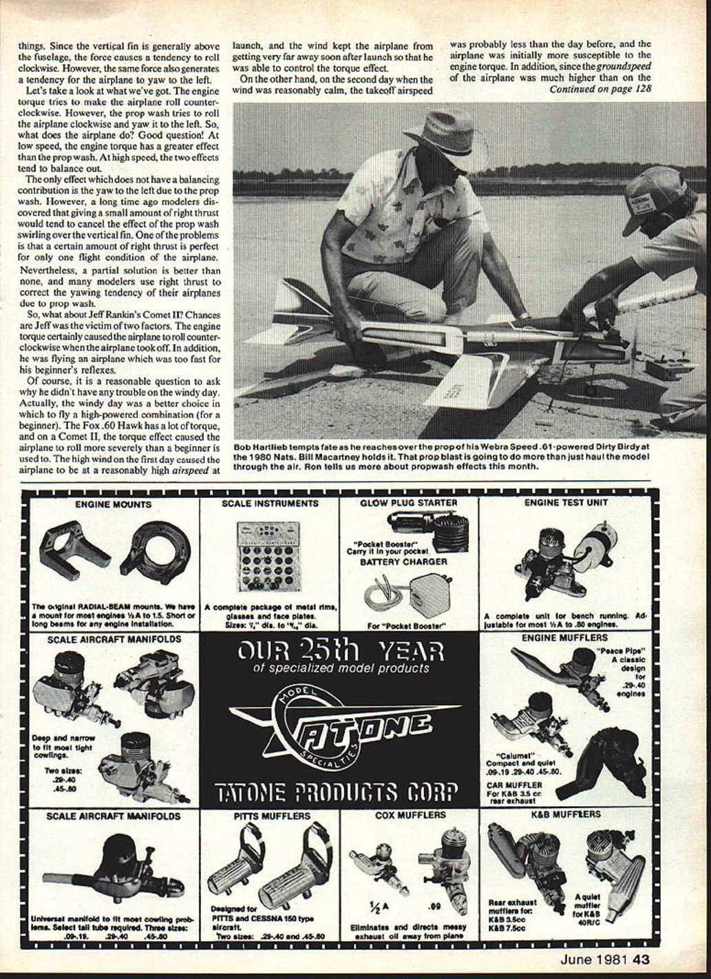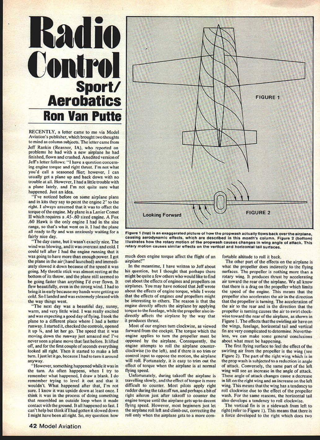 Control Sport Aerobatics Ron Van Putte RECENTLY letter came via Model Aviations publisher brought two thoughts mind column subjects letter came Jeff Rankin Reasnor IA reported problems new airplane finished flown crashed Anedited version JeWs letter follows have question concern ing engine torque right thrust Im what youd call seasoned flier however can usually get plane up back down no trouble However little trouble plane lately Im quite sure what happened Just idea Ive noticed before some airplane plans kits say point engine 20 right always assumed offset torque engine plane Lanier Comet II requires 45-60 sized engine Fox 60 Hawk engine size range thats what went plane ready fly anxiously waiting fairly nice day day came wasnt exactly nice wind blowing overcast cold could tell after engine running going have enough power got plane air hand launched immedi ately slowed down because speed going throttle stick almost resting bottom its throw plane still seemed going faster anything Id ever flown flew beautifully strong wind bring early because hands getting cold So landed extremely pleased way things went next day beautiful day sunny warm very little wind really excited expecting good day flying took plane different place better runway started checked controls opened up go speed moving down runway just amazed Ive never seen plane move fast before lifted off first couple seconds everything looked right started make left turn Ijust let go because turn around anyway However something happened turn As often happens try remember what happened draw blank remember trying level out wouldnt What happened after Im sure know upside down least once think process doing something resembled outside loop made contact ground happened fast cant help think gotten slowed down might have right So question much does engine torque affect flight airplane meantime have written Jeff about question thought perhaps might quite few others would like find out about effects engines propellers airplanes may have noticed Jeff wrote about effects engine torque wrote effects engines propellers might interesting others reason engine directly affects airplane applying torque fuselage propeller also directly affects airplane way produces thrust Most engines turn clockwise viewed forward cockpit torque engine applies turn propeller must opposed airplane Consequently engine attempts roll airplane counter clockwise left no trim control input oppose motion airplane will roll Fortunately easy trim Out effect torque airplane normal flying speed Unfortunately during takeoff airplane travelling slowly effect torque difficult counter Most pilots apply right rudder during takeoff run perhaps bit right aileron just after takeoff counter engine torque until airplane gets up decent flying speed However beginners just let airplane roll left climb out correcting roll airplane gets com fortable altitude roll back other part effects airplane what propeller does indirectly flying surfaces propeller nothing rotary wing produces thrust accelerating air toward rear airplane know drag propeller limits speed engine means propeller also accelerates air direction propeller turning acceleration air rear direction propeller turning causes air swirl clock wise toward rear airplane shown Figure 1 effects swirling air have wings fuselage horizontal tail vertical fin very complicated determine Neverthe less can make some general conclusions about what must happening first flying surface feel effect swirling air propeller wing see Figure 2 part right wing prop wash subjected reduction angie attack Conversely same part left wing will see increase angle attack angle attack changes cause decrease lift right wing increase left wing means wing has tendency roll clockwise due effect propeller wash same reasons horizontal tail also develops tendency roll clockwise vertical fin sidewash left right refer Figure 1 means force developed right does two 42 Model Aviation ooking Fo Figure 1 top exaggerated picture propwash actually flows back over airplane causing aerodynamic effects described months column Figure 2 bottom illustrates rotary motion propwash causes changes wing angle attack rotary motion causes similar effects vertical horizontal tail surfaces things Since vertical fin generally above fuselage force causes tendency roll clockwise However same force also generates tendency airplane yaw left Lets take look what weve got engine torque tries make airplane roll counter clockwise However prop wash tries roll airplane clockwise yaw left So what does airplane Good question low speed engine torque has greater effect prop wash high speed two effects tend balance out effect does have balancing contribution yaw left due prop wash However long time ago modelers dis covered giving small amount right thrust would tend cancel effect prop wash swirling over vertical fin problems certain amount right thrust perfect flight condition airplane Nevertheless partial solution better modelers use right thrust correct yawing tendency airplanes due prop wash So what about Jeff Rankins Comet II Chances Jeff victim two factors engine torque certainly caused airplane roll counter clockwise airplane took off addition flying airplane too fast beginners reflexes course reasonable question ask didnt have trouble windy day Actually windy day better choice fly high-powered combination beginner Fox 60 Hawk has lot torque Comet II torque effect caused airplane roll severely beginner used high wind first day caused airplane reasonably high airspeed urnrn_____________________________ ENGINE MOUNTS original RADIAL-BEAM mounts mount lot engines 15 Short long beams tot engine installatIon 4ASS Eliminates directs messy exhaust oil away piene June 1981 43 probably less day before airplane initially susceptible engine torque addition since groundspeed airplane much higher Continued page 128 launch wind kept airplane getting very far away soon after launch able control torque effect other hand second 