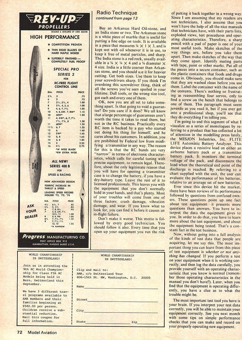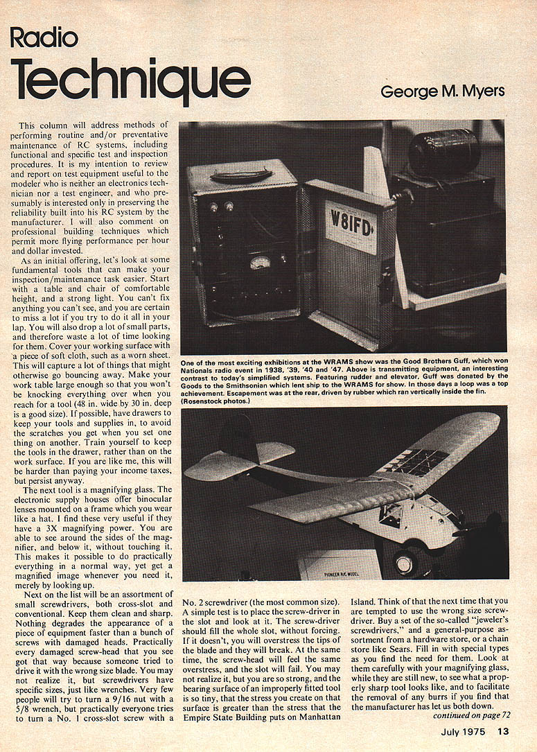 Radio Technique George M Myers column will address methods performing routine and/or preventative maintenance RC systems including functional specific test inspection procedures intention review report test equipment useful modeler neither electronics tech nician nor test engineer pre sumably interested preserving reliability built RC system manufacturer will also comment professional building techniques permit flying performance per hour dollar invested As initial offering lets look some fundamental tools can make inspection/maintenance task easier Start table chair comfortable height strong light cant fix anything cant see certain miss lot try lap will also drop lot small parts therefore waste lot time looking Cover working surface piece soft cloth such worn sheet will capture lot things might otherwise go bouncing away Make work table large enough wont knocking everything over reach tool 48 wide 30 deep good size possible have drawers keep tools supplies avoid scratches get set thing another Train yourself keep tools drawer rather work surface like will harder paying income taxes persist anyway next tool magnifying glass electronic supply houses offer binocular lenses mounted frame wear like hat find very useful have 3X magnifying power able see around sides mag nifier below touching makes possible practically everything normal way yet get magnified image whenever need merely looking up Next list will assortment small screwdrivers both cross-slot conventional Keep clean sharp Nothing degrades appearance piece equipment faster bunch screws damaged heads Practically damaged screw-head see got way because someone tried drive wrong size blade may realize screwdrivers have specific sizes just like wrenches Very few people will try turn 9/16 nut 5/8 wrench practically everyone tries turn No 1 cross-slot screw No 2 screwdriver common size simple test place screw-driver slot look screw-driver should fill whole slot forcing doesnt will overstress tips blade will break same time screw-head will feel same overstress slot will fail may realize strong bearing surface improperly fitted tool tiny stress create surface greater stress Empire State Building puts Manhattan Island Think next time tempted use wrong size screw driver Buy set so-called jewelers screwdrivers general-purpose sortment hardware store chain store like Sears Fill special types find need Look carefully magnifying glass still new see what prop erly sharp tool looks like facilitate removal burrs find manufacturer has let us both down continued page 72 July1975 13 exciting exhibitions WRAMS show Good Brothers Guff won Nationals radio event 1938 39 40 47 Above transmitting equipment interesting contrast todays simplified systems Featuring rudder elevator Guff donated Goods Smithsonian lent ship WRAMS show days loop top achievement Escapement rear driven rubber ran vertically inside fin IRwianmtnck nhotns1 * THIN RIGID BLADES OF HARD MAPLE WOOD * SUPERBLY FINISHED COMPLETELY FUEL PROOF SPECIAL PRO SERIES 2 FOR RC-FREE FLIGHT CONTROL LINE DIAPITCH 5%3 63 723%4 B3%456 94677 104 66W 7 8W 106EW* 1145W677/ 7/ 7% B 116EW 11%67 126 125W* 1356 1456 155 164% *W WIDE BLADE EW EXTRA WIDE ALL NEW SERIES 400 B FOR SPEED & RACING NEW ADVANCED DESIGN TERRIFIC INCREASE IN THRUST & SPEED LEADING SPEED RECORD HOLDER 72 73 74 DIAPITCHPRICE 4%6% 785 4%5 5% 85 6788%95 7566N7% 10 899N105 8%77%7%125 977/,7% 121325 N NARROW WORLD CHAMPIONSHIP IN SWITZERLAND Join us attending 9th RC World Champion ship Class P3A RC Models being held Bern Switzerland September have 3 different trav el programs available AMA members families beginning $58200 per person Children receive sub stantial reduction Mail coupon full information PRICE 75 75 100 100 105 115 120 130 135 135 140 45 165 185 225 275 I Radio Technique continued page 13 Buy Arkansas Hard Oil-stone India stone two Arkansas stone 15 white piece marble useful putting fine edge tools available piece measures /4 X X 3 kept wet oil whenever use keep free metal particles sharp India stone red rock usually avail able m /4 X /4 diameter X 4 size India little coarser Arkan sas stone should uje heavier cutting Get both sizes Use keep screwdrivers sharp think Im overdoing screwdriver thing think screws youve seen spoiled lifetime Dull tools wrong size tool got OK now set take some thing apart going void guaran tee care does know large percentage guarantees arent worth time takes read RC business Practically RC item backed guy started out doing thing himself cares about customers addition prohibited Federal law modi fying transmitter way reason RC bands very narrow terms electronic character istics calls careful tuning precise equipment remain legal fore about legitimate reason will have opening transmitter case change battery have dry-battery type Leave rest licensed professionals leaves equipment dont normally hold hands thats plenty Most troubles will come three factors crash damage vibration damage wear know what look can find before causes in-flight failure Dont make worse motto fol lowed good technician should follow also time open up equipment run risk WORLD CHAMPIONSHIP TM SWITZERLAND Clip mail AMA Switzerland Tour 80615th St NW Washington DC 20005 Name Street City State Zip putting back together wrong way Since am assuming readers technicians also assume wont have help nice manuals technicians have parts lists exploded views test procedures oper ating characteristics Therefore sharp pencil pad paper useful tools Make sketches way things before take apart make sketches way come apart Identify mating parts tape paint other marks Put pieces secure container such plastic containers foods drugs come Obviously should make sure washed clean before use Label container name contents Theres nothing frustrat ing reassembling four servos find screw bench belongs paragraph must seem juvenile read ever get professional shop youll see everything Im telling Im going end segment what visualize series monologues re ferring product h