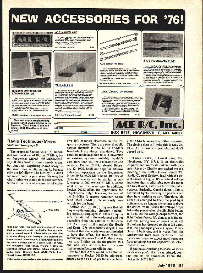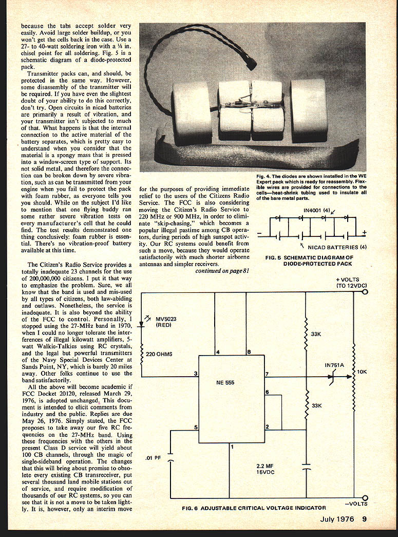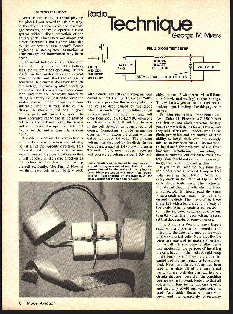 Batteries Diodes WHILE HELPING friend pick up pieces moved ask him day 3-wire servos low-volt age receivers would operate radio system diode protection battery pack answer simple direct Because dont know what size use install Before beginning step-by-step instructibn little background information may order nicad battery single-point failure item system battery fails system stops operating Batter ies fail two modes Open no current flows through Short no voltage generated current does flow through battery driven other operating batteries Short circuits com mon frequently caused letting battery lie unattended over winter season spends con siderable time 0 volts state dis charge short-circuited cell battery pack will cause system show decreased range shorted cell airborne pack servos will run slower An open cell acts just like switch turns system oW diode device conducts cur rent freely direction ideally opposite direction makes ideal purposes because can connect across battery will conduct same direction battery fear discharging cell accidently See Fig 1 Now shunt cell battery pack Radio Technique George M Myers 9 FIG 1 DIODESHUNTED BATTERY FIG 2 DIODE TEST SETUP BATTERY PACK 100HMSV 10 WATT4- RESISTORVOLTMETER INSTALL DIODES HERE FOR TEST U diode cell can develop open circuit turning system off price service voltage drop caused diode conducting fully-charged airborne pack output voltage will drop about 56 42 VDC cell develops short will drop zero cell develops open circuit course Connecting diode across open cell will restore circuit output about 34 volts missing voltage absorbed diode worst case pack 44 volts will drop 25 volts Now modern receivers will operate voltages around 30 reli ably 3-wire servos will still func tion slowly weakly voltage will allow least chance making good landing after things go sour Pro-Line Electronics 10632 North 21st Ave Suite 11 Phoenix AZ 85029 first use diode-protected battery packs commercially far know still offer Readers desire diode protection unsure ability install own strongly advised buy such packs want blamed problems arising incorrect installations Connecting diode backwards will discharge bat tery should notice problem right away because diode will get hot still buy some sili con diodes rated at least 1 amp 50 volts such 1N4001 Next test diode setup Fig 2 Test diode both ways voltmeter should read about 52 volts no diode connected should read same diode connected card diode diode marked band around body diode diode connected icated voltage should less 08 volts higher voltage seen set diode aside some other use Fig 3 shows World Engines Expert pack diode string assembled fitted groove formed walls cylindrical cells Note flexible wires provided make connections cells done allow some free motion purpose installing cells back pack rigid setup might break Fig 4 shows diodes stalled pack ready reassem bled Note shrink tubing has used insulate bare metal parts Failure can lead short circuits worse condition trying avoid Note also soldering done tabs cells 60/40 rosin-core solder used Acid solder fluxes will ruin pack completely unnecessary 8 Model Aviation Fg 3 World Engines Export battery pack diode string assembled fitted groove formed walls cylindrical cells Diode protection will prevent open cell shutting off system least can get ship safely down because tabs accept solder very easily Avoid large solder buildup wont get cells back case Use 27- 40-watt soldering iron 1/t chisel point soldering Fig 5 schematic diagram diode-protected pack Transmitter packs can should protected same way However some disassembly transmitter will required have slightest doubt ability correctly dont try Open circuits nicad batteries primarily result vibration transmitter isnt subjected much What happens internal connection active material battery separates pretty easy understand consider material spongy mass pressed window-screen type support Its solid metal therefore connec tion can broken down severe vibra tion such can transmitted engine fail protect pack foam rubber everyone tells you should subject Id like mention flying buddy ran some rather severe vibration tests manufacturers cell could find test results demonstrated thing conclusively foam rubber essen tial Theres no vibration-proof battery available time Citizens Radio Service provides totally inadequate 23 channels use 200000000 citizens put way emphasize problem Sure know band used mis-used types citizens both law-abiding outlaws Nonetheless service inadequate also beyond ability FCC control Personally stopped using 27-MHz band 1970 could no longer tolerate inter ferences illegal kilowatt amplifiers 5watt Walkie-Talkies using RC crystals legal powerful transmitters Navy Special Devices Center Sands Point NY barely 20 miles away Other folks continue use band satisfactorily above will become academic FCC Docket 20120 released March 29 1976 adopted unchanged docu ment intended elicit comments industry public Replies due May 26 1976 Simply stated FCC proposes take away five RC fre quencies 27-MHz band Using frequencles others present Class D service will yield about 100 CR channels through magic single-sideband operation changes will bring about promise obso lete existing CR transreceiver put several thousand land mobile stations out service require modification thousands RC systems can see move taken light ly however interim move purposes providing immediate relief users Citizens Radio Service FCC also considering moving Citizens Radio Service 220 MHz 900 MHz order elimi nate skip-chasing becomes popular illegal pastime among CR opera tors during periods high sunspot activ ity RC systems could benefit such move because would operate satisfactorily much shorter airborne antennas simpler receivers continued page 8 r MV5023 RED 220 OHMS 3 V 01 PF 4 1N4001 4L2vr4 NICAD BATTERIES 4 FIG 5 SCHEMATIC DIAGRAM OF DIODE-PROTECTED PACK S 1 7 6 211 22 MF 15VDC S TO 12VDC 0 33K 1N751 K p10K 0 VOLTS July1976 9 Fig 4 diodes show