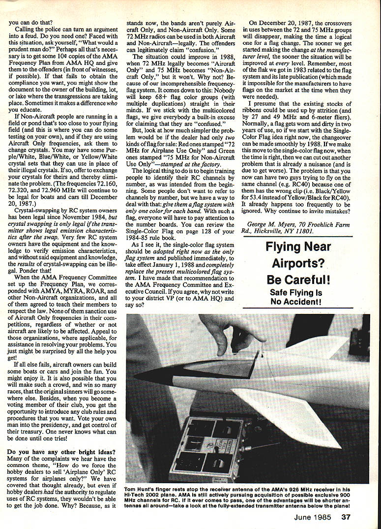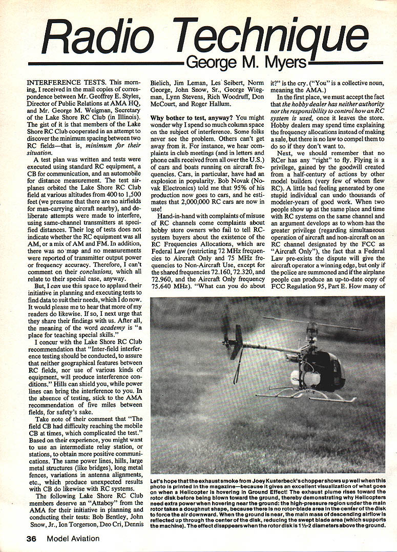 Radio Technique George M Myers INTERFERENCE TESTS morn ing received mail copies corres pondence between Mr Geoffiey E Styles Director Public Relations AMA HQ Mr George M Weigman Secretaiy Lake Shore RC Club Illinois gist members Lake Shore RC Club cooperated attempt discover minimum spacing between two RC fieldsthat minimum situation test plan written tests executed using standard RC equipment CR communication automobile distance measurement test air planes orbited Lake Shore RC Club field various altitudes 400 1500 feet presume no airfields man-carrying aircraft nearby de liberate attempts made interfere using same-channel transmitters speci fied distances log tests does indicate whether RC equipment AM mix AM FM addition no map no measurements reported transmitter output power frequency accuracy Therefore cant comment conclusions relate special case anyway can use space applaud initiative planning executing tests find data suit needs now would please hear readers likewise next urge share findings us After meaning word academy place teaching special skills concur Lake Shore RC Club recommendation Inter-field interfer ence testing should conducted assure neither geographical features between RC fields nor use various kinds equipment will produce interference con ditions Hills can shield power lines can bring interference absence testing stick AMA recommendation five miles between fields safetys sake Take note comment field CR difficulty reaching mobile CR times complicated test Based experience might want use intermediate relay station stations obtain positive communi cations same power lines hills large metal structures like bridges long metal fences variations antenna alignments etc produce unexpected results CR likewise RC systems following Lake Shore RC Club members deserve Attaboy AMA initiative planning conducting tests Bob Bentley John Snow Jr Ion Torgerson Deo Cri Dennis Bielich Jim Leman Les Seibert Norm George John Snow Sr George Wieg man Lynn Stevens Rich Woodruff Don McCourt Roger Hallum bother test anyway might wonder spend much column space subject interference Some folks never see problem Others cant get away instance hear com plaints club meetings letters phone calls received over US cars boats running aircraft fre quencies Cars particular have explosion popularity Bob Novak No vak Electronics told 95% production now goes cars esti mates 2000000 RC cars now use Hand-in-hand complaints misuse RC channels come complaints about hobby store owners fail tell RC system buyers about existence RC Frequencies Allocations Federal Law restricting 72 MHz frequen cies Aircraft Only 75 MHz fre quencies Non-Aircraft Use except shared frequencies 7216072320 72960 Aircraft Only frequency 75640 MHz What can about cry collective noun meaning AMA first place must accept fact hobby dealer has neither authority nor responsibility control anRC system used once leaves store Hobby dealers may spend time explaining frequency allocations instead making sale no law compel dont want Next should remember no RCer has right fly Flying privilege gained goodwill created half-century actions other model builders very few flew RC little bad feeling generated stupid individual can undo thousands modeler-years good work two people show up same place time RC systems same channel argument develops has greater privilege regarding simultaneous operation aircraft non-aircraft RC channel designated FCC Aircraft Only fact Federal Law pre-exists dispute will give aircraft operator winning edge police summoned airplane people can produce up-to-date copy FCC Regulation 95 Part E 36 Model Aviation Lets hopethatthe exhaust smoke Jocy Kusterbeckschoppershows up well whenthis photo printed magazinebecause gives excellent visualization what goes Helicopter hovering Ground Effecti exhaust plume rises toward rotor disk before being blown toward ground thereby demonstrating Helicopters need extra power hovering near ground high-pressure region uriderthe main rotor takes doughnut shape because no rotor-blade area centerof disk force air downward ground near main mass descending airflow reflected up through center disk reducing swept biade area supports machine effect disappears rotordiak isi -2 diametersabove ground can Calling police can turn argument feud need Faced situation ask yourself What would prudent man Perhaps thats neces saryis get some l0 copies AMA Frequency Plan AMA HQ give offenders front witnesses possible fails obtain compliance want might show document owner building lot lake transgressions taking place Sometimes makes difference educate Non-Airctuft people running field pond thats too close flying field can some testing own using Aircraft Only frequencies ask change crystals may have some Pur ple/White Blue/White Yellow/White crystal sets can use place illegal crystals offer exchange crystals thereby elimi nate problem frequencies 72160 72320 72960 MHz will continue legal boats cars till December 20 1987 Crystal-swapping RC system owners has legal since November 1984 crystal swapping legal f trans mitter shows legal emission characteris tics after swap Very few RC system owners have equipment know ledge verifr emission characteristics said equipment knowledge results crystal-swapping can ille gal Ponder AMA Frequency Committee set up Frequency Plan corres ponded AMYA MYRA ROAR other Non-Aircraft organizations agreed teach members respect law None sanction use Aircraft Only frequencies com petitions regardless whether aircraft likely affected Appeal organizations applicable assistance resolving problems just might surprised help get else fails aircraft owners can build some boats cars join fun might enjoy also possible will make such crowd win races original sinners will go some else Besides become voting member club get opportunity introduce club rules procedures want Vote own man presidency get control treasury never knows what can done until tries have other bright ideas complaints hear have common theme f