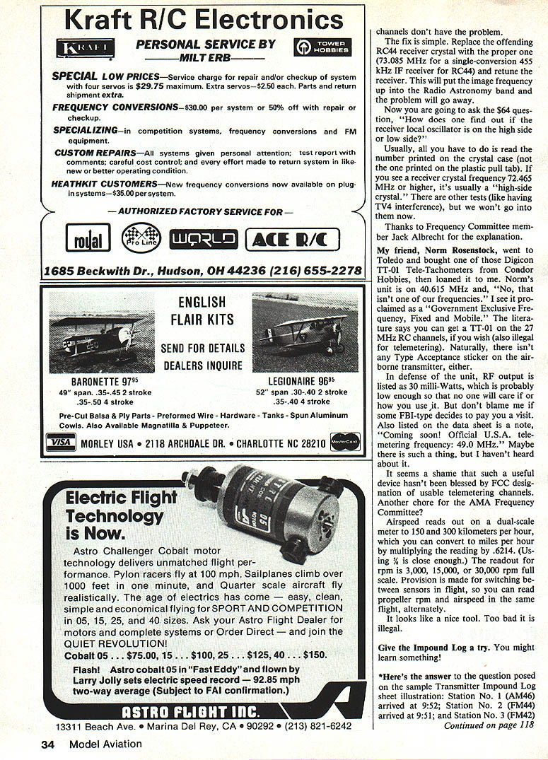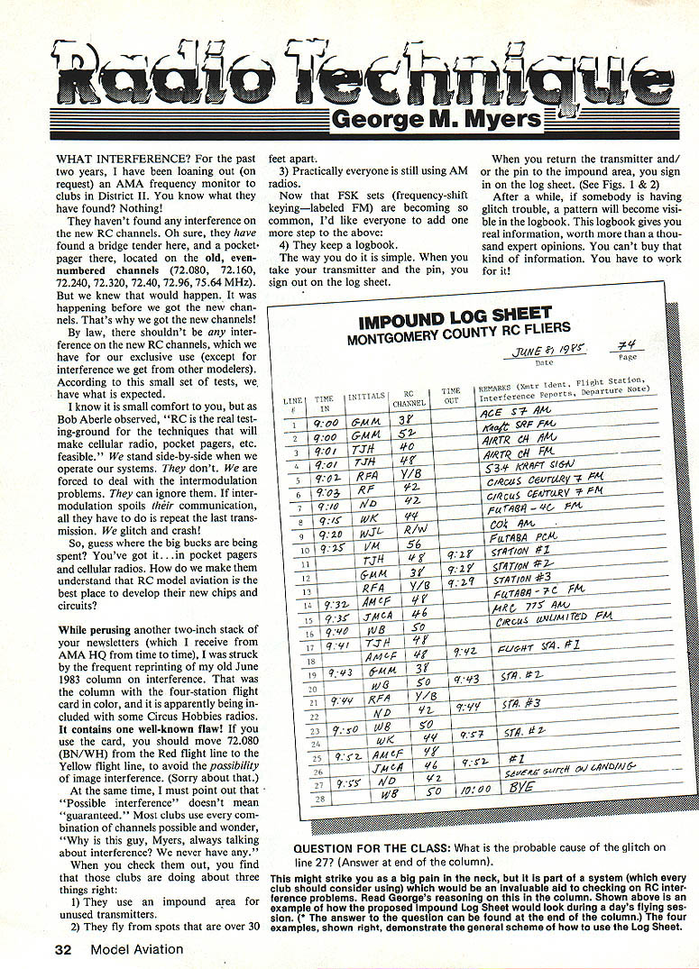 George M Myers 4=== WHAT INTERFERENCE past two years have loaning out request AMA frequency monitor clubs District II know what have found Nothing havent found interference new RC channels Oh sure have found bridge tender pocket pager located old evennumbered channels 72080 72160 72240 72320 7240 7296 7564 MHz knew would happen happening before got new chan nels Thats got new channels law shouldnt inter ference new RC channels have exclusive use except interference get other modelers According small set tests have what expected know small comfort Bob Aberle observed RC real test ing-ground techniques will make cellular radio pocket pagers etc feasible stand side-by-side operate systems dont forced deal intermodulation problems can ignore intermodulation spoils thir communication have repeat last trans mission glitch crash So guess big bucks being spent Youve got it. pocket pagers cellular radios make understand RC model aviation is- best place develop new chips circuits perusing another two-inch stack newsletters receive AMA HQ time time struck frequent reprinting old June 1983 column interference column four-station flight card color apparently being cluded some Circus Hobbies radios contains well-known flaw use card should move 72080 BN/WH Red flight line Yellow flight line avoid possibility image interference Sorry about same time must point out Possible interference doesnt mean guaranteed Most clubs use com bination channels possible wonder guy Myers always talking about interference never have any~ check out find clubs doing about three things right 1 use impound area unused transmitters 2 fly spots over 30 feet apart 3 Practically everyone still using AM radios Now FSK sets frequency-shift keyinglabeled FM becoming common Id like everyone add step above 4 They keep logbook way simple take transmitter pin sign out log sheet return transmitter pin impound area sign log sheet See Figs 1 & 2 After somebody having glitch trouble pattern will become visi ble logbook logbook gives real information worth thou sand expert opinions cant buy kind information have work IMPOUND LOG SHEET MONTGOMERY COUNTY RC FLIERS Page JqN rture Mote LIMETIMERCTIMEXTntt Ident Flight Station INITIALSREMARKS 902-&FY/BcQcaS CevrtU c/a CL cAIr6LV sq&WA4 920wfp/w/itLr4BA PCAt 10q2VM56 rjl4gqzr-PoN #Z 126-MMg92 # 13R4 y/r392-9 SlAT/ON #3 14932-AMCF 4 rFL s93IAICA A*6__ 4RC 77 iM 16 q46 kV8 0 C/RcU- ILNUMITD M 17 Q9-i4/1 ___________ 18AMF 4191 VG-i#l sfZ 2 MM 3i ___________________ 21 %99 pq y/13______________________ 2292-9/f4#3 23s0 __________________ 259z- q44/Z/__________________ 279SML24/i6arcW ci} &AM/4628W809oS -______________ TION FOR THE CLASS What probable cause glitch line 27 Answer end column might strike big pain neck part system club should consider using would invaluable aid checking RC inter ference problems Read Georges reasoning column Shown above example proposed Impound Log Sheet would look during days flying ses sion * answer question can found end column four examples shown right demonstrate general scheme use Log Sheet 32 Model Aviation Several people have written questioning advice turn receiver before transmitter idea course use receiver monitor chan nel intend use reply readers Eugene Babin 1106 Maplewood Dr Normal IL 61761 follows friends advise Turn trans mitter First because trying save charge flight battery pack prevent damage receiver servos turn receiver see no response walk off forget someone else may later turn something like electric fuel pump will drive servos beyond tolerable limits damage have alert possibility Remember turn receiver Off turn transmitter before damage done other hand system quiet should forget left transmitter may interfere someone else thats common form interference turn receiver Procedure 1 Load Impound before transmitter find out someone else using RC channel before take off perhaps find out air must know what look fact servos arent mov ing doesnt mean no using channel other fellow might have forgotten left transmitter turned also might flying Sailplane thing grab rudder try move someone channel servo will fight no servo will move easily difference knowing what look Bear mind poor arrangement servo leads can bring short ground range can make servos move around no else affecting should rearrange com ponents until such problems go away airborne system should absolute ly quiet transmitter turned off assuming RF-free environ ment isnt quiet find out fix Otherwise will flying along someday receiver will enter null area start doing its own TIMEINITIALSRCTIMEREMARKS INCHANNELOUT JI/ 6-4A AH3rilC& 5ILU7- AA Identify transmitter Procedure 2when log Sign out take pin & transmitter TIMEINITIALSRCTIMEREMARKS INCHANNELOUT 6HPAAM 31120STAT/OAf 3 Identify flight station Procedure 3if club uses Sign return pin & transmitter TIMEINITIALSRCTIMEREMARKS IN /Iqo ci 1-1 P-I Atl3ITCb OL LLOUT~ Interference reports Procedure 4 Sign out leaving field & taking transmitter thing will immediately complain about interferencebut nobody will able find because will carrying around inside fuselage model can TV4 interfere RC44 Some people want know some RC receiv ers have problem others dont answer simple enough interference caused image fre quency transmitter Any transmitter located 455 kHz away receiver s local oscillator image transmitter assuming conventional single-conver sion superhetrodyne receiver FCC gave us RC chan nels specified law transmitter frequency Choice local oscillator frequency receiver left up RC system designer Normally RC system designer chos es 72 MHz receiver crystal its frequency 455 kHz above its trans mitter puts image frequency 455 kHz above receiver 73-74 MHz band very few transmitters designer choses RC44 receiver crystal 72175 MHz 455 kHz below transmitter crystal image falls 71720 MHz puts image location band assigned TV4 real troublemaker TV4 sound FM found around 71700 thru 71800 MHz case RC44 RC46 interference prac tically guaranteed particularly RC system 