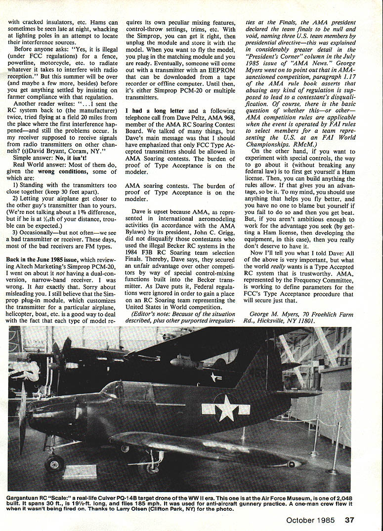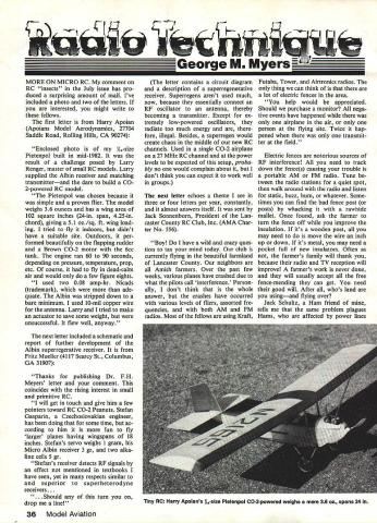 ~~George M Myers-— MORE ON MICRO RC comment RC insects July issue has pro duced surprising amount mail Ive included photo two letters interested might write fellows first letter Harry Apoian Apoians Model Aerodynamics 27704 Saddle Road Rolling Hills CA 90274 Enclosed photo A4-size Pietenpol built mid-1982 result challenge posed Larry Renger master small RC models Larry supplied Albin receiver matching transmitterand dare build CO 2-powered RC model Pietenpol chosen because simple proven flier model weighs 36 ounces has wing area 102 square inches 24-in span 425-in chord giving 51 oz/sq ft wing load ing tried fly indoors didnt have suitable site Outdoors per formed beautifully flapping rudder Brown CO-2 motor 6cc tank engine ran 60 90 seconds depending pressure temperature prop etc course fly dead-calm alr would few figure eights used two 008 amp-hr Nicads trademark ade quate Albin stripped down bare minimum used lO-mil copper wire antenna Larry tried make actuator save some weight unsuccessful flew well anyway~ next letter included schematic report further development Albin superregerative receiver Fritz Mueller 4117 Searcy St Columbus GA 31907 Thanks publishing Dr FH Meyers letter comment coincides rising interest small primitive RC will get touch give him few pointers toward RC CO-2 Peanuts Stefan Gasparin Czechoslovakian engineer has doing some time ac cording him fun fly larger planes having wingspans 18 inches Stefans servo weighs 1 gram Micro Albin receiver 3 gr two alka line cells 5 gr Stefans receiver detects RF signals effect mentioned textbooks have seen yet respects similar superior superheterodyne receivers. .. Should turn drop line letter contalns circuit diagram description superregenerative receiver Superregens arent used much now because essentially connect RF oscillator antenna thereby becoming transmitter Except ex tremely low-powered oscillators radiate too much energy fore illegal Besides superregen would create chaos middle new RC channels Used single CO-2 airplane 27 MHz RC channel power levels expected setup proba bly no would complain about dont think can expect work well groups next letter echoes theme see three four letters per year constantly almost answers itself sent Jack Sonnenborn President Lan caster County RC Club Inc AMA Char ter No 556 Boy have wild crazy ques tion tax mind today club currently flying beautiful farmland Lancaster County neighbors Amish farmers Over past few weeks various planes have crashed due what pilots call interference Person ally dont think whole answer crashes have occurred various levels fliers assorted fre quencies both AM FM radios Most fellows using Kraft Futaba Tower Airtronics radios thing can think lot electric fences area help would appreciated Should purchase monitor nega tive events have happened airplane air person flying site Twice hap pened transmit ter field Electric fences notorious sources RF interference need track down fences causing trouble portable AM FM radio Tune tween radio stations quiet spot walk around radio listen static buzz hum whatever Some times can find bad fence post posts whacking rawhide mallet Once found ask farmer turn fence off improve insulation its wooden post may need move wire inch up down its metal may need pocket full new insulators Often farmers family will thank because radio TV reception will improve farmers work never done will usually accept free fence-mending can get need good will After whos land usingand flying over Jack Schultz Ham friend tells same problem plagues Hams affected power lines 36 Model Aviation Tiny RC Harry Apolans %4slze Pletenpol CO2powered weighs mere 36 OL spans 24 cracked insulators etc Hams can sometimes seen late night whacking lighting poles attempt locate interference sources Before anyone asks Yes illegal under FCC regulations fence powerline motorcycle etc radiate whatever takes interfere radio reception summer will over maybe few besides before get anything settled insisting farmer compliance regulation Another reader writes . 1 sent RC system back manufacturer twice tried flying field 20 miles place first interference hap penedand still problems occur receiver supposed receive signals radio transmitters other chan nels sDavid Bryant Coram NY Simple answer No isnt Real World answer Most given wrong conditions some 1 Standing transmitters too close together keep 30 feet apart 2 Letting airplane get closer other guys transmitter yours talking about 1 o difference Y0th distance trou ble can expected 3 Occasionallybut oftenwe see bad transmitter receiver days bad receivers FM types Back June 1985 issue review ing Altech Marketings Simprop PCM-20 went about having dual-con version narrow-band receiver wrong has exactly Sorry about misleading still believe Sim prop plug-in module customizes transmitter particular airplane helicopter boat etc good way deal fact type modd re quires its own peculiar mixing features control-throw settings trims etc Simprop can get right unplug module store model want fly model plug matching module ready Eventually someone will come out transmitter EEPROM can downloaded tape recorder offline computer Until its either Simprop PCM-20 multiple transmitters long letter following telephone call Dave Peltz AMA 968 member AMA RC Soaring Contest Board talked things Dave s main message should have emphasized FCC Type Ac cepted transmitters should allowed AMA Soaring contests burden proof Type Acceptance modeler AMA soaring contests burden proof Type Acceptance modeler Dave upset because AMA repre sented international aeromodeling activities accordance AMA Bylaws its president John C Grigg did disqualify contestants used illegal Becker RC systems 1984 F3B RC Soaring team selection Finals Thereby Dave says secured unfair advantage over other competi tors way special control-mixing functions built Becker trans mitter As Dave puts Federal regula tions ignored order gain place RC Soaring team representing United States World competition Edi