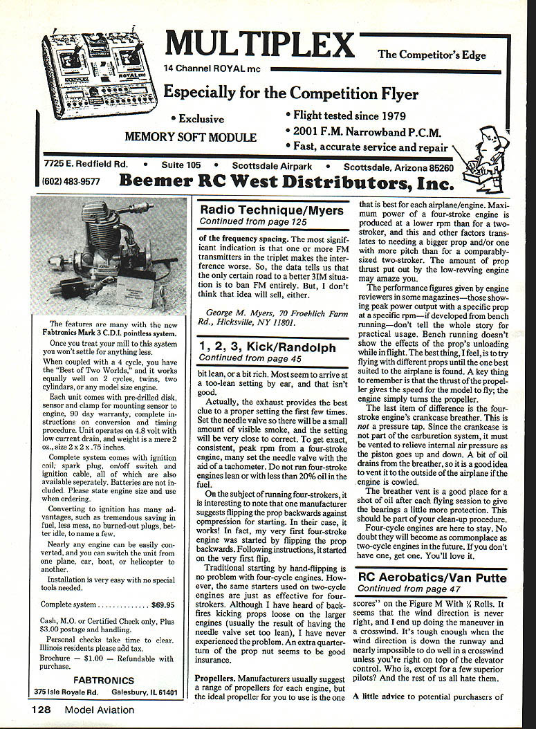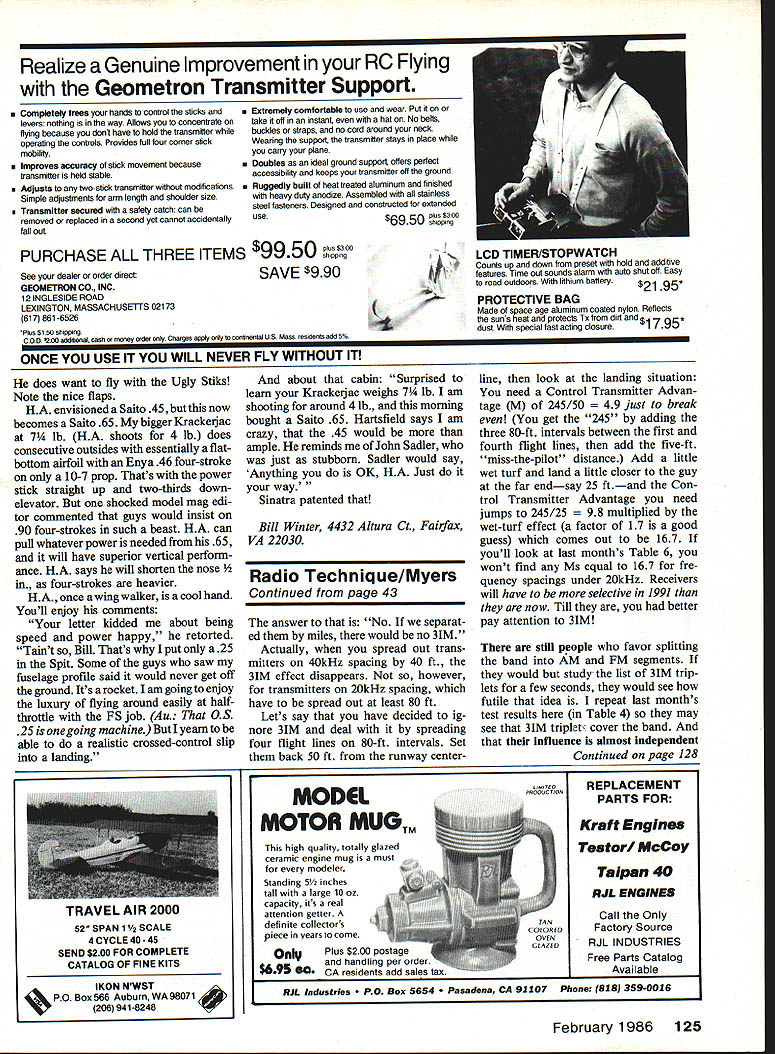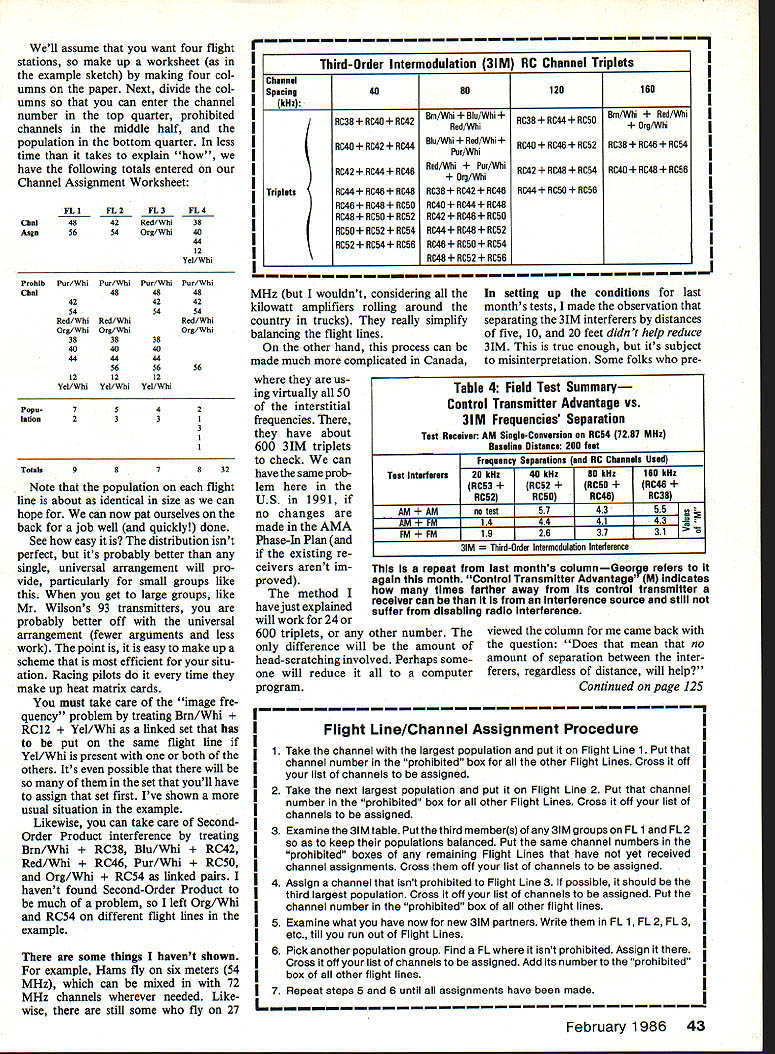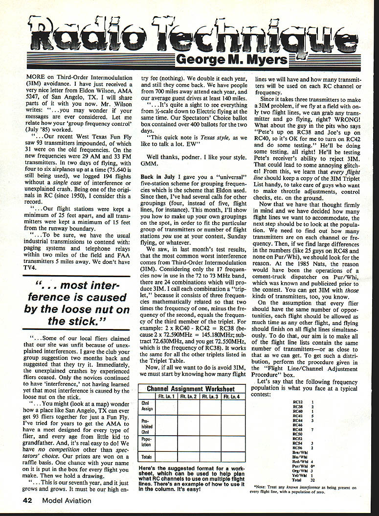 GeorgeMMyers MORE Third-Order Intermodulation 31M avoidance have just received yery nice letter Eldon Wilson AMA 5247 San Angelo TX will share parts now Mr Wilson writes .. wonder messages ever considered Let relate group frequency control July 85 worked . recent West Texas Fun Fly saw 93 transmitters impounded 31 old frequencies new frequencies 29 AM 33 FM transmitters two days flying four six airplanes up time 75640 still being used logged 194 flights single case interference unexplained crash Being origi nals RC since 1950 consider record .. ht stations kept minimum 25 feet apart trans mitters kept minimum 15 feet runway boundary sure have usual industrial transmissions contend paging systems telephone relays within two miles field FAA transmitters 5 miles away dont have TV4 interference caused loose nut stick . Some local fliers claimed site unfit because unex plained interferences gave club group suggestion two months back suggested try Immediately unexplained crashes experienced fliers ceased Only novices continued have interference having learned yet interference caused loose nut stick .. t look map wonder place like San Angelo TX can ever get 93 fliers together just Fun Fly Ive tried years get AMA have meet designed type flier age little kid grandfather its real easy have no competition other spec tators choice prizes won raffle basis chance name put box flight make hold drawing . seventh year just grows grows must high entry fee nothing double year still come back have people 700 miles away attend year average guest drives least 140 miles .. Its quite sight see everything A-scale down Electric flying same time Spectators Choice ballot box contained over 400 ballots two days quick note Texas style like talk lot EW Well thanks podner like style GMM Back July gave universal five-station scheme grouping frequen cies scheme Eldon used Since Ive several calls other groupings four instead five flight lines instance month Ill show make up own groupings spot order fit particular group transmitters number flight stations use contest Sunday flying whatever saw last months test results common worst interference comes Third-Order Intermodulation 3IM Considering 17 frequen cies now use 72 73 MHz band 24 combinations will pro duce 31M call combination trip let because consists three frequen cies mathematically related two times frequency minus fre quency second equals frequen cy third member triplet example 2 x RC40 RC42 cause 2 x 72590MHz 80MHz sub tract 72630MHz get 72550MHz frequency RC38 works same other triplets listed Triplet Table Now want avoid 31M must start knowing flight Channel Assinnment Worksheet FItLn1 FItLn2 FItLn3 FItLn4 ChnI Assign Pro hibited Chat Popu lation Totals lines will have transmit ters will used RC channel frequency Since takes three transmitters make 31M problem fly field ly two flight lines can grab trans mitter go flying right WRONG What about guy pits says Petes up RC38 Joes up RC4O its OK turn RC42 some testing Hell doing some testing right Hell testing Petes receivers ability reject 31M could lead some annoying glitch es learn flight line should keep copy 31M Triplet List handy take care guys want make throttle adjustments control checks etc ground Now have thought firmly mind have decided flight lines want accommodate next step should look popula tion need find out transmitters channel fre quency find large differences numbers like 25 guys RC48 Pur/ Whi should look reason 1985 Nats reason would have operations cement-truck dispatcher Pur/ Whi known publicized prior contest can get 3IM kinds transmitters too know assumption flier should have same number oppor tunities flight should allowed much time other flight flying should finish flight lines simultane ously aim make flight line lists contain same number transmittersor close can get get such distri bution perform procedure given Flight Line/Channel Adjustment Procedure box Lets say following frequency population what face typical contest RclZ1 11C38S RC4OI RC425 RC443 RC46 1C487 RC5O RC5Z RC543 RC562 Drn/Whl Dlu/Whl Red/Whi4 Pur/Whi O Org/Whl 3 Yel/ Whi 1 Total32 Heres suggested format work sheet can used help plan what RC channels use multiple flight lines Theres example use Note Treat known interference being present column Its easylevery flight line population zero 42 Model Aviation Well assume want four flight stations make up worksheet example sketch making four col umns paper Next divide col umns can enter channel number top quarter prohibited channels middle half population bottom quarter less time takes explain have following totals entered Channel Assignment Worksheet FLIFL2FL3 Chul 48 42 Red/whi Asga 56 54 Org/whi FL 4 38 40 44 12 Yel/whi ProhibPur/whiPur/whiPur/whipur/whi ChnI 242 434 ed/whiRed/whiRed/whi Org WhiOrg/whiOrg/whi 38 40 44 5636 2 YeI/whiYeI/whiYeI/whi Popu-7542 tattoo2331 Totals987832 Note population flight line about identical size can hope can now pat ourselves back job well quickly done See easy distribution isnt perfect its probably better single universal arrangement will pro vide particularly small groups like get large groups like Mr Wilsons 93 transmitters probably better off universal arrangement fewer arguments less work point easy make up scheme efficient situ ation Racing pilots time make up heat matrix cards must take care image fre quency problem treating Brn/Whi Whi linked set has put same flight line Yel/ Whi present both others Its possible will set youll have assign set first Ive shown usual situation example Likewise can take care SecondOrder Product interference treating Brn/Whi Blu/Whi Red Whi Pur/Whi Org/Whi linked pairs havent found Second-Order Product much problem left Org/Whi RC54 different flight lines example some things havent shown example Hams fly six meters 54 MHz can mixed 72 MHz channels wherever needed Like wise still some fly 27 Third-Order Intermodulation 3lM RC Channel Triplets Channel Spicing4030120160 kHz RC3B Bm/Whi Whi Brn/Whi Whi Red/Whi Or