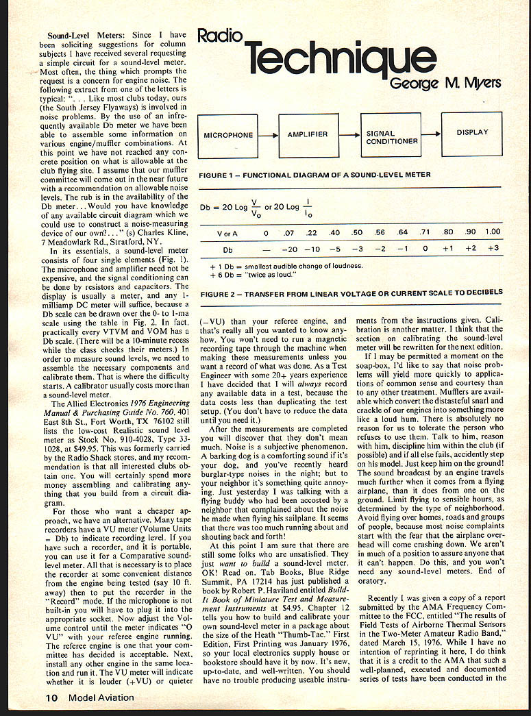 Sound-Level Meters Since have soliciting suggestions column subjects have received several requesting simple circuit sound-level meter Most often thing prompts request concern engine noise following extract letters typical ke clubs today South Jersey Flyaways involved noise problems use infre quently available Db meter have able assemble some information various engine/muffler combinations point have reached con crete position what allowable club flying site assume muffler committee will come out near future recommendation allowable noise levels rub availability Db meter. Would have knowledge available circuit diagram could use construct noise-measuring device own9 Charles Kline 7 Meadowlark Rd Stratford NY its essentials sound-level meter consists four single elements Fig 1 microphone amplifier need expensive signal conditioning can done resistors capacitors display usually meter 1milliamp DC meter will suffice because Db scale can drawn over 0- 1-ma scale using table Fig 2 fact practically VTVM VOM has Db scale will 10-minute recess class checks meters order measure sound levels need assemble necessary components calibrate difficulty starts calibrator usually costs sound-level meter Allied Electronics 1976 Engineering Manual & Purchasing Guide No 760 401 East 8th St Fort Worth TX 76102 still lists low-cost Realistic sound level meter Stock No 910-4028 Type 331028 $4995 formerly carried Radio Shack stores recom mendation interested clubs ob tain will certainly spend money assembling calibrating thing build circuit dia gram want cheaper ap proach have alternative tape recorders have VU meter Volume Units Db indicate recording level have such recorder portable can use Comparative soundlevel meter necessary place recorder some convenient distance engine being tested say 10 ft away put recorder Record mode microphone built-in will have plug appropriate socket Now adjust Vol ume control until meter indicates 0 VU referee engine running referee engine com mittee has decided acceptable Next install other engine same loca tion run VU meter will indicate whether louder VU quieter Geoige Myers MICROPHONEAMPLIFIERSIGNALDISPLAY CONDITIONER FIGURE 1 TIONAL DIAGRAM OF SOUND-LEVEL METER V Db og 20 Log V0 VorA007 22 40 50 56 64 7180 90 100 Db 20 10 5 3 2 1012 3 1 Db lest audible change loudness 6 Db e loud FIGURE 2 SFER FROM LINEAR VOLTAGE OR CURRENT SCALE TO DECIBELS VU referee engine thats really wanted know wont need run magnetic recording tape through machine making measurements unless want record what done As Test Engineer some 20 years experience have decided will always record available data test because data costs less duplicating test setup dont have reduce data until need After measurements completed will discover dont mean much Noise subjective phenomenon barking dog comforting sound its dog youve recently heard burglar-type noises night neighbor its something quite annoy ing Just yesterday talking flying buddy accosted neighbor complained about noise made flying sailplane seems too much running about shouting back forth point am sure still some folks unsatisfied just want build sound-level meter OK Read Tab Books Blue Ridge Summit PA 17214 has just published book Robert P Haviland entitled Build Book Miniature Test Measure ment Instruments $495 Chapter 12 tells build calibrate own sound-level meter package about size Heath Thumb-Tac First Edition First Printing January 1976 local electronics supply house bookstore should have now Its new up-to-date well-written should have no trouble producing useable instru ments instructions given Cali bration another matter think section calibrating sound-level meter will rewritten next edition may permitted moment soap-box Id like say noise prob lems will yield quickly applica tions common sense courtesy other treatment Mufflers avail able convert distasteful snarl crackle engines something like loud hum absolutely no reason us tolerate person refuses use Talk him reason him discipline him within club possible else fails accidently step model Just keep him ground sound broadcast engine travels much further comes flying airplane does ground Limit flying sensible hours determined type neighborhood Avoid flying over homes roads groups people because noise complaints start fear airplane over head will come crashing down arent much position assure anyone cant happen wont need sound-level meters End oratory Recently given copy report submitted AMA Frequency Com mittee FCC entitled results Field Tests Airborne Thermal Sensors Two-Meter Amateur Radio Band dated March 15 1976 have no intention reprinting think credit AMA such well-planned executed documented series tests have conducted 10 Model Aviation name AMA may recognize some participants names have abstracted acknowledge ments W Tynan W3KMV J Colson W3TMZ W Good W3NPS J Strong WN3YJA J Hamblen W3TZ D Clark W3YSC D Goughnour W3RVX D Frey K3AAX R Robin son WA3YEE R Givens T Holder R McNeil Apparently FCC requested report after exhibiting some concern effect RF transmissions Thermal Sensors carried RC sailplanes Briefly tests examined effects Thermal Sensor emissions upon signals 2-meter repeater stations both put output upon signals Oscar 7 satellite upon other amateur signals general conclusion arent Perhaps test results some bearing recent FCC order permits unlicensed operation 100 milliwatt-or-less telemetering units 49-MHz band should expand use Thermal Sensors among non-Ham society sailplaners have never used airborne thermal sensor may understand what does Figs 3 4 give picture miniature radio broadcasting some selectable fre quency between 144 148 MHz mounted sailplane within sealed air container container has calibrated leak means thermistor can detect whether air flowing out container Air flows out con tainer sailplane enters warm moist less dense air typical rising thermal causes thermistor modify transmitter output such way receiver ground emits rising tone rising tone ng air opposite also true Mo