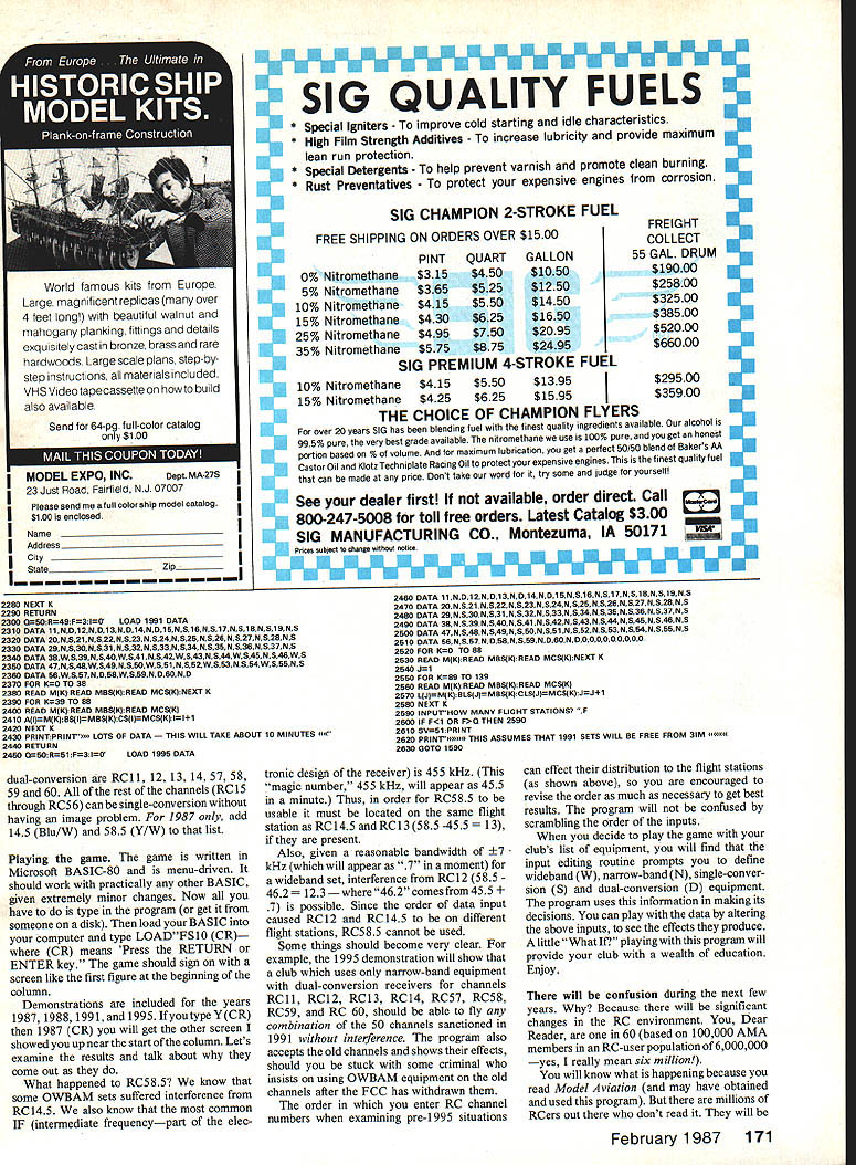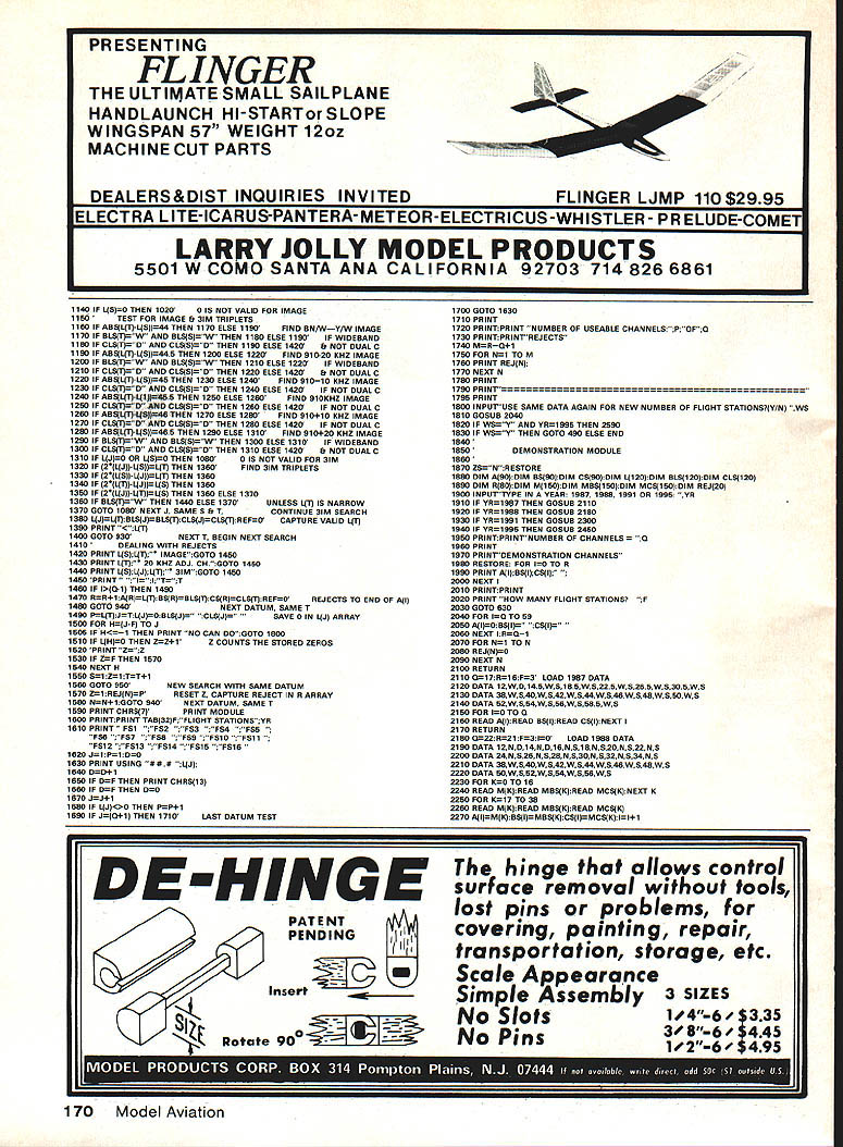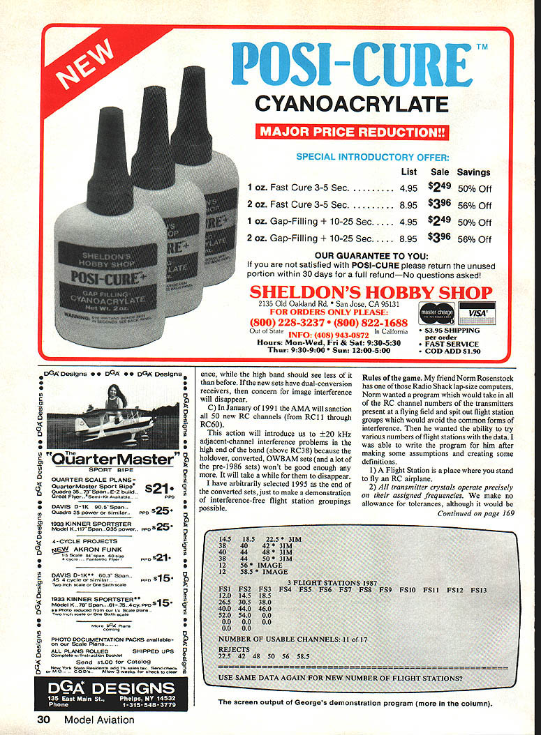 0 eorg eM Myer LITTLE GAME club meeting First Id better give some reference information As December 20 1987 FCC Federal Communications Commission mandates abandon 7208 7216 7224 7232 7240 7296 75640 MHz During 1987 will either convert old wideband AM OWB AM sets existing even-numbered high-bandwidth channels RC38RC56 will junk game going play can help make decision Note will convert old RC systems new 1988 low band channels As January 1 1988 AMA will sanction even-numbered RC channels RC 12 through RC58 less RC36 As explained last month intended narrow-band equzpment will used low RC 1 2RC 34 channels no restriction against using narrow-band equipment high band RC38RC58 alsoin fact recommend Asofianuary 11991 AMAwill sanction use channels RC 11 through RC6O 72 MHz band aircraft use unless something causes us change plans game can show get best use population RC systems owned/operated club well assist making What calculations during next 10 years convei ed under macI Mon d find mosquito AMA ma DEMO] YEAR So what effect will changes have During 1987 will mixing OWBAM sets narrow-band sets top RC band OWBAM sets will interfere everybody will suffer interferences have doing since 1983 situation wont worse Actually things should get little better somebody fixes up 25% transmitter population needs work B 1988 onward manufacturers will introducing narrow-band AM FM sets over full range RC channels narrowband sets should reduce interferences say reduce relative 1983-87 period low band below RC38 should rela tively free 31M adjacent-channel interfer Continued page 30 24 Model Aviation POSI-CURETM CYANQACRYLATE v y~e1 7 1 [SI 41 [1 SPECIA1 INTRODU RY OFFER List Sale 1 oz Fast Cure 3-5 Sec495 2 oz Fast Cure 3-5 Sec895 Savings 50% Off $396 56/o Off 1 oz Gap-Filling 5 Sec495 $29 50% Off 2 oz Gap-Filling 5 Sec895 $396 56% Off OUR GUARANTEE TO YOU satisfied POSI-CURE please return unused portion within 30 days full refundNo questions asked SHELDONS HOBBY SHOP 2135 Old Oakland Rd Jose CA 95131 FOR ORDERS ONLY PLEASEViSK 800 228-3237 800 822-1688 Out StateIn California $395 SHIPPING INFO 408 943-0872per order Hours Mon-Wed En & Sat 930-530 FAST SERVICE Thur 930-900 1200-500 COD ADD $190 DGA Designs . D0A 00 DGA Designs 0 0 0 Jt11 S 0 0 QUARTER SCALE PLANS-a c QuarterMaster Sport Bipe $21 Ouad-a 35. 73Span E Z butid Great Ftyer.sem let Aca lab PPD 0 DAVIS D-1K 905 Span s25n Orasdw 35 power o Sinitar. C 1933 KINNER SPORTETER ________ pps25e 3Modet K.117Span 035 power 4-CYCLE PROJECTS ON FUNK vs scare span bo siaeS 4 cycla. Fantastic Flyerppo s21 ________0 u DAVIS D-1K 603 Spat. 45 4cycleorsirtnlarpo s15C Twa Inch scale ar SlaSh cole 1933 KINNER SPORTSTER** oModel K.Th Span. Sl-75.4cy two sl5t o ** Phctc reduced tram Va Scala Plans. Twa Inch scale ar Seth scala 0 Mars ~Plans0 ccrning PHOTO DOCUMENTATION PACKS avaitable Scale Plane5 ALL PLANS ROLLEDSHIPPED OCanpletawlnntrcchcn BackletUPS Send hlOO Catalog Sate RanaSents add y%salestac. Send check ck ta clear S ence high band should see less before new sets have dual-conversion receivers concern image interference will disappear C January 1991 AMA will sanction 50 new RC channels Rd 1 through RC6O action will introduce us 20 kHz adjacent-channel interference problems high end band above RC38 because holdover converted OWBAM sets lot pre-1986 sets wont good enough will take disappear have arbitrarily selected 1995 end converted sets just make demonstration interference-free flight station groupings possible Rules game friend Norm Rosenstock has Radio Shack lap-size computers Norm wanted program would take RC channel numbers transmitters present flying field spit Out flight station groups would avoid common forms interference wanted ability try various numbers flight stations data able write program him after making some assumptions creating some definitions 1 Flight Station place stand fly RC airplane 2 transmitter crystals operate precisely assigned frequencies make no allowance tolerances although would Continued page 169 30 Model Aviation L screen output Georges demonstration program column Doc will also marketing some alloy motor mounts Fast FAI front hole 4-40 rear slotted universal applications can have holes drilled Cipolla Aircraft 4-40 nuts plastic locking collar must used Cost $950 per pair Another new item Dural Plates use Slow Combat models bolt side fuselage rigid mount power better needle settings still mount engines plywood may stiffen up front enough engine wont crunched through inboard side preferred method mounting engine profile model bolting hardwood bearer blind mounting nuts buried hardwood plywood covers up nuts inboard side ends just behind engine outboard side engine bearers should extend about quarter way back over wing locked wing structure done Fast FAI Extra-wide 5/8 wider hardwood recommended keeps engine sinking soft plywood blind mounting nuts doing same other side way Doe didnt list price dural stiffeners Before design monstrous nose Slow Combat model sure read profile fuselage definition AMA rule book find out local event directors interpret MACA After series very good MACA Newsletters edited Doe Passen seems have come lull action Newsletter sight months Dont write meI havent gotten either Doe Passen reports last three newsletters done time sent publisher over 300 active members would shame see MACA fade back oblivion past Ive en couraged everyone join MACA might hold onto $10 until problem resolved Current MACA members should get touch MACA district representative also con tact president Last minute tidbits include ABC piston/liner replacement set Fox 36 very high 21% silicone content should sell around $411 about alloy center section bellcrank mount alloy motor mounts Doc Passen will have latest details items lime magazine hits street Write him address listed earlier article Charlie Johnson 3716 Ingraham Sr San Di ego CA 92109 Radio Technique/Myers Continued page 30 simple add few lines programming accommodate tolerance desi
