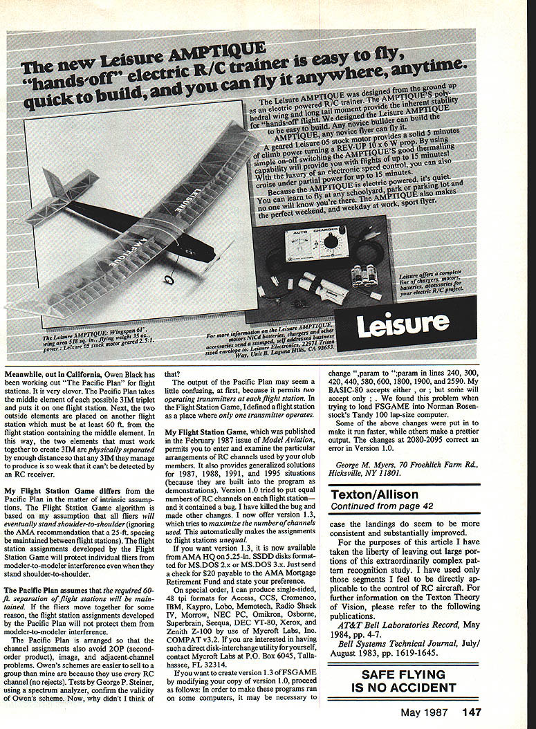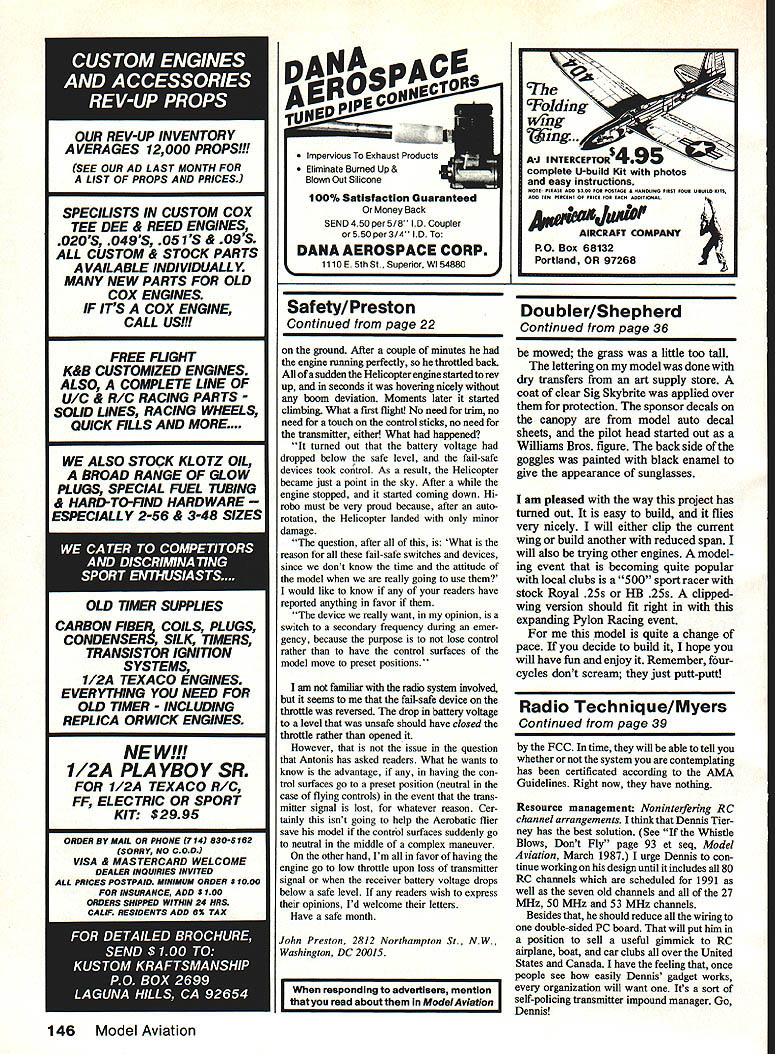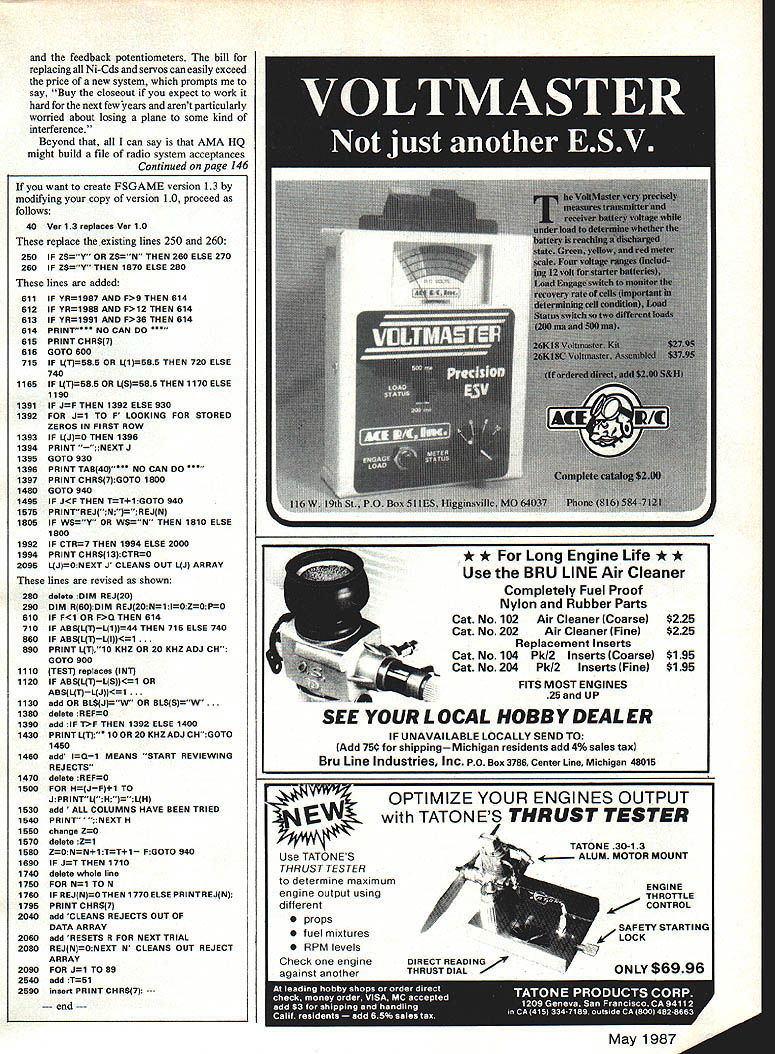 G eorg eM Myers WHAT new radio should buy half letters readers month have asked same question What RC system can buyright nowthat will usable 1991 beyond possible answer want general-purpose airplane-only RC sys tem buy Futaba Conquest PCM system channel RC 12 Now did pick particular system channel tests Aberle Myers Steiner have shown good low-to-medium-priced system includes narrow-band receiver well narrow-band transmitter provides usual functions including servo reversing plus good built-in failsafe RC 12 usable right now either wideband narrow-band equipment will continue usable narrow-band systems beyond 1991 assuming have either dual-conversion receiver single-conversion receiver its local oscillator 7 1575 MHz What should buy difficult question answer cant guess needs dont know whether want buy best-performing low-priced system lowest-priced system P maxl 1991 performance dont know cpnsidering cheap wideband system ant narrow-band system impressive assembly chrome-plated knobs levers Perhaps want Helicopter radio Helicopter radio provides control func tions beginner needs Sailplanes powered sport models can also fly Helicopter basic two-stick 4/5 /6-channel airplane sys tem like Conquest PCM mentioned mo ment ago isnt suitable Helicopter know Should recommend system uses interchangeable crystals doesnt need big servos because intend fly Quarter Scale need oversize batteries because way LSF level V lot factors consider choice comes down old-design wideband system can get low price because dealer clearing Out inventory versus new-design expensive narrowband system have think terms much use will put An old wideband system will still acceptable AMA RC competition RC 12 38 40 42444648 50 52 54 56 until January 1 1991 Depending whether FCC chooses modify Part 95 its regulations match AMA Guidelines may/may usable legal system after 1991 turns out wideband systems arent legal after 1991 may still possible replace receiver narrow-band receiver retrofit transmitter narrow-band RE module thereby making legal after 1991 Either way can count least four years useful service An RC system has worked hard four years should need extensive service Four years long time Ni-Cd battery pack average 100 charges per year Four years servo wear can easily beat up servo motors 38 Model Aviation Dian five 35 planes use anyone walk out na RC sure thin ng wise channel complywith ssriction number sal he/she onn turi nitter start Fit Sta BK/mN WH/O iO FIt Sta B BK/RED Fit Sta C 4 BK/OR BK/BLI 52 Fit Sta Fit Sta E GRN WH/BN* RC54 together ER PacIfIc separations si ca B BK/RED BK/YEL LU WH/RED WH/VIO RC1 2* RC4O RC44 RC5O gether RU ILl w U 0 xx-4 xx TWO PILOTSTWO PILO Pacific Pian fortwo fiight stations aiiows maximum four pianos air anytwo Fit Sta anytwofrom Fit Sta B itoan expanded up five fiight stationsbut 60-ft separation between fiight stations must observed feedback potentiometers bill replacing Ni-Cds servos can easily exceed price new system prompts say Buy closeout expect work hard next few years arent particularly worried about losing plane some kind interference Beyond can say AMA HQ might build file radio system acceptances Continued page 146 want create FSGAME version 13 modifying copy version 10 proceed follows 40 Var 13 replaces Ver 10 replace existing lines 250 260 250 IF Z$ V OR ZSN THEN 260 ELSE 270 260 IF ZSY THEN 1870 ELSE 280 lines added 611 IF YR1987 AND F9 THEN 614 612 IF YR1988 AND F12 THEN 614 613 IF YR1991 AND F36 THEN 614 614 PRINT NO CAN DO PRINT CHR$171 616 GOTO 600 715 IF LTI585 OR L1585 THEN 720 ELSE 740 1165 IF LT58SOR LSl585 THEN 1170 ELSE 1190 1391 IF JF THEN 1392 ELSE 930 1392 FOR J1 TO F LOOKING FOR STORED ZEROS IN FIRST ROW 1393 IF LJI0 THEN 1396 1394 PRINT":NEXTJ 1395 GOTO 930 1396 PRINT TAB40 CAN DO PRINT CHRS71GOTO 1800 1480 GOTO 940 1495 IF JF THEN TT1GOTO 940 1575 PRINTREJNlREJNI 1805 IF WSY OR WS N THEN 1810 ELSE 1800 1992 IF CTR7 THEN 1994 ELSE 2000 1994 PRINT CHRS131CTRO 2095 LJ0N EXT J CLEANS OUT LJI ARRAY lines revised shown 280 delete DIM REJ201 290 DIM R601DIM REJ20N1 I0Z0P0 610 IF F1 OR FQ THEN 614 710 IF ABSLTIL1l44 THEN 715 ELSE 740 860 IF ABSLTLI)1 . 890 PRINT LTI10 KHZ OR 20 KHZ ADJ CH GOTO 900 1110 TEST replaces INTl 1120 IF ABSLTLSII1 OR AESLTILIJII1 . 1130 add OR BLSJ1W OR BL$lSW 1380 delete REFO 1390 add IF TF THEN 1392 ELSE 1400 1430 PRINTL4T 100R2OKHZADJCHGOTO 1450 1460 add 101 MEANS START REVIEWING REJECTS 1470 delete REFO 1500 FOR HJFI1 TO JPRINTLH1LH 1530 add COLUMNS HAVE BEEN TRIED 1540 PRINT:NEXTH 1550 change Z0 1570 delete Z1 1580 Z0NN1TT1 FGOTO 940 1690 IFJTTHEN 1710 1740 delete whole line 1750 FOR N1 TO N 1760 IF REJNOTHEN 1770 ELSE PRINTREJINI 1795 PRINT CHR$7 2040 add CLEANS REJECTS OUT OF DATA ARRAY 2060 add RESETS R FOR NEXT TRIAL 2080 REJN10NEXT N CLEANS OUT REJECT ARRAY 2090 FOR J1 TO 89 2540 add T51 2590 insert PRINT CHRSI7 - end * * Long Engine Life * * Use BRU LINE Air Cleaner Completely Fuel Proof Nylon Rubber Parts Cat No 102 Air Cleaner Coarse $225 Cat No 202Air Cleaner Fine$225 Replacement Inserts Cat No104 Pk/2 InsertsCoarse$195 Cat No204 Pk/2 Inserts Fine$195 FITS MOST ENGINES 25and UP SEE YOUR LOCAL HOBBYDEALER IF UNAVAILABLE LOCALLY SEND TO Add 75 shippingMichigan residents add 4% sales tax Bru Line Industries Inc PO Box 3786 Center Line Michigan 48015 WV OPTIMIZE YOUR ENGINES OUTPUT TATONES THRUST TESTER TATONE 30-13 Use TATON ES ALUM MOTOR MOUNT THRUST TESTER determine maximum engine outpul using different 0 props fuel mixtures RPM levels ENGINE i THROTTLE CONTROL SAFETY STARTING LOCK flhck engine DIRECT READING - orTHRUST DIAL 1987 SPECILISTS IN CUSTOM COX TEE DEE & REED ENGINES 020S 049S 05 IS & 09S ALL CUSTOM & STOCK PARTS VAILABLE INDIVIDUALLY MANY NEW PARTS FOR OLD COX ENGINES IF ITS COX ENGINE CALL US! FREE FUGHT K&B CUSTOMIZED ENGINES ALSO COMPLETE LINE OF U/C & R/C RACING PARTS SOLID UNES RACING WHEELS QUICK FILLS AND MORE.. WE ALSO STOCK KLOTZ OIL BROAD RANGE OF GLOW PLUGS SPECIAL FUEL TUBING & HARD-TO-FIND HARDWARE E