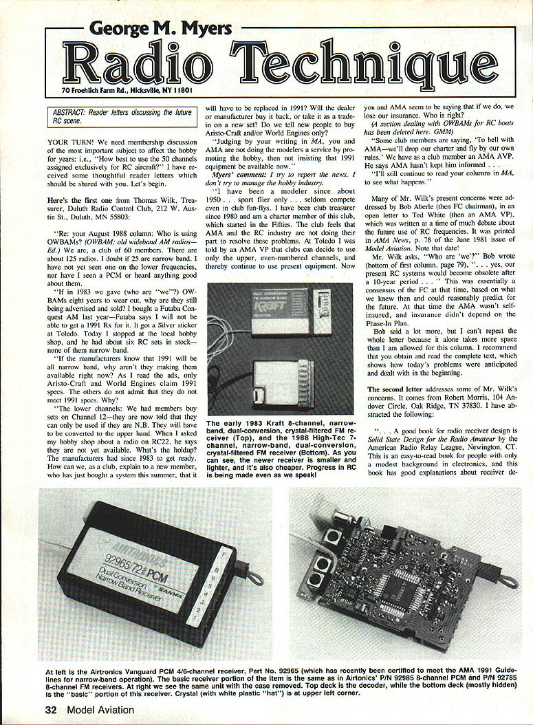 George M Mye D Radio Thchnique ABSTRACT Reader letters discussing future RC scene YOUR TURN need membership discussion important subject affect hobby years ie best use 50 channels assigned exclusively RC aircraft have re ceived some thoughtful reader letters should shared Lets begin Heres first Thomas Wilk Trea surer Duluth Radio Control Club 212 W Aus tin St Duluth MN 55803 Re August 1988 column using OWBAMs OWBAM old wideband AM radios Ed club 60 members about 125 radios doubt 25 narrow band have yet seen lower frequencies nor have seen PCM heard anything good about 1983 gave OW BAMs eight years wear Out still being advertised sold bought Futaba Con quest AM last yearFutaba says will able get 1991 Rx got Silver sticker Toledo Today stopped local hobby shop about six RC sets stock narrow band manufacturers know 1991 will narrow band arent maldng available right now As read ads Aristo-Craft World Engines claim 1991 specs others admit meet 1991 specs lower channels bad members buy sets Channel 12they now told can used NB will have converted upper band asked hobby shop about radio RC22 says yet available Whats holdup manufacturers since 1983 get ready can club explain new member has just bought system summer will have replaced 1991 Will dealer manufacturer buy back take tradein new set tell new people buy Aristo-Craft and/or World Engines Judging writing MA AMA doing modelers service pro moting hobby insisting 1991 equipment available now Myers comment oy report news dont try manage hobby industry have modeler since about 1950 ort flier ldom compete club fun-fl ys have club treasurer since 1980 am charter member club started Fifties club feels AMA RC industry doing part resolve problems Toledo told AMA VP clubs can decide use upper even-numbered channels thereby continue use present equipment Now AMA seem saying we lose insurance right section dealing OWBAMs RC boats has deleted GMM Some club members saying hell AMAwell drop charter fly own rules have club member AMA AVP says AMA hasnt kept him informed Ill still continue read columns MA see what happens Mr Wilks present concerns ad dressed Bob Aberle FC chairman open letter Ted White AMA VP written time much debate about future use RC frequencies printed AMA News p 78 June 1981 issue Model Aviation Note date Mr Wilk asks Bob wrote bottom first column page 79 s present RC systems would become obsolete after 10-year period essentially consensus FC time based what knew could reasonably predict future time AMA wasnt selfinsured insurance didnt depend Phase-In Plan Bob said lot cant repeat whole letter because alone takes space am allowed column recommend obtain read complete text shows todays problems anticipated dealt beginning second letter addresses some Mr Wilks concerns comes Robert Morris 104 An dover Circle Oak Ridge TN 37830 have ab stracted following good book radio receiver design Solid State Design Radio Amareur American Radio Relay League Newington CT easy-to-read book people modest background electronics book has good explanations about receiver de left Airtronics Vanguard PCM 416-channel receiver Part No 92965 has recently certified meet AMA 1991 Guide lines narrow-band operation basic receiver portion item same Airtonics PIN 92985 8-channel PCM P/N 92785 8-channel FM receivers right see same unit case removed Top deck decoder bottom deck mostly hidden basic portion receiver Crystal white plastic hat upper left corner 32 Model Aviation 70 Froehlkh Farm Rd Hkksville NY 11901 early 1983 Kraft 8-channel narrowband dual-conversion crystal-filtered FM re ceiver Top 1988 High-Tec 7channel narrow-band dual-conversion crystal-filtered FM receiver Bottom As can see newer receiver smaller lighter its also cheaper Progress RC being made speak sign Most problems have re ceivers solved about 15-20 years ago trick has make small cheap interesting note World En gines High-Tec receiver follows rule double-balanced mixer followed decent filterthat considered way go re ceivers seeing arent new designs rather redesigns think griping man ufacturers cost starting design scratch major techni cal challenge Myers comment response Robert Mar t-is last comment long expensive path between paper design properly func tioning production receivers Some may have forgotten Kraft produced 1991 receiver spring 1983 four times price three times volume todays 1991 receiv ers some todays receivers show better perfonnance third letter comes Robert W Ken nedy Safety Officer Meroke Radio Control Club Inc AMA charter 458 534 Benito St East Meadow NY 11554 Since articles new frequency re quirements have published change antenna flags has accomplished comply new [AMA rule book] require ments aspects actions have caused fliers aggravated refer ence minutes AMA Executive Coun cil meeting published February 1988 edi tion AM4 News p 110 bottom now ap pears requirements absolute Myers comment Im sure what abso lute means Everything about AMA volun tary including paying dues following AM4 rule book choose pay dues won t follow rules can t benefit AMA insurance other services 1991 requirements transmitter re ceiver performance probably advantage large national FM contests se vere disadvantage average RC modeler Can imagine entire AMA membership ap pearing contest have transmitters receivers tested plausible method sport flier return equipment four systems manufac turer test updating workload would beyond belief use persons associated manufacturer would questionable eg cal ibration test equipment utilized certifi cation ability avallabiity replacement ma terial time required cost comments some writers reference old wideband AM radios justified club recently available use meeting spectrum analyzer frequency count er signal generator Futaba AM trans mitters tested club would comply 1991 operating requirements much would charge use equipment has price tag neighborhood $80000 Myers comment Note particular Eu taba AM transmitters THAT THEY TESTED rate Gold stickers Don t expect Futaba