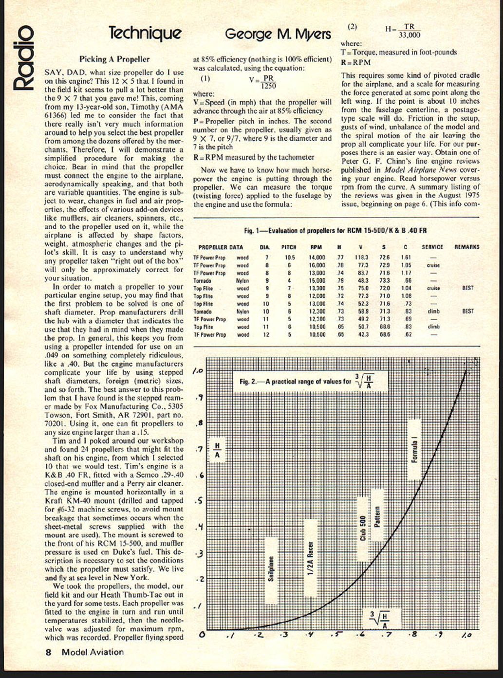 Technique Picking Propeller SAY DAD what size propeller use engine 12 und field kit seems pull lot better 9 X 7 gave coming 13-year-old son Timothy AMA 61366 led consider fact really isnt very much information around help select best propeller among dozens offered mer chants Therefore will demonstrate simplified procedure making choice Bear mind propeller must connect engine airplane aerodynamically speaking both variable quantities engine sub ject wear changes fuel air prop erties effects various add-on devices like mufflers air cleaners spinners etc propeller used airplane affected shape factors weight atmospheric changes pi lots skill easy understand propeller taken right out box will approximately correct situation order match propeller particular engine setup may find first problem solved shaft diameter Prop manufacturers drill hub diameter indicates use mind made prop general keeps using propeller intended use 049 something completely ridiculous like 40 engine manufacturers complicate life using stepped shaft diameters foreign metric sizes forth best answer prob lem have found stepped ream er made Fox Manufacturing Co 5305 Towson Fort Smith AR 72901 part no 70201 Using can fit propellers size engine larger 15 Tim poked around workshop found 24 propellers might fit shaft engine selected 10 would test Tims engine K&B 40 FR fitted Semco 29-40 closed-end muffler Perry air cleaner engine mounted horizontally Kraft KM-40 mount drilled tapped #6-32 machine screws avoid mount breakage sometimes occurs sheet-metal screws supplied mount used mount screwed front RCM 15-500 muffler pressure used Dukes fuel de scription necessary set conditions propeller must satisfy live fly sea level New York took propellers model field kit Heath Thumb-Tac out yard some tests propeller fitted engine turn run until temperatures stabilized needlevalve adjusted maximum rpm recorded Propeller flying speed George M Myers 85% efficiency nothing 100% efficient calculated using equation Iv- PR 1250 VSpeed mph propeller will advance through air 85% efficiency P Propeller pitch inches second number propeller usually given 9 X 7 9/7 9 diameter 7 pitch R measured tachometer Now have know much horse power engine putting through propeller can measure torque twisting force applied fuselage engine use formula PROPELLER DATADIAPITCHRPMH TE Power Prop TE Power Prop TF Power Prop Toroado Top Elite Top Elite Top Elite Toroado TE Power Prop Top Elite TF Power Prop wood wood wood Nyloo wood wood wood Nyloo wood wood wood 710514000 8616000 8813000 9415000 9713200 9812000 10513000 10612300 11512300 11610500 12510500 2H- 3000 T ue measured foot-pounds RRPM requires some kind pivoted cradle airplane scale measuring force generated some point along left wing point about 10 inches fuselage centerline postagetype scale will Friction setup gusts wind unbalance model spiral motion air leaving prop complicate life pur poses easier way Obtain Peter G F Chinns fine engine reviews published Model Airplane News cover ing engine Read horsepower versus rpm curve summary listing reviews given August 1975 issue beginning page 6 info com VSCSERVICEREMARKS 771183 78773 74837 79483 75750 72773 74523 73589 73492 65507 65423 726161 729105 716117 73366 720104 710108 71673 71383 71369 68683 68662 cr0 joe cr0 toe climb climb BEST BEST Ia Fig 2A practical range values 7 8 3 H - La U 0 S U U U N U U I 3H 8 Model Aviation Fig 1Evaluation propellers RCM 15-500/K & B 40 FR 3j~7-8 pliments Bob Aberle W2QPP Now will estimate what devel oped horsepower will airplane using approximate formula 33 H 5120 SAirplane speed horsepower mph H epower developed rpm area Square feet calculation performed horsepower developed propeller final activity compute per formance coefficient propeller tested can evaluate cor rectness particular engine model equation 4 using definitions above C greater 11 propeller should used C between 95 105 propeller will provide widest possible speed range may consid ered cruise propeller situation C between 75 95 propel ler can considered climb propeller may useful providing quick takeoffs rough surfaces tall grass C less 75 propeller should used Fig gives data Tims model worked out preparing col umn Fig 2 provides cube roots calculator wont solve problem Ive tried show simple way estimate propeller performance Scientists will grumble about factors arent considered think pro cedure adequate presented con stant 120 equation 3 can reduced 100 Old-Timer type designs creased 150 very clean retractable gear pattern designs generally cor rect RC designs feature three ex posed wheels engine muffler hang ing breeze exposed engine mounts firewall spin ner advantages measurements taken directly own plane account wear trim needle-valve technique field conditions other realities ever having measure quantify illustrator goofed up Fig page 10 December 1976 issue Model vialion battery positive terminal should indicated long line left side figure Its very important though because cant hurt diodes reversing connections will happen nothinguntil connect things should Sorry about George M Myers 70 Froehlich Farm Rd Hicksville NY 11801 February 1977 9 After experimentation other sizes Brad Franciscos Midwest Sweet Stik currently pulled around Top Flite 10-6 Power Prop Steuart Estep fuels dads RCM 40 Trainer pow ered OS Max 40 swinging Top Flight 10-6 nylon prop Though engine manufacturer specifies props thats approximation