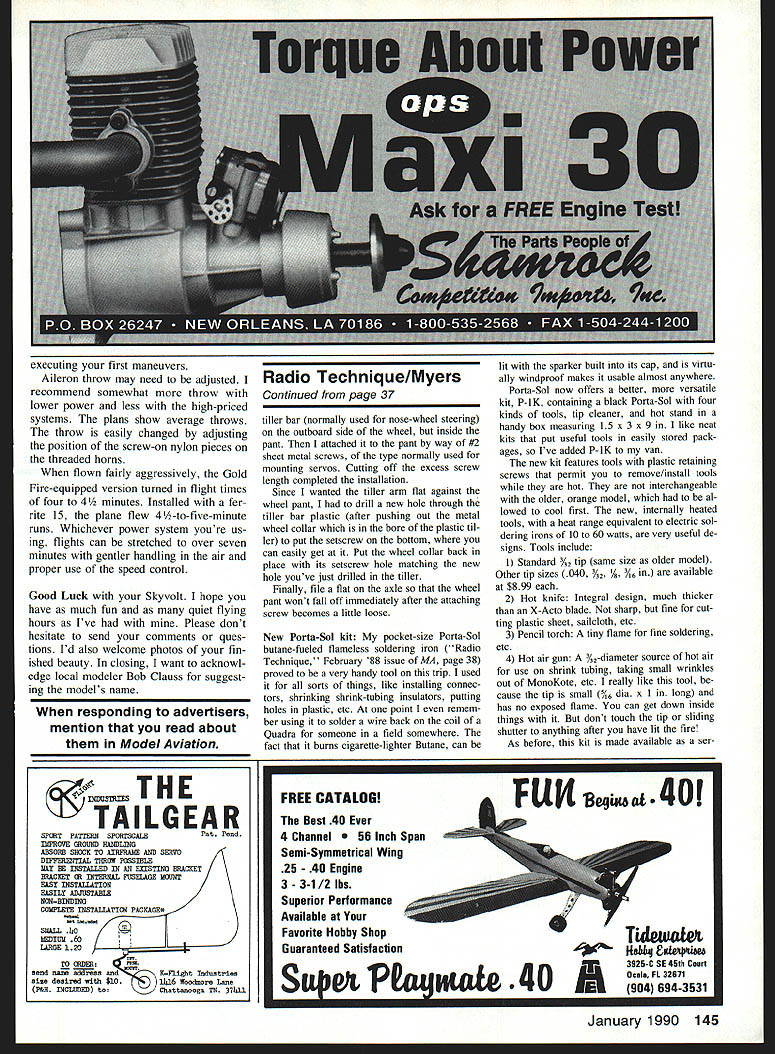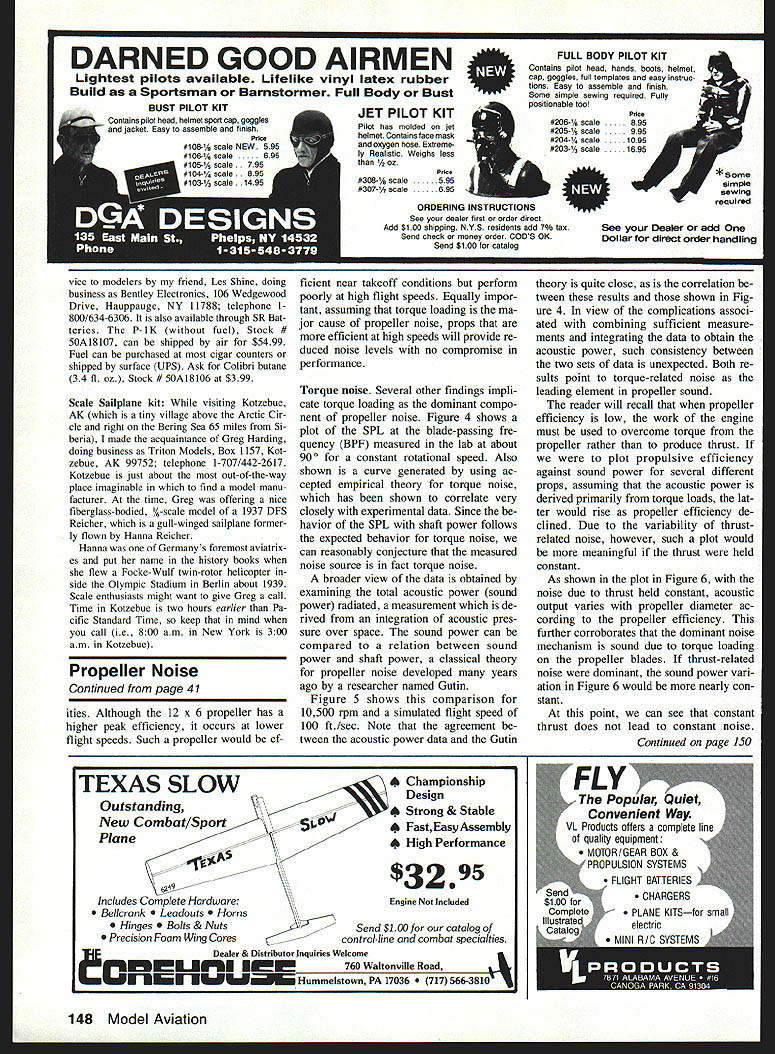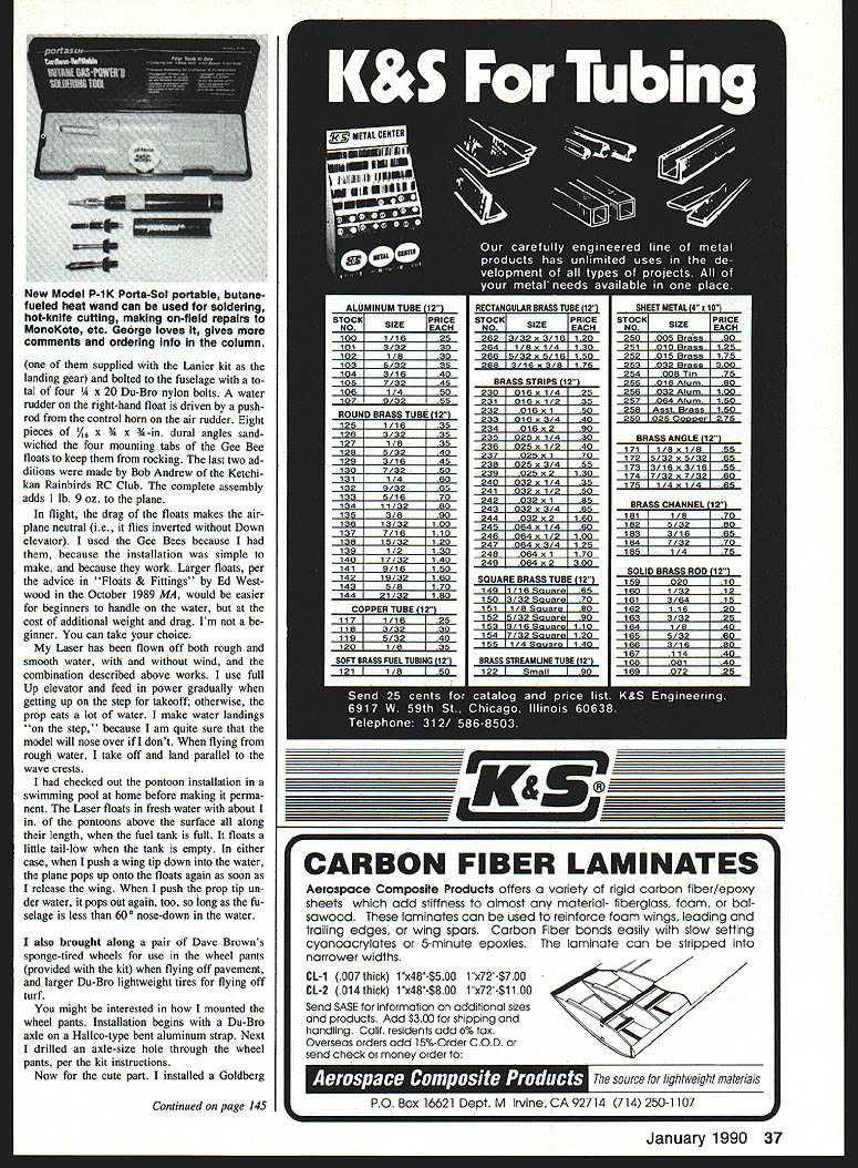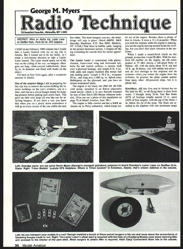 George M Mye Radio Thchnque 70 Froebllch Farm Rd Hkksvlfle NY 11801 ABSTRACT More Alaska trip Lanier Laser GeeBee floats Porta-Sol kit DFS Sailplane SAID February 1989 column would take Lanier Seabird trip Alaska turned out too bulky made last-minute decision take Lanier Laser instead Laser stored neatly out way ceiling van bungees Bun gees long cloth-covered rubberbands about 5/~ in diameter fitted hooks ends Im hack New York again after wonderful summer Alaska smarter things did preparing trip remove screws holding terior moldings vans windows time slip swivel hanger meant hang ing pictures before putting screw back gave little wire loops over van taching bungees drive van know set pencil down somewhere will go corner van within next few miles bungees use better things will stay place Stock #4SPH B&R Specialty Hardware PO Box 0095 Baldwin NY 11510 Find bubble cards hanging picture hardware section clipped off lug containing outside hole neater appear ance Lanier Laser constructed plasticsheeted foam-cored wing horizontal tail balsa fin control surfaces styrene shell over plywood fuselage weighs 6 lb 6 oz radio engine installed minus fuel landing gear Length 505 wingspan 59 wing area 600 sq Splash some Hobbypoxy plywood have almost-waterproof plane engine trusty old 1980 05 60 FSR pump mounted Edson adjustable metal mount turn firewall mounted way four Davis ISO-Mount vibration isola tors can see photo installation page 79 Model Aviation June 89 engine fully cowled has K&B air cleaner its Perry carburetor keeps wa ter out engine Besides plenty dust Alaska turns 12 x 6 propeller hold airplane engine running see engine moving around inside cowl ing dont feel much vibration air frame made sound-level check ground nine feet read 88 dBA stan dard OS muffler engine dB meter peaked 73 dBA during full-speed flyby Palmer AK plane about 10 ft Out 10 ft up theory will radiate less noise less damage airplane its contentswhen isolate engine airframe practice plane sounds quieter other 60-powered ships plenty fast Ketchikan AK first stop Alaska has no flat land RC flying done water brought along 33-in Gee Bee floats 67% fuselage length spaced 13 apart 40% float length top floats 1 below tip prop floats tached airplane two aluminum straps Left Grandpa starls em out early Kevin Myers Georges youngest grandson prepares board Grandpas Lanier Laser GeeBee 33-in floats Right Triton Models -scale DFS Sailplane Triton located Kotzebue Alaska thats Address column Left Do transport models van George installed bunch swivel hangers van raves about convenience fastening bungee cords em Right Lanier Lasers wheel pant mounted help Goldberg Models nose wheel steering tiller arm screwed interior pant shell Minor surgery plastic tiller required Neat Easy Convenient info column 36 Model Aviation supplied Lanier kit landing gear bolted fuselage tal four 1A x 20 Du-Bro nylon bolts water rudder right-hand float driven pushrod control horn air rudder Eight pieces 1A6 x 34 x 4-in dural angles sand wiched four mounting tabs Gee Bee floats keep rocking last two ad ditions made Bob Andrew Ketchi kan Rainbirds RC Club complete assembly adds 1 lb 9 oz plane flight drag floats makes air plane neutral ie flies inverted Down elevator used Gee Bees because because installation simple make because work Larger floats per advice Floats & Fittings Ed Westwood October 1989 MA would easier beginners handle water cost additional weight drag Im ginner can take choice Laser has flown off both rough smooth water wind combination described above works use full Up elevator feed power gradually getting up step takeoff otherwise prop eats lot water make water landings step because am quite sure model will nose over dont flying rough water take off land parallel wave crests checked out pontoon installation swimming pool home before making perma nent Laser floats fresh water about 1 pontoons above surface along length fuel tank full floats little tail-low tank empty either case push wing tip down water plane pops up onto floats again soon release wing push prop tip un der water itpops out again too long fu selage less J0 nose-down water also brought along pair Dave Browns sponge-tired wheels use wheel pants provided kit flying off pavement larger Du-Bro lightweight tires flying off turf might interested mounted wheel pants Installation begins Du-Bro axle HalIco-type bent aluminum strap Next drilled axle-size hole through wheel pants per kit instructions Now cute part installed Goldberg Continued page 145 CARBON FIBER LAMINATES Aerospace Composite Products offers variety rigid carbon fiber/epoxy sheets add stiffness almost material- fiberglass foam bal sawood laminates can used reinforce foam wings leading trailing edges wing spars Carbon Fiber bonds easily slow setting cyanoacrylates 5-minute epoxies laminate can stripped narrower widths CL-i 007 thick 1x48-$50O 1x72-$7OO CL-2 014 thick 1x48-$8OO 1x72-$11O0 Send SASE information additional sizes products Add $300 shipping handling Calif residents add 6% tax Overseas orders odd 15%-Order COD send check money order I- IThe source lightweight materials PO Box 16621 Dept M Irvine CA 92714 714 250-1107 h. January 1990 37 New Model P-1K Porta-Sol portable butanefueled heat wand can used soldering hof-krsife cutting making on-field repairs MonoKote etc George loves gives comments ordering Info column executing first maneuvers Aileron throw may need adjusted recommend somewhat throw lower power less high-priced systems plans show average throws throw easily changed adjusting position screw-on nylon pieces threaded horns flown fairly aggressively Gold Fire-equipped version turned flight times four 4 minutes Installed fer rite 15 plane flew 4/2-to-five-minute runs Whichever power system youre us ing flights can stretched over seven minutes gentler handling air proper use speed control Good Luck Skyvolt hope have much fun quiet flying hours Ive Please dont hesitate send comments ques tions Id also welcome pho