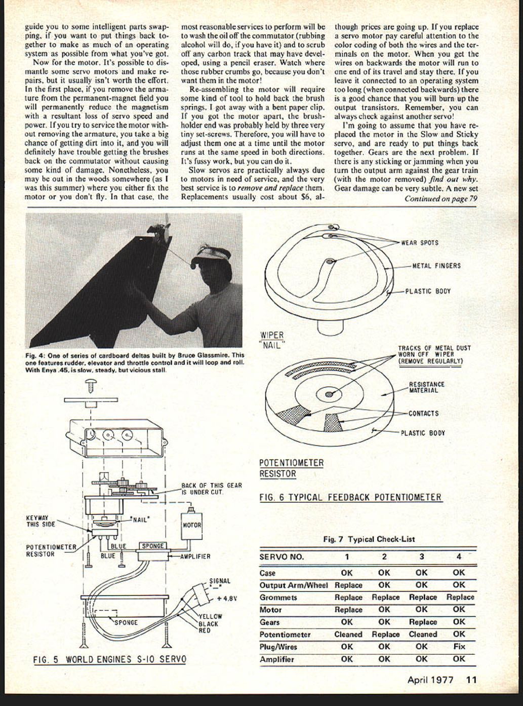 IIGeorgeMMyers WHILE BACK promised discuss servo repairs meantime good local fliers also clerks hobby shop kind enough look up tell story seems read January 1977 column first impression such elementary ideas waste good magazine space exchanging radio airplane another chanced pull antenna Guess parted Right little button threaded antenna keep being pulled too far out fuselage takes real man tell stories himself appre ciate way boosted own ego too Thanks Roy Back servos January column identified four servos needed work incidentally tables 1 2 reversed printing Im sure noticed slow sticky rest jumpy noisy Lets start Slow Sticky Back August 1975 column showed measure servo transit time might want look up Clear space workbench lay down clean towel pillowcase work will catch dropped parts fore can bounce floor Provide yourself good light strong magni fying glass assortment screw drivers hex wrenches see Fig 3 Take apart servo time wont have worry about leaving parts out putting something doesnt belong Carefully dismantle servo first attempt its good idea make rough sketch parts come off provide yourself exploded view servo can used assembly aid Make sketch big because youll adding details recognize importance Fig 5 As part removed clean care fully examine damage magnifying glass will looking cracks around screw holes stripped threads bulged distorted cases bent thinned-out gear teeth broken wires par ticularly plug point wire bent cracked printed circuit boards loose components Pay partic ular attention surface feedback potentiometer wiper As wiper wears flat will appear contacting surface Fig 6 track metal par ticles will laid down resistor can wipe off metal particles look grooves and/or hairline cracks metal surface resistor find replace resistor paying particular attention color coding three wires locations solder tabs Worn potentiometers common cause erratic servo operation As contact surfaces metal potentiometer wiper wear tension lost another cause erratic operation Careful bending about 1/16 inch above original position will restore like-new performance must judge yourself wear excessive time has come replace wiper general should no chance will wear through before next inspect because piece might released could cause really erratic operation servo now should have broken down servo its basic elements can prepare chart needed repairs something like Fig 7 will help write up order needed parts can Left Fig 1Ten years progress design Contain same func tional elements amplifier motor gears out-put arm feedback potentiometer Good servo maintenance spells reliability Below 1 Fig 2The Cannon micro-servo shows state-of-the-art miniaturization continues same functional elements old er models elements called out Bottom Fig 3World Engines S-lO servo dismantled inspection tools will need paper towel catch dropped parts mag nifying glass assorted cross-point single-blade hex-wrench screw drivers Required common sense systematic approach 10 Model Aviation guide some intelligent parts swap ping want put things back gether make much operating system possible what youve got Now motor Its possible dis mantle some servo motors make re pairs usually isnt worth effort first place remove arma ture permanent-magnet field will permanently reduce magnetism resultant loss servo speed power try service motor out removing armature take big chance getting dirt will definitely have trouble getting brushes back commutator causing some kind damage Nonetheless may out woods somewhere summer either fix motor dont fly case reasonable services perform will wash oil off commutator rubbing alcohol will have scrub off carbon track may have devel oped using pencil eraser Watch rubber crumbs go because dont want motor Re-assembling motor will require some kind tool hold back brush springs got away bent paper clip got motor apart brushholder end probably held three very tiny set-screws Therefore will have adjust time until motor runs same speed both directions Its fussy work can Slow servos practically always due motors need service very best service remove replace Replacements usually cost about $6 al though prices going up replace servo motor pay careful attention color coding both wires ter minals motor get wires backwards motor will run end its travel stay leave connected operating system too long connected backwards good chance will burn up output transistors Remember can always check against another servo Im going assume have re placed motor Slow Sticky servo ready put things back together Gears next problem sticking jamming turn output arm against gear train motor removed find out Gear damage can very subtle new set Continued page 79 Th 0 J BACK OF THIS GEAR IS UNDER CUT SPONGE POTENTIOMETERBLUE RESISTORBLUE 4BV PLASTIC BODY WIPER NAILTRACKS OF METAL DUST WORN OFF WIPER REMOVE REGULARLY RESISTANCE PLASTIC BODY POTENTIOMETER RESISTOR FIG 6 TYPICAL FEEDBACK POTENTIOMETER Fig 7 Typical Check-List SERVONO Case OK OK OK OK Output Arm/WheelReplace OK OK OK GrommetsReplaceReplaceReplaceReplace MotorReplace OK OK OK Gears OK OKReplace OK PotentiometerCleanedReplaceCleaned OK Plug/Wires OK OK OK Fix Amplifier OK OK OK OK April 1977 11 Fig 4 series cardboard deltas built Bruce Glassmire features rudder elevator throttle control will loop roll Enya 45 slow steady vicious stall FIG 5 WORLD ENGINES S-Ia SERVO YOU CANT GET ANY LIGHTER SMALLER OR SIMPLER THAN THIS pulse commander quality American made rudder-ony pulse proportional radio system offers lightest weight smallest size flute pack available Only 21 oz total airborne weight Baby system Rudder-only flying perfect way start R/C also provides relaxing changeof-pace experienced flyer units come completely wired tested guaranteed ni-cd batteries charger furnished flute pack Transmitter battery included Eveready No 276 9V dry battery equivalent required systems $75 complete Available 72080 72160 72240 72320 72400 72960 75640 531 532 533 534 535 MHz Ham license required 53MHz frequenc