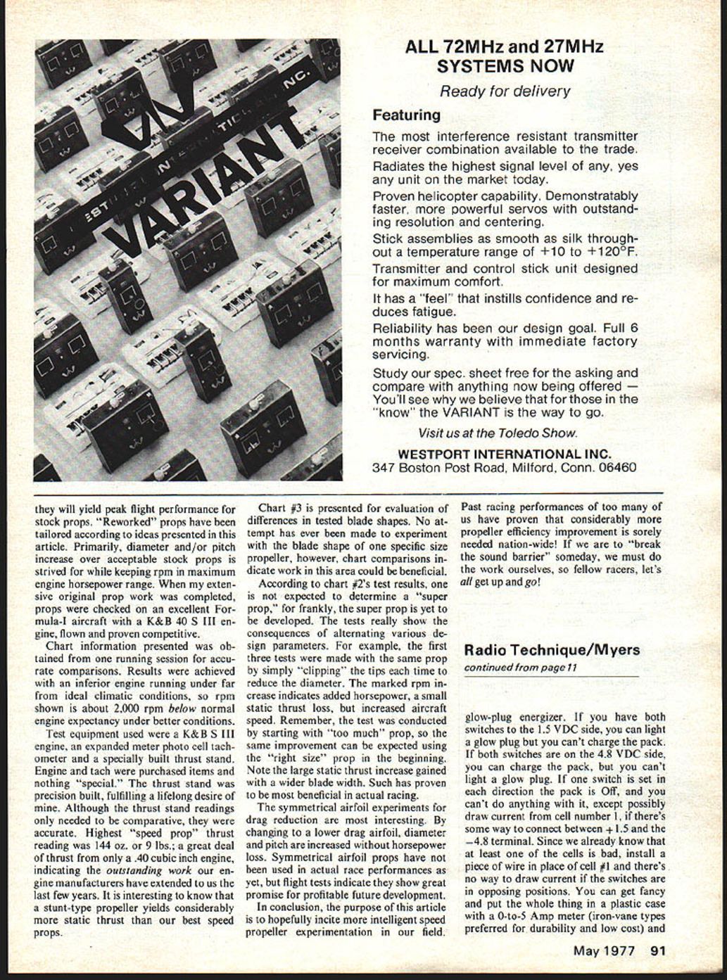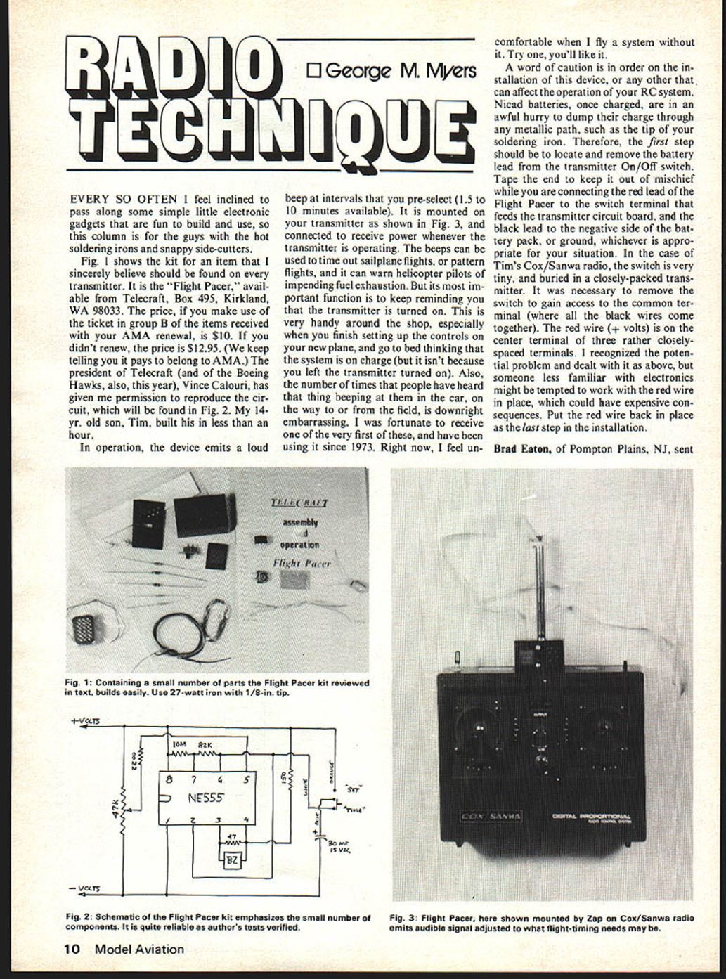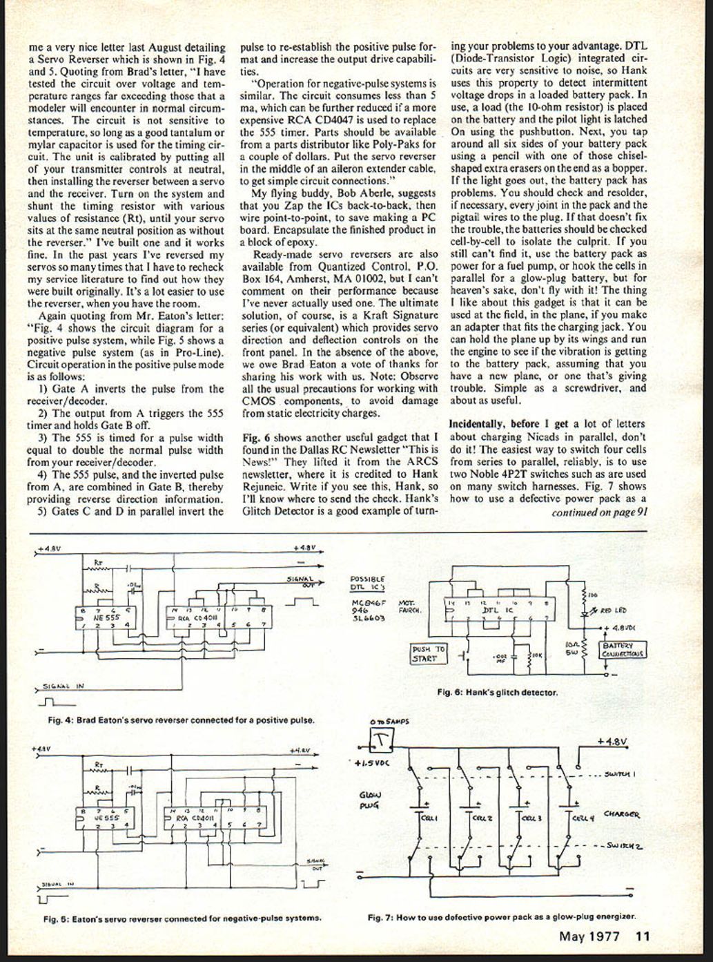 S I] George M Myers EVERY SO OFTEN feel inclined pass along some simple little electronic gadgets fun build use column guys hot soldering irons snappy side-cutters Fig 1 shows kit item sincerely believe should found transmitter Flight Pacer avail able Telecraft Box 495 Kirkland WA 98033 price make use ticket group B items received AMA renewal $10 didnt renew price $1295 keep telling pays belong AMA president Telecraft Boeing Hawks also year Vince Calouri has given permission reproduce cir cuit will found Fig 2 14yr old son Tim built less hour operation device emits loud beep intervals pre-select 15 10 minutes available mounted transmitter shown Fig 3 connected receive power whenever transmitter operating beeps can used time out sailplane flights pattern flights can warn helicopter pilots impending fuel exhaustion its im portant function keep reminding transmitter turned very handy around shop especially finish setting up controls new plane go bed thinking system charge isnt because left transmitter turned Also number times people have heard thing beeping car way field downright embarrassing fortunate receive very first have using since 1973 Right now feel un comfortable fly system Try youll like word caution order stallation device other can affect operation RC system Nicad batteries once charged awful hurry dump charge through metallic path such tip soldering iron Therefore first step should locate remove battery lead transmitter On/Off switch Tape end keep out mischief connecting red lead Flight Pacer switch terminal feeds transmitter circuit board black lead negative side bat tery pack ground whichever appro priate situation case Tims Cox/Sanwa radio switch very tiny buried closely-packed trans mitter necessary remove switch gain access common ter minal black wires come together red wire s center terminal three rather closelyspaced terminals recognized poten tial problem dealt above someone less familiar electronics might tempted work red wire place could have expensive con sequences Put red wire back place last step installation Brad Eaton Pompton Plains NJ sent laM BZK 8 N Lf4zzi2 NESSS IL~J1 Fig 2 Schematic Flight Pacer kit emphasizes small number components quite reliable authors tests verified 10 Model Aviation Fig 1 Containing small number parts Flight Pacer kit reviewed text builds easily Use 27-watt iron 1/8-in tip VSIL1S ss-r IA1E So s-ve VOLTS Fig 3 Flight Pacer shown mounted Zap Cox/Sanwa radio emits audible signal adjusted what flight-timing needs may very nice letter last August detailing Servo Reverser shown Fig 4 5 Quoting Brads letter have tested circuit over voltage tem perature ranges far exceeding modeler will encounter normal circum stances circuit sensitive temperature long good tantalum mylar capacitor used timing cir cuit unit calibrated putting transmitter controls neutral installing reverser between servo receiver Turn system shunt timing resistor various values resistance Rt until servo sits same neutral position reverser Ive built works fine past years Ive reversed servos times have recheck service literature find out built originally Its lot easier use reverser have room Again quoting Mr Eatons letter Fig 4 shows circuit diagram positive pulse system Fig S shows negative pulse system Pro-Line Circuit operation positive pulse mode follows 1 Gate inverts pulse receiver/decoder 2 The output triggers 555 timer holds Gate B off 3 The 555 timed pulse width equal double normal pulse width receiver/decoder 4 The 555 pulse inverted pulse combined Gate B thereby providing reverse direction information 5 Gates C D parallel invert pulse re-establish positive pulse mat increase output drive capabili ties Operation negative-pulse systems similar circuit consumes less 5 ma can further reduced expensive RCA CD4047 used replace 555 timer Parts should available parts distributor like Poly-Paks couple dollars Put servo reverser middle aileron extender cable get simple circuit connections flying buddy Bob Aberle suggests Zap ICs back-to-back wire point-to-point save making PC board Encapsulate finished product block epoxy Ready-made servo reversers also available Quantized Control PO Box 164 Amherst MA 01002 cant comment performance because Ive never actually used ultimate solution course Kraft Signature series equivalent provides servo direction deflection controls front panel absence above owe Brad Eaton vote thanks sharing work us Note Observe usual precautions working CMOS components avoid damage static electricity charges Fig 6 shows another useful gadget found Dallas RC Newsletter News lifted ARCS newsletter credited Hank Rejuneic Write see Hank Ill know send check Hanks Glitch Detector good example turning problems advantage DTL Diode-Transistor Logic integrated cir cuits very sensitive noise Hank uses property detect intermittent voltage drops loaded battery pack use load 10-ohm resistor placed battery pilot light latched using pushbutton Next tap around six sides battery pack using pencil chiselshaped extra erasers end bopper light goes out battery pack has problems should check resolder necessary joint pack pigtail wires plug doesnt fix trouble batteries should checked cell-by-cell isolate culprit still cant find use battery pack power fuel pump hook cells parallel glow-plug battery heavens sake dont fly thing like about gadget can used field plane make adapter fits charging jack can hold plane up its wings run engine see vibration getting battery pack assuming have new plane thats giving trouble Simple screwdriver about useful Incidentally before get lot letters about charging Nicads parallel dont easiest way switch four cells series parallel reliably use two Noble 4P2T switches such used switch harnesses Fig 7 shows use defective power pack continued page 91 4 J 0I, s4 5I6t4AL Th CD 40i11I POSDI8X Dli ICi MC 84 5L ~03 FAitCIibTL IC 5TATooio Fig 4 Brad Eatons servo reverser connected positive pulse 4ev q 13 I CA CD4011 /t 3 4 ~4 sitc LF Fig 5 Eatons servo reverser c