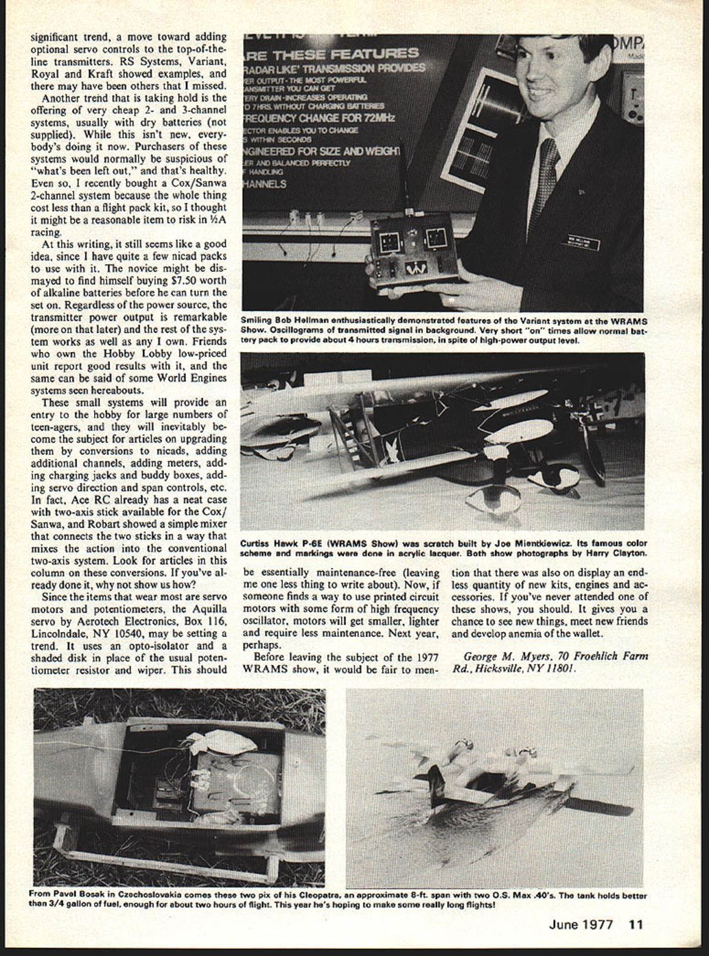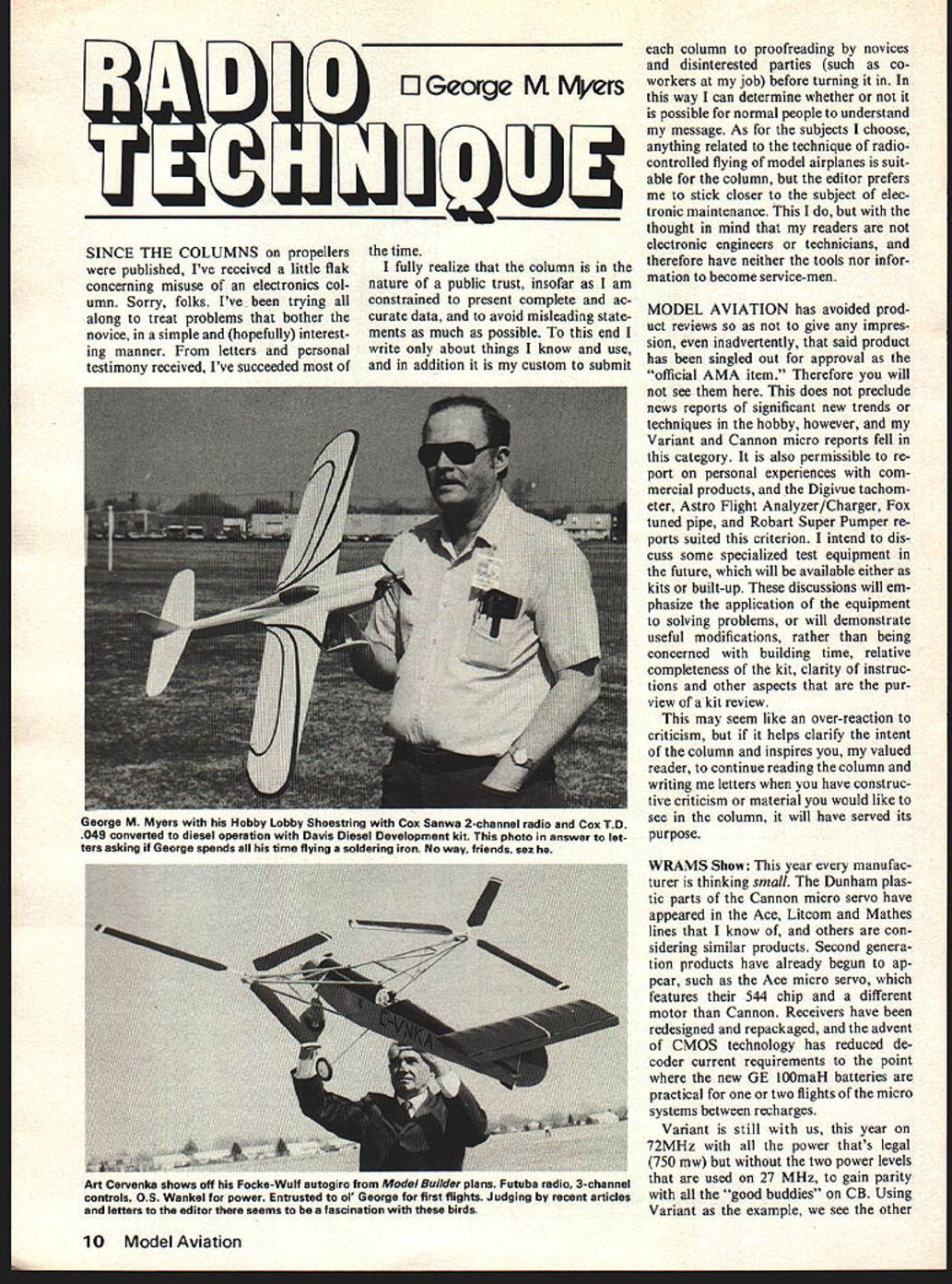 IIOGeorgerAMyers SINCE THE COLUMNS propellers published Ive received little flak concerning misuse electronics col umn Sorry folks Ive trying along treat problems bother novice simple hopefully interest ing manner letters personal testimony received Ive succeeded time fully realize column nature public trust insofar am constrained present complete ac curate data avoid misleading state ments much possible end write about things know use addition custom submit column proofreading novices disinterested parties such co workers job before turning way can determine whether possible normal people understand message As subjects choose anything related technique radiocontrolled flying model airplanes suit able column editor prefers stick closer subject elec tronic maintenance thought mind readers electronic engineers technicians therefore have neither tools nor infor mation become service-men MODEL AVIATION has avoided prod uct reviews give impres sion inadvertently said product has singled out approval official AMA item Therefore will see does preclude news reports significant new trends techniques hobby however Variant Cannon micro reports fell category also permissible re port personal experiences com mercial products Digivue tachom eter Astro Flight Analyzer/Charger Fox tuned pipe Robart Super Pumper re ports suited criterion intend dis cuss some specialized test equipment future will available either kits built-up discussions will em phasize application equipment solving problems will demonstrate useful modifications rather being concerned building time relative completeness kit clarity instruc tions other aspects pur view kit review may seem like over-reaction criticism helps clarify intent column inspires valued reader continue reading column writing letters have construc tive criticism material would like see column will have served its purpose WRAMS Show year manufac turer thinking small Dunham plas tic parts Cannon micro servo have appeared Ace Litcom Mathes lines know others con sidering similar products Second genera tion products have already begun ap pear such Ace micro servo features 544 chip different motor Cannon Receivers have redesigned repackaged advent CMOS technology has reduced de coder current requirements point new GE lOOmaH batteries practical two flights micro systems between recharges Variant still us year 72MHz power thats legal 750 mw two power levels used 27 MHz gain parity good buddies CB Using Variant example see other 10 Model Aviation George M Myers Hobby Lobby Shoestring Cox Sanwa 2-channel radio Cox TD 049 converted diesel operation Davis Diesel Development kit photo answer let ters asking George spends time flying soldering iron No way friends sez Art Cervenka shows off Focke-WuIf autogiro Model Builder plans Futuba radio 3-channel controls 09 Wankel power Entrusted 01 George first flights Judging recent articles letters editor seems fascination birds significant trend move toward adding optional servo controls top-of-theline transmitters RS Systems Variant Royal Kraft showed examples may have others missed Another trend taking hold offering very cheap 2- 3-channel systems usually dry batteries supplied isnt pew bodys doing now Purchasers systems would normally suspicious whats left out thats healthy recently bought Cox/Sanwa 2-channel system because whole thing cost less flight pack kit thought might reasonable item risk racing writing still seems like good idea since have quite few nicad packs use novice might dis mayed find himself buying $750 worth alkaline batteries before can turn set Regardless power source transmitter power output remarkable later rest sys tem works well own Friends own Hobby Lobby low-priced unit report good results same can said some World Engines systems seen hereabouts small systems will provide entry hobby large numbers teen-agers will inevitably come subject articles upgrading conversions nicads adding additional channels adding meters add ing charging jacks buddy boxes add ing servo direction span controls etc fact Ace RC already has neat case two-axis stick available Cox/ Sanwa Robart showed simple mixer connects two sticks way mixes action conventional two-axis system Look articles column conversions youve al ready done show us Since items wear servo motors potentiometers Aquilla servo Aerotech Electronics Box 116 Lincolndale NY 10540 may setting trend uses opto-isolator shaded disk place usual poten tiometer resistor wiper should essentially maintenance-free leaving less thing write about Now someone finds way use printed circuit motors some form high frequency oscillator motors will get smaller lighter require less maintenance Next year perhaps Before leaving subject 1977 George M Myers 70 Froehlich Farm WRAMS show would fair men- Rd Hicks vile NY 11801 tion also display end less quantity new kits engines ac cessories youve never attended shows should gives chance see new things meet new friends develop anemia wallet June1977 11 Smiling Bob Heliman enthusmastlcally aemonstrated teatures ot Variant system WRAMS Show Oscillograms transmitted signal background Very short times allow normal bat tery pack provide about 4 hours transmission spite high-power output level Curtiss Hawk P-SE WRAMS Show scratch built Joe Mietltkiewicz Its famous color scheme markings done acrylic lacquer Both show photographs Harry Clayton -. -vu DUII Izecnoslovakla comes mesa two pix oy nis i.eopatra appre two 3/4 gallon fuel enough about two hours flight year hes hoping make some really iong nights