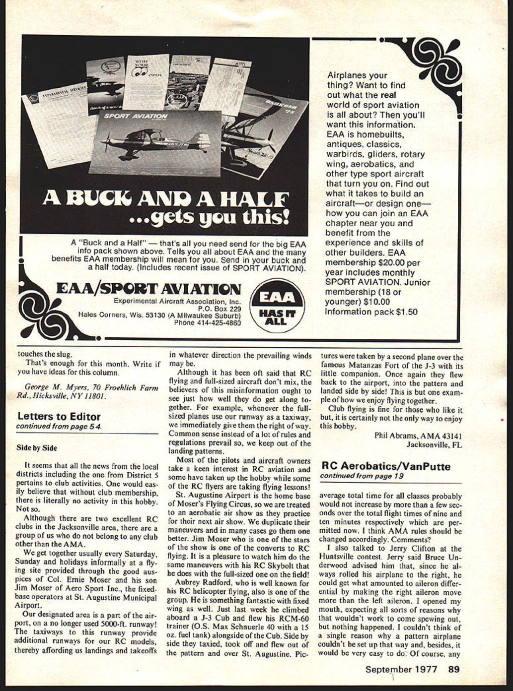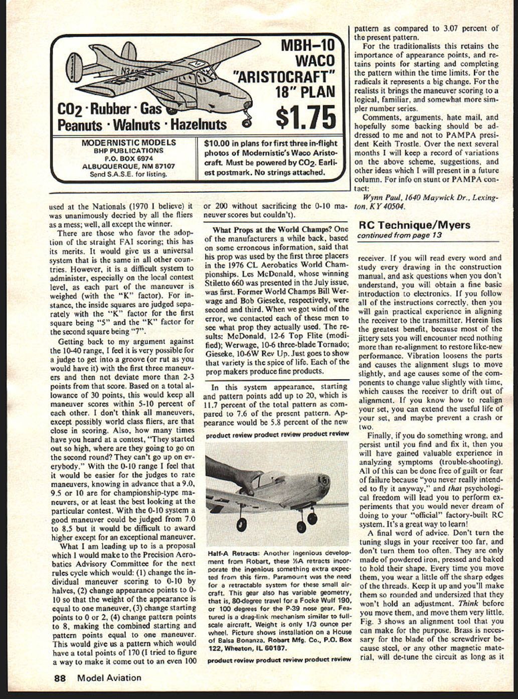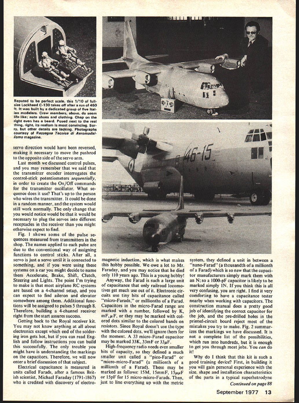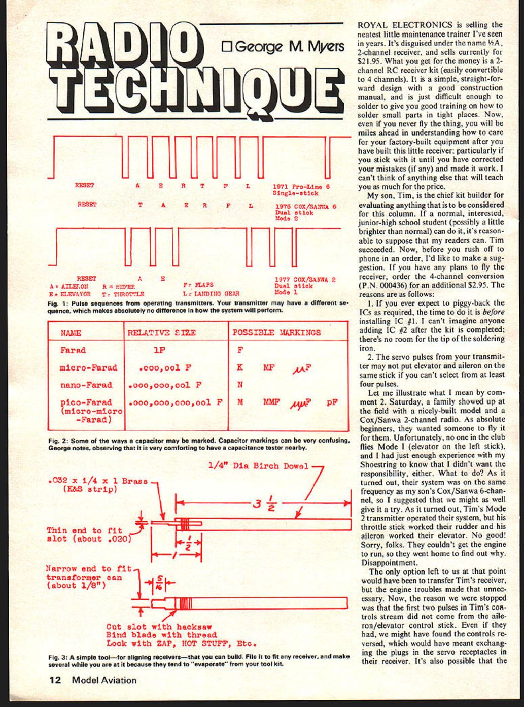 IIflGeorgeMMyers RESET RESET UUULIWUUU AERTFL1971Pro-Line6 Singlestick TAE RFL1976C0X/SMWA6 Dual stick Mode 2 -j----lrlr]J LVlFlK RESETAE1977 GOX/SANWA 2 AILEFOUR PJERF FLAPSDual stick E ELEVAiORT 2IIROTrLEL LANDING GEARMode 1 Fig 1 Pulse sequences operating transmitters transmitter may have different se quence makes absolutely no difference system will perform NALIERELATIVE BIZEPOSSIBLE MARKINGS Farad FF micro-Farad oJ FKMF nano-Faradooooooool FN picoFaradoooooooooool FMMMF 4uFpF micromicro -Farad Fig 2 Some ways capacitor may marked capacitor markings can very confusing George notes observing very comforting have capacitance tester nearby 1/4 Dia BIrch 032 x i/4 x 1 Brass K&S strip L fit 020 Thin end slot about Dowe 17 / Narrow end fit transformer can about 1/8 EU Cut slot hacksaw Bind blade thread Lock ZAP HOT STUFF Etc Fig 3 simple toolfor aligning receiversthat can build File fit receiver make several because tend evaporate tool kit -V ROYAL ELECTRONICS selling neatest little maintenance trainer Ive seen years Its disguised under name 2-channel receiver sells currently $2195 What get money 2channel RC receiver kit easily convertible 4 channels simple straight-for ward design good construction manual just difficult enough solder give good training solder small parts tight places Now never fly thing will miles ahead understanding care factory-built equipment after have built little receiver particularly stick until have corrected mistakes made work cant think anything else will teach much price son Tim chief kit builder evaluating anything considered column normal interested junior-high school student possibly little brighter normal can its reason able suppose readers can Tim succeeded Now before rush off phone order Id like make sug gestion have plans fly receiver order 4-channel conversion PN 000436 additional $295 reasons follows 1 If ever expect piggy-back ICs required time before installing IC #1 cant imagine anyone adding IC #2 after kit completed theres no room tip soldering iron 2 The servo pulses transmit ter may put elevator aileron same stick cant select least four pulses Let illustrate what mean com ment 2 Saturday family showed up field nicely-built model Cox/Sanwa 2-channel radio As absolute beginners wanted someone fly Unfortunately no club flies Mode elevator left stick just enough experience Shoestring know didnt want responsibility either What As turned out system same frequency sons Cox/Sanwa 6-chan nel suggested might well ] give try As turned out Tims Mode 2 transmitter operated system throttle stick worked rudder aileron worked elevator No good Sorry folks couldnt get engine run went home find out Disappointment option left us point would have transfer Tims receiver engine troubles made unnec -j essary Now reason stopped first two pulses Tims coa trols stream did come aile ron/elevator control stick might have found controls re versed would have meant exchang ing plugs servo receptacles receiver Its also possible 12 Model Aviation servo direction would have reversed making necessary move pushrod opposite side servo arm Last month discussed control pulses may remember said transmitter encoder interrogates control-stick potentiometers sequentially order create On/Off commands transmitter oscillator What se quence does use Thats up person wires transmitter could done random manner system would still work normally change would notice would would necessary plug servos different receptacles receiver might otherwise expect find Fig 1 shows some pulse se quences measured transmitters shop names applied pulse due conventional way assigning functions control sticks After servo just servo until connected something using systems car might decide name Accelerate Brake Shift Clutch Steering Lights point Im trying make airplane RC systems based 4-channel setup can expect find aileron elevator somewhere among Additional func tions will assigned pulses 5 through 8 Therefore building 4-channel receiver right start assures success Getting back Royal receiver kit may know anything about electronics except end solder ing iron gets hot can read Eng lish follow instructions can build successfully trouble might have understanding markings capacitors Therefore will now enter brief discussion subject Electrical capacitance measured units called Farads after famous Brit ish scientist Michael Faraday 179 1-1867 credited discovery electro magnetic induction what makes hobby possible owe lot Mr Faraday may notice died 110 years ago young hobby Anyway Farad such large unit capacitance railroad locomo tives get much use out Electronic cir cuits use tiny bits capacitance called micro-Farads millionths Farad Capacitors micro-Farad range marked number followed K mF p F may marked col ored dots similar colored bands resistors Since Royal doesnt use type colored dots well ignore moment 33 micro-Farad capacitor may marked 33K 33mF 33pF High-frequency radio needs smaller bits capacity defined much smaller unit called pico-Farad micro-micro-Farad millionth millionth Farad may marked follows iSM l5mmF l5ppF l5pF 15 micro-micro-Farads just line everything up metric system defined unit between nano-Farad thousandth millionth Farad new capaci tor manufacturers simply mark Nso l000-pF capacitor likely marked simply lN think very confusing right find very comforting have capacitance tester nearby working capacitors construction manual does pretty good job identifying correct capacitor job pre-drilled holes printed-circuit board reject mistakes try make Fig 2 summar izes markings have discussed complete list possibilities run hundreds enough get through jobs can think kit such good training device First building will gain personal experience size shape installation characteristics parts typical superhetrodyne Continued page 88 September 1977 13 Reputed perfect scale 1/10 full size Lockheed C-130 takes off after run 450 ft built dedicated group five Ital ian modelers Crew members above seem life-like note shoe