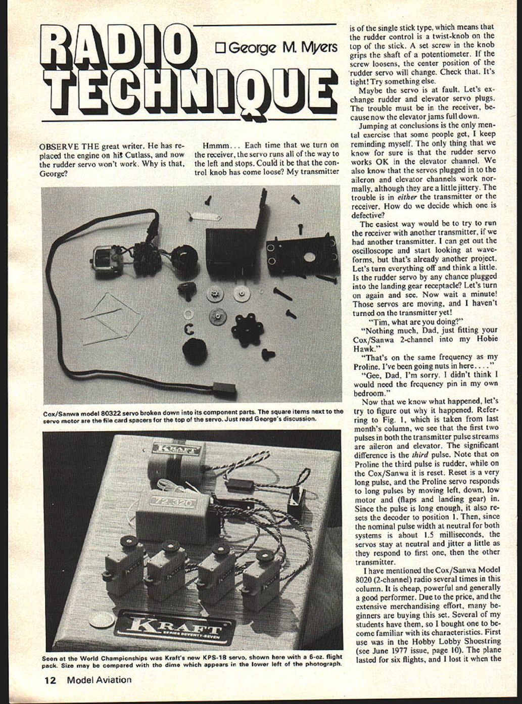 IIEJGeorge M Myers OBSERVE THE great writer has re placed engine hi Cutlass now rudder servo wont work George Hmmm. time turn receiver servo runs way left stops Could con trol knob has come loose transmitter single stick type means rudder control twist-knob top stick set screw knob grips shaft potentiometer screw loosens center position rudder servo will change Check Its tight Try something else Maybe servo fault Lets ex change rudder elevator servo plugs trouble must receiver cause now elevator jams full down Jumping conclusions men tal exercise some people get keep reminding myself thing know sure rudder servo works OK elevator channel also know servos plugged aileron elevator channels work nor mally although little jittery trouble either transmitter receiver decide defective easiest way would try run receiver another transmitter another transmitter can get out oscilloscope start looking wave forms thats already another project Lets turn everything off think little rudder servo chance plugged landing gear receptacle Lets turn again see Now wait minute servos moving havent turned transmitter yet Tim what doing Nothing much Dad just fitting Cox/Sanwa 2-channel Hobie Hawk Thats same frequency Proline Ive going nuts here.. Gee Dad Im sorry didnt think would need frequency pin own bedroom Now know what happened lets try figure out happened Refer ring Fig 1 taken last months column see first two pulses both transmitter pulse streams aileron elevator significant difference third pulse Note Proline third pulse rudder Cox/Sanwa reset Reset very long pulse Proline servo responds long pulses moving left down low motor flaps landing gear Since pulse long enough also re sets decoder position 1 since nominal pulse width neutral both systems about 15 milliseconds servos stay neutral jitter little respond first other transmitter have mentioned Cox/Sanwa Model 8020 2-channel radio several times column cheap powerful generally good performer Due price extensive merchandising effort ginners buying set Several students have bought come familiar its characteristics First use Hobby Lobby Shoestring see June 1977 issue page 10 plane lasted six flights lost 12 Model Aviation Cox/Sanwa model 80322 servo broken down its component parts square items next servo motor file card spacers top servo Just read Georges discussion Seen World Championships Krafts new KPS-18 servo shown 6-oz flight pack Size may compared dime appears lower left photograph controls acted sticky last flight Since fitted bent-wire control mix er blamed crash modification tossed system shelf fur ther study rainy day Meanwhile students spiral dived ground 300 feet gliding landing spiral lasted long enough grab box try correct Again student complained controls got sticky engine quit Mark Waite AMA 28903 dismantled servos got home reported presence piece plastic jammed metal s photo shows Cox/Sanwa 80322 silver label servo broken down its component parts Both us observed 80322 servo sticky Both us 80321 gold label servos gave no trouble began get sus picious make long story short both found top plastic servo box marked 1 surface neath gears 2 box good servo have remove top servo case gears see number also found case marked 1 apparently shrunk little since manufacture As result servo-motor open-frame type RESETAE LRESET 1971 PRO 51 TON 8 ST SRESET 77Th RESE LOOKS LIKS LOEG PULSE TO THE STIRRER SERVO ABOVE 7SET 1977 COX/SANVIA Model 8020 Fig 1 Coincidence pulses posed puzzler troubleshooting George describes Find problem dont jump conclusions message ion surface identifies shrinker 7 7000 7 7 7 7 II 7 // 7/ / 4K // / 0 / Add spacer / 7 7 / 7Motorgoeshere -H H Trim edge amplifier board Fig 2 Some fixes shrinkage servo cases between top main box servo case can seen photo Cox/Sanwa just inside bend wire spacers cut ordi nary 3 X 5 file card total thickness 014 inch spacers fitted top case no longer pinched gears inside like found Mattel Hot Wheels car gets jammed pressure plastic partition divides servomotor servo-amplifier fix worked us file little off servo-amplifier board Fig 2 Reassembling servo found yet another problem Due shrinkage necessary fabricate spacer go Continued page 80 7 October 1977 13 Gothas coming Two Sweessixteens fly close formation Kits Sharon Enterprises Quadra-powered Thunderbird isa could 1/4-scale category Span 80 in. weight 18 lbs servo aileron rudder elevator servos tail no pushrod longer 6 Does maneuvers Colored jell-coated fuse cowl available R Shettler Ent TALK TO SOMEONE WHO u THE RC HELl EXPERTS AT SC MODELERS Its nice know can get right answers Hell problems Because dont know about us could call hobby shops day long never get off ground SC Modelers have people know about building flying RC Helicopters anybody Weve built Weve flown Weve chalked up much flying time some big chooper pilots Most important thoughwe know make expertise avail able you have ask us So next time want make choice about HC Hell Kit stumped assembly prob lem ed repair re place part lk someone knows Si new helicopter catalog & parts list simultaneously last down wins Awards SAM Champs pre sented annual banquet may have heard heated discussions cen tering around Great Engine Contro versy R/C taking over SAM losing sight Preamble Constitution gala affair good times fellowship prevail hundred thirty three competitors plus family members cheered applauded Free/ Flight Radio/Control fliers alike gorgeous trophies merchandise awards handed out New special awards Electric Power Twin Pushers beau tiful handcrafted art trophy Don Jenk ins Indianapolis high time De Long 30 added already impressive hardware table 1130 heat will soon forgotten Comradeship competiton anl associ ation great bunch people will long remembered H elicopters/Schoonard continued page 25 SC MODELER HOBBY SHOP Hells Planes Cars Boats Radios Parts RC Hobbyists 1999 Larkin Avenue Elgin Illinois 60120 Dept 132312-697-37374 hobby industry has come largest prestig ious meets country Hopeful
