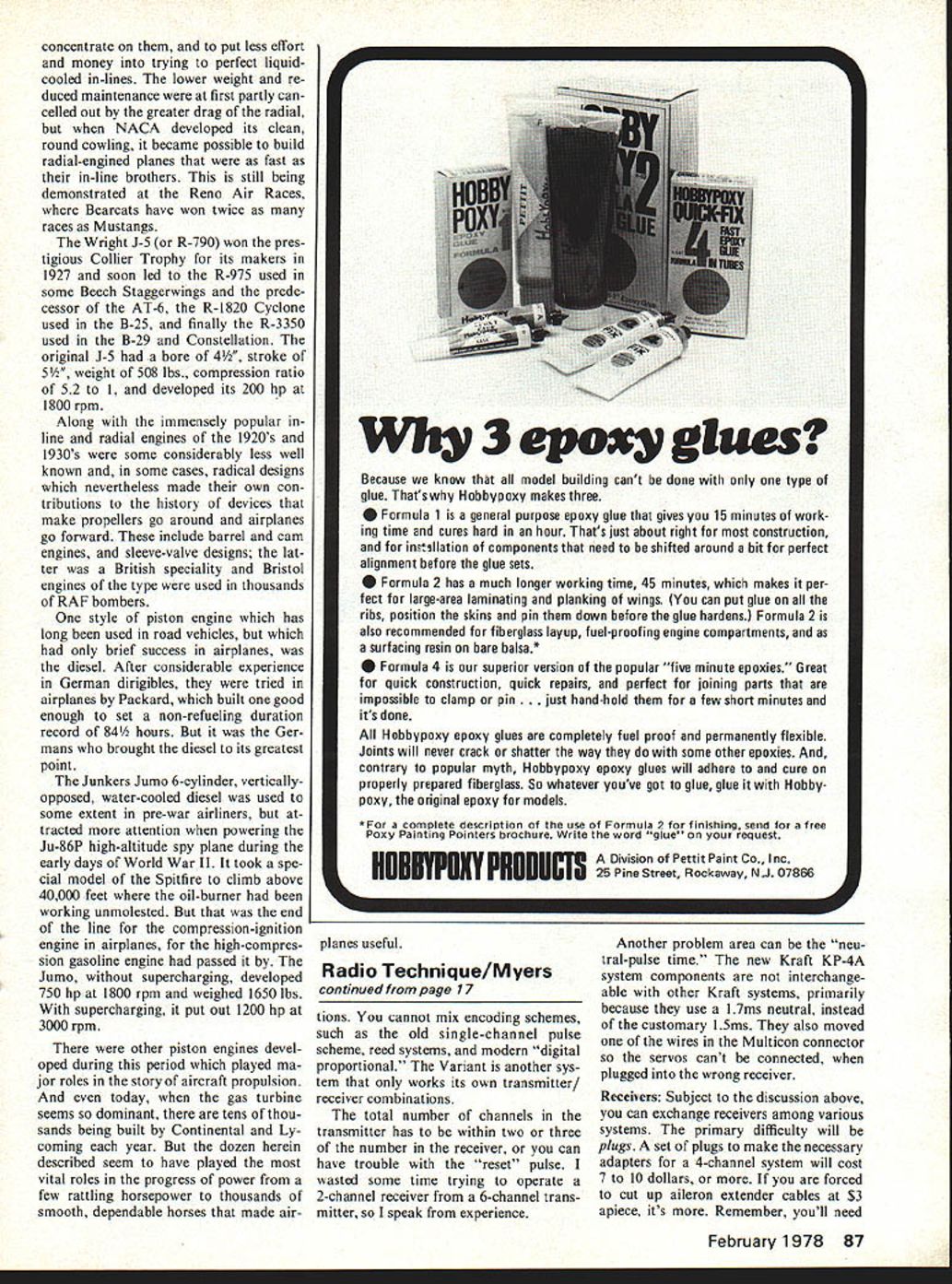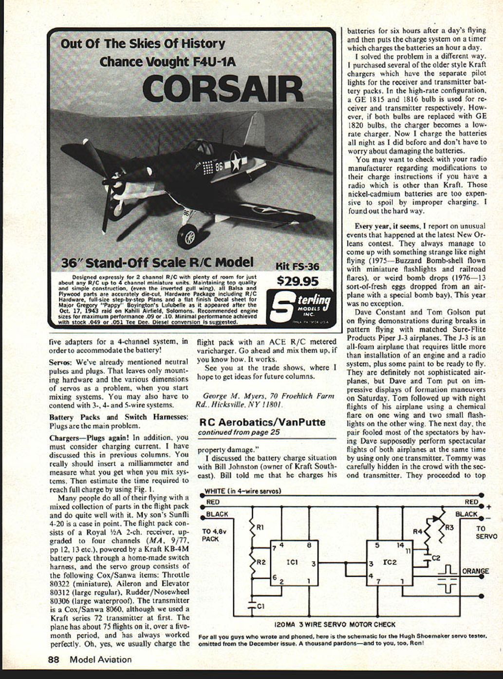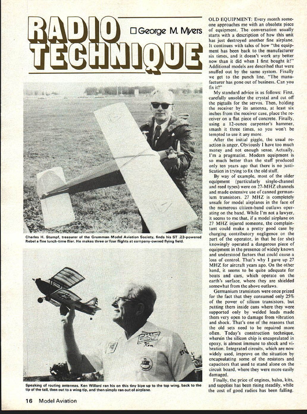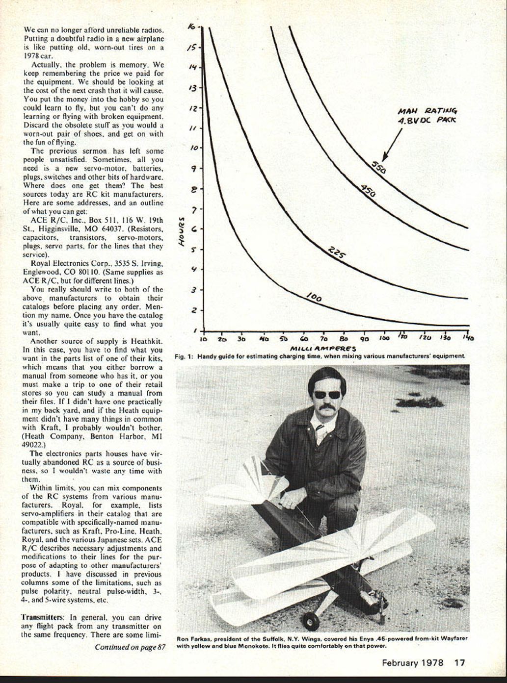 IIGeorgeMMyers OLD EQUIPMENT month some approaches obsolete piece equipment conversation usually starts description bow unit has just destroyed another fine airplane continues tales equip ment has back manufacturer six times doesnt work better now did first bought Additional models described snuffed out same system Finally get punch line manu facturer has gone out business Can fix standard advice follows First carefully unsolder crystal cut off pigtails servos holding receiver its antenna least six inches receiver case place re ceiver flat piece concrete Finally using 12-ounce carpenters hammer smash three times wont tempted use After initial giggle usual re action anger Obviously have too much money enough sense Actually Im pragmatist Modern equipment much better stuff produced ten years ago no justi fication trying fix old stuff way example older equipment particularly single-channel reed types 27-MHZ channels made extensive use canned german ium transistors 27 MHZ completely unsafe model airplanes face numerous citizen-band outlaws oper ating band Im lawyer seems model airplane 27 MHZ injured someone complain tant could make pretty good case charging contributory negligence part operator knowingly operated dangerous piece equipment presence widely known understood factors could cause loss control Thats gave up 27 MHZ aircraft years ago other hand seems quite adequate boats cars operate earths surface shielded somewhat above outlaws Germanium transistors once prized fact consumed 25% power silicon transistors putting inside cans supported welded leads made very open damage vibration shock Thats reasons old sets need repaired often Todays construction technique wherein silicon chip encapsulated epoxy almost immune shock vi bration Integrated circuits now widely used improve situation encapsulating some resistors capacitors used stand alone circuit board easily damaged Finally price engines balsa kits supplies has rising steadily cost good radios has falling 16 Model Aviation 4 Charles H Stumpf treasurer Grumman Model Aviation Society finds ST 23-powered Rebel fine lunchtime flier makes three four flights company-owned flying field Speaking routing antennas Ken Willard ran tiny bipe up top wing back tip tail out wing tip simply ran out airplane can no longer atiord unreliable radios Putting doubtful radio new airplane like putting old worn-out tires 1978 car Actually problem memory keep remembering price paid equipment should looking cost next crash will cause put money hobby could learn fly cant learning flying broken equipment Discard obsolete stuff would worn-out pair shoes get fun flying previous sermon has left some people unsatisfied Sometimes need new servo-motor batteries plugs switches other bits hardware does get best sources today RC kit manufacturers some addresses outline what can get ACE R/C Inc Box 511 116 W 19th St Higginsville MO 64037 Resistors capacitors transistors servo-motors plugs servo parts lines service Royal Electronics Corp 3535 5 Irving Englewood CO 80110 Same supplies ACE R/C different lines really should write both above manufacturers obtain catalogs before placing order Men tion name Once have catalog its usually quite easy find what want Another source supply Heathkit case have find what want parts list kits means either borrow manual someone has must make trip retail stores can study manual files didnt have practically back yard Heath equip ment didnt have things common Kraft probably wouldnt bother Heath Company Benton Harbor MI 49022 electronics parts houses have vir tually abandoned RC source busi ness wouldnt waste time Within limits can mix components RC systems various manu facturers Royal example lists servo-amplifiers catalog compatible specifically-named manu facturers such Kraft Pro-Line Heath Royal various Japanese sets ACE R/C describes necessary adjustments modifications lines pur pose adapting other manufacturers products have discussed previous columns some limitations such pulse polarity neutral pulse-width 3- 4- 5-wire systems etc Transmitters In general can drive flight pack transmitter same frequency some limi Con tinued page 87 3 /09 0 93I I0 MAN RA Ti AIC 48V0C PACI / February 1978 17 S. 2o3oEo5bGo7oaoqoico to/203oIva MJLLa q*fiERE5 Fig 1 Handy guide estimating charging time mixing various manufacturers equipment Ron Farkas president Suffolk NY Wings covered Enys 45-powered from-kit Wayfarer yellow blue Monokote flies quite comfortably power concentrate put less effort money trying perfect liquidcooled in-lines lower weight re duced maintenance first partly can celled out greater drag radial NACA developed its clean round cowling became possible build radial-engined planes fast in-line brothers still being demonstrated Reno Air Races Bearcats have won twice races Mustangs Wright J-5 R-790 won pres tigious Collier Trophy its makers 1927 soon led R-975 used some Beech Staggerwings prede cessor AT-6 R-1820 Cyclone used B-25 finally R-3350 used B-29 Constellation original J-5 bore 4 stroke 5/2 weight 508 lbs compression ratio 52 1 developed its 200 hp 1800 rpm Along immensely popular line radial engines 1920s 1930s some considerably less well known some cases radical designs nevertheless made own con tributions history devices make propellers go around airplanes go forward include barrel cam engines sleeve-valve designs lat ter British speciality Bristol engines type used thousands RAF bombers style piston engine has long used road vehicles brief success airplanes diesel After considerable experience German dirigibles tried airplanes Packard built good enough set non-refueling duration record 84 hours Ger mans brought diesel its greatest point Junkers Jumo 6-cylinder verticallyopposed water-cooled diesel used some extent pre-war airliners tracted attention powering Ju-86P high-altitude spy plane during early days World War II took spe cial model Spitfire climb above 40000 feet oil-burner working unmolested end line compression-ignition e