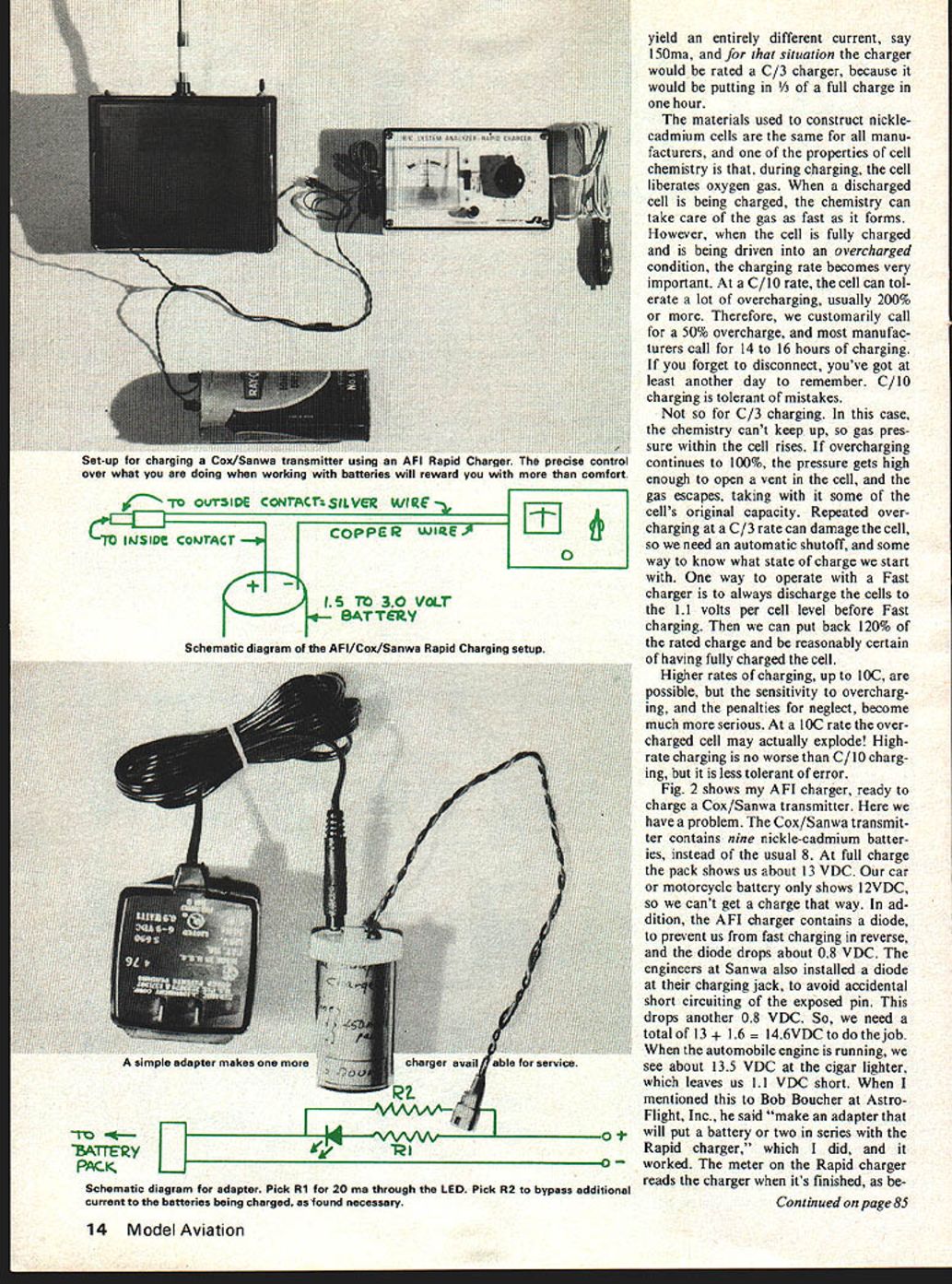 George Nt Myers THE MAN says its time talk about charging batteries again goes Ill try put few new items just wont bore have heard fore should obvious people use charger came RC sys tem according instruction packed box really dont need additional information So wheres problem two basic types problems first type impatience forget charge batteries until ready go flying decide need Quick Fast Rapid charger buy worry have done right thing buy flight pack batteries rated differently pack came system need some way know whether or charge system charger Corollary situation need new charger can charge everything once Fig 1 shows representative collection chargers have acquired used over years Beginning oclock position reading clockwise see KF Uni-charger ca 1960 basically model railroad transformer rectifier meter two ranges 0125ma constant-current charging small batteries 0-125 amps unreg ulated charging motorcycle batteries like Pro-line simultaneous charger two 48 VDC packs transmitter 48VDC pack receiver battery eliminator pocket calculator has fitted adapter permit charging 450-maH flight pack Since charger has no pilot light adapter includes LED purpose Cannon charger simultaneous charging 96 VDC transmitter 225-maH 48VDC receiver pack An adapter made two Deans connec tors resistor facilitate charging l00-maH flight pack Cox/Sanwa charger simultane ously charging 108 VDC transmitter pack 450-maH 48VDC receiver pack Note looks like Cannon charger actually quite different 9 oclock position An Ace R/C Inc metered van-charger unit provides constant-current source adjustable lOOmaH batteries I5VDC cute part device LED glows connect pack correctly before turning charger will glow backwards especially nice because meter indicates current going out re gardless have connected pack being charged typical metered chargers general Astro-Flight Inc R/C System Analyzer & Rapid Charger unit capable doing battery pack discharge test 10 minutes recharging pack completely 30 minutes use recom mend unit explains extra switch middle panel pack adapters above im portant features unit meter mechanical clock/switch may forget clock wont center display Kraft Fast Charger ca 1972 fig ured embarassment some wellknown fliers recently used according instructions came charger works exactly should point above descriptions units serves useful purpose no such thing best charger best way charge batteries hope answers some letters have received request plans best unit doubt use came system fol low instructions Before proceeding circuitry should state couple definitions charging battery cause chemical changes within cell permit give back electrical current period time dimensions capacity C work stored battery cells ordinarily used RC systems defined milli amperes X hours maH Note capacity capacitance -measure properties condenser also marked C battery charger used charge battery battery pack charger gives current battery order relate properties charger properties battery measure charging current compare cur rent battery rated yield hours Therefore find common RC system batteries rated 45OmaH usual charger puts about 45 ma charger rated C/b charger 45ma a get 10 Connected single cell charger may March 1978 13 An assortment specialpurpose battery chargers See text descriptions Knowing condition battery pack proper charging dependability saves airplane COPP2R UJIE.P lD%fSlD COIJTACT 30 BATTERY 0 Schematic diagram adapter Pick Ri 20 ma through LED Pick R2 bypass additional current batteries being charged asfound necessary yield entirely different current say SOma situation charger would rated C/3 charger because would putting full charge hour materials used construct nickle cadmium cells same manu facturers properties cell chemistry during charging cell liberates oxygen gas discharged cell being charged chemistry can take care gas fast forms However cell fully charged being driven overcharged condition charging rate becomes very important C/l0 rate cell can tol erate lot overcharging usually 200% Therefore customarily call 50% overcharge manufac turers call 14 16 hours charging forget disconnect youve got least another day remember C/10 charging tolerant mistakes C/3 charging case chemistry cant keep up gas pres sure within cell rises overcharging continues 100% pressure gets high enough open vent cell gas escapes taking some cells original capacity Repeated over charging C/3 rate can damage cell need automatic shutoff some way know what state charge start way operate Fast charger always discharge cells 11 volts per cell level before Fast charging can put back 120% rated charge reasonably certain having fully charged cell Higher rates charging up bC possible sensitivity overcharg ing penalties neglect become much serious lOC rate over charged cell may actually explode Highrate charging no worse C/l0 charg ing less tolerant error Fig 2 shows AFI charger ready charge Cox/Sanwa transmitter have problem Cox/Sanwa transmit ter contains nine nickle-cadmium batter ies instead usual 8 full charge pack shows us about 13 VDC car motorcycle battery shows I2VDC cant get charge way ad dition AFI charger contains diode prevent us fast charging reverse diode drops about 08 VDC engineers Sanwa also installed diode charging jack avoid accidental short circuiting exposed pin drops another 08 VDC So need totalof 13 146VDCtodothejob automobile engine running see about 135 VDC cigar lighter leaves us 11 VDC short mentioned Bob Boucher Astro Flight Inc said make adapter * will put battery two series Rapid charger did worked meter Rapid charger reads charger its finished beCon tinued page 8S 14 Model Aviation out-up rut urcring .uat catuwa iarr,ciurarm nr Rapid Chargerpruuau urrru over what doing working batteries will reward comfort W OUTSIDE CONTACT SILVER WIRE - Schematic diagram AFI/Cox/Sanwa Rapid Charging setup simple adapter makes - ERYT V Letters Editor continued page 60 States Air Force have building flying models since age 13 am enclosing pic