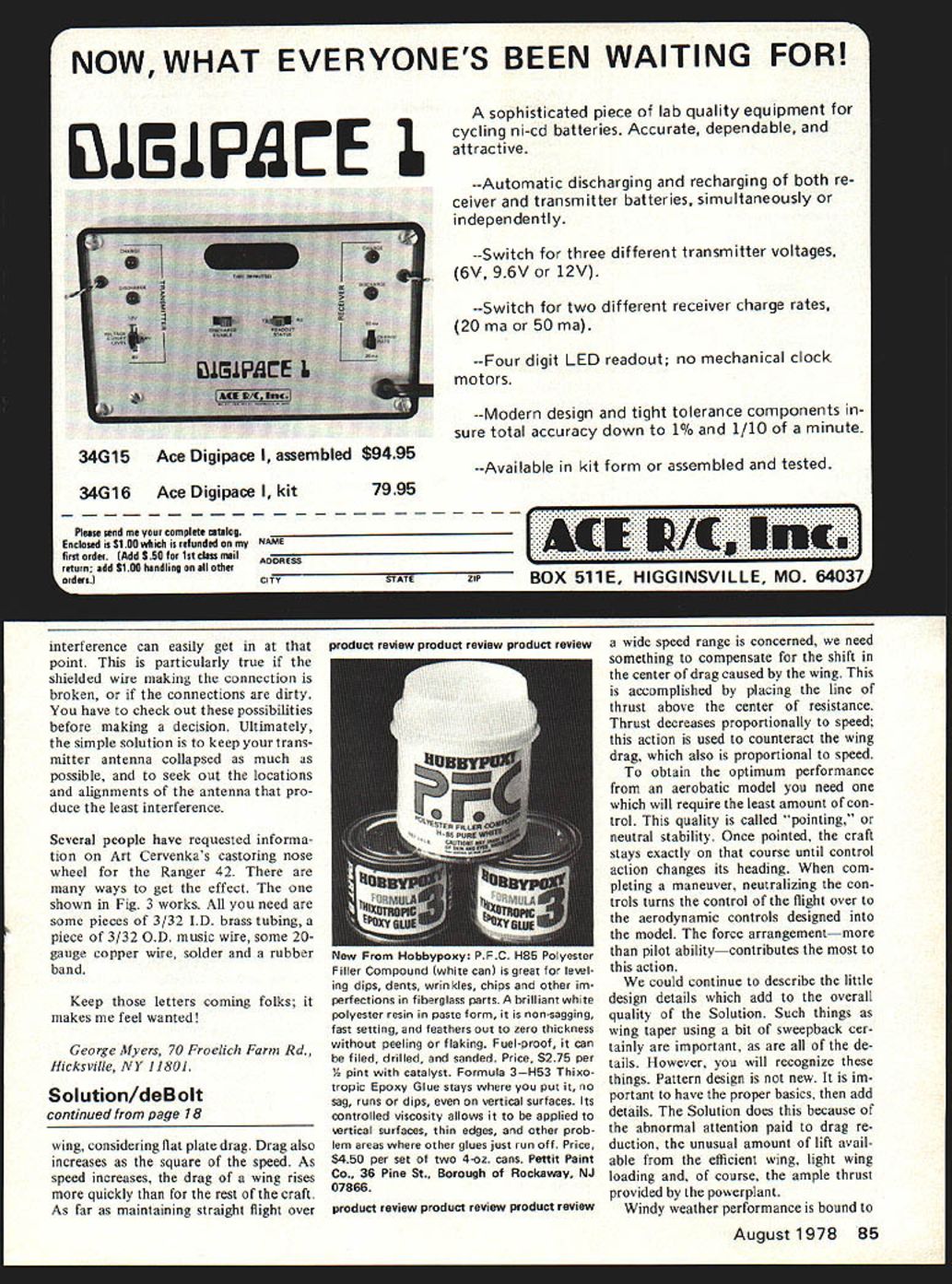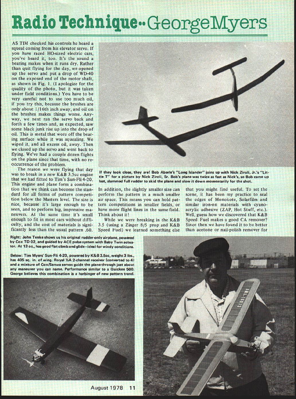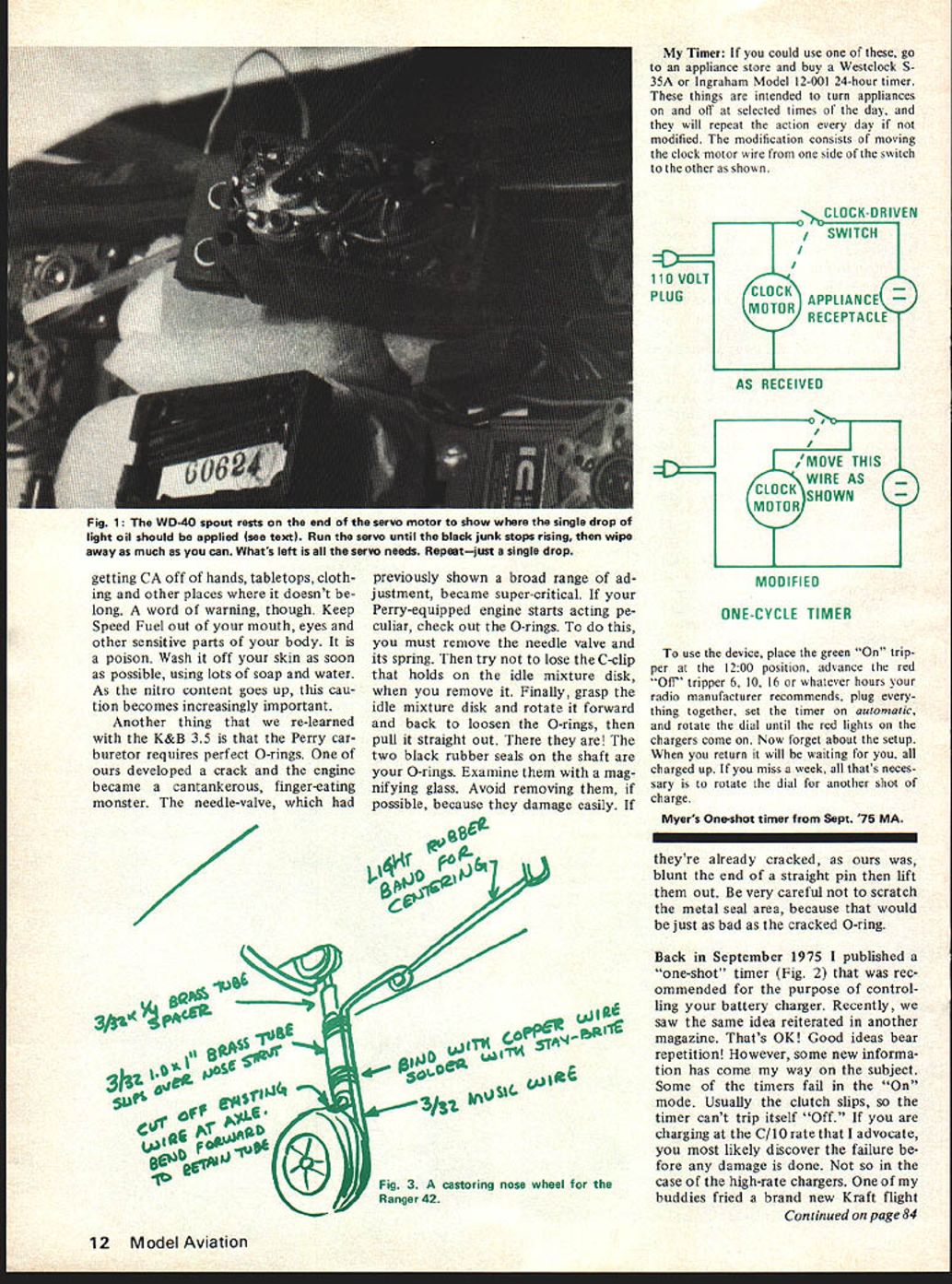 tfle Laken have much oil ushes oil L11t brushesworse Any way next ran servo back forth few times expected saw some black junk rise up drop oil metal wore off bear ing surface squealing wiped excess oil away closed up servo went back flying Weve couple dozen flights plane since time no re occurrence problem reason flying day break new K&B 35 cc engine fitted Tims Sun-Fli 4-20 engine plane form combina tion think can become stan dard forms pattern competi tion below Masters level size nice because its large enough seen perform big impressive ma neuvers same time its small enough fit cars diffi culty cost materials signi ficantly less usual pattern 60 look close arel Bob Aberles Long Islander joins up Nick Ziroli Jrs Littie T picture Nick Ziroli Sr Bobs plane twice fast Nicks Bob came up last slammed full rudder skid plane slow down momentarily shot addition slightly smaller size can perform pattern much smaller air space means can hold pat tern competitions smaller fields have flight lines same field Think about breaking K&B 35 using Zinger 8/5 prop K&B Speed Fuel learned something else might find useful set scene has practice seal edges Monokote Solarfilm similar iron-on materials cyano acrylic adhesive ZAP Hot Stuff etc Well guess discovered K&B Speed Fuel makes good CA remover Since have found better acetone nail-polish remover Right John Tenke shows us original rudder-only airplane powered Cox TD 02 guided ACE pulse system Baby Twin actua tor 13 oz has good flat climb glideideal windy conditions August 1 978 11 Below Tim Myers Sun-Ri 4-20 powered K&B 35ccweighs3 lbs has 405 sq wing Royal ~6A 2-channel receiver convened 4 mixture Cox/Sanwa servos guide plane through just about maneuver can name Performance similar Quickee 500 George believes combination harbinger new pattern trend getting CA off hands tabletops cloth ing other places doesnt long word warning though Keep Speed Fuel out mouth eyes other sensitive parts body poison Wash off skin soon possible using lots soap water As nitro content goes up cau tion becomes increasingly important Another thing re-learned K&B 35 Perry car buretor requires perfect 0-rings developed crack engine became cantankerous finger-eating monster needle-valve previously shown broad range ad justment became super-critical Perry-equipped engine starts acting pe culiar check out 0-rings must remove needle valve its spring try lose C-clip holds idle mixture disk remove Finally grasp idle mixture disk rotate forward back loosen 0-rings pull straight out two black rubber seals shaft 0-rings Examine mag nifying glass Avoid removing possible because damage easily Timer could use go appliance store buy Westclock S 35A Ingraham Model 12-001 24-hour timer things intended turn appliances off selected times day will repeat action day modified modification consists moving clock motor wire side switch other sho n dO CK- DRIVEN / SWITCH / 110 VOLT PLUGCLOCKAPPLIANCE MOTORRECEPTACLE AS RECEIVED / MOVE THIS WIRE AS CLOCK SHOWN MOTOR MODIFIED ONE-CYCLE TIMER use device place green trip per 1200 position advance red Off tripper 6 10 16 whatever hours radio manufacturer recommends plug thing together set timer automatic rotate dial until red lights chargers come Now forget about setup return will waiting charged up miss week thats neces sary rotate dial another shot charge Myors One-shot timer Sept 75 MA LJ i,, 3/L Fig 3 castoring nose wheel fRanger 42 theyre already cracked blunt end straight pin lift out very careful scratch metal seal area because would just bad cracked 0-ring Back September 1975 published one-shot timer Fig 2 rec ommended purpose control ling battery charger Recently saw same idea reiterated another magazine Thats OK Good ideas bear repetition However some new informa tion has come way subject Some timers fail mode Usually clutch slips timer cant trip itself Off charging C/l0 rate advocate likely discover failure fore damage done case high-rate chargers buddies fried brand new Kraft flight Continued page 84 12 Model Aviation Fig 1 WD-40 spout rests end servo motor show single drop light oil should applied see textl Run servo until black junk stops rising wipe away much can Whats left servo needs Repeatjust single drop 4 LUTON Minor A34,fliIW3,79&I 7 L3rn ddi*hITI High ft 73N 7311 T0 33 flyiR 29fl3.I A/C See dealer NOW NE3Y KITS OF WORLD CLASSIC AIRCRAFT FROM FLYLINE 373 1173 IiNp73. 933 Ap9RR7djV7VflhIRd K 119 99 3311 S319939 V93 1313 337337 373. 03313 Z Send 2Sf catalog oil FLYLINEs classic kits FLYLINE MODELS INC AR2000RRAVeIuR IR133 drops out batteries discharged comes like spoilers steep steady descent easy get right back tight little lot climbed out also bothered wind no problem wind up 15 mph However isnt particu larly fast flier about 25-30 mph beginners can fly Mitch Poling Seattle WA Smallest CL Plane am trying locate plans small est recorded control line plane ever flown Could please tell would have send get such information reason am doing because friend going try fly smallest smaller would appreciate could help Randy Patterson Roscommon MI dont think anyone knows sure built smallest CL model youll find something interesting page 61 April issue Model Aviation keep light use wider chord area probably could make smallerperhaps keep clipping wing tiny bit time will arrive smallest thing will fly dont fall old trap smaller wings must make plane faster Speed fliers went way years ago learning ship assume angle attack generate enough lift remain airborne just flew slower must enough area thing get step Help Wanted am process building first radio control model would like get touch local clubs may area south west city Boston know clubs Framingham Bridgewater Mas sachusetts Framingham called believe Charles River Club However know name contact person could send information give letter someone could would appreciate very much Before closing must say Model Aviation very superior publication have right proud April issue must qualify best issues magazine f