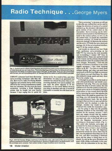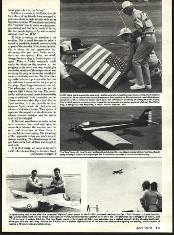 I SPENT pleasant lunch-hour discussing servo-reversing techniques Bob Ab erie Bob reviews radios Flying Models magazine probably knows what being offered various manufacturers better salesman also owns latest equipment including Kraft Signature system bought last year partly because kept urging him spend money As result other discussions came agreement someone has missed point servoreversing methods sent market want plane adjusted fit transmitter vice-versa Before showing what decided would reasonable consider deed can done Servo-reversing term will use describe method can used change direction motion control surface eg elevator respect given motion control stick transmitter Servo-reversing can intro duced several points link hand control surface wit 1 control stick 2 Inside transmitter electronic package 3 Inside receiver electronic package 4 Between receiver servo 5 Inside servo electronic package 6 servo/pushrod interface 7 control surface Last month showed Hank Prew performed servo-reversing MRC772 removing stick assembly re-installing rotated 1800 its original position sets can reversed manner primary disadvantage method location trim lever changes Personally find variety trim-lever locations biggest nuisances face teaching others fly RC have reach looking need such first test flight someone elses plane cant find So method cheap quick easy has better way 1 It might possible cut leads stick potentiometer install nonpolarized 3-pin plug can simply reverse plug reverse action will have re-zero system some way servo can re-zeroed pushing screw-driver hex-wrench down hole left removing screw attaches output wheel might good way thing will spread wear servo-potentiometer track disad vantage have open up both transmitter airplane make changes Another way would add electrical trim inside transmitter case 2 Im going skip over possible electronic revisions transmitter receiver moment because dont have simple circuits readers can incorporate existing sets However need refer Kraft ads see Signature incorporates servoreversing front-panel switch Fig 1 panel also includes servo-span ad justment dual-rate feature Bob tells saves least days building time time uses Signature because installs servos fit best runs pushrods out way after everything buttoned down plane sitting its wheels sets up servo directions spans sitting comfortably easy chair transmitter lap Boy 18 Model Aviation FIg 1 Control panel Bobs Kraft Signature shows extra control adjustments have make because can make Ideal type transmitter someone has move design another times year Bob does Once get comfortable box can fly anything wIth 01 George has hIs crates wall trimmed just grab Fig2 ACE RIC Bantam Midget machinery Bantam case some servo reversing options considered text topto bottom servo DIP switch Noble switch prototype servo reverser Text covers variety ways achieve servo reversing some guys rub dont snake Eden also least three friends have managed put some dents aircraft using Signature systems knob provided permits make adjustment darned well better make So still see people trying fly reversed ailerons dont Bob 3 Next attract attention receiver small increase price would possible include servo-reversing part decoder Now opinion real opportunity lies Assuming have 3-wire servos two options First would change servo plugs 5-wire unpolarized types 5-wire receptacle could easily wired receiver plugging servo way would give clockwise rotation output wheel inverting plug socket would give counter-clockwise rotation disadvant age scheme price fact will have remove wing get plugs forget reverse servo advantage once get airplane right stays way poten tial aileron reversal can eliminated using polarized 3-pin connector aileron extension cable dont like 5-pin solution also possible have separate 3-pin sockets clockwise counter-clockwise rotation piece tape over unused sockets eliminates aileron reversal problem servos need changed 4 Several manufacturers make in-line servo reversers need open connection between receiver servo insert items accomplish servo-reversing advantage approach dont have change anything disadvantage have extra bulk dollars weight deal 5 & 6 Finally come servo itself obvious thing faced Continued page 98 April1979 19 RC filers need practice safe reliable operation need Important comes toAirShowteamsthe Image portray affects us Photo lastysars Nats shows mnbers Florida Air Show Team Col Art Johnson controls checking Flying kt-k 4or properly closedused tow banners opening end show Flying ira Taurus IIlana ruaaersuDoorsal Tin sweptoacwings wiin vorKexrIIps upur Poxy fuselage Power Supertlgre 80 floatsso perhaps too demanding A-i Congratuiating other after successfui flight giant model C-130 Lockheed Hercules Cpl Tax Bryson L pilot Sgt Dennis Scott both Royal Australian Air Force presently operates 24 130s Hercules has wingspan 138 118 long weighs 264 lbs first flight made Edinburgh Airfield near Adelaide saw perfect takeoff six big circuits touch down just iike real thing Insured $5000 perfect reproduction Hercules lighting seating capable making 48 model-man parachute drop Openers/Winter continued page 72 have something tell As RCer FOs chief interest CL Racing frantic aerobatics pilots center circle will find Bill Lee CL Racing talking about home-made fibreglass props Bill Wynn Paul too guy endlessly seeks truth about tanks things like props doing experimenting finding para meters Dave Chesney writes beautifully RC Helicopters column existence now Bill Warner Sport/Scale will put humor life flying circus note others gang Without guys like us would never know about hundreds things add up sum total skills Brad Powers lead article floats quarter-scale landmark article Model aviation old century yet explosion knowledge techniques products never dared dream about what know about floats would fit smallest drawer field box So designer partook dozens famous pro jects made history modeler boot telling us design float virtuall