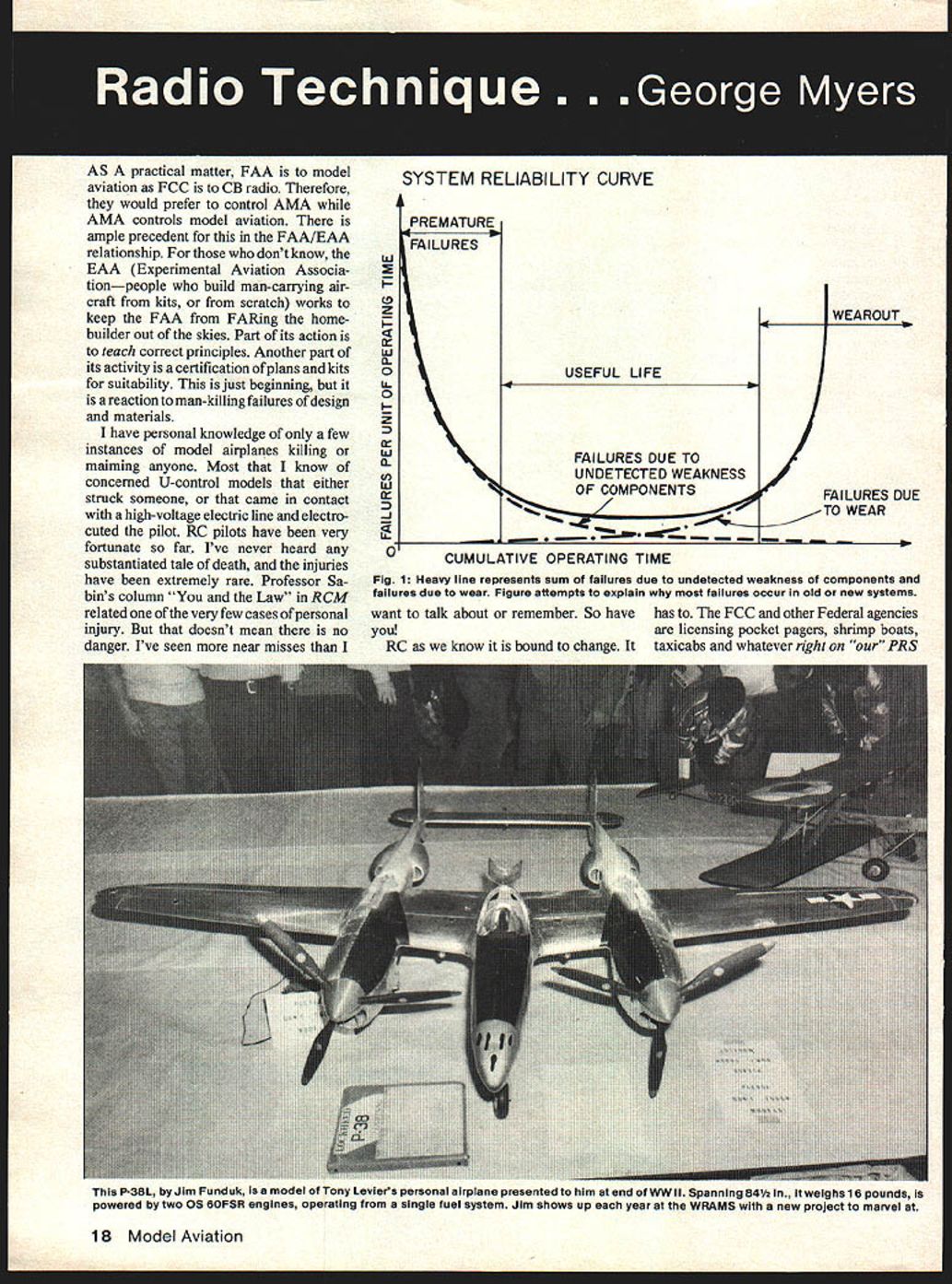 AS practical matter FAA model aviation FCC GB radio Therefore would prefer control AMA AMA controls model aviation ample precedent FAA/EAA relationship dont know EAA Experimental Aviation Associa tionpeople build man-carrying air craft kits scratch works keep FAA FARing homebuilder out skies Part its action teach correct principles Another part its activity certification plans kits suitability just beginning reaction man-killing failures design materials have personal knowledge few instances model airplanes killing maiming anyone Most know concerned U-control models either struck someone came contact high-voltage electric line electro cuted pilot RC pilots have very fortunate far Ive never heard substantiated tale death injuries have extremely rare Professor Sa bins column Law RCM related very few cases ofpersonal injury doesnt mean no danger Ive seen near misses w z w 0 0 U 0 I— z w 0 Cl ha -J 0 SYSTEM RELIABILITY CURVE PREMATURE FAILURES USEFUL LIFE FAILURES DUE TO UNDETECTED WEAKNESS ULATIVE OPERATING TIME IWEAROUT U / FAILURES DUE TO WEAR Fig 1 Heavy line represents sum failures due undetected weakness components failures due wear Figure attempts explain failures occur old new systems want talk about remember So havehas FCC other Federal agencies youare licensing pocket pagers shrimp boats RC know bound change Ittaxicabs whatever right PRS 18 Model Aviation P-38L Jim Funduk isa model Tony Leviers personal airplane presented him end WW II Spanning 841/2 weighs 16 pounds powered two OS 6OFSR engines operating single fuel system Jim shows up year WRAMS new project marvel 72 MHz frequencies limited 3/4 watts less allowed 300 watts limited Al RF pulse operation allowed FM voice operation fly shoot us down. tough No protection interference says FCC Interference will stand up defense opinion After knew could happen took risk Reliability term use des cribe confidence something will work way want Simple things can very reliable rock makes very reliable paperweight say has reliability 1 helium-filled bal loon has almost no value paperweight say has reliability 0 coin usually has two faces reliability coin landing Heads Up time flip 05 unless something improve performance some have known Complex things can very reliable RC systems very reliable So come RC airplanes crash will state proof 90% crashes result two causes 1 Pilot Error 2 Poor Maintenance else explain airplane flies ground operating cor rectly under perfect control What other explanation can give loss control surface hinges flight still have other 10% well remem ber recent vertical dive ground Scared tar out pilot/owner cause hard find eventually found wire broken inside large strain relief manu facturer molded wire prevent such failure reliability complex systems varies during lifetime variation traces back undetected weaknesses built system wearout compo nents shown Fig 1 high rate early failures usually taken care manufacturer operates system before selling what build own parts kit case good idea run system bench before installing plane flight long should run Look situation way will have charge discharge new battery pack 3 4 times form will take hold full charge would wise use charge/dis charge cycles burn system other end operating time Wearout keeps getting closer result shock vibration well service Some things watch Wires break due excessive bending straightening particular resist temptation twist servo pigtails stiffer bundle Keep loose Servo motors get sticky noisy slow down usually result accumulation trash commutator track can sometimes get rid drilling small hole side servomotor spraying TV tuner cleaner other cases can dismantle motor cleaning enough interest can put together column mainte nance myself prefer simply re place motor Potentiometers Wear problem Sometimes have wipe off carbon track assuming have finger-tip get rid brass particles have worn off wiper always worth try wiper shows enough wear make think end about bend break off replace wiping off carbon resistor finger doesnt help try washing some denatured alcohol bend wiper fingers little bit increase contact pressure doesnt restore like-new performance replace Batteries Batteries begin some ability store charge time recharge ability diminishes After couple hundred cycles ability hold charge will half what new happens replace Vibration bad batteries Pack loosely foam want long service life Vibration causes internal short circuits reduces range weakens output servos also causes open circuits Fortunately open circuits rare S Other components no simple way explain capacitor changes value and/or starts leaking just no simple way predict inte grated circuit decides quit careful study problem can sometimes traced back intrusion atmospheric contanil nants cumulative effects high operating temperatures old nemesis vibration tried leave impression few catastrophic failures inherent operation RC systems true question what should about Traditionally model aviation activities have conducted remote locations public danger practically non existant Remote locations thing has become practically non-existant now flying right publics pocket sometimes very real way question has become Can afford failure AMA provides insurance cases cost insurance plus Model Aviation plus other benefits membership such nationwide rules competition contest coordination plus representation worldwide matters affect ing model aviation representation federal level bureaucracies like FAA FCC comes less dues local club really want hurt anyone course systems series string compo nents component fails system fails no alternate paths control Two years ago saw device offered consisted voltage sensor Lithium battery idea voltage receiver dropped reason backup battery automatically came service great ideal wish now paid attention cant find sales literature device would have prevented frightening crash des cribed above Dont bother writing Continued page 102 Jujy 1979 19 Quadra-powered -scale Art Scholls PiUs 