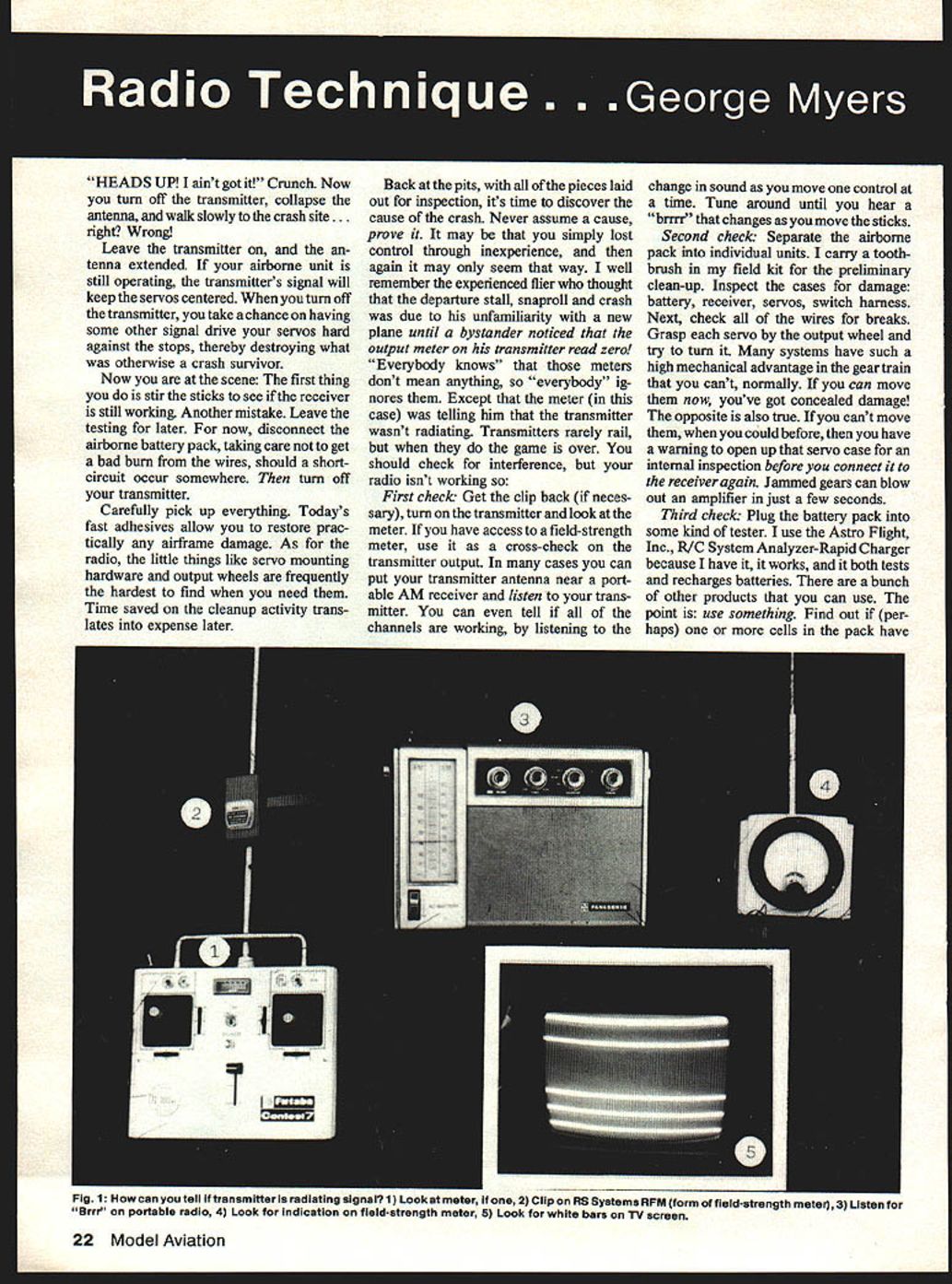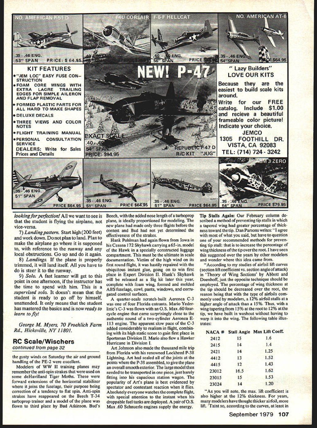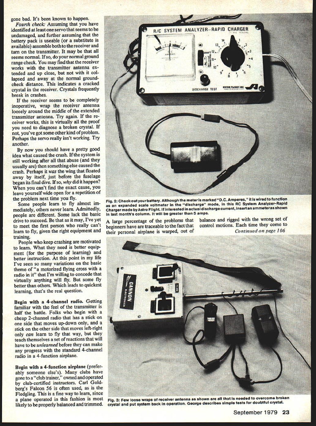 HEADS UP aint got Crunch Now turn off transmitter collapse antenna walk slowly crash site. right Wrong Leave transmitter tenna extended airborne unit still operating transmitters signal will keep servos centered turn off transmitter take chance having some other signal drive servos hard against stops thereby destroying what otherwise crash survivor Now scene first thing stir sticks see receiver still working Another mistake Leave testing later now disconnect airborne battery pack taking care get bad burn wires should shortcircuit occur somewhere turn off transmitter Carefully pick up everything Todays fast adhesives allow restore prac tically airframe damage As radio little things like servo mounting hardware output wheels frequently hardest find need Time saved cleanup activity trans lates expense later Rack pits pieces laid out inspection its time discover cause crash Never assume cause prove may simply lost control through inexperience again may seem way well remember experienced flier thought departure stall snaproll crash due unfamiliarity new plane until bystander noticed output meter transmitter read zero Everybody knows meters dont mean anything everybody ig nores Except meter case telling him transmitter wasnt radiating Transmitters rarely rail game over should check interference radio isnt working First check Get clip back neces sary turn transmitter look meter have access field-strength meter use cross-check transmitter output cases can put transmitter antenna near port able AM receiver listen trans mitter can tell channels working listening change sound move control time Tune around until hear brrrr changes move sticks Second check Separate airborne pack individual units carry tooth brush field kit preliminary clean-up Inspect cases damage battery receiver servos switch harness Next check wires breaks Grasp servo output wheel try turn systems have such high mechanical advantage gear train cant normally can move now youve got concealed damage opposite also true cant move could before have warning open up servo case internal inspection before connect receiver again Jammed gears can blow out amplifier just few seconds Third check Plug battery pack some kind tester use Astro Flight Inc R/C System Analyzer-Rapid Charger because have it works both tests recharges batteries bunch other products can use point use something Find out per haps cells pack have 22 Model Aviation Fig 1 can tell transmitter radiating signal 1 Look meter 2 Clip RS Systems RFM form field-atrengtn meter7 3 Listen Brrr portable radio 4 Look indication fieldatrength meter 5 Look white bars TV screen gone bad Its known happen Fourth check Assuming have identified least servo seems undamaged further assuming battery pack useable substitute available assemble both receiver turn transmitter may seems normal normal ground range check may find receiver works transmitter antenna ex tended up close col lapsed away normal groundcheck distance indicates cracked crystal receiver Crystals frequently break crashes receiver seems completely inoperative wrap receiver antenna loosely around middle extended transmitter antenna Try again re ceiver works virtually proof need diagnose broken crystal youve got some other kind problem Perhaps servo really isnt working Try another now should have pretty good idea what caused crash system still working after abuse usually something else caused crash Perhaps wing floated away itself just before fuselage began its final dive did happen cant find exact cause leave yourself wide open repetition problem next time fly Some people learn fly almost im mediately others never learn Admittedly people different Some lack basic drive succeed may Ive yet meet first person really cant learn fly given right equipment training People keep crashing motivated learn What need better equip ment purpose learning better instruction point life Ive seen variations basic theme motorized flying cross radio Im willing concede virtually anything will fly some fly better others Which leads quickest learning thats real question Begin 4-channel radio Getting familiar feel transmitter half battle Folks begin cheap 2-channel radio has stick side moves up-down stick other side moves left-right can learn fly way teach themselves set reactions will have unlearned before can make progress standard 4-channel radio 4-function airplane Begin 4-function airplane prefer ably someone elses clubs have gone club trainer owned operated club-certified instructors Carl Gold bergs Falcon 56 often used Fledgling fine way learn since plane operated fashion Fig 5 Few iOOSG wraps OT reuvur ai,,i5 shown sit needed overcome broken likely properly balanced trimmed crystal put system back operation George describes simple tests doubtful crystai September1979 23 wheel pants canopies etc works home oven hose type vacuum cleaner FOECAT@R MOLD YOUR OWN PARTS FOR PLANES BOATS CARS ETC PLASTICBulk Pack Vacuum former piastics ASS PIAlw Sheets foe Form alto Easy make own cowlsAllah Btho17 Packs Only PCSPACK THICKNESS PER PACK PRICE 0201/50301300 030 1132201300 045 3/64131300 0601/16101300 0903/3261300 Assortment Pack see below 1300 Aootowt Pooh no0300 0020/ *oa%3.o45 2550/ 000 1000 ohot. y pooh p12 0000 oOwd wilt Fowtoto ALL AM S winE Over 3/ Lbs per pack Idea Development Inc ox 7399 rk Delaware 19711 Instructions assembly & use Included $39 Lincludes A88t Pack ABS SHIPPED PREPAID 9VIA UPS US ONLY dealer order direct Qualified Dealer Inquiries Invited new ruleasos Bucker ITTTMEISTER radio control lwingspan Seagulltor rubber available soon C 02 power SEE YOURsend 254 DEALER NOWcatalog FLYLINE MODELS INC 2820 DORA AVENUE RIO FAIRFAX VIRON2 22031703 RIO 2238 ANNOUNCING Post Stoop Climb FLat Slow Glide 4 new P 30 class model designed novice mind ond has potential won toughest THE POTENT30 Deluxe kit leatures include Rolled balsa lusela no ond wing mount dl Completed prop d nose plug tail plug & rudder Precut wing ribs spar notches job rated balsa strips 