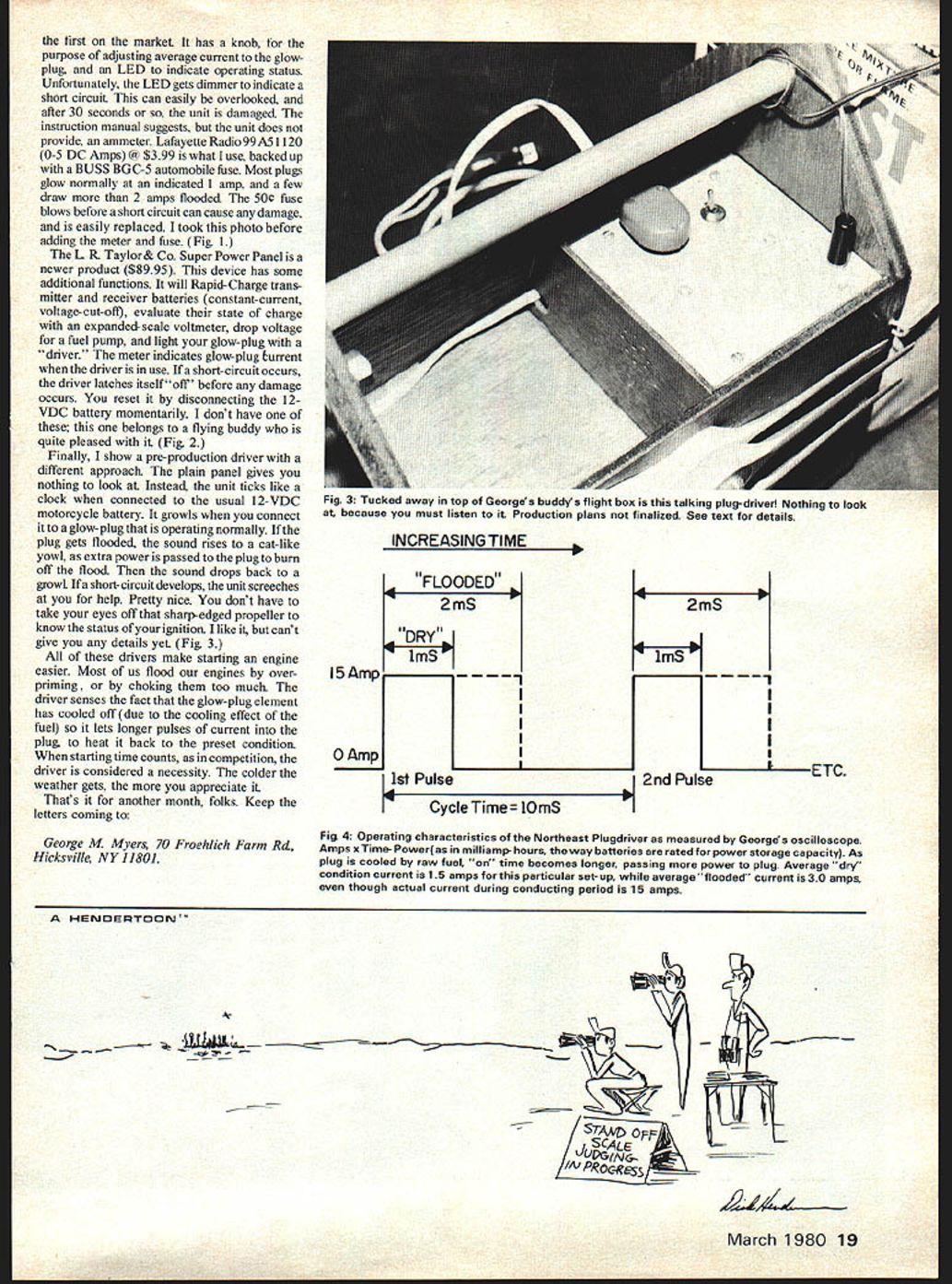 George Myers GLOW-Plug Drivers glow-plug elec trical resistance gets hot run electrical current through Most designed reach temperature about 1 2000F installed dry engine powered 15VDC battery few designed 2-VDC lead/acid battery Without glow engine wont go Thats fundamental also explanation engine starting troubles Any engine will run has fuel air compression point ignition Miss requirements itwontrun three ways light glow-plug 1 Constantvoltage 2 Constant current 3 Pulsed current familiar Nicad clip leads constant-voltage device insert am meter leads will see dry plug draws about 15 amps youflood fuel oil current will increase about 5 amps current varies according power taken glowing element its environment Remember well come back again put power resistor series 12-VDC starter battery done some power panels create constant-current device current drawn glow-plug remains its pre-selected value regardless flooding Constant-current devices take longerto burn off flooded condition because lack ability supply large currents needed Glow-plug drivers constitute third class devices work approximately same way high voltage usually about 6 VDC pushes short spurts high current about 20 amps through glow-plug Fig 4 current continuous plug would bum out immediately like fuse on-off time ratio adjusted electronically average current through dry plug familiar 15 5 amps time-ratio variation gives glow driver its major advantage ability bum off flooded conditions automatically rapidly above require clean solid connections order work right penalty dirty connections constant-voltage constantcurrent device plug wont light penalty dirty connections pulsed-current device can severe Due higher available voltage automatic currentadjusting capability dirty connection may cause plug burn out contact estab lished everything right engine refuses start want know Thats like see meter kind glow-plug igniter current reads 0 either have bad connection battery dead plug has failed doesnt take long find out culprit current normal engine isnt running trouble has fueL Once again its easy prime engine see does good current too high have short circuit flooded plug damaged plug Once again know look Looking some representative glow-plug driv ers what find Northeast Engineering Plugdriver Kit price $2850 Assembled $3495 18 Model Aviation Fia 1 Northeast Engineering Plugdriver Except Du-Bro clip George added way widely used dri.k.. 1-1g ISle super inower Panel L R Taylor & Co combines just about features would want electrical ground-support system Face inscriptions fill picture first market has knob purpose adjusting average current glowplug LED indicate operating status Unfortunately LED gets dimmer indicate short circuit can easily overlooked after 30 seconds Unit damaged instruction manual suggests unit does provide ammetcr Lafayette Radio 99 AS 1120 0-5 DC Amps@ $399 iswhatluse backed up BUSS BGC-5 automobile fuse Most plugs glow normally indicated amp few draw 2 amps flooded 50 fuse blows before short circuit can cause damage easily replaced took photo before adding meter fuse Fig L K Taylor& Co Super Power Panel newer product $8995 device has some additional functions will Rapid-Charge trans mitter receiver batteries constant-current voltage-cut-of evaluate state charge expanded-scale voltmeter drop voltage fuel pump light glow-plug driver meter indicates glow-plug current driver use short-circuit occurs driver latches itself off before damage occurs reset disconnecting 12VDC battery momentarily dont have belongs flying buddy quite pleased Fig 2 Finally show pre-production driver different approach plain panel gives nothing look Instead unit ticks like clock connected usual 1 2-VDC motorcycle battery growls connect itto glow-plug operating normally plug gets flooded sound rises cat-like yowl extra power passed plug burn off flood sound drops back growL short-circuit develops unit screeches help Pretty nice dont have take eyes off sharp-edged propeller know status ignition like cant give details yet Fig 3 drivers make starting engine easier Most us flood engines overpriming choking too much driver senses fact glow-plug element has cooled off due cooling effect fuel lets longer pulses current plug heat back preset condition starting time counts competition driver considered necessity colder weather gets appreciate Thats another month folks Keep letters coming IN CREASING TIME 15 Amp 0 Amp 'FLOODED' - 2mS DRY 1st Pulse F - CycIeTimelOmS 2mS 2nd PulseETC F] George M Myers 70 Froeblich Farm Rd Hicks yule NY 11801 Fig 4 Operating characteristics Northeast Plugdriver measured Georges oscilloscope Amps x Time- Poweras milliamp- hours way batteries rated power storage capacityl As plug cooled raw fuel time becomes longer passing power plug Average dry condition current 15 amps forthis particular set-up averageflooded current is3O amps though actual current during conducting period 15 amps HENOERTOON -K_ N— jiLA March 1980 19 Fig 3 Tucked away top Georges buddys flight box talking plug-driver Nothing look because must listen Production plans finalized See text details
